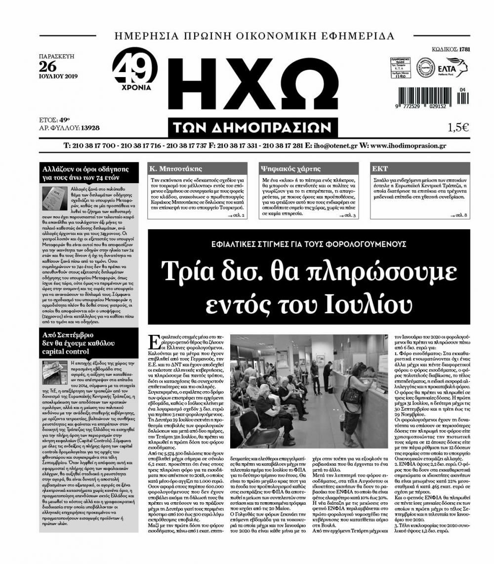 Οι οικονομικές εφημερίδες 26/7/2019 Κώστας Τεό 07:49, Παρασκευή 26 Ιουλίου 2019 Media Διαβάστε τα πρωτοσέλιδα των οικονομικών εφημερίδων: ΟΙΚΟΝΟΜΙΚΕΣ ΕΦΗΜΕΡΙΔΕΣ ΠΡΩΤΟΣΕΛΙΔΑ Μοιράσου το: σχολίασε κι εσύ (0 σχόλια) Ακολουθήστε το enikos.gr στο Google News και μάθετε πρώτοι όλες τις ειδήσεις Δείτε όλες τις τελευταίες ειδήσεις από την Ελλάδα και τον Κόσμο στο enikos.gr Ειδήσεις Ροή Ειδήσεων 5 ώρες πριν Χριστούγεννα στα μπλόκα: Επιμένουν στις κινητοποιήσεις τους οι αγρότες – Ανοίγουν τα διόδια το Σαββατοκύριακο 6 ώρες πριν Ουκρανία: Η άνευ προηγουμένου επίθεση σε ρωσικό τάνκερ στη Μεσόγειο και το μήνυμα προς στον Πούτιν – Το «μακρύ χέρι» του Κιέβου 5 ώρες πριν Πούτιν: Τα μηνύματα σε Ευρώπη και ΝΑΤΟ από το μαραθώνιο «σόου» του – Η απαίτηση για «σεβασμό» και η ειρήνη «με τους όρους» της Μόσχας 6 ώρες πριν Τραμπ: Δεν αποκλείει την πιθανότητα ενός πολέμου στη Βενεζουέλα – «Ο Μαδούρο ξέρει καλύτερα από τον καθένα τι ακριβώς θέλω» 7 ώρες πριν Συνεχίζει να προκαλεί ο Μίτσκοσκι: «Για μένα το όνομα Μακεδονία είναι ιερό» 5 ώρες πριν Ανακαλύφθηκαν αρχαία χρυσά νομίσματα 2.200 ετών που απεικονίζουν τον θεό Απόλλωνα – Η άγνωστη σύνδεση με τον Φίλιππο Β΄ της Μακεδονίας 6 ώρες πριν Ύπνος: Μια κρυφή κατάσταση του εγκεφάλου πριν από τον ύπνο μπορεί να είναι το “κλειδί” για υψηλή ευφυΐα και δημιουργικότητα 7 ώρες πριν Αριθμολογία: Οι άνθρωποι που έχουν γεννηθεί αυτές τις 4 ημερομηνίες, συχνά παρεξηγούνται – «Η καλοσύνη τους κρύβει τεράστια δύναμη» 8 ώρες πριν Ξεχάστε το καθάρισμα το Σαββατοκύριακο: Ο «κανόνας των 20 λεπτών» που θα σας λύσει τα χέρια 1 λεπτό πριν Βολιβία: Μαζική διαδηλώσεις εναντίον της κατάργησης των επιδοτήσεων των τιμών των καυσίμων 17 λεπτά πριν Φως στο Τούνελ: Έφτασε η ώρα της αλήθειας για την δολοφονία της χήρας του πρώην υπουργού στο Κολωνάκι 32 λεπτά πριν Ντόναλντ Τραμπ: Προστέθηκε το όνομά του στην πρόσοψη του Κέντρου Κένεντι – Οργισμένη αντίδραση των συγγενών του JFK 47 λεπτά πριν Ταμίλα Κουλίεβα: «Δεν θέλω να είμαι κάποια που πορεύεται συνεχώς με τις ίδιες αναφορές» 1 ώρα πριν Η Ελλάδα προσχωρεί στη Διεθνή Επιτροπή Αποζημιώσεων για την Ουκρανία ENIKOS NETWORK Το ΕΚΑΒ τιμήθηκε από την Ακαδημία Αθηνών για τα 40 χρόνια προσφοράς του Έχετε πραγματικά μεγάλη καρδιά; 10 χαρακτηριστικά όσων έχουν καλοσύνη Αναστολή μέτρων αναγκαστικής εκτέλεσης για κτηνοτρόφους που πλήττονται από την ευλογιά των αιγοπροβάτων Πλήρης επάρκεια προϊόντων στις λαϊκές της Αττικής, παρά τις αγροτικές κινητοποιήσεις – Τι απαντούν οι πωλητές Χαρτογραφώντας το «σημείο χωρίς επιστροφή»: Για πρώτη φορά αποκαλύπτεται με λεπτομέρεια το ακανθώδες όριο της ατμόσφαιρας τ... Η Google καταργεί τη λειτουργία «dark web report» – Πώς θα μπορούν οι χρήστες να διαγράφουν τα δεδομένα τους περισσότερα 02:50 , Σάββατο 20 Δεκεμβρίου 2025 GNTM: Η Ξένια Τσίρκοβα αναδείχθηκε μεγάλη νικήτρια και πήρε τις 50.000 ευρώ – Ποιος βρέθηκε σε απόσταση αναπνοής; Με φαντασμαγορικό τρόπο ολοκληρώθηκε το βράδυ της Παρασκευής ο μεγάλος τελικός του GNTM, μέσα ... 22:42 , Παρασκευή 19 Δεκεμβρίου 2025 Γιώργος Γιαννόπουλος για “Το σόι σου”: “Είναι ευτυχία και ευλογία αυτή η σειρά” «Είναι ευτυχία και ευλογία η συγκυρία αυτής της σειράς», θα πει ο Γιώργος Γιαννόπουλος -ο αγαπ... 20:37 , Παρασκευή 19 Δεκεμβρίου 2025 Don’t Forget The Lyrics: Η Έλλη Κοκκίνου υποδέχεται 4 παίκτες που θα κάνουν τα πάντα για να μη χάσουν ούτε… μισή λέξη από τους στίχους Το «Don’t Forget The Lyrics» επιστρέφει απόψε