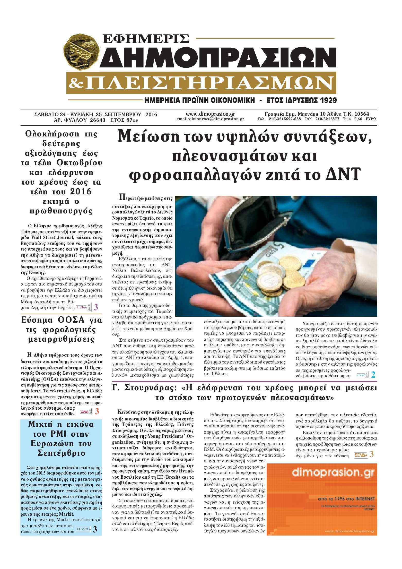 Oι οικονομικές εφημερίδες 26/9/2016 Enikos Newsroom 06:21, Δευτέρα 26 Σεπτεμβρίου 2016 Media Διαβάστε τα σημερινά πρωτοσέλιδα των οικονομικών εφημερίδων: ΟΙΚΟΝΟΜΙΚΕΣ ΕΦΗΜΕΡΙΔΕΣ ΠΡΩΤΟΣΕΛΙΔΑ Μοιράσου το: σχολίασε κι εσύ (0 σχόλια) Ακολουθήστε το enikos.gr στο Google News και μάθετε πρώτοι όλες τις ειδήσεις Δείτε όλες τις τελευταίες ειδήσεις από την Ελλάδα και τον Κόσμο στο enikos.gr Ειδήσεις Ροή Ειδήσεων 27 λεπτά πριν Πώς στήθηκε η επιχείρηση «Ίπαλλος» που οδήγησε στη σύλληψη του «Έλληνα Εσκομπάρ» – «Ο πόλεμος ενάντια στους εμπόρους ναρκωτικών θα συνεχιστεί» 11 λεπτά πριν Δίκη Χρυσής Αυγής: Την ενοχή και των 42 κατηγορουμένων ζητά η εισαγγελέας 32 λεπτά πριν Κυψέλη: Στη φυλακή η 16χρονη που μαχαίρωσε συμμαθήτριά της 3 ώρες πριν Αμοργός: «Θα προσπαθήσω να το κάνω κάθε μέρα» – Ποιος είναι ο αγρότης που έστησε μόνος του το πρώτο μπλόκο στο νησί 1 ώρα πριν Τραγωδία στην Αλεξανδρούπολη: Παιδάκι 3 ετών μεταφέρθηκε νεκρό από τη μητέρα του στο νοσοκομείο 37 λεπτά πριν Τα 3 ζώδια που θα δουν τη ζωή τους να αλλάζει ριζικά το 2026 – «Όλα γίνονται καλύτερα σταδιακά» 6 ώρες πριν «Δεν είχα κλάψει από τότε που διαγνώστηκα με καρκίνο, ώσπου ένα τηλεφώνημα με έκανε να λυγίσω» – Η συγκλονιστική εξομολόγηση ενός άνδρα 2 ώρες πριν Ο σπάνιος σεισμός που έλυσε τα χέρια των επιστημόνων – Αποκάλυψε ακριβώς όσα αναζητούσαν 7 ώρες πριν 20 χρόνια τα Χριστούγεννα ξεκινούν στα Public με μεγάλη ποικιλία σε δώρα! 5 λεπτά πριν Τραγωδία στην Αχαΐα: 48χρονος κατέρρευσε στο κυνήγι μπροστά στα μάτια του πατέρα του 11 λεπτά πριν Δίκη Χρυσής Αυγής: Την ενοχή και των 42 κατηγορουμένων ζητά η εισαγγελέας 13 λεπτά πριν Μαρκέλλα Γιαννάτου: «Είμαι κοντά στα 14 χρόνια σε ψυχανάλυση – Είχα αρχίσει να έχω κρίσεις άγχους, νόμιζα ότι θα πεθάνω» 20 λεπτά πριν Υπουργείο Αγροτικής Ανάπτυξης: Πώς θα γίνει η πληρωμή αγροτεμαχίων έως 20 στρέμματα παρά τα ζητήματα ΚΑΕΚ 27 λεπτά πριν Πώς στήθηκε η επιχείρηση «Ίπαλλος» που οδήγησε στη σύλληψη του «Έλληνα Εσκομπάρ» – «Ο πόλεμος ενάντια στους εμπόρους ναρκωτικών θα συνεχιστεί» ENIKOS NETWORK Σοβαροί κίνδυνοι από τη λάθος χορήγηση φαρμάκου για τις αιμορραγίες-Συστάσεις προς τους γιατρούς 5 πράγματα που αποφεύγει γαστρεντερολόγος για να μειώσει τον κίνδυνο καρκίνου του εντέρου Eurostat: Κάτω από την αρχική εκτίμηση της Υπηρεσίας ο πληθωρισμός στην Ελλάδα τον Νοέμβριο του 2025 – Tα στοιχεία για την ... Συντάξεις Ιανουαρίου 2026: Σε ποιους θα πιστωθούν την Πέμπτη τα χρήματα και τι αυξήσεις θα δοθούν – Δείτε αναλυτικά παραδεί... Χαρτογραφώντας το «σημείο χωρίς επιστροφή»: Για πρώτη φορά αποκαλύπτεται με λεπτομέρεια το ακανθώδες όριο της ατμόσφαιρας τ... Η Google καταργεί τη λειτουργία «dark web report» – Πώς θα μπορούν οι χρήστες να διαγράφουν τα δεδομένα τους περισσότερα 12:35 , Τετάρτη 17 Δεκεμβρίου 2025 Μίρκα Παπακωνσταντίνου: «Δεν ήμουν αισιόδοξη για τα νούμερα – Είμαι ρεαλίστρια» Στα γυρίσματα του εορταστικού επεισοδίου της αγαπημένης σειράς “Το Σόι Σου”, βρέθηκε η κάμερα ... 12:12 , Τετάρτη 17 Δεκεμβρίου 2025 Ακούστε την εκπομπή του Νίκου Χατζηνικολάου 17/12/2025 Ακούστε την εκπομπή του Νίκου Χατζηνικολάου στον ραδιοφωνικό σταθμό RealFm 97,8, την Τετάρτη 1... 11:35 , Τετάρτη 17 Δεκεμβρίου 2025 Home Alone: Το σπίτι της ταινίας θα ανακαινιστεί – Επιστροφή στην αισθητική της δεκαετίας του ’90 Οι νέοι ιδιοκτήτες του πραγματικού σπιτιού που παρουσιάζεται στην κλασική ταινία του 1990 «Hom... 11:25 , Τετάρτη 17 Δεκεμβρίου 2025 Grand Hotel: Απόψε το τελευταίο επεισόδιο τ