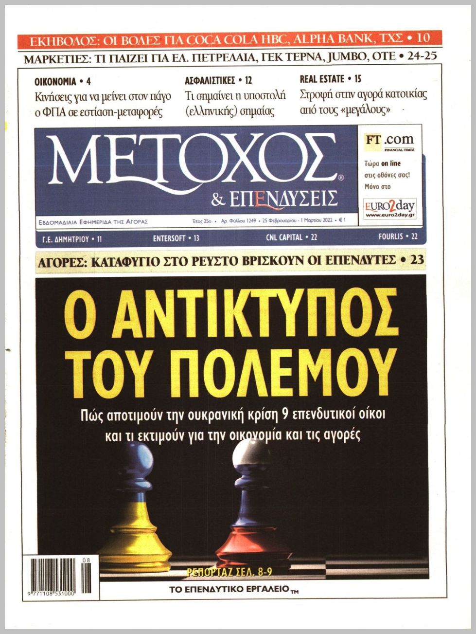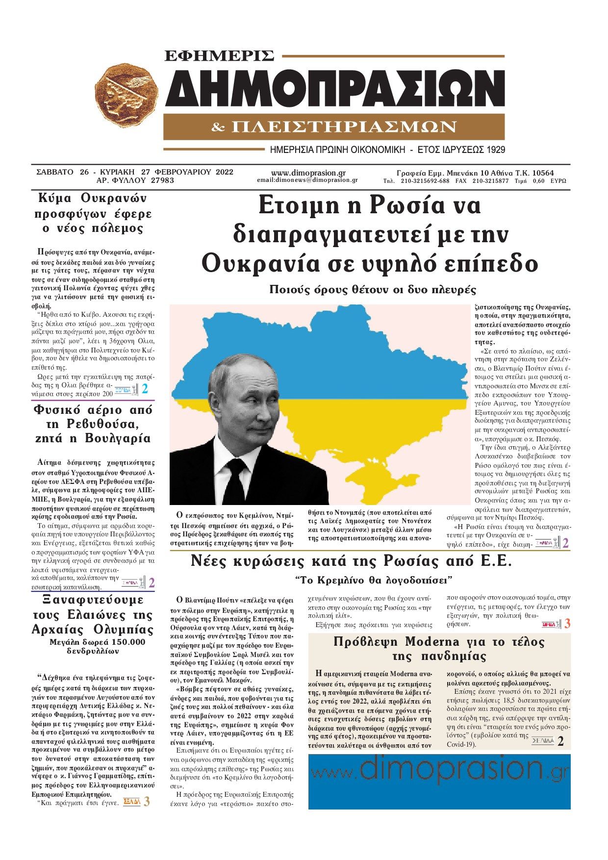 Οι οικονομικές εφημερίδες 27/2/2022 Διονύσης Νίκκας 07:36, Κυριακή 27 Φεβρουαρίου 2022 Media Διαβάστε τα πρωτοσέλιδα από τις οικονομικές εφημερίδες… ΟΙΚΟΝΟΜΙΚΕΣ ΕΦΗΜΕΡΙΔΕΣ Μοιράσου το: Ουκρανία: Έκρηξη σε αγωγό φυσικού αερίου στο Χάρκοβο Ουκρανία: Εφιαλτική νύχτα σε Κίεβο και Χάρκοβο – Ένα νεκρό παιδί από βομβαρδισμούς – ΒΙΝΤΕΟ Γαλλία: Ο Μακρόν ζήτησε από τον Λουκασένκο την απόσυρση των ρωσικών στρατευμάτων σχολίασε κι εσύ (0 σχόλια) Ακολουθήστε το enikos.gr στο Google News και μάθετε πρώτοι όλες τις ειδήσεις Δείτε όλες τις τελευταίες ειδήσεις από την Ελλάδα και τον Κόσμο στο enikos.gr Ειδήσεις Ροή Ειδήσεων 51 λεπτά πριν Αυξάνουν την πίεση προς την κυβέρνηση οι αγρότες: Κλείνουν παρακαμπτήριους και ανοίγουν διόδια – Τι θα γίνει τις γιορτές 42 λεπτά πριν Φοινικούντα: Το Σάββατο απολογείται ο 30χρονος γιος γνωστού επιχειρηματία της Πλάκας που παραδόθηκε – Όσα είπε στους αστυνομικούς και ο ρόλος του στο έγκλημα 24 λεπτά πριν Μπορεί ο Μαδούρο να αντέξει τον αποκλεισμό του Τραμπ; Τι θα χρειαστεί η Ουάσινγκτον για να τον ανατρέψει 2 ώρες πριν Δημοσκόπηση Metron Analysis: Στις 10 μονάδες η διαφορά ΝΔ-ΠΑΣΟΚ, στην 3η θέση η Πλεύση Ελευθερίας – 8 στους 10 στηρίζουν τον αγώνα των αγροτών 2 ώρες πριν Πρίγκιπας Ουίλιαμ – Κέιτ: Η νέα οικογενειακή φωτογραφία για τις Χριστουγεννιάτικες κάρτες του 2025 1 ώρα πριν Ύπνος: Η απλή βραδινή ρουτίνα για να προστατεύσετε τα μαλλιά σας από το κρύο κατά τη διάρκεια του χειμώνα 2 ώρες πριν Manifesting: Πώς να συναντήσετε τον σύντροφο της ζωής σας, ανάλογα με τον μήνα γέννησής σας 2 ημέρες πριν 20 χρόνια τα Χριστούγεννα ξεκινούν στα Public με μεγάλη ποικιλία σε δώρα! 28 λεπτά πριν Αρχαιολόγοι ανακάλυψαν ρωμαϊκά τεχνουργήματα από μια πόλη που δεν υπήρξε ποτέ – Τα τρία εντυπωσιακά κτίρια και ο αμφορέας με τις… σαρδέλες 8 λεπτά πριν Παναθηναϊκός – Χάποελ Τελ Αβίβ 93-82: Με… φόρα από την Κωνσταντινούπολη 24 λεπτά πριν Μπορεί ο Μαδούρο να αντέξει τον αποκλεισμό του Τραμπ; Τι θα χρειαστεί η Ουάσινγκτον για να τον ανατρέψει 28 λεπτά πριν Αρχαιολόγοι ανακάλυψαν ρωμαϊκά τεχνουργήματα από μια πόλη που δεν υπήρξε ποτέ – Τα τρία εντυπωσιακά κτίρια και ο αμφορέας με τις… σαρδέλες 29 λεπτά πριν Στο ΟΑΚΑ για το «Παναθηναϊκός – Χάποελ» η Κίμπερλι Γκίλφοϊλ – ΦΩΤΟ 37 λεπτά πριν Ούρσουλα φον ντερ Λάιεν: Μετατίθεται για τον Ιανουάριο η υπογραφή της εμπορικής συμφωνίας «ΕΕ-MERCOSUR» ENIKOS NETWORK Σε περίοδο αυξημένης δραστηριότητας η γρίπη στην Ελλάδα-Μέτρα προστασίας από τον ΕΟΔΥ Σκέφτεστε συνέχεια συζητήσεις που έχετε κάνει; Τι σημαίνει αυτό, σύμφωνα με ειδικό Στεγαστικό: Τι λέει η ΠΟΜΙΔΑ για τα νέα μέτρα που ανακοίνωσε ο Κυριάκος Μητσοτάκης Λαγκάρντ: Αισιόδοξη για την ανάπτυξη της Ευρωζώνης, αβέβαιη για τον πληθωρισμό Χαρτογραφώντας το «σημείο χωρίς επιστροφή»: Για πρώτη φορά αποκαλύπτεται με λεπτομέρεια το ακανθώδες όριο της ατμόσφαιρας τ... Η Google καταργεί τη λειτουργία «dark web report» – Πώς θα μπορούν οι χρήστες να διαγράφουν τα δεδομένα τους περισσότερα 17:45 , Πέμπτη 18 Δεκεμβρίου 2025 ROUK ZOUK: Εορταστικό επεισόδιο με καλεσμένους τους πρωταγωνιστές του «Γιατί ρε πατέρα» Το Σάββατο 20 Δεκεμβρίου στις 21:00, η Ζέτα Μακρυπούλια υποδέχεται εκλεκτούς ηθοποιούς που όλο... 17:20 , Πέμπτη 18 Δεκεμβρίου 2025 Άγιος έρωτας: Η Χριστίνα εξομολογείται στον πατέρα Νικόλαο, απόψε στις 21:00 στον Alpha Η Νότα αποφασίζει να εκδικηθεί τον Πέτρο και τον Στέφανο, για χάρη του Λούη, όμως τα πράγματα ... 16:50 , Πέμπτη 18 Δεκεμβρίου 2025 Να μ