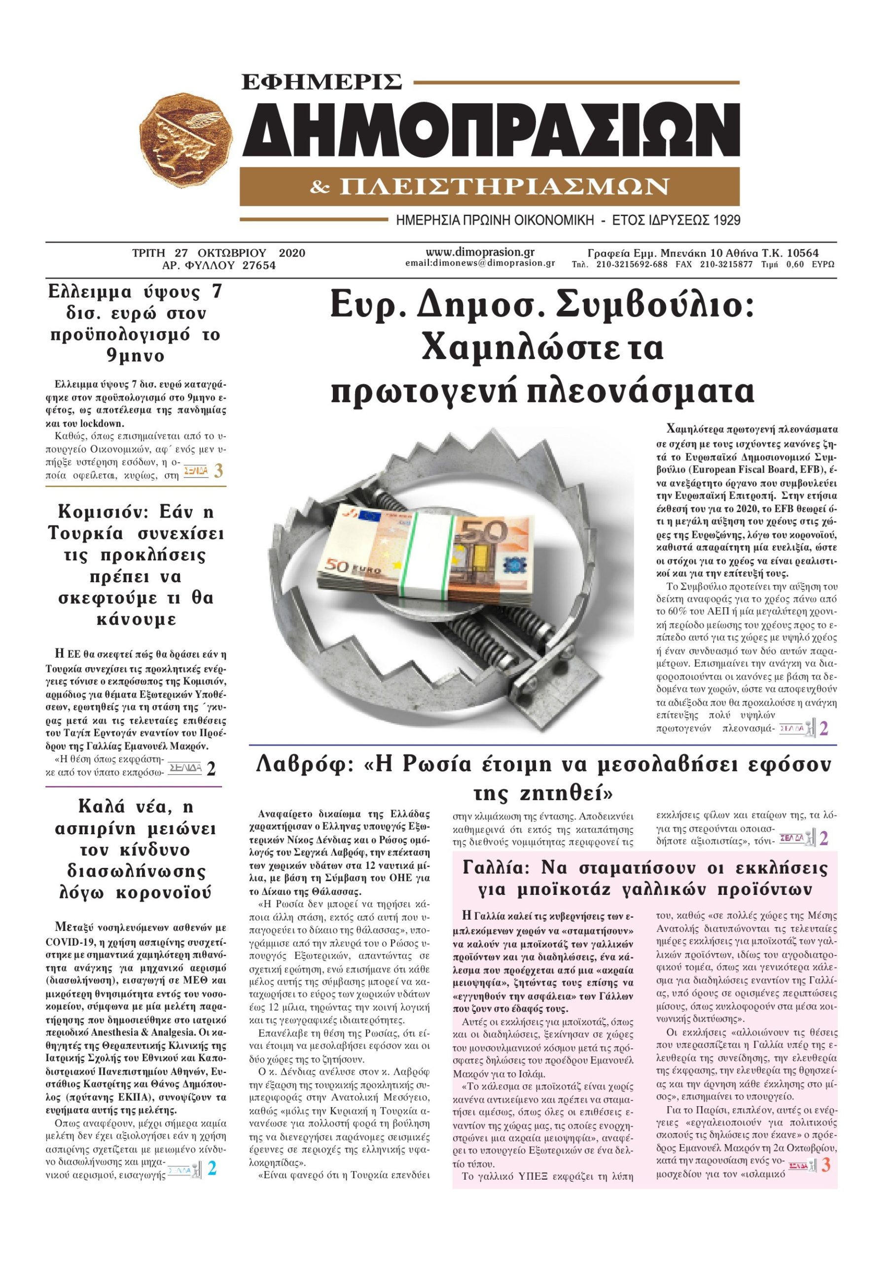 Οι οικονομικές εφημερίδες 27/10/2020 Διονύσης Νίκκας 06:53, Τρίτη 27 Οκτωβρίου 2020 Media Διαβάστε τα πρωτοσέλιδα των οικονομικών εφημερίδων… ΟΙΚΟΝΟΜΙΚΕΣ ΕΦΗΜΕΡΙΔΕΣ Μοιράσου το: σχολίασε κι εσύ (0 σχόλια) Ακολουθήστε το enikos.gr στο Google News και μάθετε πρώτοι όλες τις ειδήσεις Δείτε όλες τις τελευταίες ειδήσεις από την Ελλάδα και τον Κόσμο στο enikos.gr Ειδήσεις Ροή Ειδήσεων 2 ώρες πριν Κυριάκος Μητσοτάκης: «Κάποιοι αγρότες δεν αισθάνονται την ανάγκη να διαφωνήσουν με τις προτάσεις της κυβέρνησης, η Ευρώπη στέκεται στο πλευρό της Ουκρανίας» 7 ώρες πριν ΟΠΕΚΕΠΕ: Προφυλακιστέος ο φερόμενος αρχηγός και ο λογιστής της εγκληματικής οργάνωσης 8 ώρες πριν Αυξάνουν την πίεση προς την κυβέρνηση οι αγρότες: Κλείνουν παρακαμπτήριους και ανοίγουν διόδια – Τι θα γίνει τις γιορτές 8 ώρες πριν Φοινικούντα: Το Σάββατο απολογείται ο 30χρονος γιος γνωστού επιχειρηματία της Πλάκας που παραδόθηκε – Όσα είπε στους αστυνομικούς και ο ρόλος του στο έγκλημα 7 ώρες πριν ΑΕΚ – Κραϊόβα 3-2: Επική ανατροπή και πρόκριση στους «16» του Conference League η Ένωση 8 ώρες πριν Αρχαιολόγοι ανακάλυψαν ρωμαϊκά τεχνουργήματα από μια πόλη που δεν υπήρξε ποτέ – Τα τρία εντυπωσιακά κτίρια και ο αμφορέας με τις… σαρδέλες 9 ώρες πριν Ύπνος: Η απλή βραδινή ρουτίνα για να προστατεύσετε τα μαλλιά σας από το κρύο κατά τη διάρκεια του χειμώνα 10 ώρες πριν Manifesting: Πώς να συναντήσετε τον σύντροφο της ζωής σας, ανάλογα με τον μήνα γέννησής σας 2 ημέρες πριν 20 χρόνια τα Χριστούγεννα ξεκινούν στα Public με μεγάλη ποικιλία σε δώρα! 12 λεπτά πριν Απειλή για το Προϋπολογισμό τα ληξιπρόθεσμα χρέη των ιδιωτών προς την εφορία 13 λεπτά πριν Πέντε νεκροί σε πλήγματα των ΗΠΑ κατά δύο σκαφών που φέρεται να μετέφεραν ναρκωτικά στον Ανατολικό Ειρηνικό 21 λεπτά πριν ΕΥΔΑΠ: Αλλάζουν τα τιμολόγια του νερού 29 λεπτά πριν Οπτική ψευδαίσθηση: Μόνο αν έχεις αετίσια ματιά θα βρεις τον παπαγάλο σε 12 δευτερόλεπτα 35 λεπτά πριν Αθήνα: Βρέθηκε η 16χρονη που είχε εξαφανιστεί από τις 6 Δεκεμβρίου – Η ανακοίνωση από το «Χαμόγελο του Παιδιού» ENIKOS NETWORK Σε περίοδο αυξημένης δραστηριότητας η γρίπη στην Ελλάδα-Μέτρα προστασίας από τον ΕΟΔΥ Σκέφτεστε συνέχεια συζητήσεις που έχετε κάνει; Τι σημαίνει αυτό, σύμφωνα με ειδικό Στεγαστικό: Τι λέει η ΠΟΜΙΔΑ για τα νέα μέτρα που ανακοίνωσε ο Κυριάκος Μητσοτάκης Λαγκάρντ: Αισιόδοξη για την ανάπτυξη της Ευρωζώνης, αβέβαιη για τον πληθωρισμό Χαρτογραφώντας το «σημείο χωρίς επιστροφή»: Για πρώτη φορά αποκαλύπτεται με λεπτομέρεια το ακανθώδες όριο της ατμόσφαιρας τ... Η Google καταργεί τη λειτουργία «dark web report» – Πώς θα μπορούν οι χρήστες να διαγράφουν τα δεδομένα τους περισσότερα 05:48 , Παρασκευή 19 Δεκεμβρίου 2025 Οι οικονομικές εφημερίδες 19/12/2025 Διαβάστε τα πρωτοσέλιδα από τις οικονομικές εφημερίδες, σήμερα 19/12/2025. 05:43 , Παρασκευή 19 Δεκεμβρίου 2025 Οι αθλητικές εφημερίδες 19/12/2025 Διαβάστε τα πρωτοσέλιδα από τις αθλητικές εφημερίδες, σήμερα 19/12/2025. 05:38 , Παρασκευή 19 Δεκεμβρίου 2025 Οι πολιτικές εφημερίδες 19/12/2025 Διαβάστε τα πρωτοσέλιδα από τις πολιτικές εφημερίδες, σήμερα 19/12/2025. 02:50 , Παρασκευή 19 Δεκεμβρίου 2025 GNTM: «Κλείδωσαν» οι τέσσερις φιναλίστ – Μεγάλη ανατροπή στις τελευταίες αποχωρήσεις Για προτελευταία φορά εμφανίστηκαν στο πλατό του GNTM οι φιναλίστ του φετινού κύκλου, το βράδυ... ΤΕΛΕΥΤΑΙΕΣ ΕΙΔΗΣΕΙΣ 12 λεπτά πριν Απειλή για το Προϋπολογισμό τα ληξιπρόθεσμα χρέη των... 13 λεπτά πριν Πέντε νεκροί σε πλήγματα των ΗΠΑ κατά δύο σκαφών π