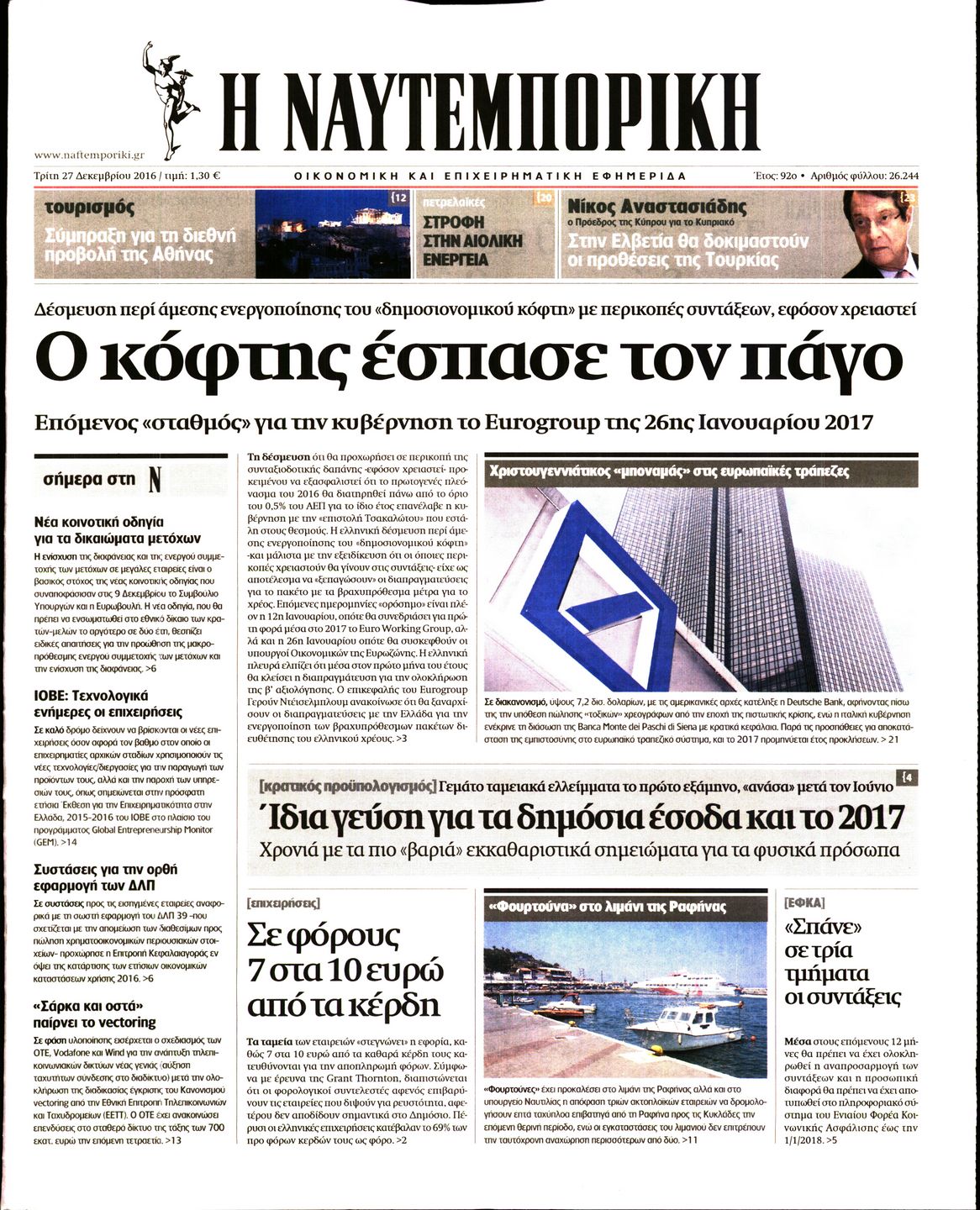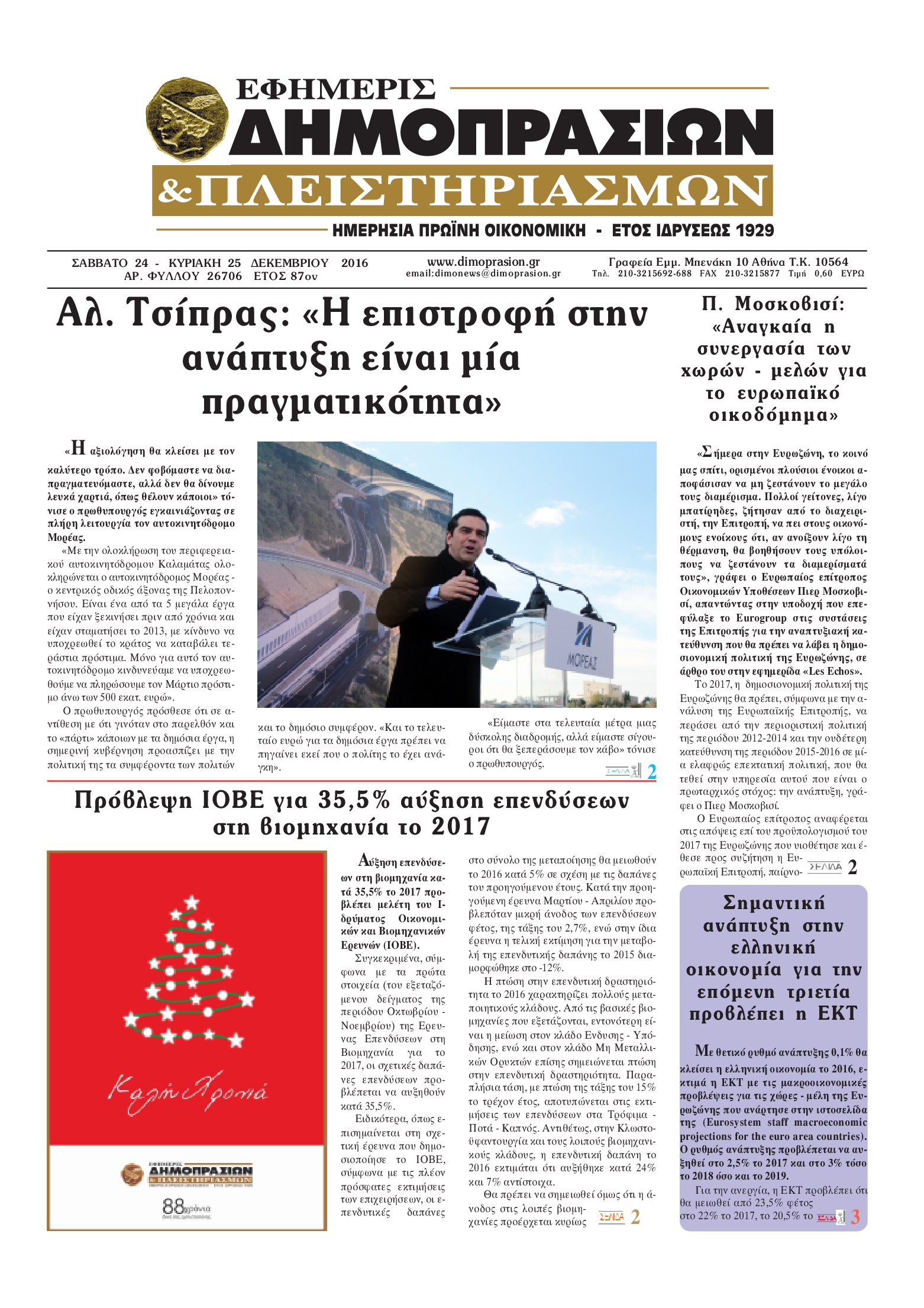 Οι οικονομικές εφημερίδες 27/12/2016 Enikos Newsroom 01:08, Τρίτη 27 Δεκεμβρίου 2016 Media Διαβάστε τα σημερινά πρωτοσέλιδα των οικονομικών εφημερίδων: ΟΙΚΟΝΟΜΙΚΕΣ ΕΦΗΜΕΡΙΔΕΣ ΠΡΩΤΟΣΕΛΙΔΑ Μοιράσου το: σχολίασε κι εσύ (0 σχόλια) Ακολουθήστε το enikos.gr στο Google News και μάθετε πρώτοι όλες τις ειδήσεις Δείτε όλες τις τελευταίες ειδήσεις από την Ελλάδα και τον Κόσμο στο enikos.gr Ειδήσεις Ροή Ειδήσεων 2 ώρες πριν Μητσοτάκης για αγρότες: Ελπίζω πως θα απομακρυνθούν σύντομα από τα μπλόκα 3 ώρες πριν Έρευνα MRB: Η πρόθεση ψήφου και τα σημαντικότερα προβλήματα – Οι «λέξεις» που εκφράζουν τους πολίτες 12 λεπτά πριν Αμοργός: «Θα προσπαθήσω να το κάνω κάθε μέρα» – Ποιος είναι ο αγρότης που έστησε μόνος του το πρώτο μπλόκο στο νησί 48 λεπτά πριν Μισέλ Ομπάμα: Εμφανώς αδυνατισμένη στην εκπομπή του Τζίμι Κίμελ – Οι φήμες για τη χρήση Ozempic και η «φιλία» της με τον Ρομπ Ράινερ 43 λεπτά πριν Αγρότες: Επ’ αόριστον μπλόκο στον σταθμό στον Προμαχώνα για τα φορτηγά – Κλείνει το ρεύμα εισόδου στα Μάλγαρα 3 ώρες πριν Τα 4 ζώδια που ξαναβρίσκουν τον εαυτό τους – «Μπαίνετε επιτέλους στην ουσία των πραγμάτων» 4 ώρες πριν 20 χρόνια τα Χριστούγεννα ξεκινούν στα Public με μεγάλη ποικιλία σε δώρα! 2 ώρες πριν «Δεν είχα κλάψει από τότε που διαγνώστηκα με καρκίνο, ώσπου ένα τηλεφώνημα με έκανε να λυγίσω» – Η συγκλονιστική εξομολόγηση ενός άνδρα 1 ώρα πριν Τα 7 σπάνια χαρακτηριστικά που κάνουν κάποιους ανθρώπους ακαταμάχητους 24 δευτερόλεπτα πριν Λάκης Γαβαλάς, Σουζάνα Κεγγίτση και Έλενα Γαλύφα μας περιμένουν σήμερα στο πιο stylish Χριστουγεννιάτικο ραντεβού στο Athens Metro Mall – Το Madwalk Gifting Lounge by ΣΚΡΑΤΣ επιστρέφει σήμερα από τις 14:00 έως τις 18:30 5 λεπτά πριν Αγρίνιο: Συνελήφθη μαθητής που απείλησε τον διευθυντή και εκπαιδευτικούς – Χειροπέδες και στη μητέρα του 10 λεπτά πριν Bloomberg: Οι ΗΠΑ ετοιμάζουν νέες κυρώσεις σε βάρος της Ρωσίας εάν ο Πούτιν απορρίψει μια ειρηνευτική συμφωνία 12 λεπτά πριν Αμοργός: «Θα προσπαθήσω να το κάνω κάθε μέρα» – Ποιος είναι ο αγρότης που έστησε μόνος του το πρώτο μπλόκο στο νησί 16 λεπτά πριν Βίντεο: Με γερανό απομακρύνθηκε αυτοκίνητο στο Μαρούσι – Η οδηγός… είχε αργήσει σε ραντεβού ENIKOS NETWORK Ανησυχητική αύξηση της υπέρτασης στα παιδιά – Πώς θα τα προστατέψουμε; Αδενώματα Υπόφυσης: Μια πάθηση καλοήθης, αλλά όχι αθώα Διεθνής Οργανισμός Ενέργειας (ΔΟΕ, IEA): Τι δείχνουν τα νέα στοιχεία για την παγκόσμια κατανάλωση άνθρακα Διευκρινίσεις από το ΥΠΑΑΤ και τον ΟΠΕΚΕΠΕ για την εξόφληση της βασικής ενίσχυσης στους αγρότες Σύγχρονος Νοστράδαμος: Προειδοποιεί για «μεγάλο γεγονός» τους επόμενους μήνες που θα συγκλονίσει τη Βρετανία και τον κόσμο Τεστ παρατηρητικότητας: Μπορείτε να βρείτε τις 3 διαφορές στις εικόνες με έναν πιγκουίνο σε 14 δευτερόλεπτα περισσότερα 12:35 , Τετάρτη 17 Δεκεμβρίου 2025 Μίρκα Παπακωνσταντίνου: «Δεν ήμουν αισιόδοξη για τα νούμερα – Είμαι ρεαλίστρια» Στα γυρίσματα του εορταστικού επεισοδίου της αγαπημένης σειράς “Το Σόι Σου”, βρέθηκε η κάμερα ... 12:12 , Τετάρτη 17 Δεκεμβρίου 2025 Ακούστε την εκπομπή του Νίκου Χατζηνικολάου 17/12/2025 Ακούστε την εκπομπή του Νίκου Χατζηνικολάου στον ραδιοφωνικό σταθμό RealFm 97,8, την Τετάρτη 1... 11:35 , Τετάρτη 17 Δεκεμβρίου 2025 Home Alone: Το σπίτι της ταινίας θα ανακαινιστεί – Επιστροφή στην αισθητική της δεκαετίας του ’90 Οι νέοι ιδιοκτήτες του πραγματικού σπιτιού που παρουσιάζεται στην κλασική ταινία του 1990 «Hom... 11:25 , Τετάρτη 17 Δεκεμβρίου 2025 Grand Hotel: Απόψε το τελευτα