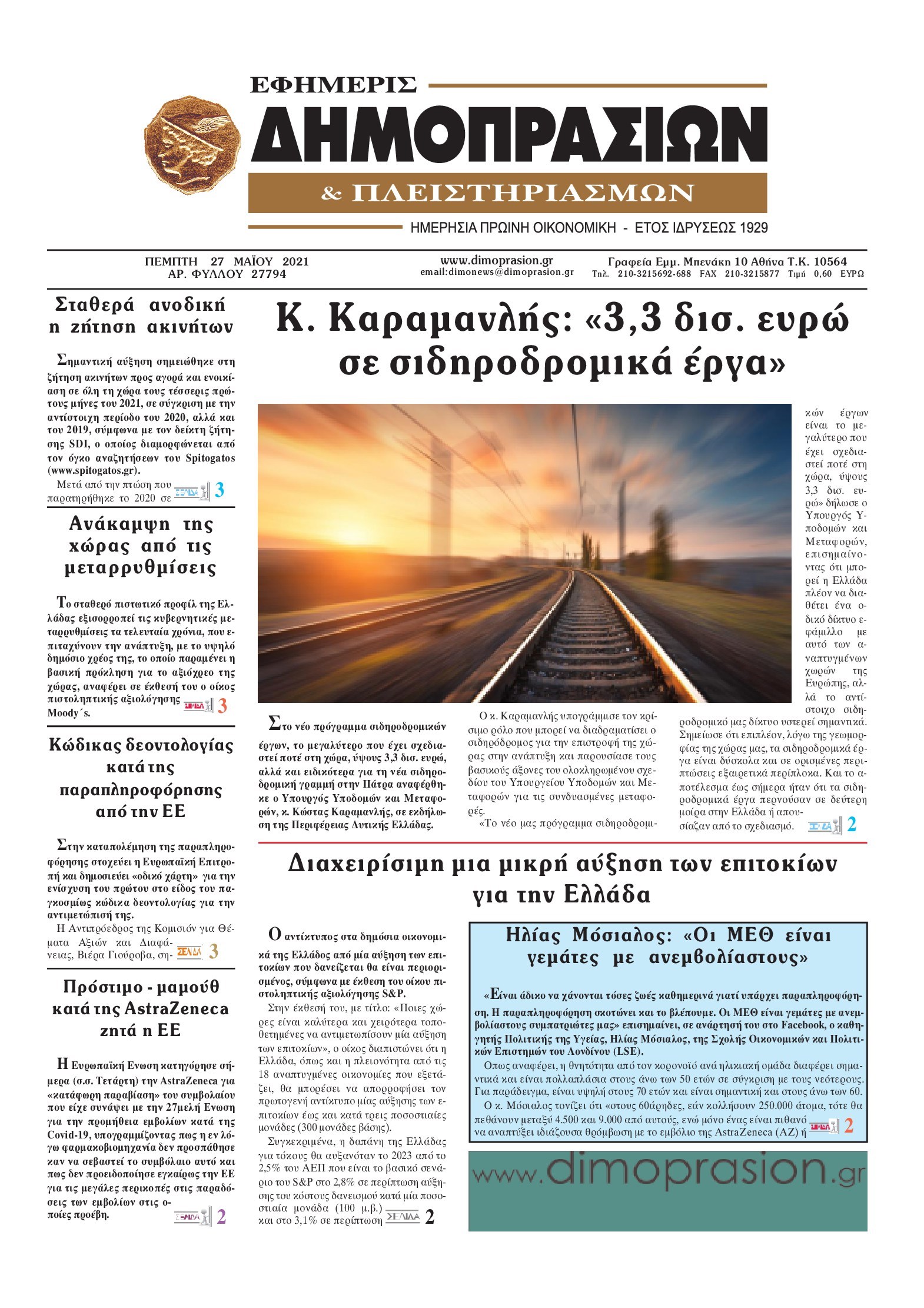 Οι οικονομικές εφημερίδες 27/5/2021 Διονύσης Νίκκας 06:32, Πέμπτη 27 Μαΐου 2021 Media Διαβάστε τα πρωτοσέλιδα των οικονομικών εφημερίδων… ΟΙΚΟΝΟΜΙΚΕΣ ΕΦΗΜΕΡΙΔΕΣ Μοιράσου το: σχολίασε κι εσύ (0 σχόλια) Ακολουθήστε το enikos.gr στο Google News και μάθετε πρώτοι όλες τις ειδήσεις Δείτε όλες τις τελευταίες ειδήσεις από την Ελλάδα και τον Κόσμο στο enikos.gr Ειδήσεις Ροή Ειδήσεων 1 ώρα πριν Ανυποχώρητοι οι αγρότες: Δεν πάνε στο Μαξίμου, κλιμακώνουν τις κινητοποιήσεις – Ποια είναι τα αιτήματά τους 22 λεπτά πριν ΟΠΕΚΕΠΕ-Κρήτη: Πώς δρούσε το κύκλωμα με τις παράνομες επιδοτήσεις – Τα ΚΥΔ, οι ψευδείς αιτήσεις και τα… «βράχια της Νορμανδίας» 18 λεπτά πριν Διατλαντικό ρήγμα: Οι σχέσεις ΗΠΑ – Ευρώπης επιδεινώνονται λόγω του νέου δόγματος Τραμπ και της πίεσης που ασκεί στην Ουκρανία 1 ώρα πριν Διπλό φονικό στη Φοινικούντα: Δύο νέα πρόσωπα στο «κάδρο» των ερευνών – Οι αντιφάσεις στις καταθέσεις του ανιψιού 6 ώρες πριν Κρήτη: Θρίλερ με την εξαφάνιση του 33χρονου γιατρού – «Μου είπε “έλα πατέρα να μιλήσουμε γιατί δεν είμαι καλά”» 1 ώρα πριν Εκπληκτική ανακάλυψη σε αρχαία ελληνική πόλη: Βρέθηκε γυναικείο κεφάλι αγάλματος και οι αρχαιολόγοι εκτιμούν ότι μπορεί να συνδέεται με τη θεά Εστία 2 ώρες πριν Ύπνος: 9 πράγματα που μπορείτε να κάνετε πριν κοιμηθείτε για να ξυπνάτε πιο χαρούμενοι το πρωί, σύμφωνα με ειδικούς 3 ώρες πριν Αριθμολογία: Οι άνθρωποι που έχουν γεννηθεί αυτές τις 4 ημερομηνίες, δεν αντέχουν να κάνουν μία κλασική δουλειά γραφείου 4 ώρες πριν Χριστουγεννιάτικο δέντρο: Το έξυπνο κόλπο με τα στολίδια για να φαίνεται πιο γεμάτο 14 λεπτά πριν ΗΠΑ: Πυροβολισμοί στο Πανεπιστήμιο Μπράουν – Πληροφορίες για αρκετά θύματα 18 λεπτά πριν Διατλαντικό ρήγμα: Οι σχέσεις ΗΠΑ – Ευρώπης επιδεινώνονται λόγω του νέου δόγματος Τραμπ και της πίεσης που ασκεί στην Ουκρανία 22 λεπτά πριν ΟΠΕΚΕΠΕ-Κρήτη: Πώς δρούσε το κύκλωμα με τις παράνομες επιδοτήσεις – Τα ΚΥΔ, οι ψευδείς αιτήσεις και τα… «βράχια της Νορμανδίας» 38 λεπτά πριν Κηφισιά – Αστέρας Τρίπολης 0-0: Τα δοκάρια «σταμάτησαν» την ομάδα των βορείων προαστίων 48 λεπτά πριν Δημήτρης Κουτσούμπας: Στεκόμαστε στο πλευρό των εργολαβικών εργαζομένων των ΕΛΠΕ Θεσσαλονίκης ENIKOS NETWORK «Με αυτόν τον τρόπο κατάφερα να απογειώσω τη σεξουαλική μου ζωή» – Τι αποκαλύπτει 40χρονη Πείτε «τέλος» στην ακμή χωρίς φάρμακα – Ειδικός αποκαλύπτει αποτελεσματική ρουτίνα περιποίησης Νέα εποχή για την Εγνατία Οδό – Τι αλλάζει με επενδύσεις 1,8 δισ. ευρώ Στάση εργασίας στα λεωφορεία την Τετάρτη 17 Δεκεμβρίου – Κανονικά τα περιαστικά δρομολόγια Σύγχρονος Νοστράδαμος: Προειδοποιεί για «μεγάλο γεγονός» τους επόμενους μήνες που θα συγκλονίσει τη Βρετανία και τον κόσμο Τεστ παρατηρητικότητας: Μπορείτε να βρείτε τις 3 διαφορές στις εικόνες με έναν πιγκουίνο σε 14 δευτερόλεπτα περισσότερα 22:56 , Σάββατο 13 Δεκεμβρίου 2025 «Το παιδί»: Η Άρτεμις κάνει μια μακάβρια ανακάλυψη – Τι θα δούμε στα επόμενα επεισόδια Μη χάσετε τις εξελίξεις στα νέα επεισόδια της μαύρης κοινωνικής κωμωδίας «Το παιδί», στην ΕΡΤ1... 22:16 , Σάββατο 13 Δεκεμβρίου 2025 Άγιος έρωτας- επόμενα επεισόδια: Ο Αντρέας μαθαίνει ότι ο Χάρης είναι γιος του Μια εβδομάδα γεμάτη καταιγιστικές εξελίξεις στα νέα επεισόδια της σειράς “Άγιος Έρωτας... 20:40 , Σάββατο 13 Δεκεμβρίου 2025 HOTΕΛ ΕΛVIRA: Η Ελβίρα προσπαθεί να βγάλει οριστικά από το μυαλό της τον Χάρι, απόψε στις 21:00 Σε προεκλογικό πυρετό βρίσκεται το νησί, στο νέο επεισόδιο της
