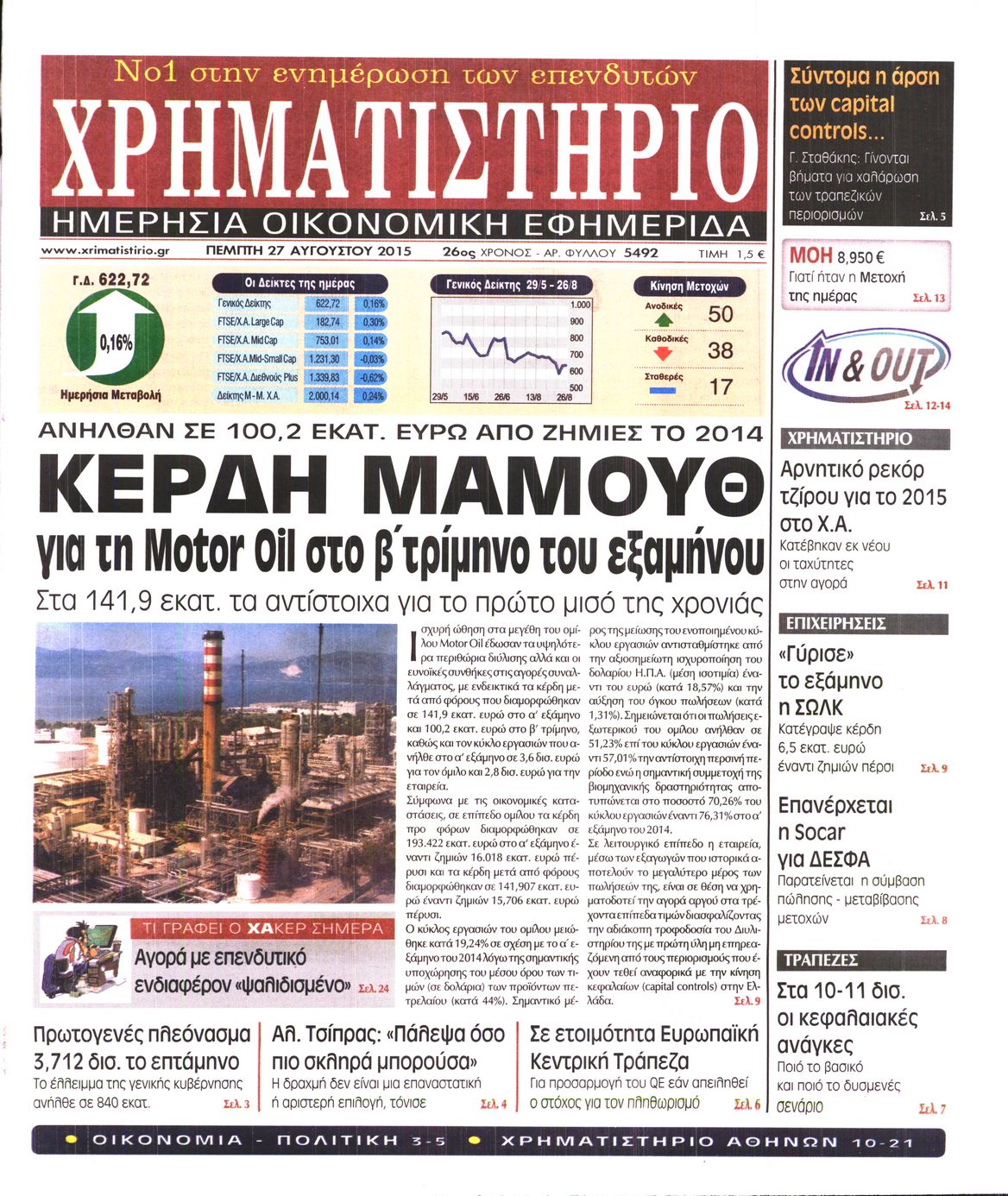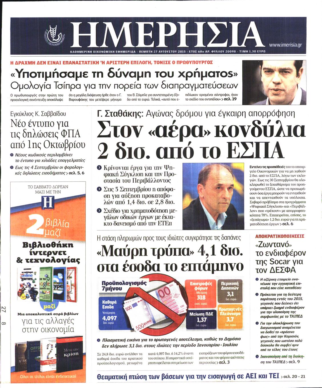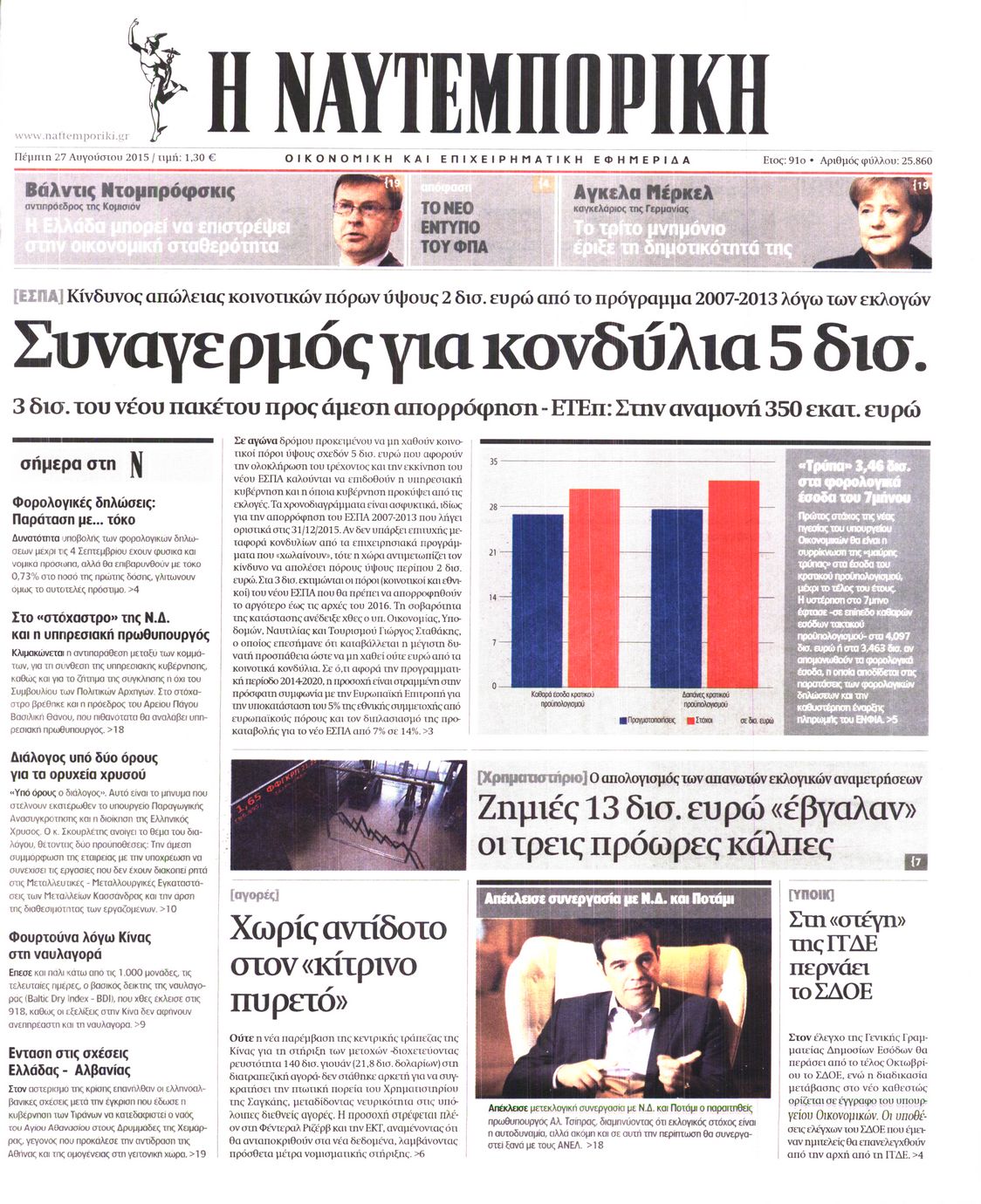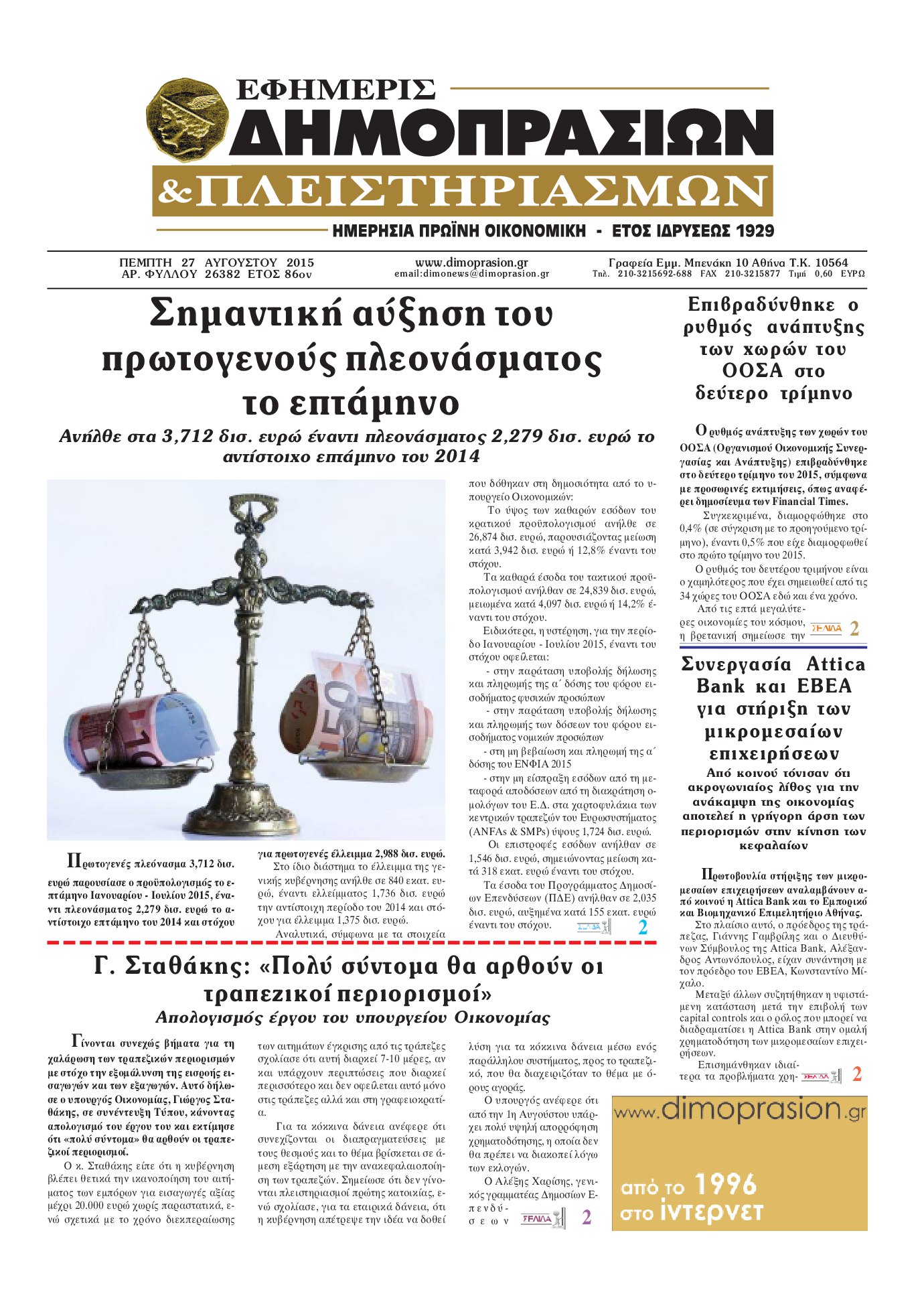 Οι οικονομικές εφημερίδες 27/8/2015 Enikos Newsroom 06:42, Πέμπτη 27 Αυγούστου 2015 Media Διαβάστε τα σημερινά πρωτοσέλιδα των οικονομικών εφημερίδων: ΟΙΚΟΝΟΜΙΚΕΣ ΕΦΗΜΕΡΙΔΕΣ ΠΡΩΤΟΣΕΛΙΔΑ Μοιράσου το: σχολίασε κι εσύ (0 σχόλια) Ακολουθήστε το enikos.gr στο Google News και μάθετε πρώτοι όλες τις ειδήσεις Δείτε όλες τις τελευταίες ειδήσεις από την Ελλάδα και τον Κόσμο στο enikos.gr Ειδήσεις Ροή Ειδήσεων 26 λεπτά πριν Την πρώτη Belharra παρέλαβε η χώρα μας, υψώθηκε η ελληνική σημαία στη φρεγάτα «Κίμων» – Δένδιας: «Το ισχυρότερο Πολεμικό Ναυτικό που είχε ποτέ ο ελληνισμός» 3 ώρες πριν Γιώργος Μαζωνάκης: «Δεν ζήτησα χρήματα, παρά μόνο ηθική δικαίωση» – Οι πρώτες δηλώσεις του 21χρονου μετά την κατάθεση της μήνυσης 2 ώρες πριν Δίκη Βαλυράκη: Καταθέτει ο βασικός αυτόπτης μάρτυρας – «Δέχτηκα πιέσεις να μη μιλήσω, πήγα να ψωνίσω και αυτοκίνητο με χτύπησε στο πόδι» 2 ώρες πριν Ώρα αποφάσεων για τους αγρότες – Ξεκίνησε η πανελλαδική σύσκεψη μπλόκων στις Σέρρες – ΦΩΤΟ 6 ώρες πριν Συναγερμός και στην Ελλάδα για τη «σούπερ γρίπη»: Πόσο σοβαρή είναι και ποιοι θεωρούνται πιο ευάλωτοι – 3 ειδικοί μιλούν στο enikos.gr 51 λεπτά πριν Τα 5 ζώδια που θα ευνοηθούν στα οικονομικά τους το 2026 – «Τραβούν το χρήμα σαν μαγνήτες» 6 ώρες πριν Αν κάνετε συνεχώς αυτά τα 8 πράγματα με τα κατοικίδιά σας, σας λείπει η ανθρώπινη επαφή 2 ώρες πριν Αυτό που κρύβεται κάτω από τη Γροιλανδία θα μπορούσε να ανατρέψει όσα γνωρίζουμε για την άνοδο της στάθμης των θαλασσών 1 ημέρα πριν 20 χρόνια τα Χριστούγεννα ξεκινούν στα Public με μεγάλη ποικιλία σε δώρα! 6 λεπτά πριν Εξώδικο Γεωργιάδη στην Κωνσταντοπούλου – «Με κατηγόρησε ότι έχω καταδικαστεί για παιδεραστία» 11 λεπτά πριν Εξεταστική για ΟΠΕΚΕΠΕ – Μπρατάκος: «Δεν μου τέθηκε ζήτημα για πιέσεις από τον κ. Αυγενάκη ή οποιονδήποτε» – Τι είπε για τον Σημανδράκο 13 λεπτά πριν ΤΕΧΑΝ: 1ο Πανελλήνιο Σχολικό Πρωτάθλημα Ανακύκλωσης Δευτεροβάθμιας Εκπαίδευσης 17 λεπτά πριν Τραυματίστηκε 5χρονο παιδί σε νηπιαγωγείο στο Αγρίνιο – Χτυπήθηκε από αντικείμενο που έπεσε από έπιπλο 22 λεπτά πριν Μεσσηνία: Παρέμβαση εισαγγελέα στο μπλόκο αγροτών στον κόμβο της Θουρίας έπειτα από καταγγελίες για παρακώλυση συγκοινωνιών ENIKOS NETWORK 100 χρόνια ΠΙΣ: Ένας αιώνας προσφοράς στην Ιατρική και την κοινωνία Ένα ποτήρι την ημέρα από αυτόν τον χυμό μειώνει τη χοληστερίνη, τη φλεγμονή και την πίεση Κρατική επιχορήγηση έως 14.500 ευρώ: Ποιοι θα λάβουν από σήμερα την προκαταβολή στον τραπεζικό λογαριασμό τους Αυτόματη απόδοση ΦΠΑ: Τα δύο σενάρια που επεξεργάζεται η ΑΑΔΕ Χαρτογραφώντας το «σημείο χωρίς επιστροφή»: Για πρώτη φορά αποκαλύπτεται με λεπτομέρεια το ακανθώδες όριο της ατμόσφαιρας τ... Η Google καταργεί τη λειτουργία «dark web report» – Πώς θα μπορούν οι χρήστες να διαγράφουν τα δεδομένα τους περισσότερα 15:52 , Πέμπτη 18 Δεκεμβρίου 2025 Το Σπίτι Δίπλα Στο Ποτάμι: Το καθηλωτικό τελευταίο επεισόδιο για το 2025 απόψε στις 22:30 Καθηλώνει το σημερινό επεισόδιο της σειράς “Το Σπίτι Δίπλα Στο Ποτάμι” που έρχεται... 15:20 , Πέμπτη 18 Δεκεμβρίου 2025 Άγιος έρωτας – Η Ελευθερία Αρβανιτάκη τραγουδά και ο Γιάννης Τσορτέκης καθηλώνει με τον χορό του Ο Κλεάνθης χορεύει στους ήχους της Ελευθερίας Αρβανιτάκη στη σειρά “Άγιος Έρωτας“.... 08:00 , Πέμπτη 18 Δεκεμβρίου 2025 Την Κυριακή με τη Realnews: Δωροεπιταγή 10€ Δωροεπιταγή αξίας 10€ για αγορές άνω των 60€ από τα πολυκαταστήματα FactoryOutlet H προσφορά ι... 07:50 , Πέμπτη 18 Δεκεμβρίου 2025 «Το σόι σου»: Backstage στα γυρίσμα