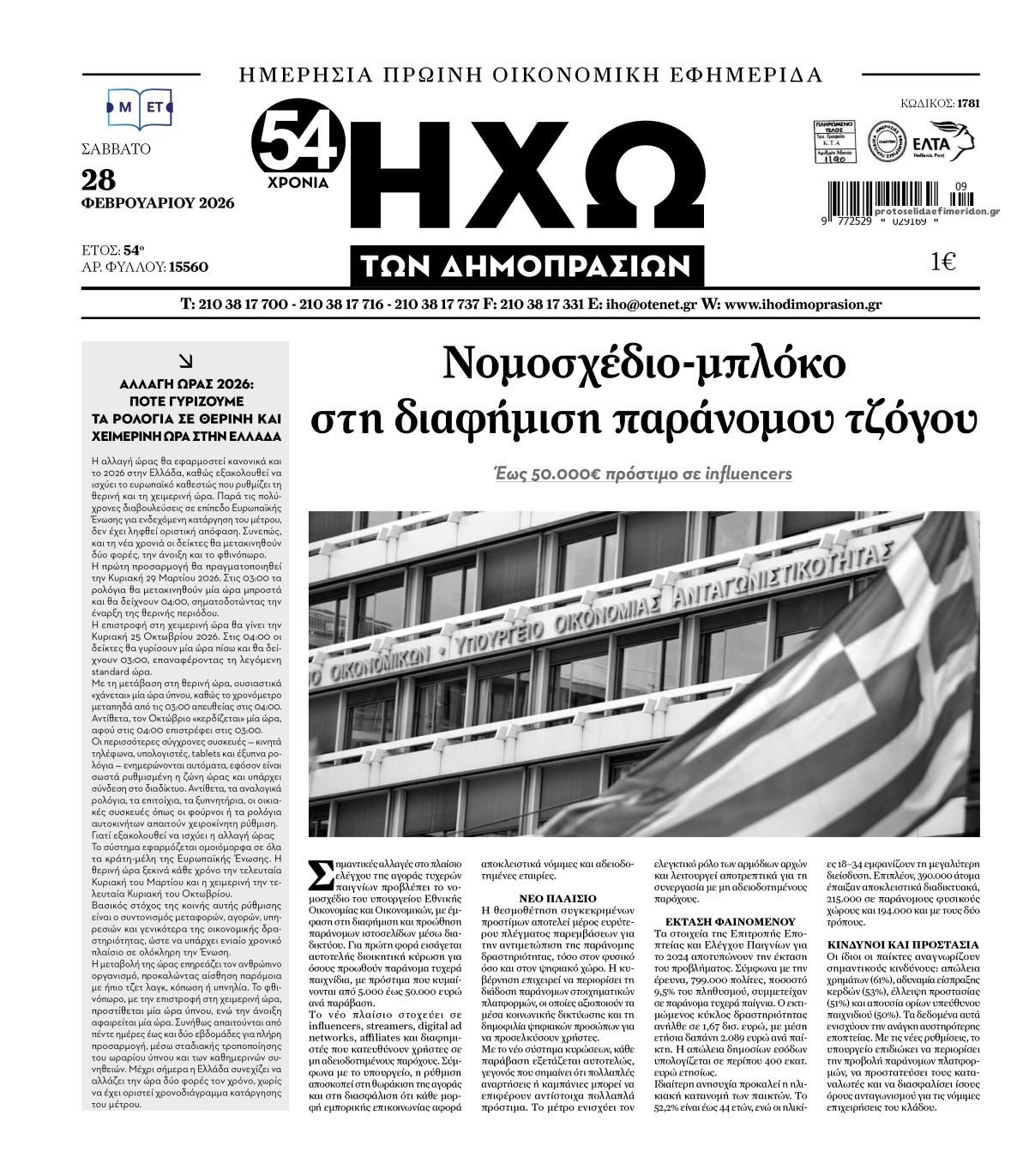 Οι οικονομικές εφημερίδες 28/2/2026 Enikos Newsroom 05:48, Σάββατο 28 Φεβρουαρίου 2026 Media Διαβάστε τα πρωτοσέλιδα από τις οικονομικές εφημερίδες, σήμερα 28/2/2026. ΕΦΗΜΕΡΙΔΕΣ ΟΙΚΟΝΟΜΙΚΕΣ ΕΦΗΜΕΡΙΔΕΣ ΠΡΩΤΟΣΕΛΙΔΑ Μοιράσου το: Ο Ντοναλντ Τραμπ προειδοποιεί ότι επίκειται «μεγάλη απόφαση» για το Ιράν – Αποχωρήσεις από πρεσβείες και διακοπή πτήσεων ΗΠΑ: Το Πακιστάν έχει δικαίωμα να αμύνεται έναντι των επιθέσεων των Ταλιμπάν Κώστας Γρεβενίτης: Νέα στοιχεία στη μυστηριώδη εξαφάνιση του επιχειρηματία στη Λακωνία – «Ήταν λίγο ιδιόρρυθμος» σχολίασε κι εσύ (0 σχόλια) Ακολουθήστε το enikos.gr στο Google News και μάθετε πρώτοι όλες τις ειδήσεις Δείτε όλες τις τελευταίες ειδήσεις από την Ελλάδα και τον Κόσμο στο enikos.gr Ειδήσεις Ροή Ειδήσεων 30 λεπτά πριν Τρία χρόνια από την τραγωδία στα Τέμπη: Συγκεντρώσεις σήμερα σε Ελλάδα και εξωτερικό – Ποιοι συμμετέχουν, πώς θα κινηθούν τα Μέσα Μεταφοράς 9 ώρες πριν Λουτράκι: Για ασήμαντη αφορμή η αιματηρή συμπλοκή με θύμα τον 17χρονο – «Εγώ το έκανα» είπε ο δράστης στους αστυνομικούς πριν παραδοθεί 10 ώρες πριν Δυστύχημα στο «Ελ. Βενιζέλος»: Ποια ήταν η «αγωνίστρια της προσφοράς» Μαρία Λαδά που έχασε τη ζωή της – Πώς έγινε η τραγωδία 3 ώρες πριν Ο Ντοναλντ Τραμπ προειδοποιεί ότι επίκειται «μεγάλη απόφαση» για το Ιράν – Αποχωρήσεις από πρεσβείες και διακοπή πτήσεων 5 ώρες πριν Βολιβία: Συντριβή μεταγωγικού αεροσκάφους της πολεμικής αεροπορίας με τουλάχιστον 15 νεκρούς – Απόπειρα λεηλασίας των χαρτονομισμάτων που μετέφερε – Δείτε φώτο και βίντεο 1 ώρα πριν Οπτική ψευδαίσθηση: Μόνο όσοι έχουν τέλεια όραση μπορούν να εντοπίσουν το δαχτυλίδι μέσα σε 12 δευτερόλεπτα 1 ώρα πριν Καρκίνος: Οι τροφές που μπορούν να μειώσουν τον κίνδυνο εμφάνισης 6 τύπων της νόσου, σύμφωνα με μελέτη 4 ώρες πριν Ζώδια 28/2: Ημερήσιες προβλέψεις – Λέοντες, οι σχέσεις σας γίνονται πιο σοβαρές τώρα 9 ώρες πριν Η συνήθεια πριν από τον ύπνο που βελτιώνει θεαματικά την ξεκούρασή σας, σύμφωνα με ειδικούς 14 δευτερόλεπτα πριν Οι αθλητικές μεταδόσεις του Σαββάτου (28/2) 6 λεπτά πριν Εορτολόγιο: Ποιοι γιορτάζουν σήμερα 28 Φεβρουαρίου 30 λεπτά πριν Τρία χρόνια από την τραγωδία στα Τέμπη: Συγκεντρώσεις σήμερα σε Ελλάδα και εξωτερικό – Ποιοι συμμετέχουν, πώς θα κινηθούν τα Μέσα Μεταφοράς 46 λεπτά πριν ΔΕΔΔΗΕ: Διακοπές ρεύματος σήμερα (28/2) στην Αθήνα και σε άλλες 13 περιοχές της Αττικής 1 ώρα πριν Υπόθεση Επστάιν: Με αιχμές κατά του Ντόναλντ Τραμπ η κατάθεση του Μπιλ Κλίντον ENIKOS NETWORK Ο καλύτερος τρόπος για να αποθηκεύετε τις πατάτες – Δεν θα βγάζουν ρίζες Το όσπριο που δεν έτρωγε ποτέ ο Πυθαγόρας μπορεί να βοηθήσει με την απώλεια βάρους και να ενισχύσει τα οστά «Πασχαλινά» επιδόματα από τη ΔΥΠΑ: Όλες οι τελευταίες πληροφορίες για τις πληρωμές και τους δικαιούχους Το σχέδιο για ταχύτερη απονομή των εφάπαξ στο Δημόσιο – Οι 1.000 εκκρεμείς υποθέσεις και η ομάδα κρούσης που συγκροτείται Ευπάθεια στο moltbook ai αποκαλύπτει email, tokens σύνδεσης και api keys Αυτός είναι ο ρόλος της μικρής τρύπας στους νυχοκόπτες – «Είμαι ο μόνος που δεν το ήξερε;»» περισσότερα 07:20 , Σάββατο 28 Φεβρουαρίου 2026 Οι αθλητικές μεταδόσεις του Σαββάτου (28/2) Οι αγώνες της Premier League μεταξύ Λίβερπουλ – Γουέστ Χαμ, Νιούκαστλ – Έβερτον και Λιντς – Μά... 05:38 , Σάββατο 28 Φεβρουαρίου 2026 Οι πολιτικές εφημερίδες 28/2/2026 Διαβάστε τα πρωτοσέλιδα από τις πολιτικές εφημερίδες, σήμερα 28/2/2026. 04:35 , Σάββατο 28 Φεβρουαρίου 2026 Μαρία Μπακοδήμου για τον «Πιο αδύναμ