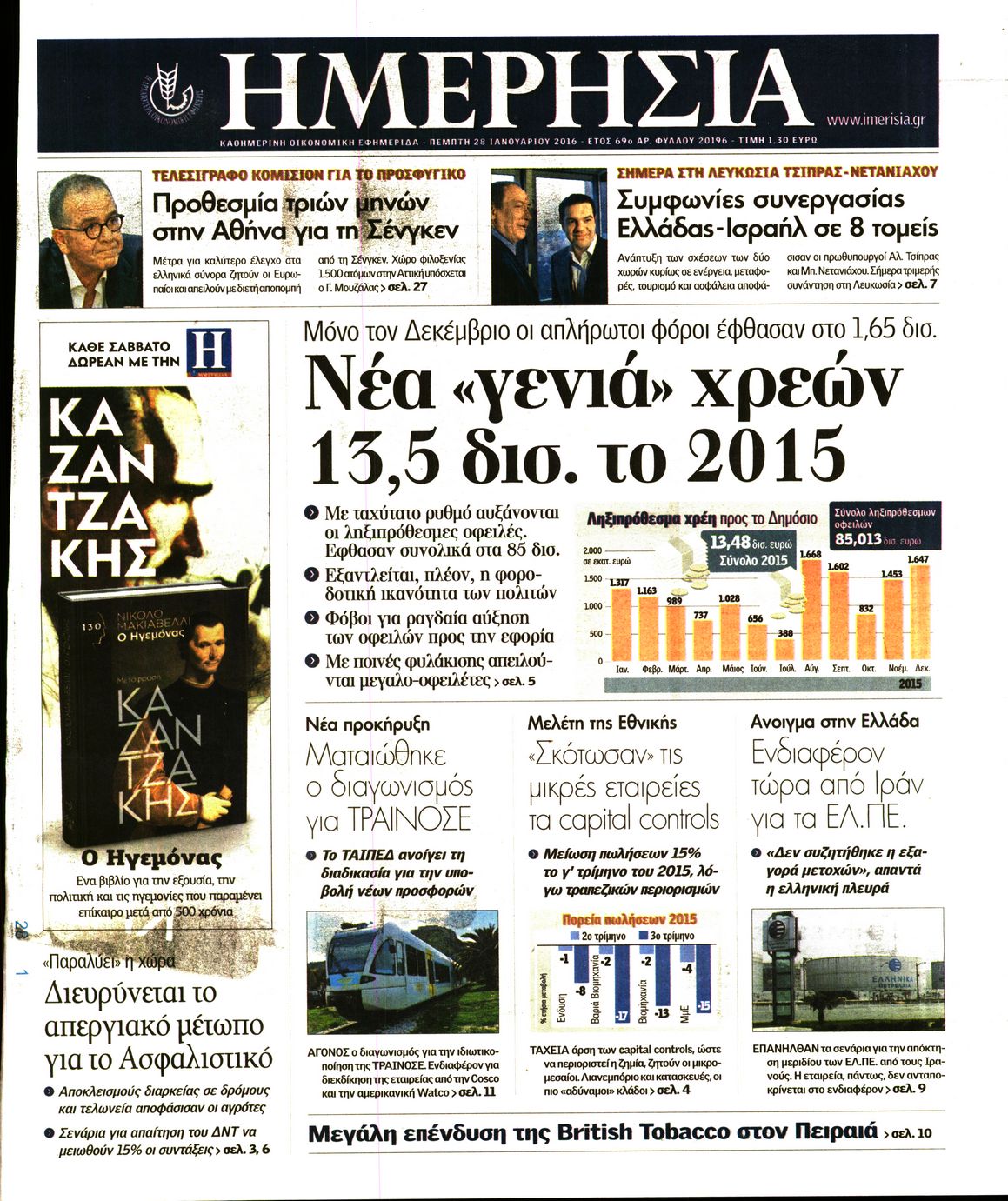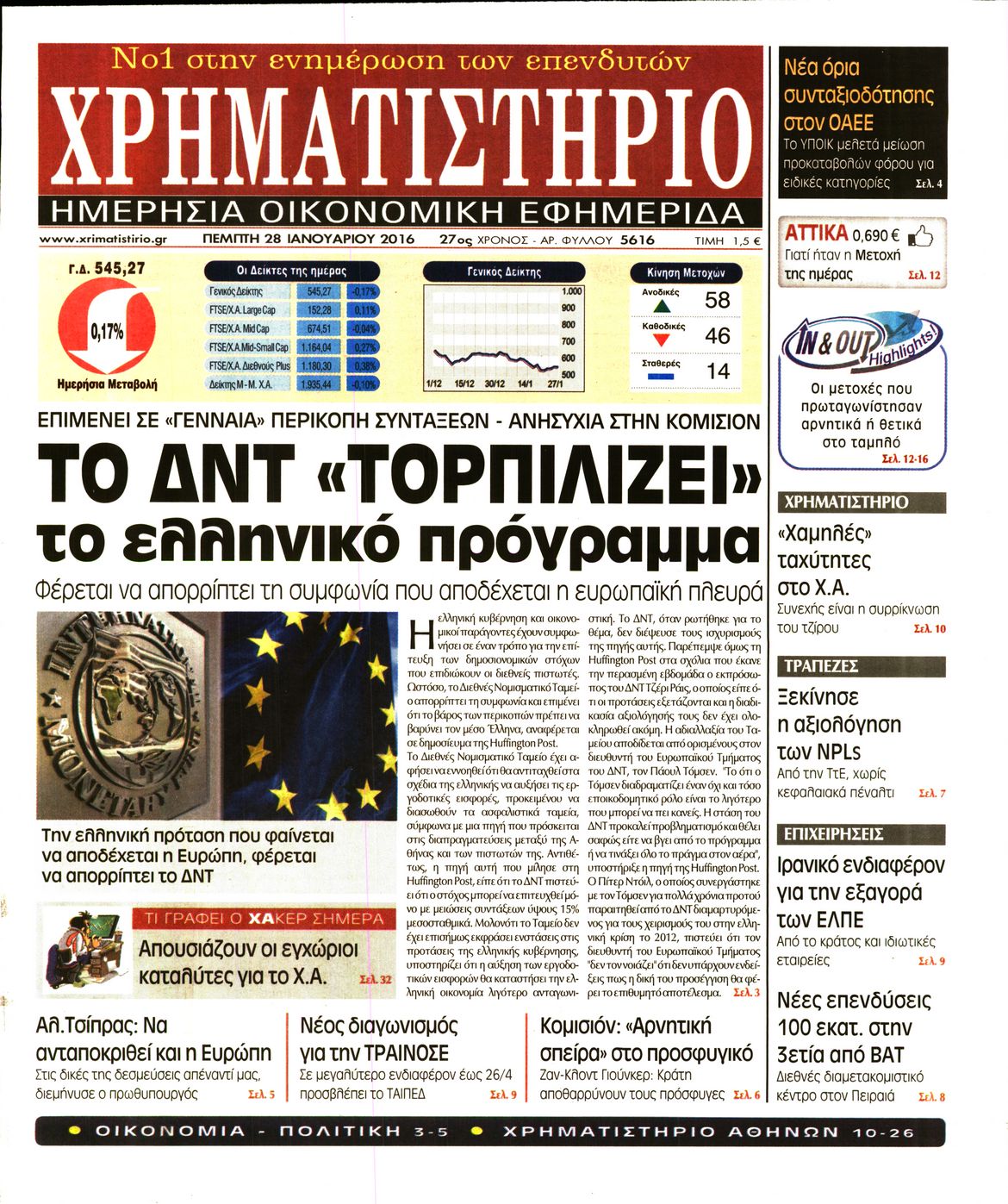Οι οικονομικές εφημερίδες 28/1/2016 Enikos Newsroom 05:01, Πέμπτη 28 Ιανουαρίου 2016 Media Διαβάστε τα σημερινά πρωτοσέλιδα των οικονομικών εφημερίδων: ΟΙΚΟΝΟΜΙΚΕΣ ΕΦΗΜΕΡΙΔΕΣ ΠΡΩΤΟΣΕΛΙΔΑ Μοιράσου το: σχολίασε κι εσύ (0 σχόλια) Ακολουθήστε το enikos.gr στο Google News και μάθετε πρώτοι όλες τις ειδήσεις Δείτε όλες τις τελευταίες ειδήσεις από την Ελλάδα και τον Κόσμο στο enikos.gr Ειδήσεις Ροή Ειδήσεων 2 ώρες πριν Εκτός ευρωομάδας ΣΥΡΙΖΑ ο Νίκος Παππάς μετά την επίθεση στον δημοσιογράφο Νίκο Γιαννόπουλο – Η μήνυση και οι νέες δηλώσεις 3 ώρες πριν «Αγριεύουν» οι αγρότες: «Δεν συντρέχει λόγος συνάντησης με τον πρωθυπουργό» – Ώρα αποφάσεων στη σύσκεψη της Πέμπτης 2 ώρες πριν Κυψέλη: Χωρίς την οικογένειά της δίπλα της απολογήθηκε η 16χρονη – «Της είχε επιτεθεί κάποιος για να την βιάσει, φοβήθηκε και κυκλοφορούσε με μαχαίρι» 2 ώρες πριν Politico: Το πρόβλημα της Ευρώπης δεν είναι το Βέλγιο αλλά ο Ντόναλντ Τραμπ 4 ώρες πριν Αλεξανδρούπολη: Πολυοργανική ανεπάρκεια λόγω υποσιτισμού η αιτία θανάτου του 3χρονου αγοριού 2 ώρες πριν Μυστήριο με τεράστιες κυκλικές πέτρες 200 κιλών – Ανακαλύφθηκαν τυχαία κατά τη διάρκεια οδικών έργων και κανείς δεν ξέρει από πού προέρχονται 3 ώρες πριν Ύπνος: Ειδικός εξηγεί τον πραγματικό λόγο που ξυπνάτε στις 4 τα ξημερώματα – Ο ρόλος των ορμονών και του κιρκάδιου ρυθμού 4 ώρες πριν Αριθμολογία: Οι άνθρωποι που έχουν γεννηθεί αυτές τις 4 ημερομηνίες, είναι τρυφεροί και αγαπούν ανιδιοτελώς 16 ώρες πριν 20 χρόνια τα Χριστούγεννα ξεκινούν στα Public με μεγάλη ποικιλία σε δώρα! 12 λεπτά πριν Σάρα Εσκενάζυ: Η πρώτη ανάρτηση για το θάνατο του πατέρα της, Αλμπέρτο Εσκενάζυ και η επιθυμία της οικογένειας 28 λεπτά πριν Παρί Σεν Ζερμέν – Φλαμένγκο 2-1 πεν. (1-1 κ.δ.): Οι Γάλλοι σήκωσαν και το Διηπειρωτικό με ήρωα τον Σαφόνοφ που έπιασε 4 πέναλτι 43 λεπτά πριν Βέλγους πολιτικούς και επικεφαλής χρηματοπιστωτικών ιδρυμάτων στοχοποιεί η Μόσχα για τα κατασχεθέντα περιουσιακά στοιχεία 58 λεπτά πριν ΗΠΑ: Αναζητείται δεύτερος ύποπτος για την επίθεση στο πανεπιστήμιο Μπράουν 1 ώρα πριν Λεωφόρος Αλεξάνδρας: Δεν εντοπίστηκε βόμβα έξω από το κολλέγιο – Προσήχθη άνδρας για το προειδοποιητικό σημείωμα ENIKOS NETWORK Αϋπνία: Το κόλπο που θα σας βοηθήσει να κοιμηθείτε απόψε – Είναι απλό και έχει αποτέλεσμα 2,6 εκατομμύρια πολίτες έχουν ήδη εμβολιαστεί κατά της γρίπης ΕΛΣΤΑΤ: Τι δείχνουν τα νέα στοιχεία για τις ηλεκτρονικές παραγγελίες των επιχειρήσεων ΚΕΠΕ: Οι 3 διακριτές συμβολές των ΜμΕ και της μεταποίησης στην ελληνική οικονομία Χαρτογραφώντας το «σημείο χωρίς επιστροφή»: Για πρώτη φορά αποκαλύπτεται με λεπτομέρεια το ακανθώδες όριο της ατμόσφαιρας τ... Η Google καταργεί τη λειτουργία «dark web report» – Πώς θα μπορούν οι χρήστες να διαγράφουν τα δεδομένα τους περισσότερα 22:24 , Τετάρτη 17 Δεκεμβρίου 2025 Το Σπίτι Δίπλα Στο Ποτάμι: Σε κίνδυνο η υγεία του Απόστολου – Τι θα δούμε απόψε “Το Σπίτι Δίπλα στο Ποτάμι” ξετυλίγει το νήμα της ζωής των πέντε αδελφών με καταισ... 21:14 , Τετάρτη 17 Δεκεμβρίου 2025 Παιχνίδια Εκδίκησης: Θα καταφέρει ο Χρήστος να κλονίσει την εμπιστοσύνη της Μάγιας απέναντι στον Άγη; Τα «Παιχνίδια Εκδίκησης» έρχονται απόψε στις 22:30, στον Αντ1, με το τελευταίο επεισόδιο της χ... 20:57 , Τετάρτη 17 Δεκεμβρίου 2025 Άγιος Έρωτας: Η Χλόη καταθέτει εναντίον του πατέρα της και ο Χάρης αποκαλύπτει στον Κλεάνθη ότι δεν είναι ο βιολογικός του πατέρας. Γεμάτο αποκαλύψεις είναι το νέο επεισόδιο της σειράς “Άγιος 