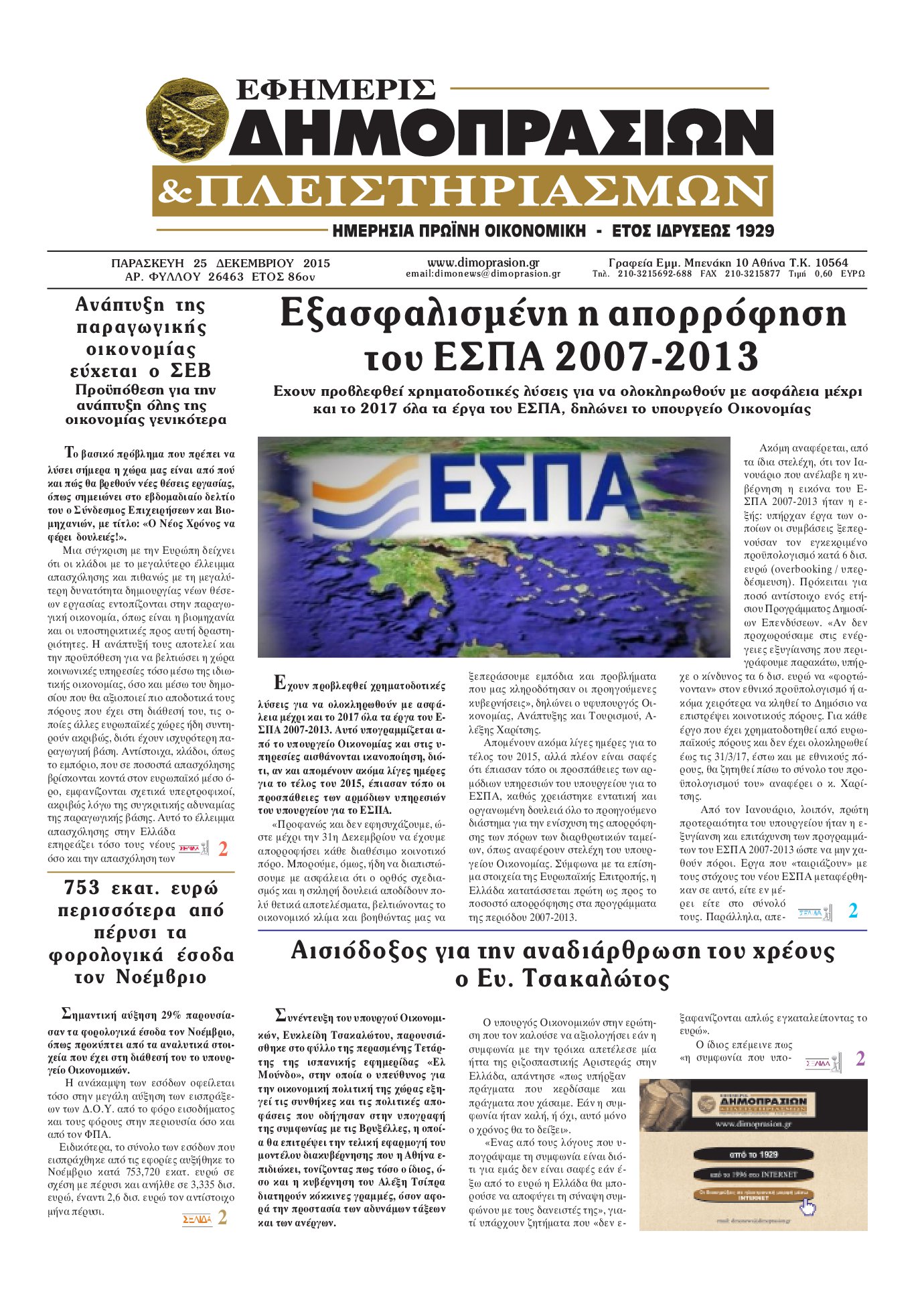 Οι οικονομικές εφημερίδες 28/12/2015 Enikos Newsroom 06:06, Δευτέρα 28 Δεκεμβρίου 2015 Media Διαβάστε τα σημερινά πρωτοσέλιδα των οικονομικών εφημερίδων: ΟΙΚΟΝΟΜΙΚΕΣ ΕΦΗΜΕΡΙΔΕΣ ΠΡΩΤΟΣΕΛΙΔΑ Μοιράσου το: σχολίασε κι εσύ (0 σχόλια) Ακολουθήστε το enikos.gr στο Google News και μάθετε πρώτοι όλες τις ειδήσεις Δείτε όλες τις τελευταίες ειδήσεις από την Ελλάδα και τον Κόσμο στο enikos.gr Ειδήσεις Ροή Ειδήσεων 2 ώρες πριν Πούτιν: «Ανοησίες» και «υστερίες» οι ισχυρισμοί της Ευρώπης για πιθανή σύγκρουση με τη Ρωσία – «Κάνουν πλύση εγκεφάλου» 6 ώρες πριν Έρευνα MRB: Η πρόθεση ψήφου και τα σημαντικότερα προβλήματα – Οι «λέξεις» που εκφράζουν τους πολίτες 3 ώρες πριν Αμοργός: «Θα προσπαθήσω να το κάνω κάθε μέρα» – Ποιος είναι ο αγρότης που έστησε μόνος του το πρώτο μπλόκο στο νησί 41 λεπτά πριν Τραγωδία στην Αλεξανδρούπολη: Παιδάκι 3 ετών μεταφέρθηκε νεκρό από τη μητέρα του στο νοσοκομείο 1 ώρα πριν Συνάντηση Μητσοτάκη με την Κ.Ο. της ΝΔ: Οι αφίξεις των βουλευτών, τα γλυκά και τα «πηγαδάκια» 5 ώρες πριν Τα 4 ζώδια που ξαναβρίσκουν τον εαυτό τους – «Μπαίνετε επιτέλους στην ουσία των πραγμάτων» 7 ώρες πριν 20 χρόνια τα Χριστούγεννα ξεκινούν στα Public με μεγάλη ποικιλία σε δώρα! 5 ώρες πριν «Δεν είχα κλάψει από τότε που διαγνώστηκα με καρκίνο, ώσπου ένα τηλεφώνημα με έκανε να λυγίσω» – Η συγκλονιστική εξομολόγηση ενός άνδρα 4 ώρες πριν Τα 7 σπάνια χαρακτηριστικά που κάνουν κάποιους ανθρώπους ακαταμάχητους 7 δευτερόλεπτα πριν Εξαφάνιση 33χρονου γιατρού στην Κρήτη: Για απάτη κατηγορείται ο ιδιωτικός ερευνητής που συνελήφθη 8 λεπτά πριν Εξεταστική για ΟΠΕΚΕΠΕ-Μυλωνάκης: Διαχρονικές, διακομματικές οι παθογένειες – Τι είπε για Μπουκώρο και Βάρρα 13 λεπτά πριν Παναθηναϊκός: Θέλει τον Κέπα της Άρσεναλ δανεικό για 6 μήνες 19 λεπτά πριν Το Λαϊκό Λαχείο στον ρυθμό των Χριστουγέννων: Μοιράζει μέχρι και 1.000.000 ευρώ στην ειδική κλήρωση της Παρασκευής 19 Δεκεμβρίου 24 λεπτά πριν Πετράλωνα: Εξαφανίστηκε 13χρονος από χώρο φιλοξενίας ασυνόδευτων ανηλίκων ENIKOS NETWORK 5 πράγματα που αποφεύγει γαστρεντερολόγος για να μειώσει τον κίνδυνο καρκίνου του εντέρου Ανησυχητική αύξηση της υπέρτασης στα παιδιά – Πώς θα τα προστατέψουμε; ΕΛΕΤΑΕΝ: Πόσα χρήματα θα δοθούν σε δήμους και νοικοκυριά από τις ΑΠΕ «IRIS Παντού»: Στην κορυφή της Ευρώπης η Ελλάδα με 120 εκατ. ευρώ συναλλαγές το 2025 – Η σύγκριση με τις άλλες χώρες της Ευ... Σύγχρονος Νοστράδαμος: Προειδοποιεί για «μεγάλο γεγονός» τους επόμενους μήνες που θα συγκλονίσει τη Βρετανία και τον κόσμο Τεστ παρατηρητικότητας: Μπορείτε να βρείτε τις 3 διαφορές στις εικόνες με έναν πιγκουίνο σε 14 δευτερόλεπτα περισσότερα 12:35 , Τετάρτη 17 Δεκεμβρίου 2025 Μίρκα Παπακωνσταντίνου: «Δεν ήμουν αισιόδοξη για τα νούμερα – Είμαι ρεαλίστρια» Στα γυρίσματα του εορταστικού επεισοδίου της αγαπημένης σειράς “Το Σόι Σου”, βρέθηκε η κάμερα ... 12:12 , Τετάρτη 17 Δεκεμβρίου 2025 Ακούστε την εκπομπή του Νίκου Χατζηνικολάου 17/12/2025 Ακούστε την εκπομπή του Νίκου Χατζηνικολάου στον ραδιοφωνικό σταθμό RealFm 97,8, την Τετάρτη 1... 11:35 , Τετάρτη 17 Δεκεμβρίου 2025 Home Alone: Το σπίτι της ταινίας θα ανακαινιστεί – Επιστροφή στην αισθητική της δεκαετίας του ’90 Οι νέοι ιδιοκτήτες του πραγματικού σπιτιού που παρουσιάζεται στην κλασική ταινία του 1990 «Hom... 11:25 , Τετάρτη 17 Δεκεμβρίου 2025 Grand Hotel: Απόψε το τελευταίο επεισόδιο της χρονιάς – Όλα τα μυστικά μένουν εδώ Το τελευταίο επεισόδιο της χρονιάς της σειράς «Grand Hotel» θα προβληθεί απόψε στι