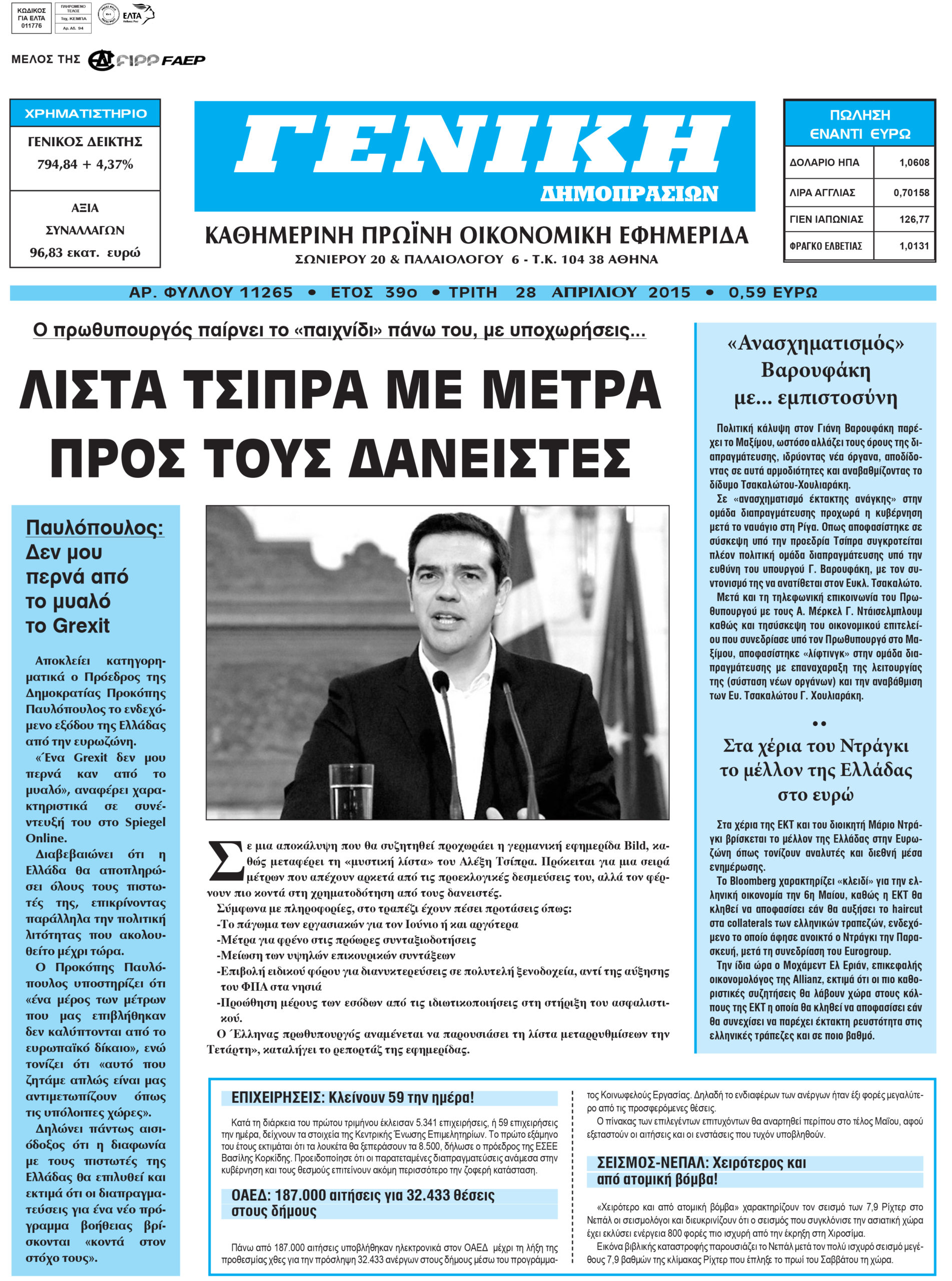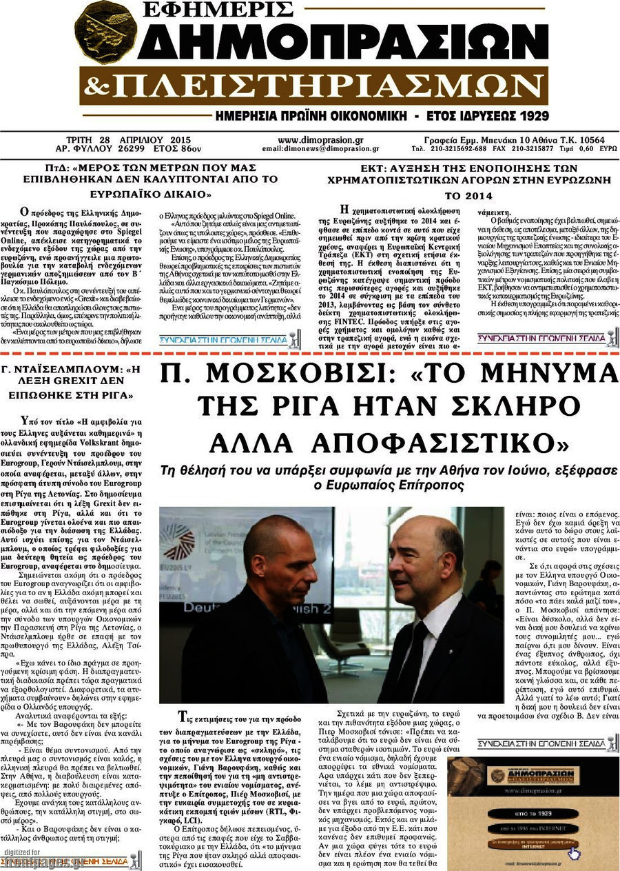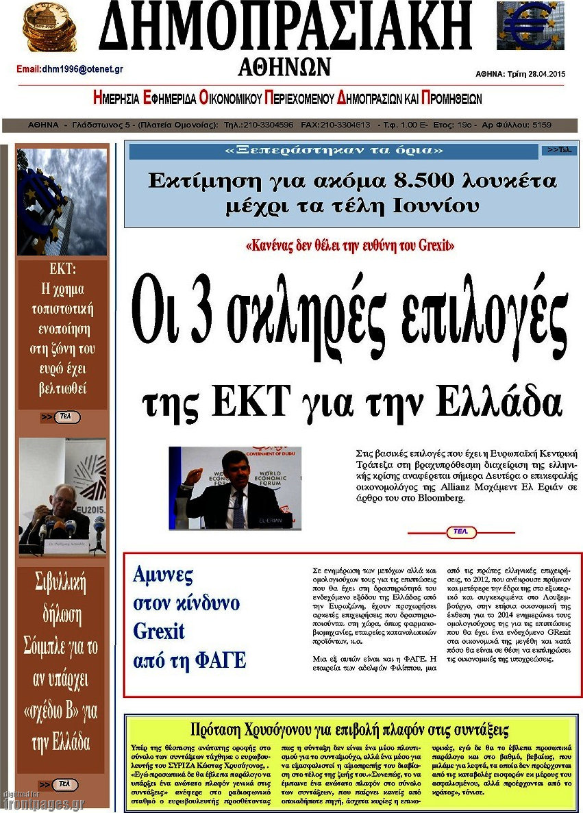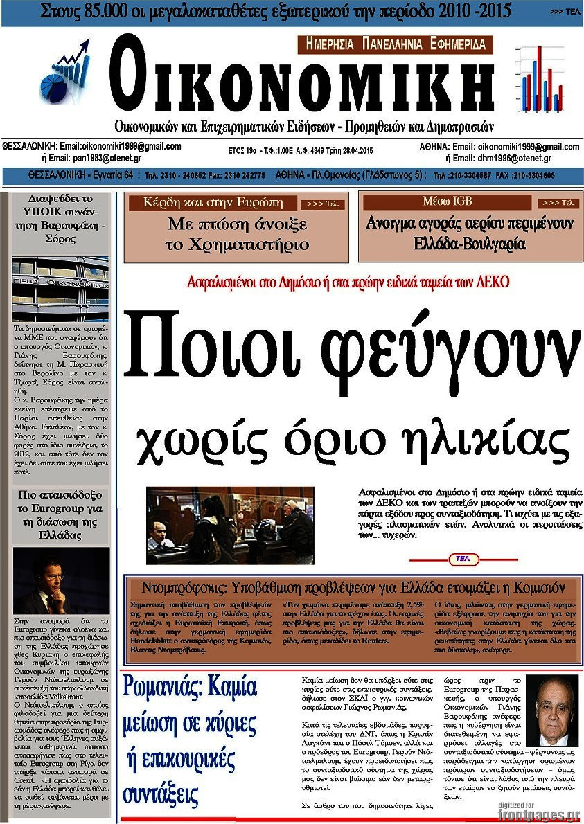 Οι οικονομικές εφημερίδες 28/4/2015 Enikos Newsroom 07:17, Τρίτη 28 Απριλίου 2015 Media Διαβάστε τα σημερινά πρωτοσέλιδα των οικονομικών εφημερίδων: ΟΙΚΟΝΟΜΙΚΕΣ ΕΦΗΜΕΡΙΔΕΣ ΠΡΩΤΟΣΕΛΙΔΑ Μοιράσου το: σχολίασε κι εσύ (0 σχόλια) Ακολουθήστε το enikos.gr στο Google News και μάθετε πρώτοι όλες τις ειδήσεις Δείτε όλες τις τελευταίες ειδήσεις από την Ελλάδα και τον Κόσμο στο enikos.gr Ειδήσεις Ροή Ειδήσεων 2 ώρες πριν Νίκος Παππάς: «Είχα λάθος αντίδραση στη δική του δράση-πρόκληση – Δεν θα αναλύσω σε τι κατάσταση ήταν ο δημοσιογράφος» 32 λεπτά πριν Αλεξανδρούπολη: Πολυοργανική ανεπάρκεια λόγω υποσιτισμού η αιτία θανάτου του 3χρονου αγοριού 1 ώρα πριν Δημοσκόπηση Pulse: Η διαφορά ΝΔ-ΠΑΣΟΚ – Με ποια κριτήρια θα ψηφίσουν οι πολίτες στις επόμενες εκλογές 1 ώρα πριν Αγρότες: Άνοιξαν τον μεθοριακό σταθμό του Προμαχώνα – Κανονικά περνούν τα φορτηγά 2 ώρες πριν Συγκλονιστικό βίντεο: Τρόμος για τουρίστες που σώθηκαν την τελευταία στιγμή από λεωφορείο που κατρακυλούσε σε φαράγγι 1 ώρα πριν Αριθμολογία: Οι άνθρωποι που έχουν γεννηθεί αυτές τις 4 ημερομηνίες, είναι τρυφεροί και αγαπούν ανιδιοτελώς 3 ώρες πριν Οι άνθρωποι που θυμούνται τα όνειρά τους, συνήθως μοιράζονται αυτά τα 6 σπάνια χαρακτηριστικά 2 ώρες πριν Καθρέφτες μπάνιου: Το απλό κόλπο με την οδοντόκρεμα για να μην θολώνουν 13 ώρες πριν 20 χρόνια τα Χριστούγεννα ξεκινούν στα Public με μεγάλη ποικιλία σε δώρα! 4 λεπτά πριν Ύπνος: Ειδικός εξηγεί τον πραγματικό λόγο που ξυπνάτε στις 4 τα ξημερώματα – Ο ρόλος των ορμονών και του κιρκάδιου ρυθμού 16 λεπτά πριν Μαρίζα Ρίζου: «Θυμάμαι ότι ενώ ο μπαμπάς μου δεν πίνει, ερχόταν οριακά μεθυσμένος στο live από το άγχος του» 24 λεπτά πριν Δημοσκόπηση MRB: Πρώτη η ΝΔ με 22,6%, στο 10,9% το ΠΑΣΟΚ – Το 80% των πολιτών στηρίζει τους αγρότες, τι λένε για Τσίπρα και Καρυστιανού 32 λεπτά πριν Αλεξανδρούπολη: Πολυοργανική ανεπάρκεια λόγω υποσιτισμού η αιτία θανάτου του 3χρονου αγοριού 39 λεπτά πριν LEFT: Ξεκίνησαν οι διαδικασίες για τη διαγραφή του Νίκου Παππά από την ομάδα της Αριστεράς στο Ευρωκοινοβούλιο ENIKOS NETWORK Αϋπνία: Το κόλπο που θα σας βοηθήσει να κοιμηθείτε απόψε – Είναι απλό και έχει αποτέλεσμα 2,6 εκατομμύρια πολίτες έχουν ήδη εμβολιαστεί κατά της γρίπης ΑΑΔΕ: Καταβλήθηκε η τέταρτη δόση επιστροφής ΕΦΚ αγροτικού πετρελαίου – Οδηγίες για τη διόρθωση παραστατικών Πώς θα γίνει η πληρωμή αγροτεμαχίων έως 20 στρέμματα παρά τα ζητήματα ΚΑΕΚ Χαρτογραφώντας το «σημείο χωρίς επιστροφή»: Για πρώτη φορά αποκαλύπτεται με λεπτομέρεια το ακανθώδες όριο της ατμόσφαιρας τ... Η Google καταργεί τη λειτουργία «dark web report» – Πώς θα μπορούν οι χρήστες να διαγράφουν τα δεδομένα τους περισσότερα 21:14 , Τετάρτη 17 Δεκεμβρίου 2025 Παιχνίδια Εκδίκησης: Θα καταφέρει ο Χρήστος να κλονίσει την εμπιστοσύνη της Μάγιας απέναντι στον Άγη; Τα «Παιχνίδια Εκδίκησης» έρχονται απόψε στις 22:30, στον Αντ1, με το τελευταίο επεισόδιο της χ... 20:57 , Τετάρτη 17 Δεκεμβρίου 2025 Άγιος Έρωτας: Η Χλόη καταθέτει εναντίον του πατέρα της και ο Χάρης αποκαλύπτει στον Κλεάνθη ότι δεν είναι ο βιολογικός του πατέρας. Γεμάτο αποκαλύψεις είναι το νέο επεισόδιο της σειράς “Άγιος Έρωτας” απόψε στις 21:... 20:15 , Τετάρτη 17 Δεκεμβρίου 2025 Η ανακοίνωση της ΕΣΗΕΑ για την επίθεση του Ευρωβουλευτή Νίκου Παππά κατά του δημοσιογράφου Νίκου Γιαννόπουλου «Το Δ.Σ. της ΕΣΗΕΑ καταδικάζει απερίφραστα την ενέργεια του Ευρωβουλευτή του ΣΥΡΙΖΑ Νίκου Παππ... 12:35 , Τετάρτη 17 Δεκεμβρίου 2025 Μίρκα Παπακωνσταντίνο