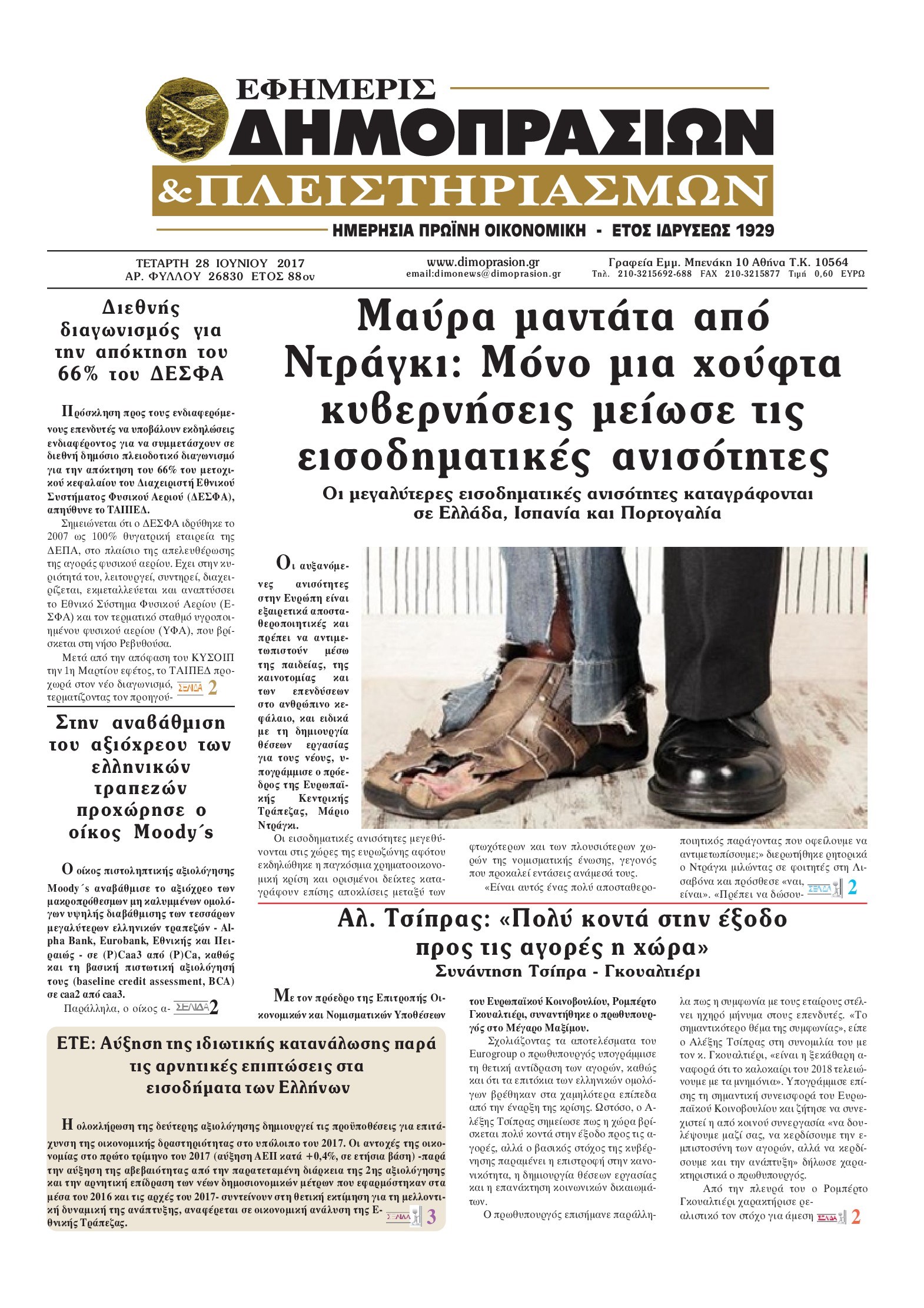 Οι οικονομικές εφημερίδες 28/6/2017 Enikos Newsroom 07:07, Τετάρτη 28 Ιουνίου 2017 Media Διαβάστε τα σημερινά πρωτοσέλιδα των οικονομικών εφημερίδων: ΟΙΚΟΝΟΜΙΚΕΣ ΕΦΗΜΕΡΙΔΕΣ ΠΡΩΤΟΣΕΛΙΔΑ Μοιράσου το: σχολίασε κι εσύ (0 σχόλια) Ακολουθήστε το enikos.gr στο Google News και μάθετε πρώτοι όλες τις ειδήσεις Δείτε όλες τις τελευταίες ειδήσεις από την Ελλάδα και τον Κόσμο στο enikos.gr Ειδήσεις Ροή Ειδήσεων 3 ώρες πριν Αυξάνουν την πίεση προς την κυβέρνηση οι αγρότες: Κλείνουν παρακαμπτήριους και ανοίγουν διόδια – Τι θα γίνει τις γιορτές 2 ώρες πριν ΟΠΕΚΕΠΕ: Προφυλακιστέος ο φερόμενος αρχηγός και ο λογιστής της εγκληματικής οργάνωσης 3 ώρες πριν Φοινικούντα: Το Σάββατο απολογείται ο 30χρονος γιος γνωστού επιχειρηματία της Πλάκας που παραδόθηκε – Όσα είπε στους αστυνομικούς και ο ρόλος του στο έγκλημα 3 ώρες πριν Μπορεί ο Μαδούρο να αντέξει τον αποκλεισμό του Τραμπ; Τι θα χρειαστεί η Ουάσινγκτον για να τον ανατρέψει 4 ώρες πριν Πρίγκιπας Ουίλιαμ – Κέιτ: Η νέα οικογενειακή φωτογραφία για τις Χριστουγεννιάτικες κάρτες του 2025 4 ώρες πριν Ύπνος: Η απλή βραδινή ρουτίνα για να προστατεύσετε τα μαλλιά σας από το κρύο κατά τη διάρκεια του χειμώνα 5 ώρες πριν Manifesting: Πώς να συναντήσετε τον σύντροφο της ζωής σας, ανάλογα με τον μήνα γέννησής σας 2 ημέρες πριν 20 χρόνια τα Χριστούγεννα ξεκινούν στα Public με μεγάλη ποικιλία σε δώρα! 3 ώρες πριν Αρχαιολόγοι ανακάλυψαν ρωμαϊκά τεχνουργήματα από μια πόλη που δεν υπήρξε ποτέ – Τα τρία εντυπωσιακά κτίρια και ο αμφορέας με τις… σαρδέλες 5 λεπτά πριν Μιχάλης Χρυσοχοΐδης από την Κωνσταντινούπολη: Κοινές επιχειρήσεις Ελλάδας – Τουρκίας ενάντια στο οργανωμένο έγκλημα 28 λεπτά πριν Μάρκο Νίκολιτς: «Είμαι περήφανος για τους παίκτες μου, όποιος αντίπαλος και να έρθει θα προετοιμαστούμε» 37 λεπτά πριν ΟΗΕ: Την εκλογή του νέου ύπατου αρμοστή για τους Πρόσφυγες Μπαρχάμ Άχμεντ Σαλίχ χαιρέτησε ο Αντόνιο Γκουτέρες 41 λεπτά πριν Σύνοδος Κορυφής στις Βρυξέλλες: Ακόμη πιο κοντά σε διέξοδο για τη χρηματοδότηση της Ουκρανίας 49 λεπτά πριν ΟΗΕ: Iστορική επίσκεψη του Συμβουλίου Ασφαλείας στη Δαμασκό – Mήνυμα Ελλάδας για συμπερίληψη και λογοδοσία ENIKOS NETWORK Σε περίοδο αυξημένης δραστηριότητας η γρίπη στην Ελλάδα-Μέτρα προστασίας από τον ΕΟΔΥ Σκέφτεστε συνέχεια συζητήσεις που έχετε κάνει; Τι σημαίνει αυτό, σύμφωνα με ειδικό Στεγαστικό: Τι λέει η ΠΟΜΙΔΑ για τα νέα μέτρα που ανακοίνωσε ο Κυριάκος Μητσοτάκης Λαγκάρντ: Αισιόδοξη για την ανάπτυξη της Ευρωζώνης, αβέβαιη για τον πληθωρισμό Χαρτογραφώντας το «σημείο χωρίς επιστροφή»: Για πρώτη φορά αποκαλύπτεται με λεπτομέρεια το ακανθώδες όριο της ατμόσφαιρας τ... Η Google καταργεί τη λειτουργία «dark web report» – Πώς θα μπορούν οι χρήστες να διαγράφουν τα δεδομένα τους περισσότερα 17:45 , Πέμπτη 18 Δεκεμβρίου 2025 ROUK ZOUK: Εορταστικό επεισόδιο με καλεσμένους τους πρωταγωνιστές του «Γιατί ρε πατέρα» Το Σάββατο 20 Δεκεμβρίου στις 21:00, η Ζέτα Μακρυπούλια υποδέχεται εκλεκτούς ηθοποιούς που όλο... 17:20 , Πέμπτη 18 Δεκεμβρίου 2025 Άγιος έρωτας: Η Χριστίνα εξομολογείται στον πατέρα Νικόλαο, απόψε στις 21:00 στον Alpha Η Νότα αποφασίζει να εκδικηθεί τον Πέτρο και τον Στέφανο, για χάρη του Λούη, όμως τα πράγματα ... 16:50 , Πέμπτη 18 Δεκεμβρίου 2025 Να μ’ αγαπάς: Ζωή και Φωτεινή συμφιλιώνονται ως μάνα με κόρη, απόψε στις 20:00 Η ταυτότητα του Άγγελου αποκαλύπτεται στο νέο επεισόδιο της σειράς “Να μ’ αγαπάς... 15:52 , Πέμπτη 18 Δεκεμβρίου 2025 Το Σπίτι Δίπλα Στο Ποτάμι: Το καθηλωτ