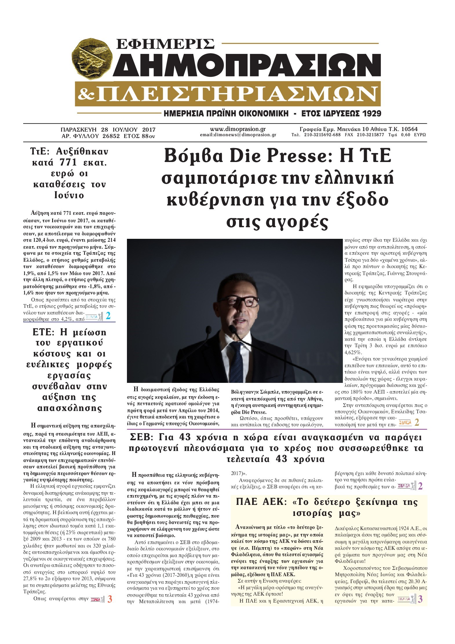 Οι οικονομικές εφημερίδες 28/7/2017 Enikos Newsroom 07:50, Παρασκευή 28 Ιουλίου 2017 Media Διαβάστε τα σημερινά πρωτοσέλιδα των οικονομικών εφημερίδων: ΠΡΩΤΟΣΕΛΙΔΑ Μοιράσου το: σχολίασε κι εσύ (0 σχόλια) Ακολουθήστε το enikos.gr στο Google News και μάθετε πρώτοι όλες τις ειδήσεις Δείτε όλες τις τελευταίες ειδήσεις από την Ελλάδα και τον Κόσμο στο enikos.gr Ειδήσεις Ροή Ειδήσεων 2 ώρες πριν Καμία «ανακωχή» για τους αγρότες: Γενική συνέλευση σήμερα στο μπλόκο της Νίκαιας – Ο σχεδιασμός για ανοιχτούς δρόμους τα Χριστούγεννα 1 ώρα πριν Γαλλία: Έτοιμοι για Χριστούγεννα στους δρόμους οι αγρότες – «Οι δεσμεύσεις της κυβέρνησης δεν είναι αρκετές» 52 λεπτά πριν Φοροδιαφυγή και «κενό ΦΠΑ»: Πώς τα ψηφιακά εργαλεία έφεραν δισεκατομμύρια στα ταμεία του Δημοσίου 1 ώρα πριν Επιχείρηση διάσωσης στον Όλυμπο – Ορειβάτης εγκλωβίστηκε και έδωσε στίγμα μέσω 112 2 ώρες πριν Τζορτζ Κλούνεϊ: Πέθανε η αδελφή του, Άντα Ζάιντλερ – «Η ηρωίδα μου» 4 ώρες πριν Μήλο vs μπανάνα: Ποιο φρούτο έχει περισσότερες φυτικές ίνες, σύμφωνα με διαιτολόγους – Τα οφέλη τους για την υγεία 1 ώρα πριν Οι γονείς της θέλουν να έχουν πρόσβαση στον τραπεζικό της λογαριασμό – «Επιμένουν πως στις οικογένειες δεν υπάρχουν μυστικά» 1 ώρα πριν Αρχαιολόγοι ανακάλυψαν κάτι που δεν περίμεναν: Τα μαθηματικά υπήρχαν πριν από τους αριθμούς – Το μυστικό που κρύβεται πίσω από περίεργα αγγεία 8.000 ετών 1 ημέρα πριν Enerwave: Το νέο «ρεύμα» στη λιανική ενέργειας που αλλάζει την εμπειρία του καταναλωτή 2 λεπτά πριν «Ενεργή Μάχη»: Τι αλλάζει με το νέο νομοσχέδιο της Πολιτικής Προστασίας – Τα 10 βασικά σημεία 5 λεπτά πριν Τα άστρα ευνοούν σκανδαλωδώς 4 ζώδια – «Εμφανίζονται ξαφνικά ευκαιρίες γιατί αποφασίζετε να αφήσετε πίσω το παρελθόν» 11 λεπτά πριν Γρίπη: «Καμπανάκι» από τους επιστήμονες για έξαρση κρουσμάτων στις γιορτές – Ποιοι κινδυνεύουν και πώς προστατευόμαστε 19 λεπτά πριν Πυροβολισμοί στη Νότια Αφρική: Τουλάχιστον εννέα άνθρωποι σκοτώθηκαν κοντά στο Γιοχάνεσμπουργκ 27 λεπτά πριν Το λάθος στην ταινία Die Hard που άφησε άναυδους τους θαυμαστές του Μπρους Γουίλις ENIKOS NETWORK Έχετε καταρροή και φαγούρα στα μάτια στις γιορτές; Μπορεί να ευθύνεται το σύνδρομο χριστουγεννιάτικου δέντρου Η Danielle Fishel μετά τη διάγνωση καρκίνου του μαστού: «Είμαι καλά και νιώθω ευγνωμοσύνη» Πρωτοχρονιά 2026: Πόσο θα κοστίσει φέτος η βασιλόπιτα – Οι τιμές σε ζαχαροπλαστεία, φούρνους και σούπερ μάρκετ «Πολεμική» προετοιμασία από την ευρωπαϊκή βιομηχανία ενέργειας – Η Eurelectric ζητεί «ομπρέλα» προστασίας για τις υποδομές Χαρτογραφώντας το «σημείο χωρίς επιστροφή»: Για πρώτη φορά αποκαλύπτεται με λεπτομέρεια το ακανθώδες όριο της ατμόσφαιρας τ... Η Google καταργεί τη λειτουργία «dark web report» – Πώς θα μπορούν οι χρήστες να διαγράφουν τα δεδομένα τους περισσότερα 09:43 , Κυριακή 21 Δεκεμβρίου 2025 Το λάθος στην ταινία Die Hard που άφησε άναυδους τους θαυμαστές του Μπρους Γουίλις Ένας φανατικός των ταινιών άφησε άναυδους τους θαυμαστές του Die Hard, επισημαίνοντας τρία βασ... 08:13 , Κυριακή 21 Δεκεμβρίου 2025 Άγιος έρωτας: Ένας καταστροφικός σεισμός χτυπά τη Στέρνα Καταιγιστικές είναι οι εξελίξεις στα δυο τελευταία, συγκλονιστικά επεισόδια του 2025 της σειρά... 08:00 , Κυριακή 21 Δεκεμβρίου 2025 Σήμερα με τη Realnews: Ό,τι και αν αγοράσεις, σκανάρεις και κερδίζεις! Σήμερα με τη Realnews: Ό,τι και αν αγοράσεις, σκανάρεις και κερδίζεις! Με το PADU app, το κορυ... 07:00 , Κυριακή 21 Δεκεμβρίου 2025 Σήμερα με τη Realnews: Instyle, μαζί Drive 