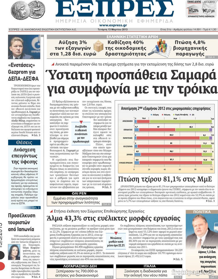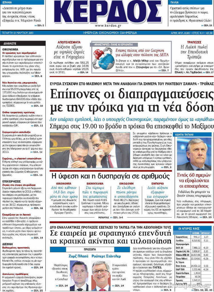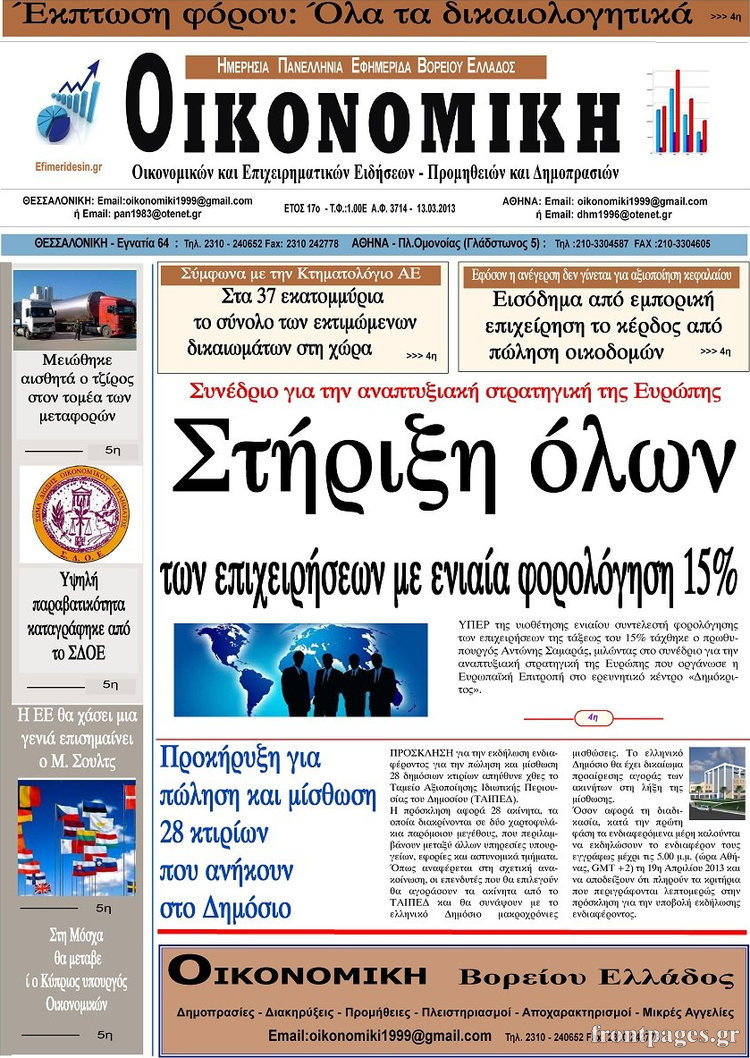 Οι οικονομικές εφημερίδες Enikos Newsroom 09:23, Τετάρτη 13 Μαρτίου 2013 Media Οι οικονομικές εφημερίδες ΕΦΗΜΕΡΙΔΕΣ ΟΙΚΟΝΟΜΙΚΕΣ ΕΦΗΜΕΡΙΔΕΣ ΠΡΩΤΟΣΕΛΙΔΑ Μοιράσου το: σχολίασε κι εσύ (0 σχόλια) Ακολουθήστε το enikos.gr στο Google News και μάθετε πρώτοι όλες τις ειδήσεις Δείτε όλες τις τελευταίες ειδήσεις από την Ελλάδα και τον Κόσμο στο enikos.gr Ειδήσεις Ροή Ειδήσεων 50 λεπτά πριν Αυστραλία: Σχέσεις με το ISIS εκτιμάται πως είχαν οι δράστες της τρομοκρατικής επίθεσης στο Σίδνεϊ 56 λεπτά πριν Αγρότες: Αμετακίνητοι από τα μπλόκα σε τελωνεία και εθνικές οδούς – Ο χάρτης των κινητοποιήσεων και τα αιτήματά τους 1 ώρα πριν Σοκ στο Χόλιγουντ: Νεκροί από μαχαιριές ο σκηνοθέτης Ρομπ Ράινερ και η σύζυγός του – Αναφορές ότι τους σκότωσε ο γιος τους 1 ώρα πριν Δολοφονία στη Φοινικούντα: Απολογούνται σήμερα οι δύο συλληφθέντες – Στο «κάδρο» και δύο γυναίκες 2 ώρες πριν Δάνεια σε ελβετικό φράγκο: Ανακοινώνεται η ρύθμιση – Ποιοι και πόσο όφελος θα έχουν 1 ώρα πριν Κάτω από παλάτι κρυβόταν ένα άλλο μνημειώδες ανάκτορο: Οι ανασκαφές σε αρχαία πόλη αποκάλυψαν τα ερείπια και τα μυστικά του 3 ώρες πριν Οπτική ψευδαίσθηση: Μόνο το 1% των ανθρώπων θα βρει το ψάρι σε 12 δευτερόλεπτα 3 ώρες πριν Διατροφή: Γιατρός προειδοποιεί για 2 απλά λάθη που αυξάνουν τον κίνδυνο χρόνιων παθήσεων 4 ώρες πριν Τα ζώδια σήμερα, Δευτέρα 15 Δεκεμβρίου: Ιχθύες, ξεκινήστε από εκεί που η παρουσία σας έχει σημασία 6 λεπτά πριν Θρίλερ στη Φοινικούντα: Ετοίμαζαν τη δολοφονία από το 2022 11 λεπτά πριν Κληρονόμησε 2,8 εκατ. ευρώ και φοβάται ότι οι άνδρες θα την πλησιάζουν για τα λεφτά – «Μήπως καλύτερα να το κρατήσω μυστικό;» 16 λεπτά πριν Τι αλλάζει σε διαθήκες και περιουσιακές διεκδικήσεις 21 λεπτά πριν Αγρότες: Κλειστή η εθνική οδός Αθηνών – Θεσσαλονίκης στο ύψος της Νίκαιας – Κινητοποίηση στην πλατεία της Λάρισας 25 λεπτά πριν Τρόμος στην Κηφισιά: Ανήλικος ληστής έκανε κεφαλοκλείδωμα σε γυναίκα υπάλληλο φούρνου και άρπαξε χρήματα – ΒΙΝΤΕΟ ENIKOS NETWORK Έχετε καλή φυσική κατάσταση; Δείτε αν μπορείτε να κάνετε αυτές τις 5 κινήσεις 21χρονη που έγινε αγνώριστη χάνοντας 45 κιλά αποκαλύπτει το πρωινό που καίει λίπος Δάνεια σε ελβετικό φράγκο: Ανακοινώνεται η ρύθμιση- Ποιοι και πόσο θα έχουν όφελος – Όλες οι λεπτομέρειες Τέλος οι διώξεις για χρέη σε Εφορία και ΕΦΚΑ – Τι προβλέπει νέα διάταξη μετά την πτώχευση Σύγχρονος Νοστράδαμος: Προειδοποιεί για «μεγάλο γεγονός» τους επόμενους μήνες που θα συγκλονίσει τη Βρετανία και τον κόσμο Τεστ παρατηρητικότητας: Μπορείτε να βρείτε τις 3 διαφορές στις εικόνες με έναν πιγκουίνο σε 14 δευτερόλεπτα περισσότερα 07:42 , Δευτέρα 15 Δεκεμβρίου 2025 Την Κυριακή με τη Realnews: Δωροεπιταγή10€ Δωροεπιταγή αξίας 10€ για αγορές άνω των 60€ από τα πολυκαταστήματα FactoryOutlet H προσφορά ι... 07:17 , Δευτέρα 15 Δεκεμβρίου 2025 Αυτή την Κυριακή με τη Realnews: Instyle, μαζί Drive και Realnews Geopolitics Αυτή την Κυριακή με τη Realnews: Instyle, μαζί Drive και Realnews Geopolitics Instyle Η Άννα Ρ... 05:49 , Δευτέρα 15 Δεκεμβρίου 2025 Οι οικονομικές εφημερίδες 15/12/2025 Διαβάστε τα πρωτοσέλιδα από τις οικονομικές εφημερίδες, σήμερα 15/12/2025. 05:43 , Δευτέρα 15 Δεκεμβρίου 2025 Οι αθλητικές εφημερίδες 15/12/2025 Διαβάστε τα πρωτοσέλιδα από τις αθλητικές εφημερίδες, σήμερα 15/12/2025. ΤΕΛΕΥΤΑΙΕΣ ΕΙΔΗΣΕΙΣ 6 λεπτά πριν Θρίλερ στη Φοινικούντα: Ετοίμαζαν τη δολοφονία από το... 11 λεπτά πριν Κληρονόμησε 2,8 εκατ. ευρώ και φοβάται ότι οι άνδρες θα... 16 λεπτά πριν Τι αλλάζει σε διαθήκες και περιουσιακές διεκδικήσεις 21 λεπτά 