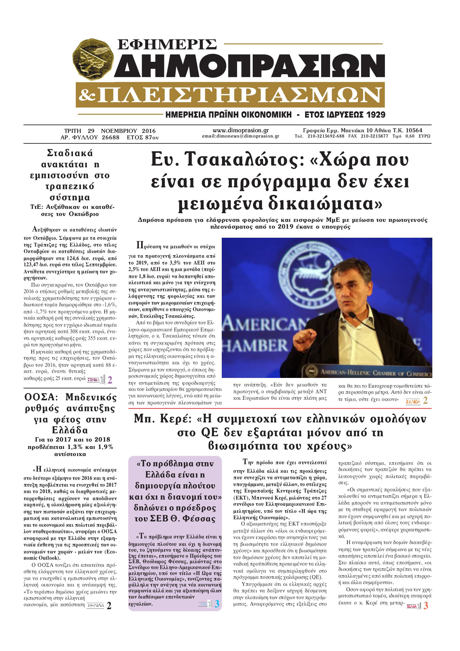 Οι οικονομικές εφημερίδες 29/11/2016 Enikos Newsroom 04:43, Τρίτη 29 Νοεμβρίου 2016 Media Διαβάστε τα σημερινά πρωτοσέλιδα των οικονομικών εφημερίδων: ΟΙΚΟΝΟΜΙΚΕΣ ΕΦΗΜΕΡΙΔΕΣ ΠΡΩΤΟΣΕΛΙΔΑ Μοιράσου το: σχολίασε κι εσύ (0 σχόλια) Ακολουθήστε το enikos.gr στο Google News και μάθετε πρώτοι όλες τις ειδήσεις Δείτε όλες τις τελευταίες ειδήσεις από την Ελλάδα και τον Κόσμο στο enikos.gr Ειδήσεις Ροή Ειδήσεων 2 ώρες πριν Βρυξέλλες: «Πράσινο φως» για την υπογραφή της εμπορικής συμφωνίας ΕΕ – Mercosur 3 ώρες πριν Αγρότες: Ανοίγουν οι παράδρομοι στον Μπράλο, το βράδυ αποφασίζουν στο Κάστρο – Η εικόνα από τα τελωνεία, πού παραμένουν οι αποκλεισμοί 1 ώρα πριν Κύπρος: Στο μικροσκόπιο των αρχών το βίντεο που προκάλεσε σάλο – «Δεν αμφισβητούμε τις συνομιλίες αλλά έγινε κακόβουλη επεξεργασία» λέει η κυβέρνηση 3 ώρες πριν Ιράν: Ο Χαμενεΐ κατηγορεί τους διαδηλωτές ως «μισθοφόρους ξένων» – Στο προσκήνιο οι σχέσεις μεταξύ Τραμπ και Παχλαβί 2 ώρες πριν Σέρρες: «17 ετών ζητούσε ζωή, όχι σιωπή» – Διαμαρτυρία συγγενών και φίλων του θύματος κατά τη μεταγωγή του 16χρονου στα δικαστήρια 6 ώρες πριν Ευχάριστες εκπλήξεις για 3 ζώδια – «Έχετε πολλά να περιμένετε από εδώ και πέρα» 5 ώρες πριν Γλώσσα του σώματος: 8 σημάδια που προδίδουν αν έχετε αυτοπεποίθηση ή βαθιά ανασφάλεια 4 ώρες πριν «Πίνω 5 φλιτζάνια καφέ την ημέρα»: Μια γιατρός αποκαλύπτει ποια είναι τα οφέλη για την υγεία 1 ώρα πριν Επιστήμονες ανακαλύπτουν ένα «κρυφό σύννεφο» πλαστικού πάνω από μεγάλες πόλεις 3 λεπτά πριν Πάτρα: Προφυλακιστέος ο 26χρονος για τα θανατηφόρα χτυπήματα στον 30χρονο – Ελεύθεροι υπό όρους οι άλλοι 3 κατηγορούμενοι 8 λεπτά πριν Αποχωρούν τα τρακτέρ από τα Τέμπη – Αύριο η πανελλαδική σύσκεψη των αγροτών στη Νίκαια – ΒΙΝΤΕΟ 14 λεπτά πριν Τα 5 ζώδια που «απογειώνονται» το 2026 – «Η τύχη σας αλλάζει ριζικά και βελτιώνονται τα πράγματα σε όλους τους τομείς» 19 λεπτά πριν Οι ΗΠΑ κατάσχεσαν ακόμα ένα δεξαμενόπλοιο στην Καραϊβική – Μετέφερε πετρέλαιο από την Βενεζουέλα 27 λεπτά πριν Τροχαίο στη Λάρισα: Τούμπαρε αυτοκίνητο και έπεσε σε χαντάκι – Τέσσερις τραυματίες ENIKOS NETWORK ΕΟΦ: Προσοχή σε φάρμακο για πόνους στις αρθρώσεις-Δεν είναι εγκεκριμένο και διακινείται παρανόμως Ποια κοινά συντηρητικά τροφίμων συνδέονται με καρκίνο και διαβήτη τύπου 2 – Σε ποια τρόφιμα βρίσκονται Εγκρίθηκε η συμφωνία της Ε.Ε. με τη Mercosur για τα αγροτικά προϊόντα – Τι σηματοδοτεί Τι σηματοδοτεί η είσοδος της Βουλγαρίας στην Ευρωζώνη για τις ελληνικές επιχειρήσεις Ο Google Assistant θα παραμείνει λίγο περισσότερο για ορισμένους χρήστες Android Τεστ προσωπικότητας: Το βάζο που θα επιλέξετε αποκαλύπτει πώς λύνετε προβλήματα στη ζωή σας περισσότερα 10:20 , Παρασκευή 09 Ιανουαρίου 2026 Χρήστος Πολίτης: Το συγκινητικό βίντεο της Finos Film – «Καλό ταξίδι σε έναν καλλιτέχνη που έζησε με αξιοπρέπεια εντός και εκτός σκηνής» Ένα βίντεο με αποσπάσματα από ταινίες στις οποίες πρωταγωνίστησε ο Χρήστος Πολίτης ανέβασε στο... 09:00 , Παρασκευή 09 Ιανουαρίου 2026 Αυτή την Κυριακή με τη Realnews: Μυστηριώδης εξαφάνιση – Ένα καθηλωτικό θρίλερ γεμάτο αγωνία από τον διεθνώς αναγνωρισμένο συγγραφέα Rick Mofina Αυτή την Κυριακή με τη Realnews: Μυστηριώδης εξαφάνιση –Ένα καθηλωτικό θρίλερ γεμάτο αγω... 08:56 , Παρασκευή 09 Ιανουαρίου 2026 Κάτια Δανδουλάκη: Η ανάρτηση για τον θάνατο του Χρήστου Πολίτη – Η αναφορά στη «Λάμψη» Ο Χρήστος Πολίτης πέθανε την Πέμπτη (8/1) σε ηλικία 83 ετών και η Κάτια Δανδουλάκη, τον αποχαι... 08:00 , Πα