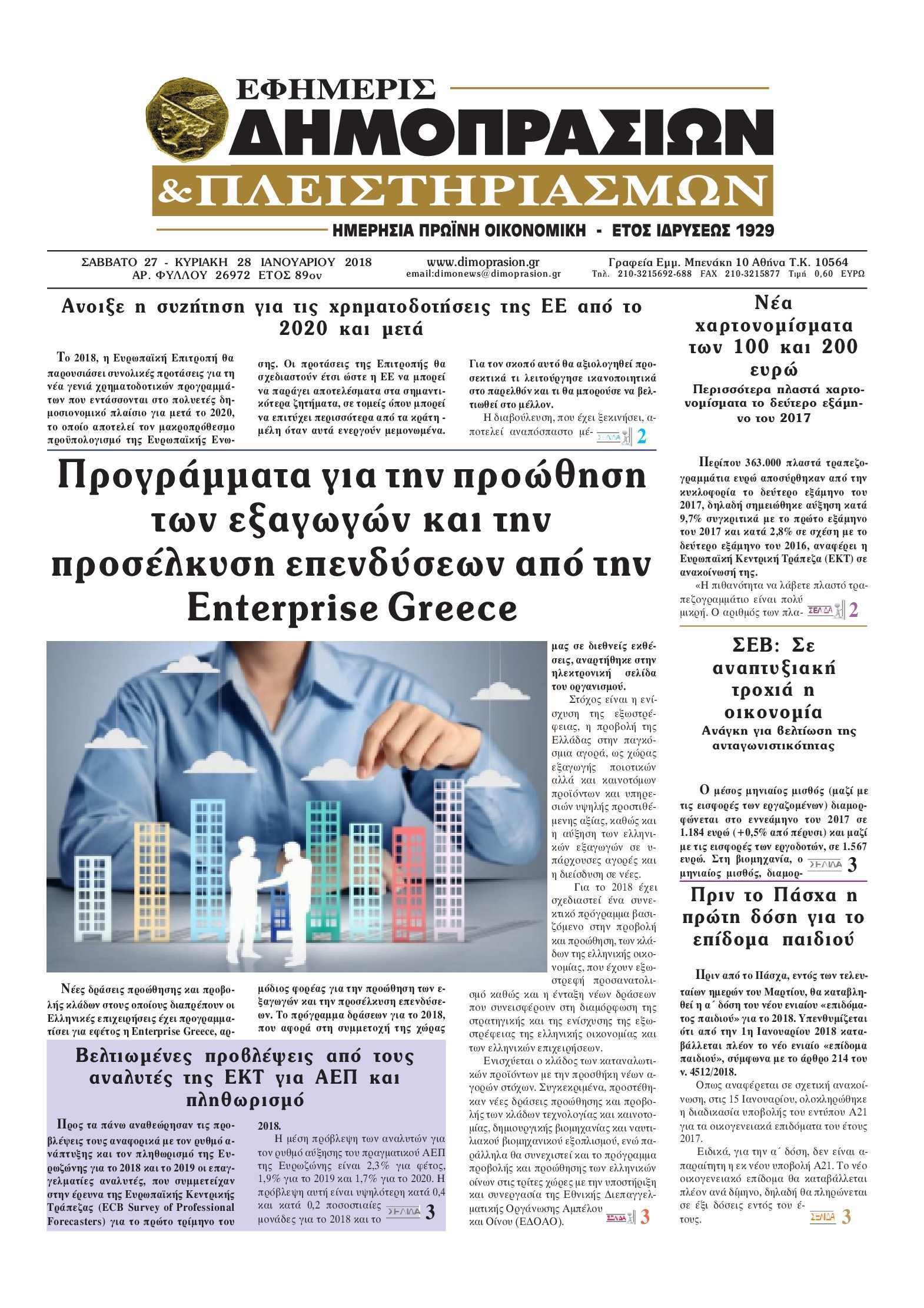 Οι οικονομικές εφημερίδες 29/1/2018 Enikos Newsroom 07:26, Δευτέρα 29 Ιανουαρίου 2018 Media Διαβάστε τα σημερινά πρωτοσέλιδα των οικονομικών εφημερίδων: ΟΙΚΟΝΟΜΙΚΕΣ ΕΦΗΜΕΡΙΔΕΣ ΠΡΩΤΟΣΕΛΙΔΑ Μοιράσου το: σχολίασε κι εσύ (0 σχόλια) Ακολουθήστε το enikos.gr στο Google News και μάθετε πρώτοι όλες τις ειδήσεις Δείτε όλες τις τελευταίες ειδήσεις από την Ελλάδα και τον Κόσμο στο enikos.gr Ειδήσεις Ροή Ειδήσεων 2 ώρες πριν Αγρότες: «Όχι στον διάλογο, μας εμπαίζει η κυβέρνηση» – Αποφάσισαν κλιμάκωση των κινητοποιήσεων, τι θα γίνει τα Χριστούγεννα 2 ώρες πριν Την πρώτη Belharra παρέλαβε η χώρα μας, υψώθηκε η ελληνική σημαία στη φρεγάτα «Κίμων» – Δένδιας: «Το ισχυρότερο Πολεμικό Ναυτικό που είχε ποτέ ο ελληνισμός» 5 ώρες πριν Γιώργος Μαζωνάκης: «Δεν ζήτησα χρήματα, παρά μόνο ηθική δικαίωση» – Οι πρώτες δηλώσεις του 21χρονου μετά την κατάθεση της μήνυσης 1 ώρα πριν Μιχάλης Χουρδάκης: «Είμαι διαθέσιμος να συμβάλω στην προσωρινή κάλυψη του ιατρείου της Ψερίμου» – Η επιστολή στον Άδωνι Γεωργιάδη 2 ώρες πριν Εξώδικο Γεωργιάδη στην Κωνσταντοπούλου – «Με κατηγόρησε ότι έχω καταδικαστεί για παιδεραστία» 3 ώρες πριν Τα 5 ζώδια που θα ευνοηθούν στα οικονομικά τους το 2026 – «Τραβούν το χρήμα σαν μαγνήτες» 8 ώρες πριν Αν κάνετε συνεχώς αυτά τα 8 πράγματα με τα κατοικίδιά σας, σας λείπει η ανθρώπινη επαφή 4 ώρες πριν Αυτό που κρύβεται κάτω από τη Γροιλανδία θα μπορούσε να ανατρέψει όσα γνωρίζουμε για την άνοδο της στάθμης των θαλασσών 1 ημέρα πριν 20 χρόνια τα Χριστούγεννα ξεκινούν στα Public με μεγάλη ποικιλία σε δώρα! 26 δευτερόλεπτα πριν Γιώργος Μαζωνάκης: «Έχει υποστεί ένα σωρό εκβιαστικές πρακτικές – Του είπαν ότι θα του βάλουν τον συγκεκριμένο άνθρωπο να τον καταγγείλει» 6 λεπτά πριν Μητσοτάκης: Η φρεγάτα «Κίμων» είναι η καλύτερη απόδειξη ότι οι Ένοπλες Δυνάμεις μας περνούν πια σε μια νέα εποχή – ΒΙΝΤΕΟ 11 λεπτά πριν Πάμε Στοίχημα: Περισσότερα από 29 εκατομμύρια ευρώ σε κέρδη μοίρασε την προηγούμενη εβδομάδα 16 λεπτά πριν Το Ισλαμικό Κράτος αποκαλεί τις δολοφονίες στην Αυστραλία «πηγή υπερηφάνειας» – Δεν αναλαμβάνει την ευθύνη για την επίθεση 20 λεπτά πριν Εύβοια: Πτώμα άνδρα εντοπίστηκε σε πυλωτή ENIKOS NETWORK ΕΟΔΥ: Δωρεάν τεστ για HIV, Ηπατίτιδες, Σύφιλη, Χλαμύδια, Γονόρροια 100 χρόνια ΠΙΣ: Ένας αιώνας προσφοράς στην Ιατρική και την κοινωνία Αμετάβλητα για τέταρτη συνεχόμενη φορά τα επιτόκια της ΕΚΤ – Ποιες είναι οι προβλέψεις για τον πληθωρισμό και την οικονομία... Χριστούγεννα και Πρωτοχρονιά: Δείτε πόσα χρήματα θα πάρουν ως αμοιβή όσοι εργαστούν Χαρτογραφώντας το «σημείο χωρίς επιστροφή»: Για πρώτη φορά αποκαλύπτεται με λεπτομέρεια το ακανθώδες όριο της ατμόσφαιρας τ... Η Google καταργεί τη λειτουργία «dark web report» – Πώς θα μπορούν οι χρήστες να διαγράφουν τα δεδομένα τους περισσότερα 17:45 , Πέμπτη 18 Δεκεμβρίου 2025 ROUK ZOUK: Εορταστικό επεισόδιο με καλεσμένους τους πρωταγωνιστές του «Γιατί ρε πατέρα» Το Σάββατο 20 Δεκεμβρίου στις 21:00, η Ζέτα Μακρυπούλια υποδέχεται εκλεκτούς ηθοποιούς που όλο... 17:20 , Πέμπτη 18 Δεκεμβρίου 2025 Άγιος έρωτας: Η Χριστίνα εξομολογείται στον πατέρα Νικόλαο, απόψε στις 21:00 στον Alpha Η Νότα αποφασίζει να εκδικηθεί τον Πέτρο και τον Στέφανο, για χάρη του Λούη, όμως τα πράγματα ... 16:50 , Πέμπτη 18 Δεκεμβρίου 2025 Να μ’ αγαπάς: Ζωή και Φωτεινή συμφιλιώνονται ως μάνα με κόρη, απόψε στις 20:00 Η ταυτότητα του Άγγελου αποκαλύπτεται στο νέο επεισόδιο της σειράς “Να μ’ αγαπάς... 15:52 , Πέμπτη 18 Δεκεμβρίου 2025 Το Σ