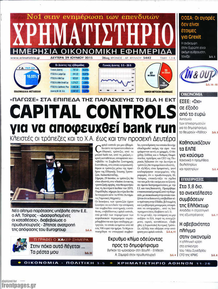 Οι οικονομικές εφημερίδες 29/6/2015 Enikos Newsroom 07:43, Δευτέρα 29 Ιουνίου 2015 Media Διαβάστε τα σημερινά πρωτοσέλιδα των οικονομικών εφημερίδων: ΟΙΚΟΝΟΜΙΚΕΣ ΕΦΗΜΕΡΙΔΕΣ ΠΡΩΤΟΣΕΛΙΔΑ Μοιράσου το: σχολίασε κι εσύ (0 σχόλια) Ακολουθήστε το enikos.gr στο Google News και μάθετε πρώτοι όλες τις ειδήσεις Δείτε όλες τις τελευταίες ειδήσεις από την Ελλάδα και τον Κόσμο στο enikos.gr Ειδήσεις Ροή Ειδήσεων 5 ώρες πριν Εκτός ευρωομάδας ΣΥΡΙΖΑ ο Νίκος Παππάς μετά την επίθεση στον δημοσιογράφο Νίκο Γιαννόπουλο – Η μήνυση και οι νέες δηλώσεις 5 ώρες πριν «Αγριεύουν» οι αγρότες: «Δεν συντρέχει λόγος συνάντησης με τον πρωθυπουργό» – Ώρα αποφάσεων στη σύσκεψη της Πέμπτης 5 ώρες πριν Κυψέλη: Χωρίς την οικογένειά της δίπλα της απολογήθηκε η 16χρονη – «Της είχε επιτεθεί κάποιος για να την βιάσει, φοβήθηκε και κυκλοφορούσε με μαχαίρι» 4 ώρες πριν Politico: Το πρόβλημα της Ευρώπης δεν είναι το Βέλγιο αλλά ο Ντόναλντ Τραμπ 6 ώρες πριν Αλεξανδρούπολη: Πολυοργανική ανεπάρκεια λόγω υποσιτισμού η αιτία θανάτου του 3χρονου αγοριού 5 ώρες πριν Μυστήριο με τεράστιες κυκλικές πέτρες 200 κιλών – Ανακαλύφθηκαν τυχαία κατά τη διάρκεια οδικών έργων και κανείς δεν ξέρει από πού προέρχονται 6 ώρες πριν Ύπνος: Ειδικός εξηγεί τον πραγματικό λόγο που ξυπνάτε στις 4 τα ξημερώματα – Ο ρόλος των ορμονών και του κιρκάδιου ρυθμού 7 ώρες πριν Αριθμολογία: Οι άνθρωποι που έχουν γεννηθεί αυτές τις 4 ημερομηνίες, είναι τρυφεροί και αγαπούν ανιδιοτελώς 18 ώρες πριν 20 χρόνια τα Χριστούγεννα ξεκινούν στα Public με μεγάλη ποικιλία σε δώρα! 15 λεπτά πριν Αμερικανικά στρατεύματα στον Ισημερινό για «προσωρινή» επιχείρηση κατά των ναρκωτικών 31 λεπτά πριν Βραζιλία: Το Κογκρέσο ενέκρινε σχέδιο νόμου για τη μείωση της ποινής του πρώην προέδρου Μπολσονάρου 45 λεπτά πριν Ένταση στο περιφερειακό συμβούλιο Δυτικής Μακεδονίας: Φωνές, σπρωξιές και διακοπή – Δείτε βίντεο 60 λεπτά πριν Σουδάν: Επιδρομή drone σε χωριό του Νότιου Κορντοφάν – Οκτώ νεκροί 1 ώρα πριν Αλ Τσαντίρι Νιουζ: Η κόρη της Πάολα στο κοινό – Η ατάκα Λαζόπουλου που την έκανε να «κοκκινήσει» ENIKOS NETWORK Αϋπνία: Το κόλπο που θα σας βοηθήσει να κοιμηθείτε απόψε – Είναι απλό και έχει αποτέλεσμα 2,6 εκατομμύρια πολίτες έχουν ήδη εμβολιαστεί κατά της γρίπης ΕΛΣΤΑΤ: Τι δείχνουν τα νέα στοιχεία για τις ηλεκτρονικές παραγγελίες των επιχειρήσεων ΚΕΠΕ: Οι 3 διακριτές συμβολές των ΜμΕ και της μεταποίησης στην ελληνική οικονομία Χαρτογραφώντας το «σημείο χωρίς επιστροφή»: Για πρώτη φορά αποκαλύπτεται με λεπτομέρεια το ακανθώδες όριο της ατμόσφαιρας τ... Η Google καταργεί τη λειτουργία «dark web report» – Πώς θα μπορούν οι χρήστες να διαγράφουν τα δεδομένα τους περισσότερα 02:30 , Πέμπτη 18 Δεκεμβρίου 2025 Αλ Τσαντίρι Νιουζ: Η κόρη της Πάολα στο κοινό – Η ατάκα Λαζόπουλου που την έκανε να «κοκκινήσει» Γιορτινή διάθεση και ευχάριστες στιγμές γέμισε η αποψινή, τελευταία για το 2025, εκπομπή του «... 22:24 , Τετάρτη 17 Δεκεμβρίου 2025 Το Σπίτι Δίπλα Στο Ποτάμι: Σε κίνδυνο η υγεία του Απόστολου – Τι θα δούμε απόψε “Το Σπίτι Δίπλα στο Ποτάμι” ξετυλίγει το νήμα της ζωής των πέντε αδελφών με καταισ... 21:14 , Τετάρτη 17 Δεκεμβρίου 2025 Παιχνίδια Εκδίκησης: Θα καταφέρει ο Χρήστος να κλονίσει την εμπιστοσύνη της Μάγιας απέναντι στον Άγη; Τα «Παιχνίδια Εκδίκησης» έρχονται απόψε στις 22:30, στον Αντ1, με το τελευταίο επεισόδιο της χ... 20:57 , Τετάρτη 17 Δεκεμβρίου 2025 Άγιος Έρωτας: Η Χλόη καταθέτει εναντίον του πατέρα της και ο Χάρης αποκαλύπτε