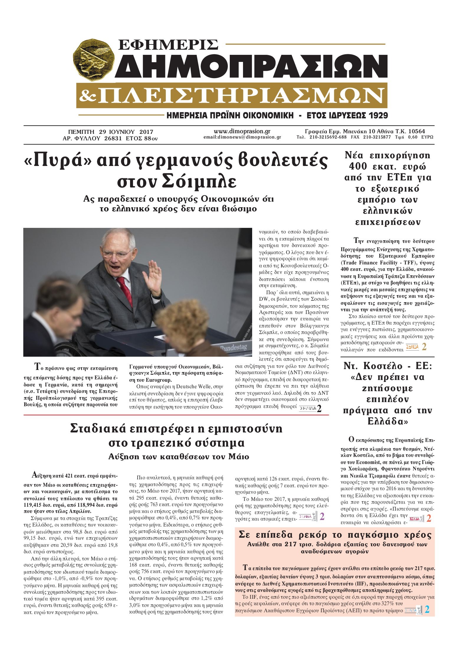 Οι οικονομικές εφημερίδες 29/6/2017 Enikos Newsroom 06:53, Πέμπτη 29 Ιουνίου 2017 Media Διαβάστε τα σημερινά πρωτοσέλιδα των οικονομικών εφημερίδων: ΟΙΚΟΝΟΜΙΚΕΣ ΕΦΗΜΕΡΙΔΕΣ ΠΡΩΤΟΣΕΛΙΔΑ Μοιράσου το: σχολίασε κι εσύ (0 σχόλια) Ακολουθήστε το enikos.gr στο Google News και μάθετε πρώτοι όλες τις ειδήσεις Δείτε όλες τις τελευταίες ειδήσεις από την Ελλάδα και τον Κόσμο στο enikos.gr Ειδήσεις Ροή Ειδήσεων 3 λεπτά πριν Φοροδιαφυγή: Ποιοι φορολογούμενοι κινδυνεύουν να πληρώσουν «τσουχτερά» πρόστιμα 8 ώρες πριν Εκτός ευρωομάδας ΣΥΡΙΖΑ ο Νίκος Παππάς μετά την επίθεση στον δημοσιογράφο Νίκο Γιαννόπουλο – Η μήνυση και οι νέες δηλώσεις 9 ώρες πριν «Αγριεύουν» οι αγρότες: «Δεν συντρέχει λόγος συνάντησης με τον πρωθυπουργό» – Ώρα αποφάσεων στη σύσκεψη της Πέμπτης 9 ώρες πριν Κυψέλη: Χωρίς την οικογένειά της δίπλα της απολογήθηκε η 16χρονη – «Της είχε επιτεθεί κάποιος για να την βιάσει, φοβήθηκε και κυκλοφορούσε με μαχαίρι» 8 ώρες πριν Politico: Το πρόβλημα της Ευρώπης δεν είναι το Βέλγιο αλλά ο Ντόναλντ Τραμπ 1 ώρα πριν Καούρα: Το μπαχαρικό που είναι «εξίσου αποτελεσματικό» με την ομεπραζόλη, σύμφωνα με ειδικούς 2 ώρες πριν Τα ζώδια σήμερα, Πέμπτη 18 Δεκεμβρίου: Λέοντες, η καρδιά σας θέλει να εκφραστεί 8 ώρες πριν Μυστήριο με τεράστιες κυκλικές πέτρες 200 κιλών – Ανακαλύφθηκαν τυχαία κατά τη διάρκεια οδικών έργων και κανείς δεν ξέρει από πού προέρχονται 22 ώρες πριν 20 χρόνια τα Χριστούγεννα ξεκινούν στα Public με μεγάλη ποικιλία σε δώρα! 17 δευτερόλεπτα πριν Καιρός: Ηλιοφάνεια σήμερα με παροδικές νεφώσεις – Αναλυτική πρόγνωση ανά περιοχή 3 λεπτά πριν Φοροδιαφυγή: Ποιοι φορολογούμενοι κινδυνεύουν να πληρώσουν «τσουχτερά» πρόστιμα 15 λεπτά πριν Εορτολόγιο: Ποιοι γιορτάζουν σήμερα 18 Δεκεμβρίου 26 λεπτά πριν Επιχειρήσεις: Έρχονται νέα μέτρα φορολογικών ελαφρύνσεων – Τα σχέδια για την προκαταβολή φόρου και το τέλος επιτηδεύματος 34 λεπτά πριν ΗΠΑ: Οριστική άρση κυρώσεων κατά της Συρίας – Ανοίγει ο δρόμος για επενδύσεις ENIKOS NETWORK Μπορείτε να εντοπίσετε το ποντικάκι που κρύβεται πίσω από όλα τα μανιτάρια; Μόνο όσοι έχουν τα μάτια γερακιού μπορούν να λύ... Το «λουλούδι σκαντζόχοιρος» που μπορεί να ενισχύσει το ανοσοποιητικό, να μειώσει τη φλεγμονή και να ρυθμίσει το σάκχαρο Φοροδιαφυγή: Ποιοι φορολογούμενοι κινδυνεύουν να πληρώσουν «τσουχτερά» πρόστιμα ΕΛΣΤΑΤ: Τι δείχνουν τα νέα στοιχεία για τις ηλεκτρονικές παραγγελίες των επιχειρήσεων Χαρτογραφώντας το «σημείο χωρίς επιστροφή»: Για πρώτη φορά αποκαλύπτεται με λεπτομέρεια το ακανθώδες όριο της ατμόσφαιρας τ... Η Google καταργεί τη λειτουργία «dark web report» – Πώς θα μπορούν οι χρήστες να διαγράφουν τα δεδομένα τους περισσότερα 05:48 , Πέμπτη 18 Δεκεμβρίου 2025 Οι οικονομικές εφημερίδες 18/12/2025 Διαβάστε τα πρωτοσέλιδα από τις οικονομικές εφημερίδες, σήμερα 18/12/2025. 05:43 , Πέμπτη 18 Δεκεμβρίου 2025 Οι αθλητικές εφημερίδες 18/12/2025 Διαβάστε τα πρωτοσέλιδα από τις αθλητικές εφημερίδες, σήμερα 18/12/2025. 05:38 , Πέμπτη 18 Δεκεμβρίου 2025 Οι πολιτικές εφημερίδες 18/12/2025 Διαβάστε τα πρωτοσέλιδα από τις πολιτικές εφημερίδες, σήμερα 18/12/2025. 05:22 , Πέμπτη 18 Δεκεμβρίου 2025 Το Ποντίκι σήμερα Πέμπτη 18/12/2025 Διαβάστε το πρωτοσέλιδο της εφημερίδας «Το Ποντίκι» σήμερα 18/12/2025. ΤΕΛΕΥΤΑΙΕΣ ΕΙΔΗΣΕΙΣ 17 δευτερόλεπτα πριν Καιρός: Ηλιοφάνεια σήμερα με παροδικές νεφώσεις –... 3 λεπτά πριν Φοροδιαφυγή: Ποιοι φορολογούμενοι κινδυνεύουν να... 15 λεπτά πριν Εορτολόγιο: Ποιοι γιορτάζουν σήμερα 18 Δεκεμβρίου 26 λεπτ