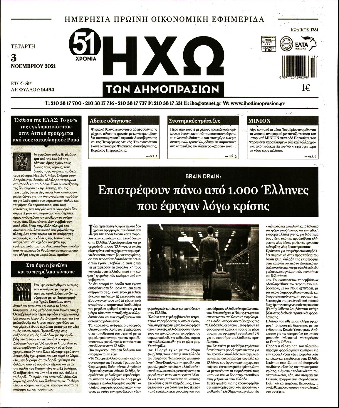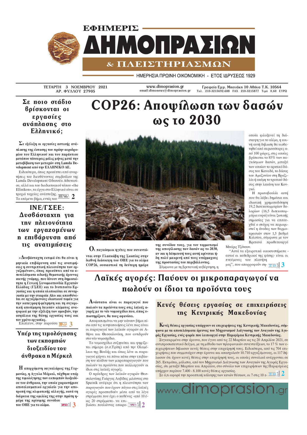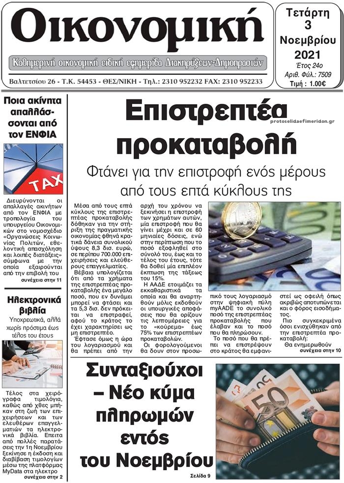 Οι οικονομικές εφημερίδες 3/11/2021 Διονύσης Νίκκας 06:53, Τετάρτη 03 Νοεμβρίου 2021 Media Διαβάστε τα πρωτοσέλιδα από τις οικονομικές εφημερίδες… ΟΙΚΟΝΟΜΙΚΕΣ ΕΦΗΜΕΡΙΔΕΣ Μοιράσου το: σχολίασε κι εσύ (0 σχόλια) Ακολουθήστε το enikos.gr στο Google News και μάθετε πρώτοι όλες τις ειδήσεις Δείτε όλες τις τελευταίες ειδήσεις από την Ελλάδα και τον Κόσμο στο enikos.gr Ειδήσεις Ροή Ειδήσεων 3 ώρες πριν Αγρότες: «Όχι στον διάλογο, μας εμπαίζει η κυβέρνηση» – Αποφάσισαν κλιμάκωση των κινητοποιήσεων, τι θα γίνει τα Χριστούγεννα 3 ώρες πριν Την πρώτη Belharra παρέλαβε η χώρα μας, υψώθηκε η ελληνική σημαία στη φρεγάτα «Κίμων» – Δένδιας: «Το ισχυρότερο Πολεμικό Ναυτικό που είχε ποτέ ο ελληνισμός» 59 λεπτά πριν Γιώργος Μαζωνάκης: «Έχει υποστεί ένα σωρό εκβιαστικές πρακτικές – Του είπαν ότι θα του βάλουν τον συγκεκριμένο άνθρωπο να τον καταγγείλει» 2 ώρες πριν Μιχάλης Χουρδάκης: «Είμαι διαθέσιμος να συμβάλω στην προσωρινή κάλυψη του ιατρείου της Ψερίμου» – Η επιστολή στον Άδωνι Γεωργιάδη 3 ώρες πριν Εξώδικο Γεωργιάδη στην Κωνσταντοπούλου – «Με κατηγόρησε ότι έχω καταδικαστεί για παιδεραστία» 28 λεπτά πριν Γάμος: 11 ψυχρές αλλά ευγενικές φράσεις, που λέει ένας άνδρας όταν σκέφτεται τον χωρισμό 3 ώρες πριν Τα 5 ζώδια που θα ευνοηθούν στα οικονομικά τους το 2026 – «Τραβούν το χρήμα σαν μαγνήτες» 4 ώρες πριν Αυτό που κρύβεται κάτω από τη Γροιλανδία θα μπορούσε να ανατρέψει όσα γνωρίζουμε για την άνοδο της στάθμης των θαλασσών 1 ημέρα πριν 20 χρόνια τα Χριστούγεννα ξεκινούν στα Public με μεγάλη ποικιλία σε δώρα! 3 λεπτά πριν Live η κίνηση: Στο «κόκκινο» Κηφισός, Κηφισίας και οι δρόμοι στο κέντρο – Καθυστερήσεις και στην Αττική Οδό 8 λεπτά πριν Εξεταστική για ΟΠΕΚΕΠΕ: Νέο επεισόδιο Κωνσταντοπούλου με Λαζαρίδη και Συρεγγέλα – ΒΙΝΤΕΟ 14 λεπτά πριν Συνάντηση Γεραπετρίτη με την Βρετανή ομόλογό του – Έθεσε και το θέμα των Γλυπτών του Παρθενώνα 19 λεπτά πριν ΗΠΑ: Συντριβή ιδιωτικού αεροσκάφους στη Βόρεια Καρολίνα – «Υπάρχουν νεκροί» 23 λεπτά πριν Ρία Ελληνίδου: Πώς απέφυγε να απαντήσει για την προσωπική της ζωή – «Δεν έχουμε να πούμε κάτι» ENIKOS NETWORK Ξεκίνησε η «επέλαση» της γρίπης στην Ελλάδα-Ποιοι κινδυνεύουν ΕΟΔΥ: Δωρεάν τεστ για HIV, Ηπατίτιδες, Σύφιλη, Χλαμύδια, Γονόρροια Ευλογιά αιγοπροβάτων: Νέες αποζημιώσεις ύψους 26,02 εκατ. ευρώ σε κτηνοτρόφους – Η κατανομή ανά Περιφέρεια Προσλήψεις σε Δήμο: Ποιοι μπορούν να κάνουν αίτηση έως αύριο – Οι ειδικότητες Χαρτογραφώντας το «σημείο χωρίς επιστροφή»: Για πρώτη φορά αποκαλύπτεται με λεπτομέρεια το ακανθώδες όριο της ατμόσφαιρας τ... Η Google καταργεί τη λειτουργία «dark web report» – Πώς θα μπορούν οι χρήστες να διαγράφουν τα δεδομένα τους περισσότερα 17:45 , Πέμπτη 18 Δεκεμβρίου 2025 ROUK ZOUK: Εορταστικό επεισόδιο με καλεσμένους τους πρωταγωνιστές του «Γιατί ρε πατέρα» Το Σάββατο 20 Δεκεμβρίου στις 21:00, η Ζέτα Μακρυπούλια υποδέχεται εκλεκτούς ηθοποιούς που όλο... 17:20 , Πέμπτη 18 Δεκεμβρίου 2025 Άγιος έρωτας: Η Χριστίνα εξομολογείται στον πατέρα Νικόλαο, απόψε στις 21:00 στον Alpha Η Νότα αποφασίζει να εκδικηθεί τον Πέτρο και τον Στέφανο, για χάρη του Λούη, όμως τα πράγματα ... 16:50 , Πέμπτη 18 Δεκεμβρίου 2025 Να μ’ αγαπάς: Ζωή και Φωτεινή συμφιλιώνονται ως μάνα με κόρη, απόψε στις 20:00 Η ταυτότητα του Άγγελου αποκαλύπτεται στο νέο επεισόδιο της σειράς “Να μ’ αγαπάς... 15:52 , Πέμπτη 18 Δεκεμβρίου 2025 Το Σπίτι Δίπλα Στο Ποτάμι: Το καθηλωτικό τελευταίο επεισόδιο για το 2025 απόψε στις 22:30 Καθηλώνει τ