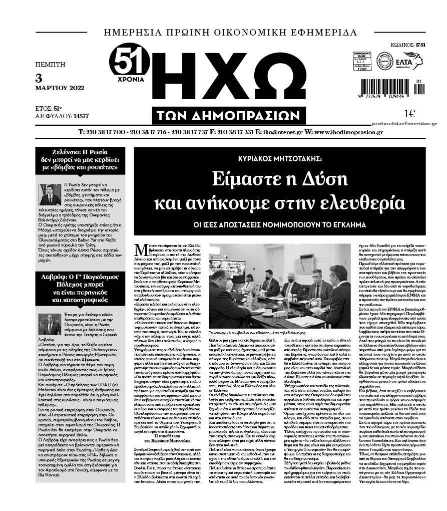 Οι οικονομικές εφημερίδες 3/3/2022 Διονύσης Νίκκας 06:54, Πέμπτη 03 Μαρτίου 2022 Media Διαβάστε τα πρωτοσέλιδα από τις οικονομικές εφημερίδες… ΟΙΚΟΝΟΜΙΚΕΣ ΕΦΗΜΕΡΙΔΕΣ Μοιράσου το: Ουκρανία: Αξιωματούχοι επιβεβαιώνουν ότι ο στρατός της Ρωσίας πήρε τη Χερσώνα – BINTEO New York Times: “Η Κίνα ήξερε για την εισβολή και τον πόλεμο στην Ουκρανία” Μπάιντεν: “Παγκόσμια ενότητα άνευ προηγουμένου” στην απόφαση της ΓΣ του ΟΗΕ σχολίασε κι εσύ (0 σχόλια) Ακολουθήστε το enikos.gr στο Google News και μάθετε πρώτοι όλες τις ειδήσεις Δείτε όλες τις τελευταίες ειδήσεις από την Ελλάδα και τον Κόσμο στο enikos.gr Ειδήσεις Ροή Ειδήσεων 2 ώρες πριν LIVE από Λοριάν: Η ύψωση της ελληνικής σημαίας στην πρώτη φρεγάτα FDI Belharra ΚΙΜΩΝ 2 ώρες πριν Στην Ευελπίδων ο 22χρονος που καταγγέλλει τον Γιώργο Μαζωνάκη για ασελγείς πράξεις – «Έχουμε εμπιστοσύνη στη Δικαιοσύνη, καμία εκβίαση» λέει ο δικηγόρος του 1 ώρα πριν Γαλλία: Η οργή των αγροτών – Αναμένεται η ομιλία του Μακρόν, τα τρακτέρ συγκεντρώνονται μαζικά στις Βρυξέλλες 4 ώρες πριν Συναγερμός και στην Ελλάδα για τη «σούπερ γρίπη»: Πόσο σοβαρή είναι και ποιοι θεωρούνται πιο ευάλωτοι – 3 ειδικοί μιλούν στο enikos.gr 1 ώρα πριν Χριστουγεννιάτικο τραπέζι: Πόσο θα κοστίσει φέτος – Σε ποια είδη τραβούν… την ανηφόρα οι τιμές 5 ώρες πριν Τα 4 ζώδια που λαμβάνουν ένα ισχυρό σημάδι από το σύμπαν – «Αποκαλύπτεται κάτι που μπορεί να αλλάξει τη ζωή μας» 6 ώρες πριν Η σύζυγός του παραπονιέται για τα χρήματα που της δίνει για ψώνια κάθε μήνα – «Λέει ότι νιώθει φτωχή και της είπα να βρει δουλειά» 4 ώρες πριν Αν κάνετε συνεχώς αυτά τα 8 πράγματα με τα κατοικίδιά σας, σας λείπει η ανθρώπινη επαφή 1 ημέρα πριν 20 χρόνια τα Χριστούγεννα ξεκινούν στα Public με μεγάλη ποικιλία σε δώρα! 30 δευτερόλεπτα πριν Δίκη Βαλυράκη: Καταθέτει ο βασικός αυτόπτης μάρτυρας – «Δέχτηκα πιέσεις να μη μιλήσω, πήγα να ψωνίσω και αυτοκίνητο με χτύπησε στο πόδι» 6 λεπτά πριν Αυτό που κρύβεται κάτω από τη Γροιλανδία θα μπορούσε να ανατρέψει όσα γνωρίζουμε για την άνοδο της στάθμης των θαλασσών 11 λεπτά πριν Parthenis x Papazó & Akylas powered by ΣΚΡΑΤΣ: Το πιο καλαίσθητο act του MadWalk 2025 16 λεπτά πριν Πηγές ΣΥΡΙΖΑ: Η ΝΔ απαξιώνει την Εξεταστική και επιμένει στη συγκάλυψη – Ο επικαιροποιημένος κατάλογος προτεινόμενων μαρτύρων 21 λεπτά πριν Debate Οικονόμου – Σπυρόπουλου στον Realfm 97,8 για τον ΟΠΕΚΕΠΕ, τις αγροτικές κινητοποιήσεις και τον πρωτογενή τομέα ENIKOS NETWORK 100 χρόνια ΠΙΣ: Ένας αιώνας προσφοράς στην Ιατρική και την κοινωνία Ένα ποτήρι την ημέρα από αυτόν τον χυμό μειώνει τη χοληστερίνη, τη φλεγμονή και την πίεση ΑΑΔΕ: Έρχεται το… ΔΕΟΣ – Όλες οι λεπτομέρειες για τον ενιαίο ελεγκτικό μηχανισμό για το οικονομικό έγκλημα e-ΕΦΚΑ: Μέχρι πότε πρέπει να γίνει επιλογή ασφαλιστικής κατηγορίας για το 2026 – Τι πρέπει να γνωρίζετε Χαρτογραφώντας το «σημείο χωρίς επιστροφή»: Για πρώτη φορά αποκαλύπτεται με λεπτομέρεια το ακανθώδες όριο της ατμόσφαιρας τ... Η Google καταργεί τη λειτουργία «dark web report» – Πώς θα μπορούν οι χρήστες να διαγράφουν τα δεδομένα τους περισσότερα 08:00 , Πέμπτη 18 Δεκεμβρίου 2025 Την Κυριακή με τη Realnews: Δωροεπιταγή 10€ Δωροεπιταγή αξίας 10€ για αγορές άνω των 60€ από τα πολυκαταστήματα FactoryOutlet H προσφορά ι... 07:50 , Πέμπτη 18 Δεκεμβρίου 2025 «Το σόι σου»: Backstage στα γυρίσματα για το εορταστικό επεισόδιο «Το σόι σου» φορά τα γιορτινά του για τα Χριστούγεννα και η Όλγα Λαφαζάνη, με την κάμερα του «... 07:36 , Πέμπτη 18 Δεκεμβρίου 2025 Οι αθλητικές μεταδό