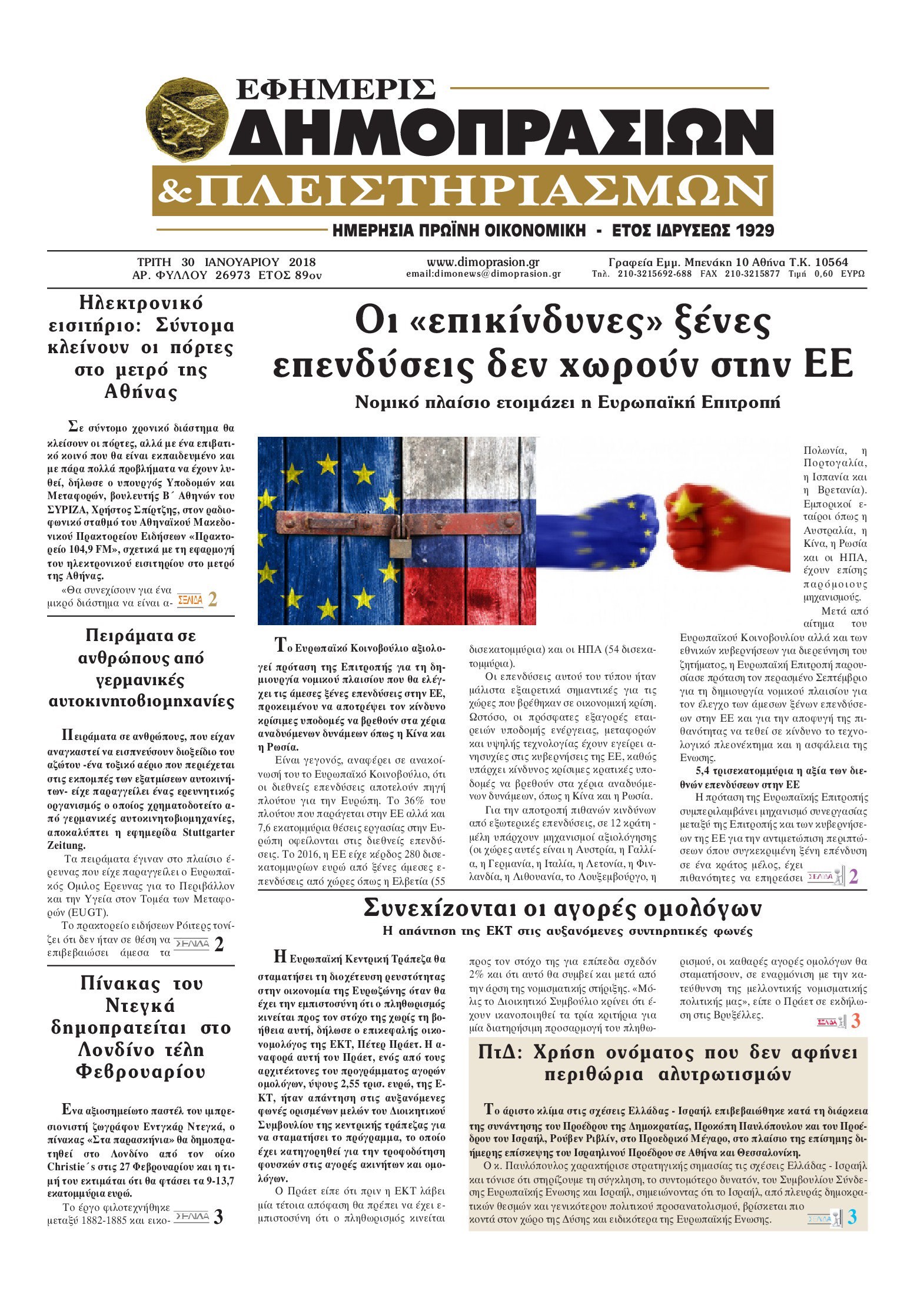 Οι οικονομικές εφημερίδες 30/1/2018 Enikos Newsroom 07:10, Τρίτη 30 Ιανουαρίου 2018 Media Διαβάστε τα σημερινά πρωτοσέλιδα των οικονομικών εφημερίδων: ΟΙΚΟΝΟΜΙΚΕΣ ΕΦΗΜΕΡΙΔΕΣ ΠΡΩΤΟΣΕΛΙΔΑ Μοιράσου το: σχολίασε κι εσύ (0 σχόλια) Ακολουθήστε το enikos.gr στο Google News και μάθετε πρώτοι όλες τις ειδήσεις Δείτε όλες τις τελευταίες ειδήσεις από την Ελλάδα και τον Κόσμο στο enikos.gr Ειδήσεις Ροή Ειδήσεων 3 λεπτά πριν Ευρωπαϊκή Ένωση: Συμφωνία για δάνειο 90 δισ. ευρώ στην Ουκρανία τη διετία 2026-2027 5 ώρες πριν ΟΠΕΚΕΠΕ: Προφυλακιστέος ο φερόμενος αρχηγός και ο λογιστής της εγκληματικής οργάνωσης 6 ώρες πριν Αυξάνουν την πίεση προς την κυβέρνηση οι αγρότες: Κλείνουν παρακαμπτήριους και ανοίγουν διόδια – Τι θα γίνει τις γιορτές 6 ώρες πριν Φοινικούντα: Το Σάββατο απολογείται ο 30χρονος γιος γνωστού επιχειρηματία της Πλάκας που παραδόθηκε – Όσα είπε στους αστυνομικούς και ο ρόλος του στο έγκλημα 4 ώρες πριν ΑΕΚ – Κραϊόβα 3-2: Επική ανατροπή και πρόκριση στους «16» του Conference League η Ένωση 5 ώρες πριν Αρχαιολόγοι ανακάλυψαν ρωμαϊκά τεχνουργήματα από μια πόλη που δεν υπήρξε ποτέ – Τα τρία εντυπωσιακά κτίρια και ο αμφορέας με τις… σαρδέλες 6 ώρες πριν Ύπνος: Η απλή βραδινή ρουτίνα για να προστατεύσετε τα μαλλιά σας από το κρύο κατά τη διάρκεια του χειμώνα 7 ώρες πριν Manifesting: Πώς να συναντήσετε τον σύντροφο της ζωής σας, ανάλογα με τον μήνα γέννησής σας 2 ημέρες πριν 20 χρόνια τα Χριστούγεννα ξεκινούν στα Public με μεγάλη ποικιλία σε δώρα! 3 λεπτά πριν Ευρωπαϊκή Ένωση: Συμφωνία για δάνειο 90 δισ. ευρώ στην Ουκρανία τη διετία 2026-2027 26 λεπτά πριν Αιματηρή βομβιστική επίθεση στην Υεμένη: Τουλάχιστον τρεις νεκροί και 13 τραυματίες 30 λεπτά πριν Στη Φλόριντα σήμερα οι διαβουλεύσεις σχετικά με τα επόμενα στάδια για τη Λωρίδα της Γάζας 34 λεπτά πριν Σίσσυ Τουμάση: «Είμαι ασθενοφοβική πάρα πολύ και με πιάνει μια παράνοια μ’ αυτό» 58 λεπτά πριν Ντόναλντ Τραμπ: Δεν χρειάζομαι την έγκριση του Κογκρέσου για να διατάξω στρατιωτικά πλήγματα στη Βενεζουέλα ENIKOS NETWORK Σε περίοδο αυξημένης δραστηριότητας η γρίπη στην Ελλάδα-Μέτρα προστασίας από τον ΕΟΔΥ Σκέφτεστε συνέχεια συζητήσεις που έχετε κάνει; Τι σημαίνει αυτό, σύμφωνα με ειδικό Στεγαστικό: Τι λέει η ΠΟΜΙΔΑ για τα νέα μέτρα που ανακοίνωσε ο Κυριάκος Μητσοτάκης Λαγκάρντ: Αισιόδοξη για την ανάπτυξη της Ευρωζώνης, αβέβαιη για τον πληθωρισμό Χαρτογραφώντας το «σημείο χωρίς επιστροφή»: Για πρώτη φορά αποκαλύπτεται με λεπτομέρεια το ακανθώδες όριο της ατμόσφαιρας τ... Η Google καταργεί τη λειτουργία «dark web report» – Πώς θα μπορούν οι χρήστες να διαγράφουν τα δεδομένα τους περισσότερα 02:50 , Παρασκευή 19 Δεκεμβρίου 2025 GNTM: «Κλείδωσαν» οι τέσσερις φιναλίστ – Μεγάλη ανατροπή στις τελευταίες αποχωρήσεις Για προτελευταία φορά εμφανίστηκαν στο πλατό του GNTM οι φιναλίστ του φετινού κύκλου, το βράδυ... 17:45 , Πέμπτη 18 Δεκεμβρίου 2025 ROUK ZOUK: Εορταστικό επεισόδιο με καλεσμένους τους πρωταγωνιστές του «Γιατί ρε πατέρα» Το Σάββατο 20 Δεκεμβρίου στις 21:00, η Ζέτα Μακρυπούλια υποδέχεται εκλεκτούς ηθοποιούς που όλο... 17:20 , Πέμπτη 18 Δεκεμβρίου 2025 Άγιος έρωτας: Η Χριστίνα εξομολογείται στον πατέρα Νικόλαο, απόψε στις 21:00 στον Alpha Η Νότα αποφασίζει να εκδικηθεί τον Πέτρο και τον Στέφανο, για χάρη του Λούη, όμως τα πράγματα ... 16:50 , Πέμπτη 18 Δεκεμβρίου 2025 Να μ’ αγαπάς: Ζωή και Φωτεινή συμφιλιώνονται ως μάνα με κόρη, απόψε στις 20:00 Η ταυτότητα του Άγγελου αποκαλύπτεται στο νέο επεισόδιο της σειράς “Να μ’ αγα