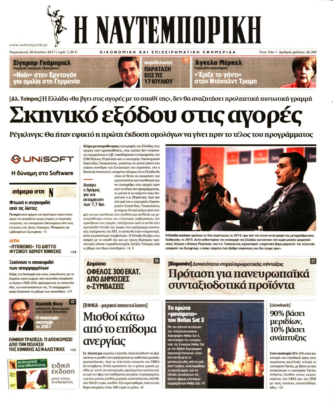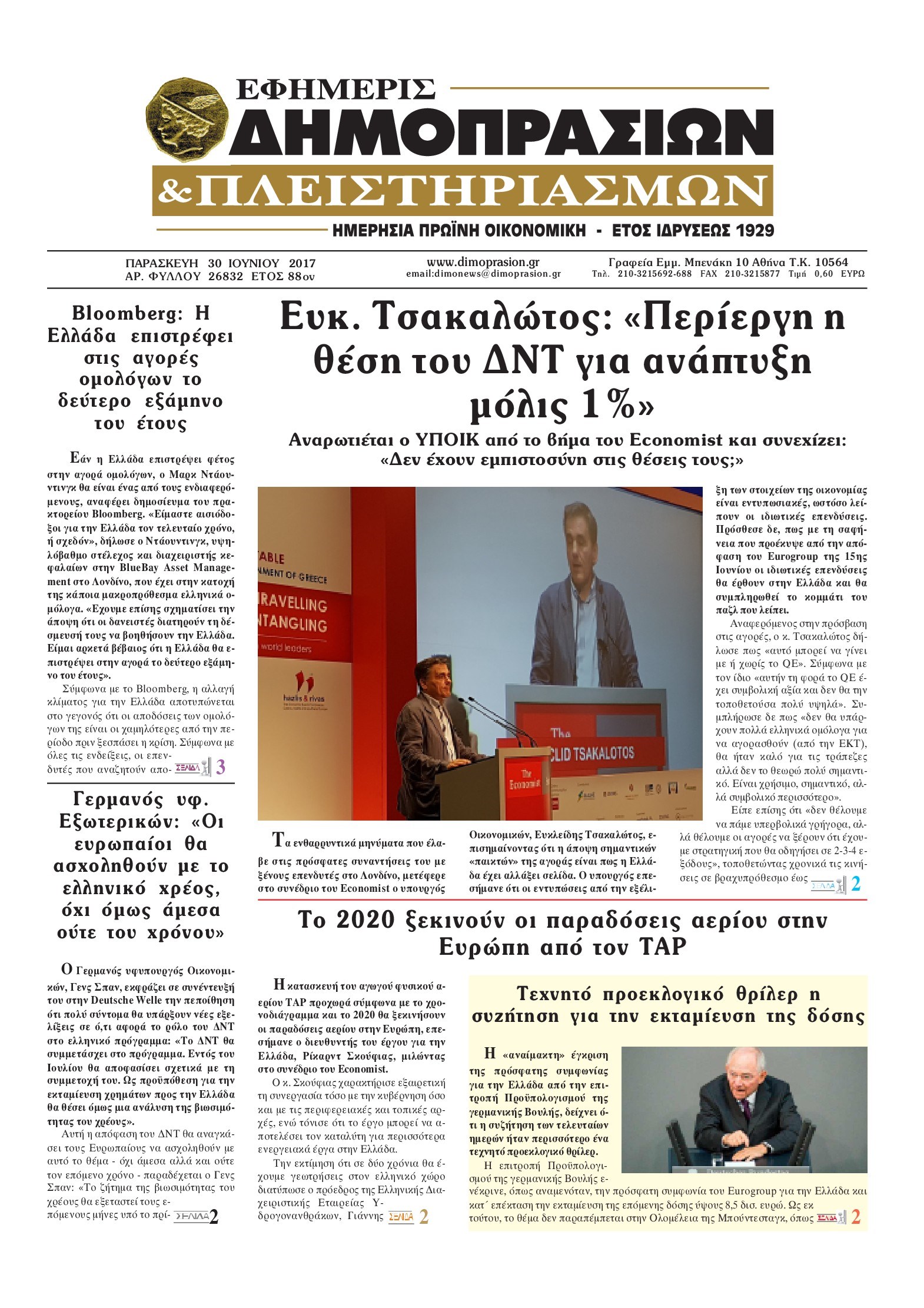 Οι οικονομικές εφημερίδες 30/6/2017 Enikos Newsroom 06:47, Παρασκευή 30 Ιουνίου 2017 Media Διαβάστε τα σημερινά πρωτοσέλιδα των οικονομικών εφημερίδων: ΟΙΚΟΝΟΜΙΚΕΣ ΕΦΗΜΕΡΙΔΕΣ ΠΡΩΤΟΣΕΛΙΔΑ Μοιράσου το: σχολίασε κι εσύ (0 σχόλια) Ακολουθήστε το enikos.gr στο Google News και μάθετε πρώτοι όλες τις ειδήσεις Δείτε όλες τις τελευταίες ειδήσεις από την Ελλάδα και τον Κόσμο στο enikos.gr Ειδήσεις Ροή Ειδήσεων 27 λεπτά πριν Την πρώτη Belharra παρέλαβε η χώρα μας, υψώθηκε η ελληνική σημαία στη φρεγάτα «Κίμων» – Δένδιας: «Το ισχυρότερο Πολεμικό Ναυτικό που είχε ποτέ ο ελληνισμός» 3 ώρες πριν Γιώργος Μαζωνάκης: «Δεν ζήτησα χρήματα, παρά μόνο ηθική δικαίωση» – Οι πρώτες δηλώσεις του 21χρονου μετά την κατάθεση της μήνυσης 2 ώρες πριν Δίκη Βαλυράκη: Καταθέτει ο βασικός αυτόπτης μάρτυρας – «Δέχτηκα πιέσεις να μη μιλήσω, πήγα να ψωνίσω και αυτοκίνητο με χτύπησε στο πόδι» 2 ώρες πριν Ώρα αποφάσεων για τους αγρότες – Ξεκίνησε η πανελλαδική σύσκεψη μπλόκων στις Σέρρες – ΦΩΤΟ 6 ώρες πριν Συναγερμός και στην Ελλάδα για τη «σούπερ γρίπη»: Πόσο σοβαρή είναι και ποιοι θεωρούνται πιο ευάλωτοι – 3 ειδικοί μιλούν στο enikos.gr 52 λεπτά πριν Τα 5 ζώδια που θα ευνοηθούν στα οικονομικά τους το 2026 – «Τραβούν το χρήμα σαν μαγνήτες» 6 ώρες πριν Αν κάνετε συνεχώς αυτά τα 8 πράγματα με τα κατοικίδιά σας, σας λείπει η ανθρώπινη επαφή 2 ώρες πριν Αυτό που κρύβεται κάτω από τη Γροιλανδία θα μπορούσε να ανατρέψει όσα γνωρίζουμε για την άνοδο της στάθμης των θαλασσών 1 ημέρα πριν 20 χρόνια τα Χριστούγεννα ξεκινούν στα Public με μεγάλη ποικιλία σε δώρα! 2 λεπτά πριν Να μ’ αγαπάς: Ζωή και Φωτεινή συμφιλιώνονται ως μάνα με κόρη, απόψε στις 20:00 7 λεπτά πριν Εξώδικο Γεωργιάδη στην Κωνσταντοπούλου – «Με κατηγόρησε ότι έχω καταδικαστεί για παιδεραστία» 12 λεπτά πριν Εξεταστική για ΟΠΕΚΕΠΕ – Μπρατάκος: «Δεν μου τέθηκε ζήτημα για πιέσεις από τον κ. Αυγενάκη ή οποιονδήποτε» – Τι είπε για τον Σημανδράκο 13 λεπτά πριν ΤΕΧΑΝ: 1ο Πανελλήνιο Σχολικό Πρωτάθλημα Ανακύκλωσης Δευτεροβάθμιας Εκπαίδευσης 17 λεπτά πριν Τραυματίστηκε 5χρονο παιδί σε νηπιαγωγείο στο Αγρίνιο – Χτυπήθηκε από αντικείμενο που έπεσε από έπιπλο ENIKOS NETWORK 100 χρόνια ΠΙΣ: Ένας αιώνας προσφοράς στην Ιατρική και την κοινωνία Ένα ποτήρι την ημέρα από αυτόν τον χυμό μειώνει τη χοληστερίνη, τη φλεγμονή και την πίεση Κρατική επιχορήγηση έως 14.500 ευρώ: Ποιοι θα λάβουν από σήμερα την προκαταβολή στον τραπεζικό λογαριασμό τους Αυτόματη απόδοση ΦΠΑ: Τα δύο σενάρια που επεξεργάζεται η ΑΑΔΕ Χαρτογραφώντας το «σημείο χωρίς επιστροφή»: Για πρώτη φορά αποκαλύπτεται με λεπτομέρεια το ακανθώδες όριο της ατμόσφαιρας τ... Η Google καταργεί τη λειτουργία «dark web report» – Πώς θα μπορούν οι χρήστες να διαγράφουν τα δεδομένα τους περισσότερα 16:50 , Πέμπτη 18 Δεκεμβρίου 2025 Να μ’ αγαπάς: Ζωή και Φωτεινή συμφιλιώνονται ως μάνα με κόρη, απόψε στις 20:00 Η ταυτότητα του Άγγελου αποκαλύπτεται στο νέο επεισόδιο της σειράς “Να μ’ αγαπάς... 15:52 , Πέμπτη 18 Δεκεμβρίου 2025 Το Σπίτι Δίπλα Στο Ποτάμι: Το καθηλωτικό τελευταίο επεισόδιο για το 2025 απόψε στις 22:30 Καθηλώνει το σημερινό επεισόδιο της σειράς “Το Σπίτι Δίπλα Στο Ποτάμι” που έρχεται... 15:20 , Πέμπτη 18 Δεκεμβρίου 2025 Άγιος έρωτας – Η Ελευθερία Αρβανιτάκη τραγουδά και ο Γιάννης Τσορτέκης καθηλώνει με τον χορό του Ο Κλεάνθης χορεύει στους ήχους της Ελευθερίας Αρβανιτάκη στη σειρά “Άγιος Έρωτας“.... 08:00 , Πέμπτη 18 Δεκεμβρίου 2025 Την Κυριακή με τη Realnews: Δωροεπιταγή 10€ Δωροεπιτα