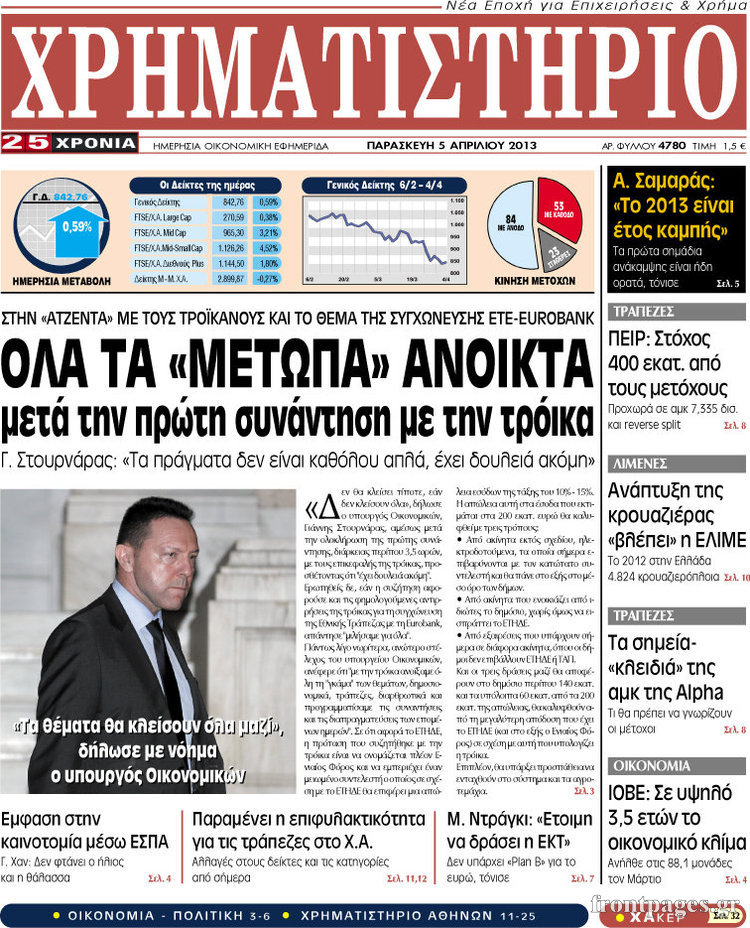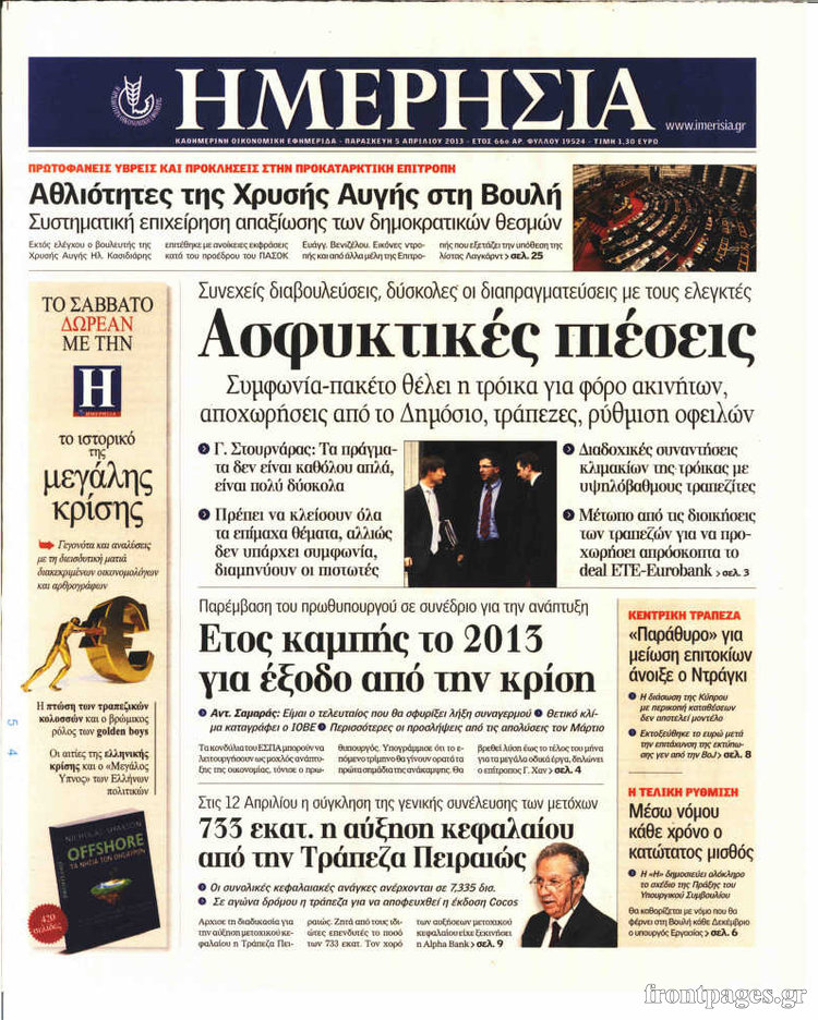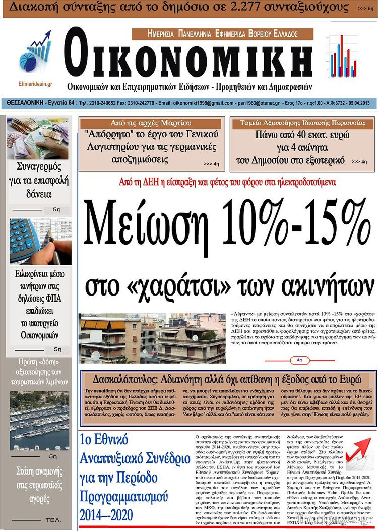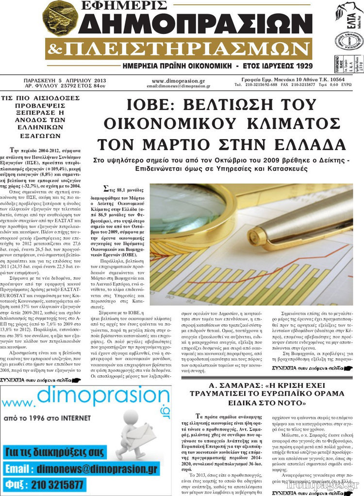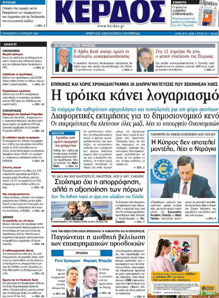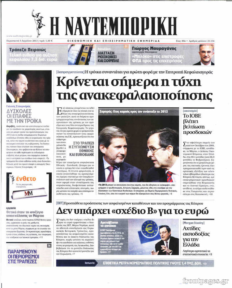 Οι οικονομικές εφημερίδες Enikos Newsroom 08:27, Παρασκευή 05 Απριλίου 2013 Media Οι οικονομικές εφημερίδες Τα πρωτοσέλιδα των οικονομικών εφημερίδων. ΕΦΗΜΕΡΙΔΕΣ ΟΙΚΟΝΟΜΙΚΕΣ ΕΦΗΜΕΡΙΔΕΣ ΠΡΩΤΟΣΕΛΙΔΑ Μοιράσου το: σχολίασε κι εσύ (0 σχόλια) Ακολουθήστε το enikos.gr στο Google News και μάθετε πρώτοι όλες τις ειδήσεις Δείτε όλες τις τελευταίες ειδήσεις από την Ελλάδα και τον Κόσμο στο enikos.gr Ειδήσεις Ροή Ειδήσεων 4 ώρες πριν Αγρότες: Την Τρίτη η απόφαση για διάλογο ή κλιμάκωση των κινητοποιήσεών τους – Πώς χαρακτηρίζουν τις ανακοινώσεις Τσιάρα και οι επόμενες κινήσεις 3 ώρες πριν Τραμπ για Ουκρανία: «Είμαστε πιο κοντά σε συμφωνία από ποτέ» – «Πολυεθνική δύναμη» προτείνουν οι Ευρωπαίοι 4 ώρες πριν Κυψέλη: Η 16χρονη που μαχαίρωσε την 14χρονη είχε συλληφθεί 3 φορές στο παρελθόν – Έβριζε καθηγητές, έβαζε φωτιές σε κάδους και εκβίαζε συμμαθητές της 4 ώρες πριν Χαλκιδική: Πώς δρούσαν οι αστυνομικοί που συνελήφθησαν για κλήσεις που δεν έκοβαν – Η «ετήσια συνδρομή» για τα μπλόκα της Τροχαίας και οι «δωρεές» 3 ώρες πριν Τρομοκρατική επίθεση στο Σίδνεϊ: Θλίψη για τα 15 θύματα – Οργή στην εβραϊκή κοινότητα που προειδοποιούσε επί δύο χρόνια 4 ώρες πριν Ύπνος: Η αρχαία μορφή άσκησης που αποδεικνύεται αποτελεσματική στην αντιμετώπιση της αϋπνίας, σύμφωνα με μελέτη 5 ώρες πριν Αριθμολογία: Ο τυχερός σας αριθμός, ανάλογα με τον μήνα γέννησής σας 6 ώρες πριν Πώς να μην μαραίνονται γρήγορα τα κομμένα λουλούδια: Το λάθος στην τοποθέτηση του βάζου που πρέπει να αποφεύγετε 3 ώρες πριν Επιστήμονες ίσως έλυσαν το μυστήριο γύρω από τα Χόμπιτ – Νέα έρευνα αποκαλύπτει πώς εξαφανίστηκαν 8 λεπτά πριν Μεξικό: Συντριβή μικρού αεροσκάφους – Τουλάχιστον επτά νεκροί 21 λεπτά πριν Serie A: O Γουέσλι Φράνκα επανάφερε τη Ρόμα στις νίκες, 1-0 την Κόμο του Τάσου Δουβίκα 30 λεπτά πριν Σεισμός 5,2 Ρίχτερ ανοιχτά της Ζακύνθου 35 λεπτά πριν Βενεζουέλα: Ο Αλεξάντερ Λουκασένκο λέει πως ο Μαδούρο είναι ευπρόσδεκτος να εγκατασταθεί στη Λευκορωσία 50 λεπτά πριν Βουλή, Προϋπολογισμός 2026 – Δημήτρης Παπαστεργίου: «Η κυβέρνηση δε στέλνει τον λογαριασμό στις επόμενες γενιές, αλλά δημιουργεί για αυτές μία χώρα που αξίζει να ζεις» ENIKOS NETWORK Πότε το χρόνιο ροχαλητό να αποτελέσει ένδειξη κινδύνου για την καρδιά; Τι λένε οι ειδικοί Μάριος Θεμιστοκλέους: Το ΕΣΥ ενισχύεται, εκσυγχρονίζεται, αλλάζει ΕΒΕΠ για αγροτικές κινητοποιήσεις: Κάθε επιπλέον εβδομάδα προσθέτει περίπου 200 εκατ. ευρώ ζημιά Τι προβλέπει το νομοσχέδιο του υπουργείου Εθνικής Άμυνας – Oι αλλαγές στους μισθούς Σύγχρονος Νοστράδαμος: Προειδοποιεί για «μεγάλο γεγονός» τους επόμενους μήνες που θα συγκλονίσει τη Βρετανία και τον κόσμο Τεστ παρατηρητικότητας: Μπορείτε να βρείτε τις 3 διαφορές στις εικόνες με έναν πιγκουίνο σε 14 δευτερόλεπτα περισσότερα 21:35 , Δευτέρα 15 Δεκεμβρίου 2025 Το Σπίτι Δίπλα Στο Ποτάμι: Η Ιουλία και ο Φωκάς μετακομίζουν στη Ρόδο – Δύο νέοι χαρακτήρες μπαίνουν στη σειρά Δύο νέοι, κομβικοί χαρακτήρες κάνουν την εμφάνισή τους αυτή την εβδομάδα στην αγαπημένη σειρά ... 19:46 , Δευτέρα 15 Δεκεμβρίου 2025 Άγιος έρωτας: Η Χριστίνα λέει την αλήθεια στον Αντρέα Ο Βασίλης δέχεται επίθεση από τους συμμαθητές του, η Αναστασία είναι συντετριμμένη με την απώλ... 18:45 , Δευτέρα 15 Δεκεμβρίου 2025 Συνέδριο «Ελληνικός Τουρισμός 2025, Μια εθνική υπόθεση!» – «Ο Θαλάσσιος Πυλώνας ως Ενιαία Στρατηγική: Συνέργειες σε Λιμάνια, Μαρίνες, Ακτοπλοΐα, Κρουαζιέρα και Yachting» Στο πλαίσιο της τ
