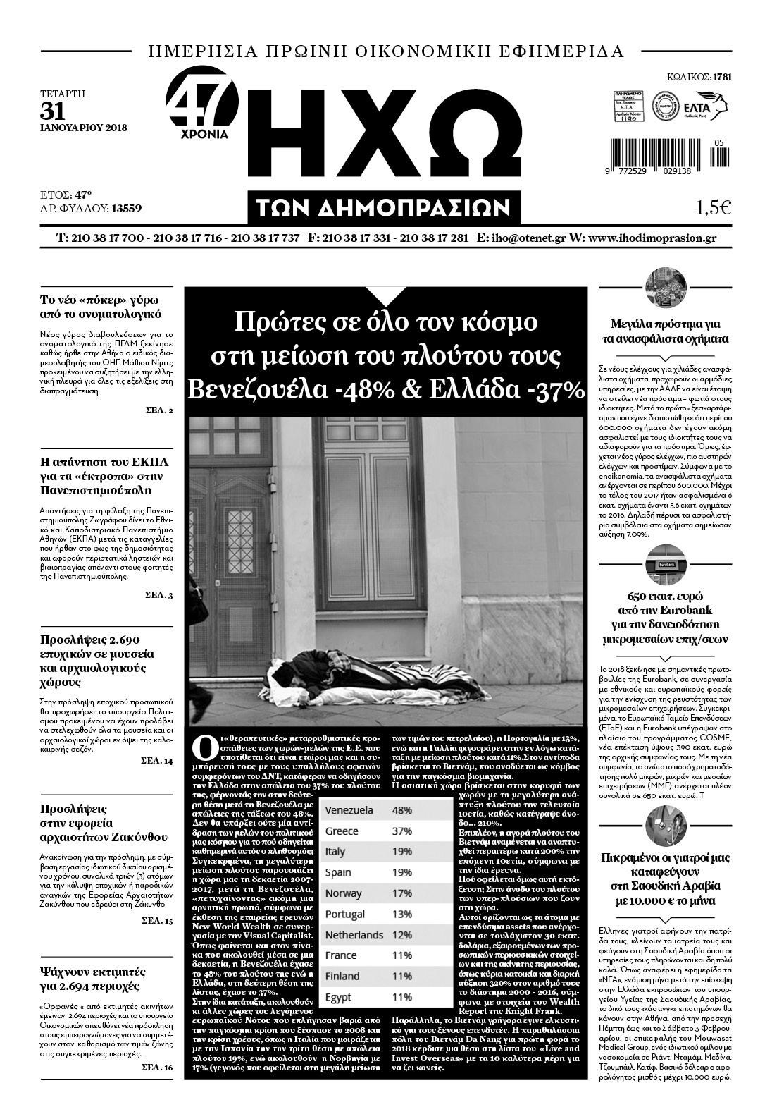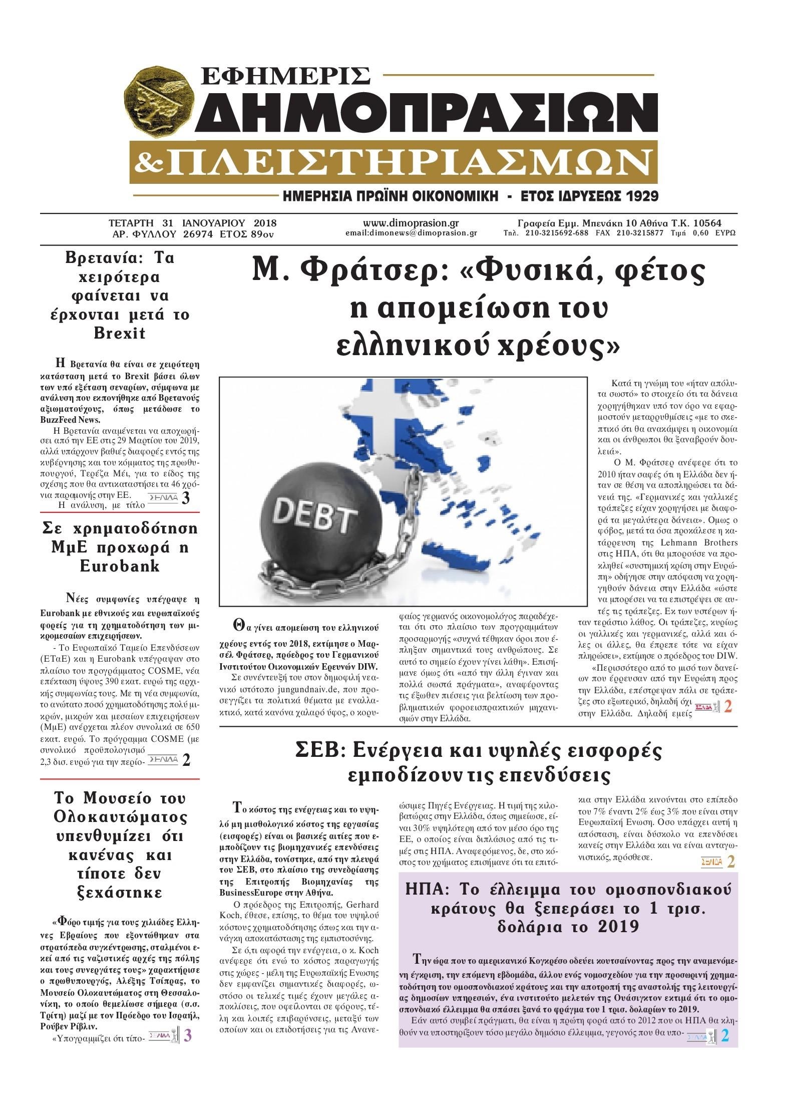 Οι οικονομικές εφημερίδες 31/1/2018 Κώστας Τεό 06:41, Τετάρτη 31 Ιανουαρίου 2018 Media Διαβάστε τα σημερινά πρωτοσέλιδα των οικονομικών εφημερίδων: ΟΙΚΟΝΟΜΙΚΕΣ ΕΦΗΜΕΡΙΔΕΣ ΠΡΩΤΟΣΕΛΙΔΑ Μοιράσου το: σχολίασε κι εσύ (0 σχόλια) Ακολουθήστε το enikos.gr στο Google News και μάθετε πρώτοι όλες τις ειδήσεις Δείτε όλες τις τελευταίες ειδήσεις από την Ελλάδα και τον Κόσμο στο enikos.gr Ειδήσεις Ροή Ειδήσεων 3 ώρες πριν Η Ουκρανία χτύπησε τάνκερ του σκιώδους στόλου της Ρωσίας στη Μεσόγειο – Έπλεε νότια της Κρήτης 1 ώρα πριν Πούτιν: Σαρκαστικά μηνύματα, παράπονα και απρόοπτα στη συνέντευξη Τύπου – Η πρόταση γάμου on air και οι ερωτήσεις για τα αγγούρια και τους… εξωγήινους 2 ώρες πριν Η απάντηση της κυβέρνησης στα αιτήματα των αγροτών: 16+4 υλοποιούνται ή βρίσκονται υπό επεξεργασία για να βρεθεί λύση – 7 δεν μπορούν να επιλυθούν 2 ώρες πριν Θεσσαλονίκη: Στη φυλακή ο 44χρονος που κατηγορείται ότι προσπάθησε να πνίξει με κορδόνι την 34χρονη σύντροφό του 2 ώρες πριν Εξώδικο επιχειρηματία στον Γιώργο Μαζωνάκη – Τι απαντά στις καταγγελίες του τραγουδιστή 57 λεπτά πριν Τα 5 ζώδια που ευνοούνται στην ερωτική ζωή τους την επόμενη εβδομάδα – «Η ενέργεια του Αιγόκερου φέρνει αγάπη και σταθερότητα» 6 ώρες πριν Γεμάτος νεροχύτης; 5 σοβαρές ευθύνες που «φοβίζουν» όσους αφήνουν άπλυτα πιάτα 5 ώρες πριν Ειδικός μοιράζεται 6 κόλπα για να διατηρείστε σε φόρμα με πάνω από 40 ώρες εργασίας την εβδομάδα: «Προπονηθείτε πριν από τη δουλειά, όχι μετά» 2 ημέρες πριν 20 χρόνια τα Χριστούγεννα ξεκινούν στα Public με μεγάλη ποικιλία σε δώρα! 6 λεπτά πριν ΟΠΑΠ: Φρέσκια και δυναμική καμπάνια για το Υπεύθυνο Παιχνίδι με Χριστουγεννιάτικη διάθεση 8 λεπτά πριν ΟΗΕ: Δεν υπάρχει πλέον λιμός στη Γάζα αλλά η επισιτιστική ανασφάλεια παραμένει 15 λεπτά πριν Τραγωδία στη Λάρισα: Νεκρή γυναίκα που παρασύρθηκε από φορτηγό 20 λεπτά πριν Κασπία Θάλασσα: Ουκρανικά πλήγματα με drones σε ρωσική εξέδρα άντλησης πετρελαίου 24 λεπτά πριν Μαρινάκης για το «όχι» του ΠΑΣΟΚ στην ένταξη του ΟΠΕΚΕΠΕ στην ΑΑΔΕ: «Εκτεθειμένος ο κ. Ανδρουλάκης απέναντι στους αγρότες» ENIKOS NETWORK ΕΛΣΤΑΤ: Αύξηση κατά 1,7% των επαγγελματιών υγείας το 2024 Τάξη στις ιατρικές διαφημίσεις για την προστασία των πολιτών βάζει ο ΙΣΑ Παπαθανάσης για νέο Εθνικό Πρόγραμμα Ανάπτυξης 2026-2030: Είναι υπερδιπλάσιο από αυτό της προηγούμενης προγραμματικής περιό... Βουλή: Υπερψηφίστηκε το νομοσχέδιο για τη μετάβαση του ΟΠΕΚΕΠΕ στην ΑΑΔΕ Χαρτογραφώντας το «σημείο χωρίς επιστροφή»: Για πρώτη φορά αποκαλύπτεται με λεπτομέρεια το ακανθώδες όριο της ατμόσφαιρας τ... Η Google καταργεί τη λειτουργία «dark web report» – Πώς θα μπορούν οι χρήστες να διαγράφουν τα δεδομένα τους περισσότερα 15:15 , Παρασκευή 19 Δεκεμβρίου 2025 Την Κυριακή με τη Realnews: Ό,τι και αν αγοράσεις, σκανάρεις και κερδίζεις! Την Κυριακή με τη Realnews: Ό,τι και αν αγοράσεις, σκανάρεις και κερδίζεις! Με το PADU app, το... 08:00 , Παρασκευή 19 Δεκεμβρίου 2025 Την Κυριακή με τη Realnews: Δωροεπιταγή 10€ Δωροεπιταγή αξίας 10€ για αγορές άνω των 60€ από τα πολυκαταστήματα FactoryOutlet H προσφορά ι... 05:48 , Παρασκευή 19 Δεκεμβρίου 2025 Οι οικονομικές εφημερίδες 19/12/2025 Διαβάστε τα πρωτοσέλιδα από τις οικονομικές εφημερίδες, σήμερα 19/12/2025. 05:43 , Παρασκευή 19 Δεκεμβρίου 2025 Οι αθλητικές εφημερίδες 19/12/2025 Διαβάστε τα πρωτοσέλιδα από τις αθλητικές εφημερίδες, σήμερα 19/12/2025. ΤΕΛΕΥΤΑΙΕΣ ΕΙΔΗΣΕΙΣ 6 λεπτά πριν ΟΠΑΠ: Φρέσκια και δυναμική καμπάνια για το Υπεύθυνο... 8 λεπτά πριν ΟΗΕ: Δεν υπάρχει πλέον