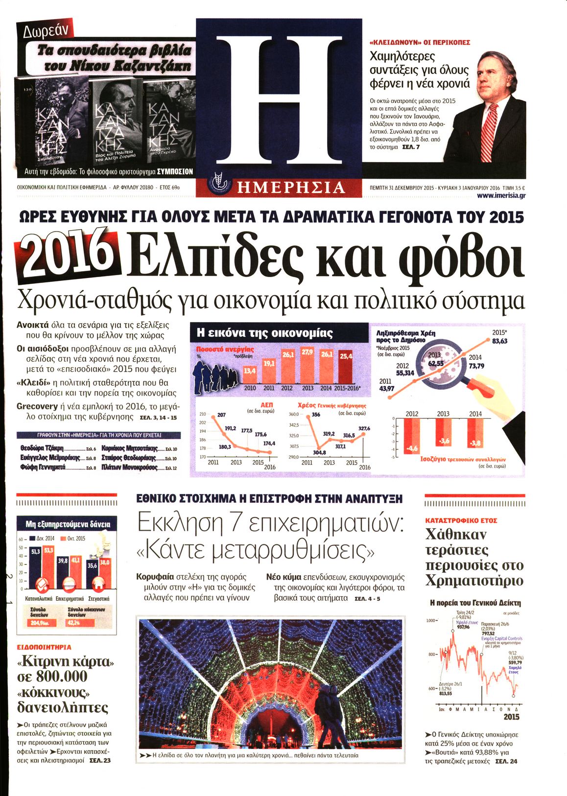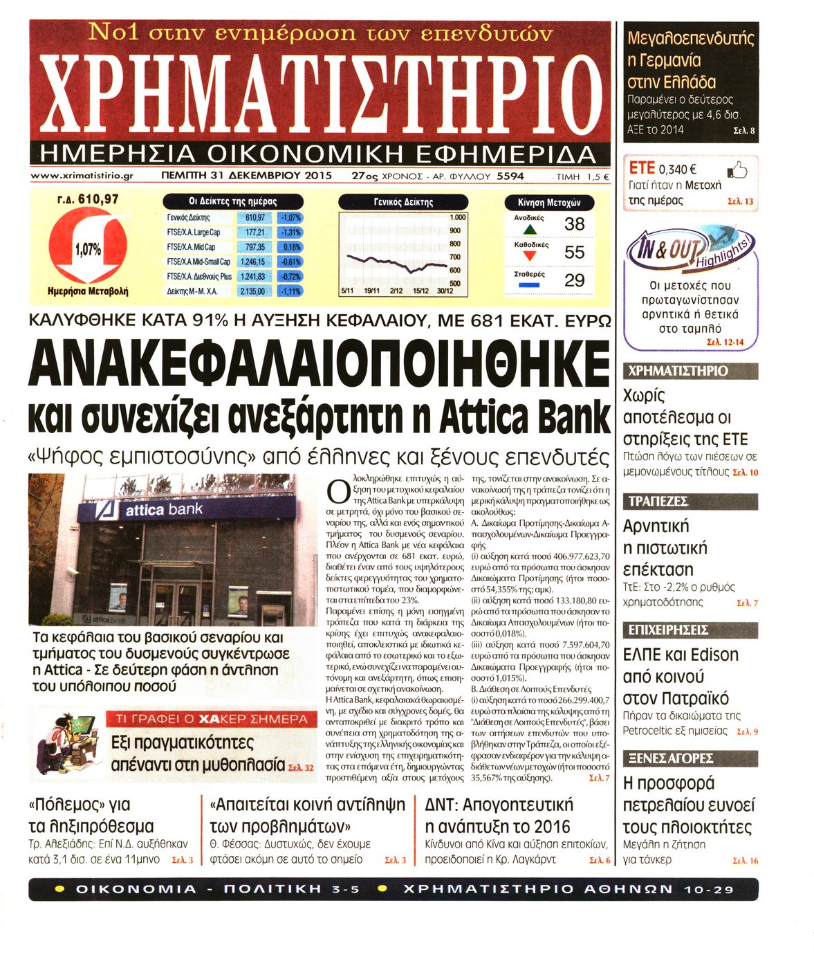 Οι οικονομικές εφημερίδες 31/12/2015 Enikos Newsroom 06:00, Πέμπτη 31 Δεκεμβρίου 2015 Media Διαβάστε τα σημερινά πρωτοσέλιδα των οικονομικών εφημερίδων: ΟΙΚΟΝΟΜΙΚΕΣ ΕΦΗΜΕΡΙΔΕΣ ΠΡΩΤΟΣΕΛΙΔΑ Μοιράσου το: σχολίασε κι εσύ (0 σχόλια) Ακολουθήστε το enikos.gr στο Google News και μάθετε πρώτοι όλες τις ειδήσεις Δείτε όλες τις τελευταίες ειδήσεις από την Ελλάδα και τον Κόσμο στο enikos.gr Ειδήσεις Ροή Ειδήσεων 37 λεπτά πριν Έρευνα MRB: Η πρόθεση ψήφου και τα σημαντικότερα προβλήματα – Οι «λέξεις» που εκφράζουν τους πολίτες 30 λεπτά πριν Αλαλούμ με τις πληρωμές στους αγρότες: Δεν καταβλήθηκε η Βασική Ενίσχυση, αλλά έγινε παρακράτηση της εισφοράς στον ΕΛΓΑ – Τι απαντά η κυβέρνηση 1 ώρα πριν Αγρότες: Πολύωροι αποκλεισμοί και σήμερα στα τελωνεία Ευζώνων, Νίκης, Προμαχώνα και Εξοχής 2 ώρες πριν Ρομπ Ράινερ: Το δείπνο με τους Ομπάμα που δεν έγινε ποτέ και νέα στοιχεία για τον «καβγά» στο πάρτι – Βίντεο με τον γιο του να περιφέρεται κοντά στο σπίτι της τραγωδίας 2 ώρες πριν Κυψέλη: Μαθητές κλείδωσαν τους καθηγητές μέσα στο Γυμνάσιο μετά την επίθεση με μαχαίρι 22 λεπτά πριν Τα 4 ζώδια που ξαναβρίσκουν τον εαυτό τους – «Μπαίνετε επιτέλους στην ουσία των πραγμάτων» 5 ώρες πριν Οπτική ψευδαίσθηση: Μόνο αν είσαι ο Σέρλοκ Χολμς θα βρεις τον σκύλο σε 15 δευτερόλεπτα 3 ώρες πριν Νεολιθικός σκύλος βρέθηκε προσεκτικά θαμμένος στον βυθό λίμνης – Δίπλα του βρέθηκε ένα στιλέτο 2 ώρες πριν Έλαβε τελεσίγραφο από τη σύντροφό του – «Μου είπε πως ή θα της κάνω πρόταση στα δύο χρόνια σχέσης ή θα με χωρίσει» 6 λεπτά πριν Καραχάλιος: «Η κυρία Καρυστιανού πρέπει να καταλάβει ότι στην πολιτική κάθε ψέμα κοστίζει» 12 λεπτά πριν Λούκας Γιώρκας: «Έχω δεχθεί παρατραβηγμένες συμπεριφορές – Άφησα τον άνθρωπο να εκτονωθεί και συνέχισα» 17 λεπτά πριν Οι Νιου Γιορκ Νικς κατέκτησαν το NBA Cup – MVP ο Τζέιλεν Μπράνσον με 25 πόντους και 8 ασίστ 22 λεπτά πριν Τα 4 ζώδια που ξαναβρίσκουν τον εαυτό τους – «Μπαίνετε επιτέλους στην ουσία των πραγμάτων» 23 λεπτά πριν «Οδύσσεια»: Νέες εντυπωσιακές φωτογραφίες από το κινηματογραφικό έπος του Κρίστοφερ Νόλαν ENIKOS NETWORK Αδενώματα Υπόφυσης: Μια πάθηση καλοήθης, αλλά όχι αθώα Χρόνια Αναπνευστικά Νοσήματα: 400.000 θάνατοι ετησίως στην Ευρώπη Ειδικό επιδοτούμενο πρόγραμμα κατάρτισης της ΔΥΠΑ για ανέργους: Αρχίζει σήμερα η υποβολή ενστάσεων-Ποιους αφορά Δώρο Χριστουγέννων και επιδόματα της ΔΥΠΑ: Σήμερα αρχίζει η προπληρωμή τους-Ποιους αφορά Σύγχρονος Νοστράδαμος: Προειδοποιεί για «μεγάλο γεγονός» τους επόμενους μήνες που θα συγκλονίσει τη Βρετανία και τον κόσμο Τεστ παρατηρητικότητας: Μπορείτε να βρείτε τις 3 διαφορές στις εικόνες με έναν πιγκουίνο σε 14 δευτερόλεπτα περισσότερα 09:08 , Τετάρτη 17 Δεκεμβρίου 2025 Τηλεθέαση (16/12): Ανακατατάξεις στην πρωινή ψυχαγωγική ζώνη Ξεκάθαρη πρωτιά στην τηλεθέαση για την «Super Κατερίνα» στο δυναμικό κοινό με ποσοστό 18,5%, α... 08:00 , Τετάρτη 17 Δεκεμβρίου 2025 Την Κυριακή με τη Realnews: Δωροεπιταγή 10€ Δωροεπιταγή αξίας 10€ για αγορές άνω των 60€ από τα πολυκαταστήματα FactoryOutlet H προσφορά ι... 07:00 , Τετάρτη 17 Δεκεμβρίου 2025 Την Κυριακή με τη Realnews: Ό,τι και αν αγοράσεις, σκανάρεις και κερδίζεις! Την Κυριακή με τη Realnews: Ό,τι και αν αγοράσεις, σκανάρεις και κερδίζεις! Με το PADU app, το... 05:48 , Τετάρτη 17 Δεκεμβρίου 2025 Οι οικονομικές εφημερίδες 17/12/2025 Διαβάστε τα πρωτοσέλιδα από τις οικονομικές εφημερίδες, σήμερα 17/12/2025. ΤΕΛΕΥΤΑΙΕΣ ΕΙΔΗΣΕΙΣ 6 λεπτά πριν Καραχάλιος: «Η κυρία Καρυστιανού πρέπει να κα