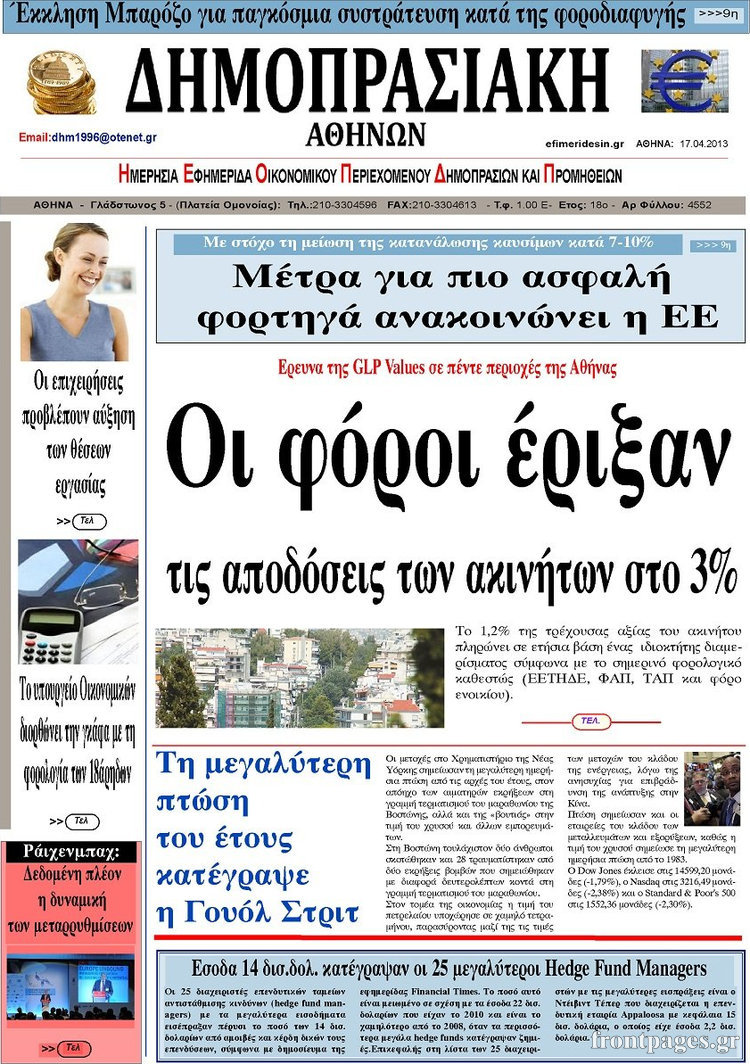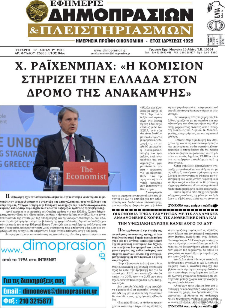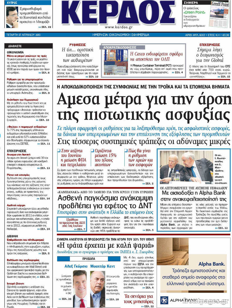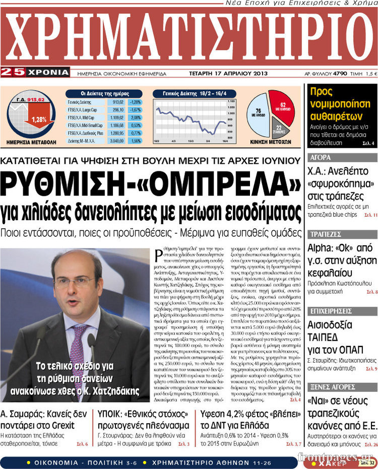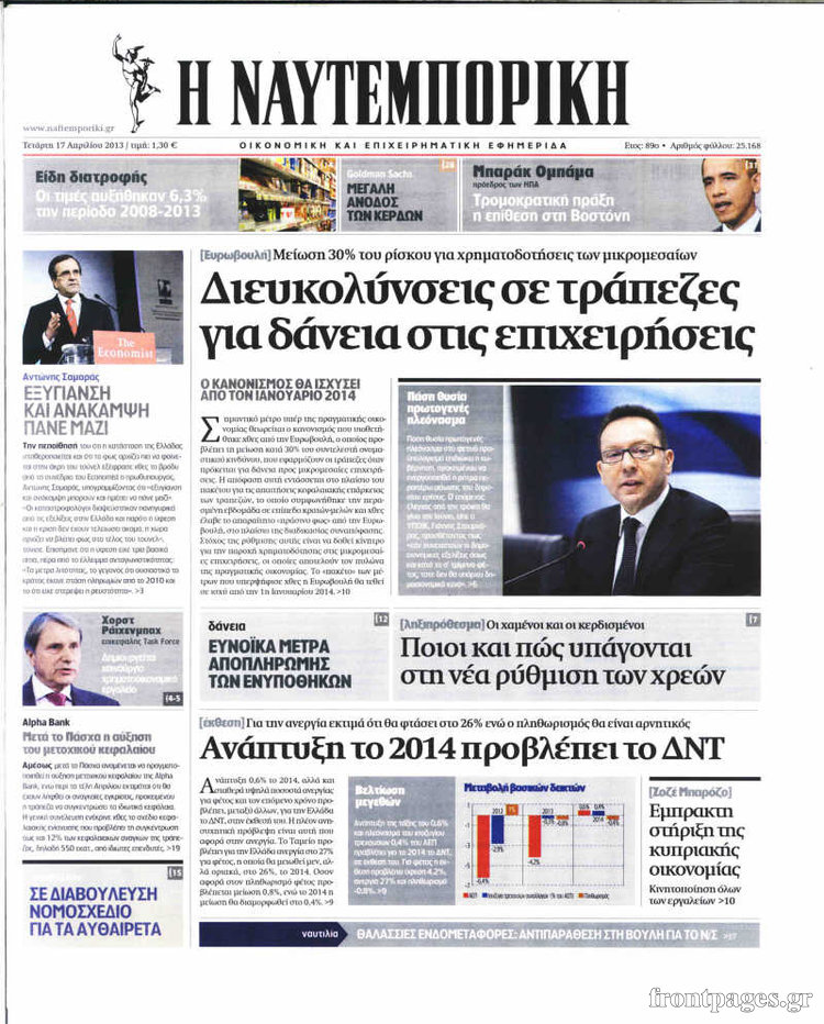 Οι οικονομικές εφημερίδες Enikos Newsroom 08:34, Τετάρτη 17 Απριλίου 2013 Media Οι οικονομικές εφημερίδες Τα πρωτοσέλιδα των οικονομικών εφημερίδων. ΕΦΗΜΕΡΙΔΕΣ ΟΙΚΟΝΟΜΙΚΕΣ ΕΦΗΜΕΡΙΔΕΣ ΠΡΩΤΟΣΕΛΙΔΑ Μοιράσου το: σχολίασε κι εσύ (0 σχόλια) Ακολουθήστε το enikos.gr στο Google News και μάθετε πρώτοι όλες τις ειδήσεις Δείτε όλες τις τελευταίες ειδήσεις από την Ελλάδα και τον Κόσμο στο enikos.gr Ειδήσεις Ροή Ειδήσεων 8 ώρες πριν Μακελειό στο Σίδνεϊ: Πατέρας και γιος οι δράστες της τρομοκρατικής επίθεσης – Γιατί η Αυστραλία βάζει στο στόχαστρο το Ιράν 8 ώρες πριν Μακελειό στην Αυστραλία: «Πέρασαν οι σφαίρες πάνω από το αυτοκίνητο» – Συγκλονίζει η μαρτυρία Έλληνα που ζει στο Σίδνεϊ 7 ώρες πριν Τρομοκρατική επίθεση στο Σίδνεϊ: «Το αναπόφευκτο συνέβη πλέον» – Πώς οι δράστες είχαν χάσει τον ανθρωπισμό τους πριν πατήσουν την σκανδάλη 7 ώρες πριν Όλα τα αιτήματα αγροτών, κτηνοτρόφων και μελισσοκόμων προς την κυβέρνηση – Παραμένουν στα μπλόκα και προαναγγέλλουν κλιμάκωση 10 ώρες πριν Λακωνία: Βίντεο ντοκουμέντο από την επιχείρηση διάσωσης της 13χρονης που έπεσε σε πηγάδι – Ποια ήταν τα πρώτα λόγια της 38 λεπτά πριν Οπτική ψευδαίσθηση: Μόνο το 1% των ανθρώπων θα βρει το ψάρι σε 12 δευτερόλεπτα 53 λεπτά πριν Διατροφή: Γιατρός προειδοποιεί για 2 απλά λάθη που αυξάνουν τον κίνδυνο χρόνιων παθήσεων 1 ώρα πριν Τα ζώδια σήμερα, Δευτέρα 15 Δεκεμβρίου: Ιχθύες, ξεκινήστε από εκεί που η παρουσία σας έχει σημασία 9 ώρες πριν Ύπνος: 5 λόγοι για τους οποίους ξυπνάτε κουρασμένοι το πρωί κατά τη διάρκεια του χειμώνα 6 λεπτά πριν ΦΠΑ: Αυξάνεται κατά 57% ο αριθμός των ελέγχων για παράνομες επιστροφές και απάτες – Πού θα δοθεί προτεραιότητα 14 λεπτά πριν Γουατεμάλα: Βίαιες συγκρούσεις με νεκρούς στην περιοχή των αυτόχθονων 21 λεπτά πριν Δημόσιο χρέος: Η Ελλάδα αποπληρώνει σήμερα πρόωρα 5,287 δισ. ευρώ από το πρώτο μνημόνιο – Στα 1,6 δισ. ευρώ η ελάφρυνση 30 λεπτά πριν Τραγωδία στην Κολομβία: Δεκαεπτά νεκροί, ανάμεσά τους 16 μαθητές λυκείου, από πτώση λεωφορείου σε χαράδρα 38 λεπτά πριν Οπτική ψευδαίσθηση: Μόνο το 1% των ανθρώπων θα βρει το ψάρι σε 12 δευτερόλεπτα ENIKOS NETWORK 8 κορυφαίες συμβουλές για άνδρες που θέλουν φλογερή σεξουαλική ζωή, σύμφωνα με ειδικό Baby botox: Ποια τα οφέλη και οι κίνδυνοι του να ξεκινήσει κάποιος τις ενέσεις πριν εμφανιστούν ρυτίδες Τέλος οι διώξεις για χρέη σε Εφορία και ΕΦΚΑ – Τι προβλέπει νέα διάταξη μετά την πτώχευση Υπουργείο Αγροτικής Ανάπτυξης: Ενισχύσεις de minimis ύψους 2,1 εκατ. ευρώ – Οι δικαιούχοι Σύγχρονος Νοστράδαμος: Προειδοποιεί για «μεγάλο γεγονός» τους επόμενους μήνες που θα συγκλονίσει τη Βρετανία και τον κόσμο Τεστ παρατηρητικότητας: Μπορείτε να βρείτε τις 3 διαφορές στις εικόνες με έναν πιγκουίνο σε 14 δευτερόλεπτα περισσότερα 05:49 , Δευτέρα 15 Δεκεμβρίου 2025 Οι οικονομικές εφημερίδες 15/12/2025 Διαβάστε τα πρωτοσέλιδα από τις οικονομικές εφημερίδες, σήμερα 15/12/2025. 05:43 , Δευτέρα 15 Δεκεμβρίου 2025 Οι αθλητικές εφημερίδες 15/12/2025 Διαβάστε τα πρωτοσέλιδα από τις αθλητικές εφημερίδες, σήμερα 15/12/2025. 05:38 , Δευτέρα 15 Δεκεμβρίου 2025 Οι πολιτικές εφημερίδες 15/12/2025 Διαβάστε τα πρωτοσέλιδα από τις πολιτικές εφημερίδες, σήμερα 15/12/2025. 21:34 , Κυριακή 14 Δεκεμβρίου 2025 Ο Δικαστής: Η Λέττα είναι αποφασισμένη να αποκαλύψει την αλήθεια για το τροχαίο, απόψε στις 21:45 στον ΑΝΤ1 Ραγδαίες οι εξελίξεις στο νέο επεισόδιο της σειράς “Ο Δικαστής” απόψε στις 21:45 σ... ΤΕΛΕΥΤΑΙΕΣ ΕΙΔΗΣΕΙΣ 6 λεπτά πριν ΦΠΑ: Αυξάνεται κατά 57% ο αρι