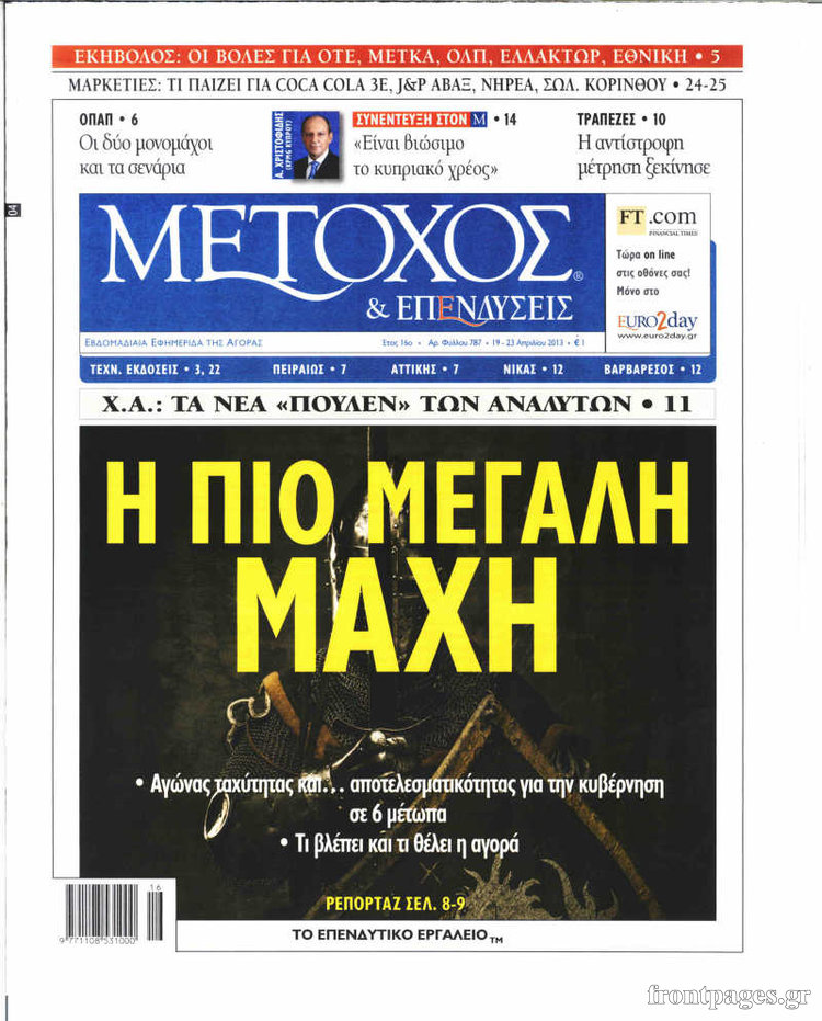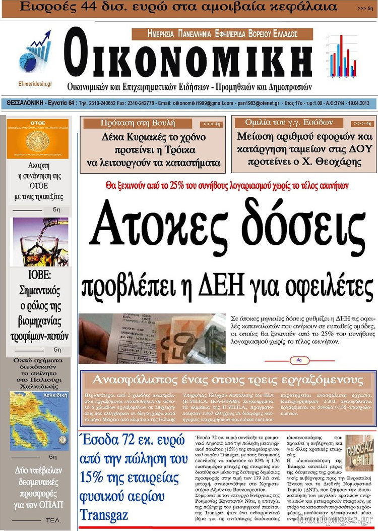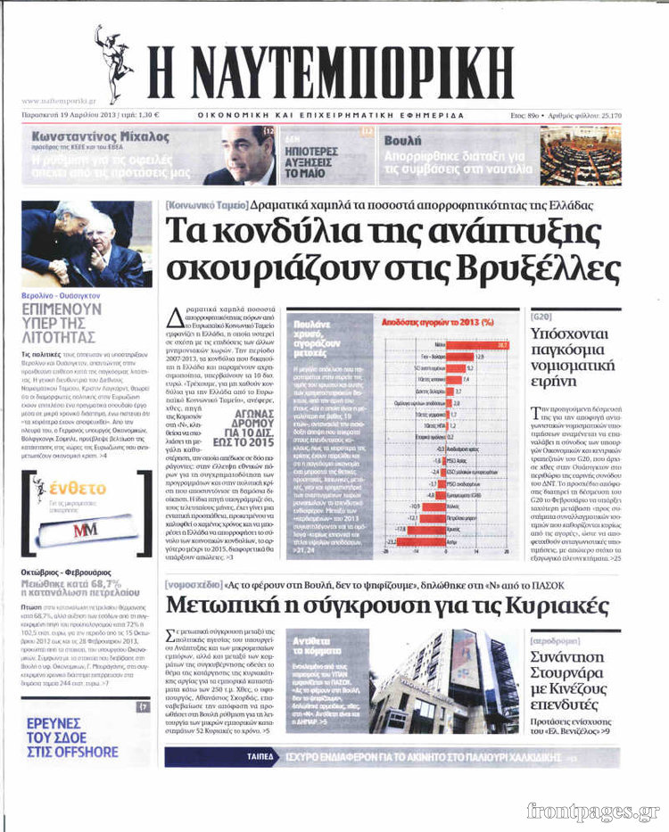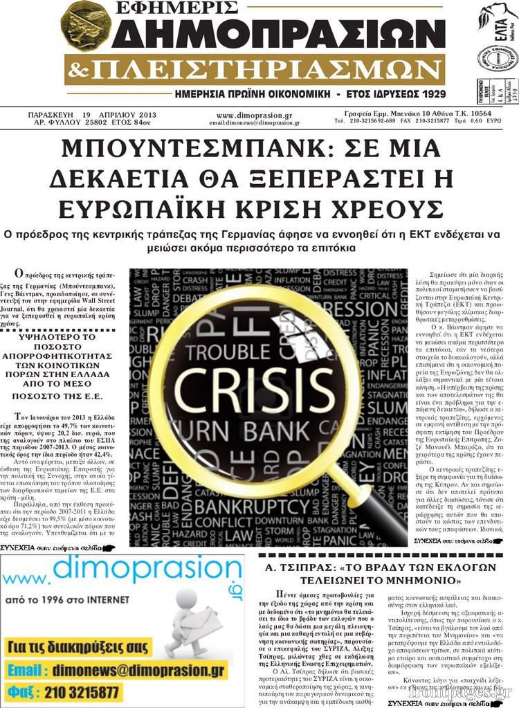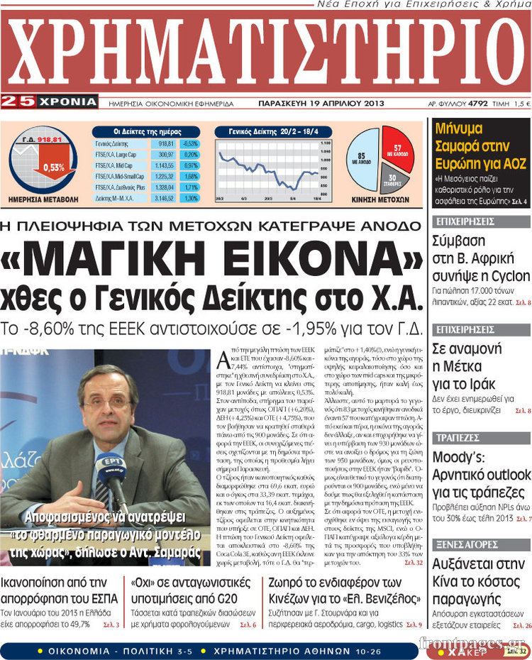 Οι οικονομικές εφημερίδες Enikos Newsroom 08:30, Παρασκευή 19 Απριλίου 2013 Media Οι οικονομικές εφημερίδες Τα πρωτοσέλιδα των οικονομικών εφημερίδων. ΕΦΗΜΕΡΙΔΕΣ ΟΙΚΟΝΟΜΙΚΕΣ ΕΦΗΜΕΡΙΔΕΣ ΠΡΩΤΟΣΕΛΙΔΑ Μοιράσου το: σχολίασε κι εσύ (0 σχόλια) Ακολουθήστε το enikos.gr στο Google News και μάθετε πρώτοι όλες τις ειδήσεις Δείτε όλες τις τελευταίες ειδήσεις από την Ελλάδα και τον Κόσμο στο enikos.gr Ειδήσεις Ροή Ειδήσεων 16 λεπτά πριν Αυστραλία: Σχέσεις με το ISIS εκτιμάται πως είχαν οι δράστες της τρομοκρατικής επίθεσης στο Σίδνεϊ 21 λεπτά πριν Αγρότες: Αμετακίνητοι από τα μπλόκα σε τελωνεία και εθνικές οδούς – Ο χάρτης των κινητοποιήσεων και τα αιτήματά τους 26 λεπτά πριν Σοκ στο Χόλιγουντ: Νεκροί από μαχαιριές ο σκηνοθέτης Ρομπ Ράινερ και η σύζυγός του – Αναφορές ότι τους σκότωσε ο γιος τους 31 λεπτά πριν Δολοφονία στη Φοινικούντα: Απολογούνται σήμερα οι δύο συλληφθέντες – Στο «κάδρο» και δύο γυναίκες 1 ώρα πριν Δάνεια σε ελβετικό φράγκο: Ανακοινώνεται η ρύθμιση – Ποιοι και πόσο όφελος θα έχουν 36 λεπτά πριν Κάτω από παλάτι κρυβόταν ένα άλλο μνημειώδες ανάκτορο: Οι ανασκαφές σε αρχαία πόλη αποκάλυψαν τα ερείπια και τα μυστικά του 2 ώρες πριν Οπτική ψευδαίσθηση: Μόνο το 1% των ανθρώπων θα βρει το ψάρι σε 12 δευτερόλεπτα 3 ώρες πριν Διατροφή: Γιατρός προειδοποιεί για 2 απλά λάθη που αυξάνουν τον κίνδυνο χρόνιων παθήσεων 3 ώρες πριν Τα ζώδια σήμερα, Δευτέρα 15 Δεκεμβρίου: Ιχθύες, ξεκινήστε από εκεί που η παρουσία σας έχει σημασία 6 λεπτά πριν Συνταγή για τραγανή και πεντανόστιμη πίτσα στο air fryer – Είναι έτοιμη μέσα σε 20 λεπτά 11 λεπτά πριν «Ενέσεις» ρευστότητας στους αγρότες 16 λεπτά πριν Αυστραλία: Σχέσεις με το ISIS εκτιμάται πως είχαν οι δράστες της τρομοκρατικής επίθεσης στο Σίδνεϊ 17 λεπτά πριν Αθηνά Οικονομάκου – Μπρούνο Τσερέλα: Χριστούγεννα στην Αθήνα, Πρωτοχρονιά στο Μπουένος Αϊρες 21 λεπτά πριν Αγρότες: Αμετακίνητοι από τα μπλόκα σε τελωνεία και εθνικές οδούς – Ο χάρτης των κινητοποιήσεων και τα αιτήματά τους ENIKOS NETWORK Αυτή την Κυριακή με τη Realnews: Instyle μαζί Drive και Realnews Geopolitics Καρκίνος του παγκρέατος: Οι επιστήμονες αποκάλυψαν γιατί εξαπλώνεται τόσο γρήγορα Δάνεια σε ελβετικό φράγκο: Ανακοινώνεται η ρύθμιση- Ποιοι και πόσο θα έχουν όφελος – Όλες οι λεπτομέρειες Τέλος οι διώξεις για χρέη σε Εφορία και ΕΦΚΑ – Τι προβλέπει νέα διάταξη μετά την πτώχευση Σύγχρονος Νοστράδαμος: Προειδοποιεί για «μεγάλο γεγονός» τους επόμενους μήνες που θα συγκλονίσει τη Βρετανία και τον κόσμο Τεστ παρατηρητικότητας: Μπορείτε να βρείτε τις 3 διαφορές στις εικόνες με έναν πιγκουίνο σε 14 δευτερόλεπτα περισσότερα 07:42 , Δευτέρα 15 Δεκεμβρίου 2025 Την Κυριακή με τη Realnews: Δωροεπιταγή10€ Δωροεπιταγή αξίας 10€ για αγορές άνω των 60€ από τα πολυκαταστήματα FactoryOutlet H προσφορά ι... 07:17 , Δευτέρα 15 Δεκεμβρίου 2025 Αυτή την Κυριακή με τη Realnews: Instyle, μαζί Drive και Realnews Geopolitics Αυτή την Κυριακή με τη Realnews: Instyle, μαζί Drive και Realnews Geopolitics Instyle Η Άννα Ρ... 05:49 , Δευτέρα 15 Δεκεμβρίου 2025 Οι οικονομικές εφημερίδες 15/12/2025 Διαβάστε τα πρωτοσέλιδα από τις οικονομικές εφημερίδες, σήμερα 15/12/2025. 05:43 , Δευτέρα 15 Δεκεμβρίου 2025 Οι αθλητικές εφημερίδες 15/12/2025 Διαβάστε τα πρωτοσέλιδα από τις αθλητικές εφημερίδες, σήμερα 15/12/2025. ΤΕΛΕΥΤΑΙΕΣ ΕΙΔΗΣΕΙΣ 6 λεπτά πριν Συνταγή για τραγανή και πεντανόστιμη πίτσα στο air fryer... 11 λεπτά πριν «Ενέσεις» ρευστότητας στους αγρότες 16 λεπτά πριν Αυστραλία: Σχέσεις με το ISIS εκτιμάται πως είχαν οι... 17 λεπτά πριν Αθηνά Οικονομάκο