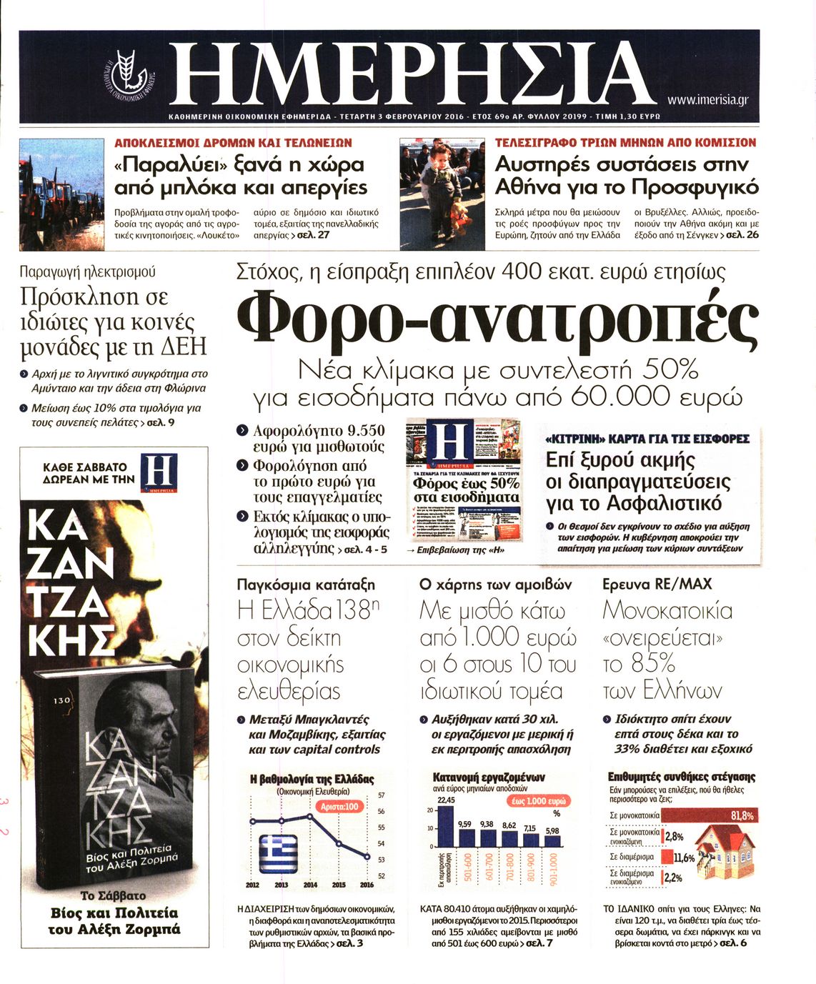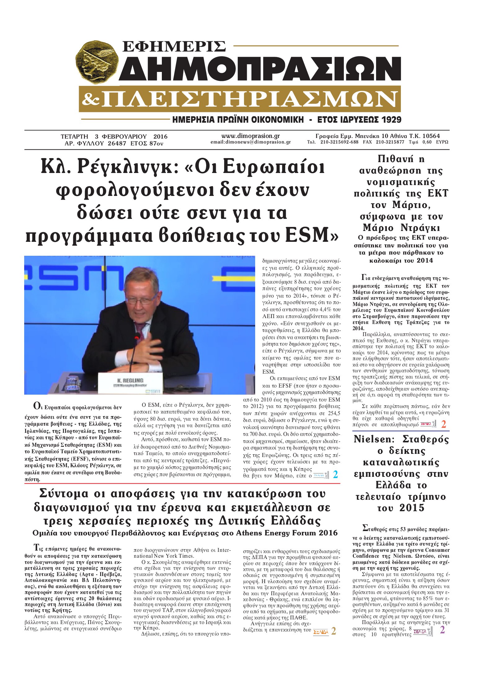 Oι οικονομικές εφημερίδες 3/2/2016 Enikos Newsroom 07:08, Τετάρτη 03 Φεβρουαρίου 2016 Media Διαβάστε τα σημερινά πρωτοσέλιδα των οικονομικών εφημερίδων… ΟΙΚΟΝΟΜΙΚΕΣ ΕΦΗΜΕΡΙΔΕΣ ΠΡΩΤΟΣΕΛΙΔΑ Μοιράσου το: σχολίασε κι εσύ (0 σχόλια) Ακολουθήστε το enikos.gr στο Google News και μάθετε πρώτοι όλες τις ειδήσεις Δείτε όλες τις τελευταίες ειδήσεις από την Ελλάδα και τον Κόσμο στο enikos.gr Ειδήσεις Ροή Ειδήσεων 2 ώρες πριν Έρευνα MRB: Η πρόθεση ψήφου και τα σημαντικότερα προβλήματα – Οι «λέξεις» που εκφράζουν τους πολίτες 45 λεπτά πριν Εξεταστική ΟΠΕΚΕΠΕ – Μυλωνάκης: «Ουδέποτε είχα πληροφόρηση ή ενημέρωσα οποιονδήποτε για επισυνδέσεις της δικογραφίας» 2 ώρες πριν Αλαλούμ με τις πληρωμές στους αγρότες: Δεν καταβλήθηκε η Βασική Ενίσχυση, αλλά έγινε παρακράτηση της εισφοράς στον ΕΛΓΑ – Τι απαντά η κυβέρνηση 57 λεπτά πριν Κλέφτες άρπαξαν έναν… 12μετρο φουσκωτό Άγιο Βασίλη – «Αν κάποιος έχει πληροφορίες να επικοινωνήσει μαζί μας» 2 ώρες πριν Ανδρέας Παναγιωτόπουλος: Δεν ψήφισε στον προϋπολογισμό για να πάει στην εκδήλωση του Αλέξη Τσίπρα – «Μείζονος πολιτικής σημασίας η μεγάλη συγκέντρωση που έκανε» 1 ώρα πριν Τα 4 ζώδια που ξαναβρίσκουν τον εαυτό τους – «Μπαίνετε επιτέλους στην ουσία των πραγμάτων» 4 ώρες πριν Νεολιθικός σκύλος βρέθηκε προσεκτικά θαμμένος στον βυθό λίμνης – Δίπλα του βρέθηκε ένα στιλέτο 3 ώρες πριν Έλαβε τελεσίγραφο από τη σύντροφό του – «Μου είπε πως ή θα της κάνω πρόταση στα δύο χρόνια σχέσης ή θα με χωρίσει» 50 λεπτά πριν «Δεν είχα κλάψει από τότε που διαγνώστηκα με καρκίνο, ώσπου ένα τηλεφώνημα με έκανε να λυγίσω» – Η συγκλονιστική εξομολόγηση ενός άνδρα 2 λεπτά πριν Μητσοτάκης για αγρότες: Ελπίζω πως θα απομακρυνθούν σύντομα από τα μπλόκα 6 λεπτά πριν Πηγές ΠΑΣΟΚ: Τι θέλει να κρύψει ο Πρόεδρος του ΟΠΕΚΕΠΕ κ. Καββαδάς; 10 λεπτά πριν Θεσσαλονίκη: Περιπετειώδης σύλληψη δύο 15χρονων – Οδηγούσαν κλεμμένη μηχανή και έπεσαν πάνω σε μοτοσικλέτα της ΕΛ.ΑΣ. 15 λεπτά πριν Home Alone: Το σπίτι της ταινίας θα ανακαινιστεί – Επιστροφή στην αισθητική της δεκαετίας του ’90 20 λεπτά πριν Τσουκαλάς για παρακρατήσεις ΕΛΓΑ: Η διαχειριστική ανεπάρκειά τους έχει χτυπήσει κόκκινο ENIKOS NETWORK Ανησυχητική αύξηση της υπέρτασης στα παιδιά – Πώς θα τα προστατέψουμε; Αδενώματα Υπόφυσης: Μια πάθηση καλοήθης, αλλά όχι αθώα ΕΕ: Γιατί η Ελλάδα ξεχωρίζει στις ασφαλείς συναλλαγές-πληρωμές στην ΕΕ Ειδικό επιδοτούμενο πρόγραμμα κατάρτισης της ΔΥΠΑ για ανέργους: Αρχίζει σήμερα η υποβολή ενστάσεων-Ποιους αφορά Σύγχρονος Νοστράδαμος: Προειδοποιεί για «μεγάλο γεγονός» τους επόμενους μήνες που θα συγκλονίσει τη Βρετανία και τον κόσμο Τεστ παρατηρητικότητας: Μπορείτε να βρείτε τις 3 διαφορές στις εικόνες με έναν πιγκουίνο σε 14 δευτερόλεπτα περισσότερα 11:35 , Τετάρτη 17 Δεκεμβρίου 2025 Home Alone: Το σπίτι της ταινίας θα ανακαινιστεί – Επιστροφή στην αισθητική της δεκαετίας του ’90 Οι νέοι ιδιοκτήτες του πραγματικού σπιτιού που παρουσιάζεται στην κλασική ταινία του 1990 «Hom... 11:25 , Τετάρτη 17 Δεκεμβρίου 2025 Grand Hotel: Απόψε το τελευταίο επεισόδιο της χρονιάς – Όλα τα μυστικά μένουν εδώ Το τελευταίο επεισόδιο της χρονιάς της σειράς «Grand Hotel» θα προβληθεί απόψε στις 21:00. Ο Ά... 09:08 , Τετάρτη 17 Δεκεμβρίου 2025 Τηλεθέαση (16/12): Ανακατατάξεις στην πρωινή ψυχαγωγική ζώνη Ξεκάθαρη πρωτιά στην τηλεθέαση για την «Super Κατερίνα» στο δυναμικό κοινό με ποσοστό 18,5%, α... 08:00 , Τετάρτη 17 Δεκεμβρίου 2025 Την Κυριακή με τη Realnews: Δωροεπιταγή 10€ Δωροεπ