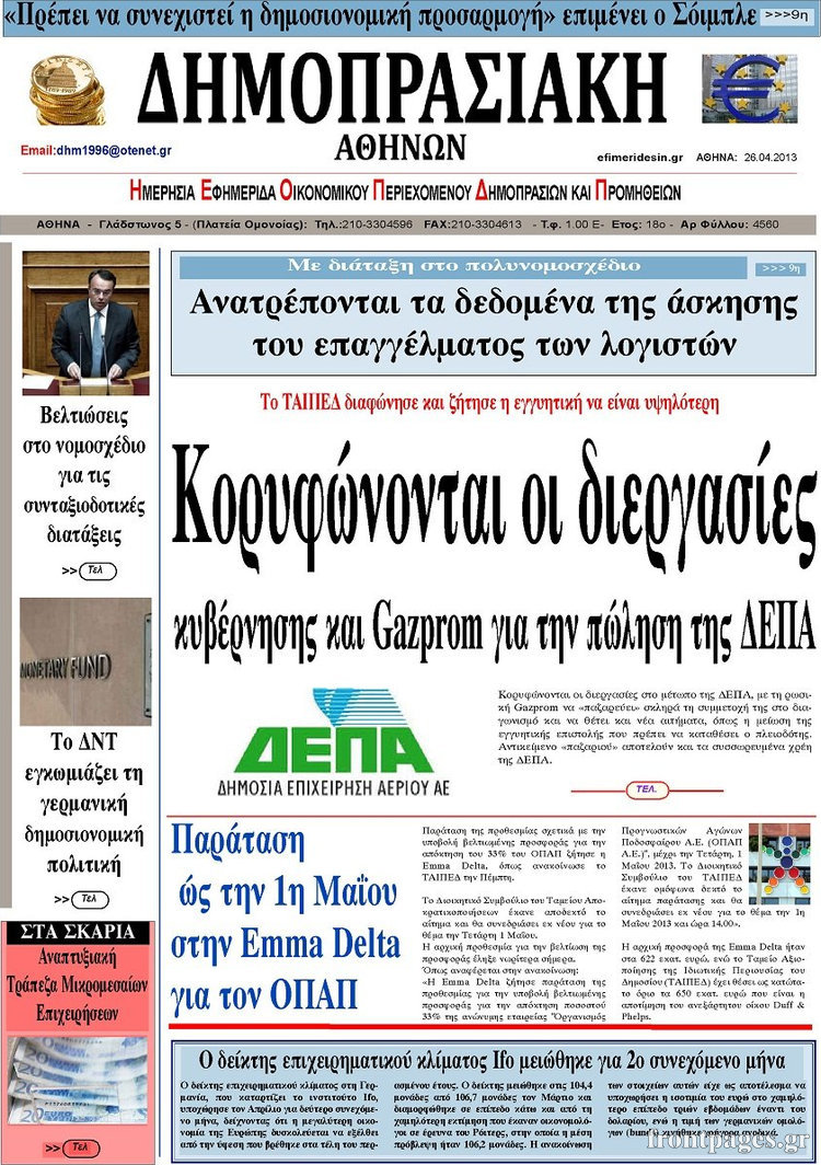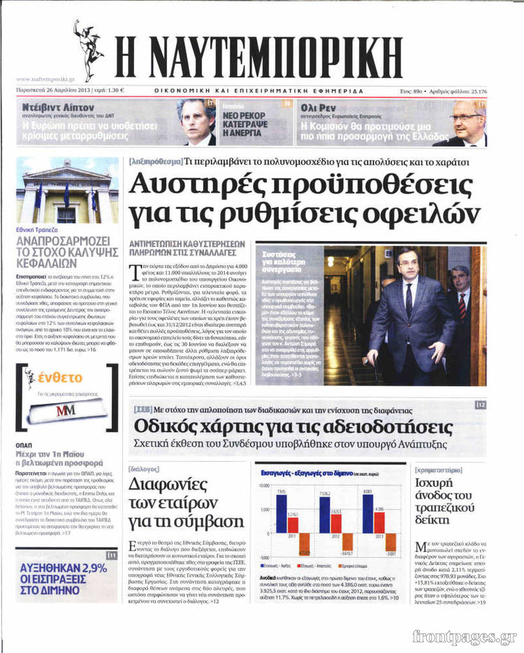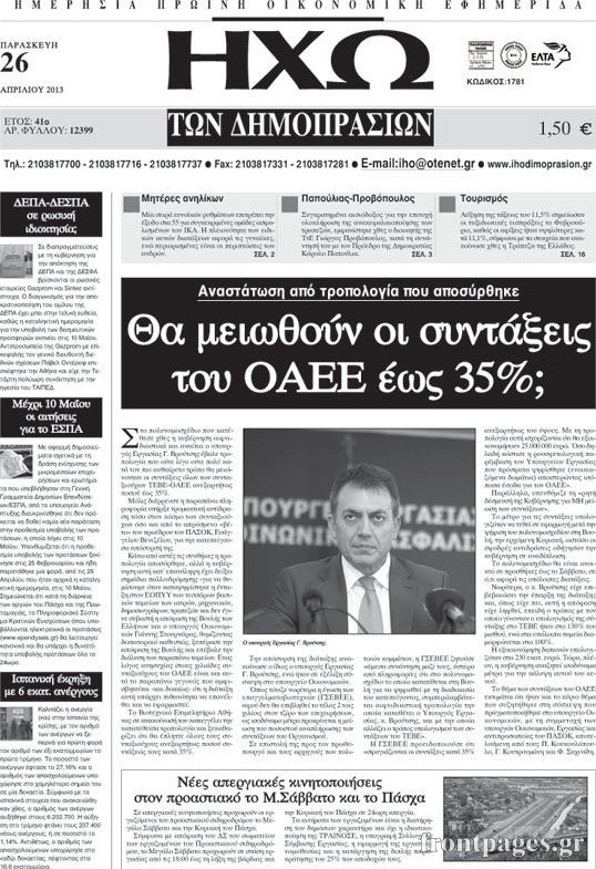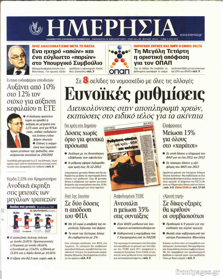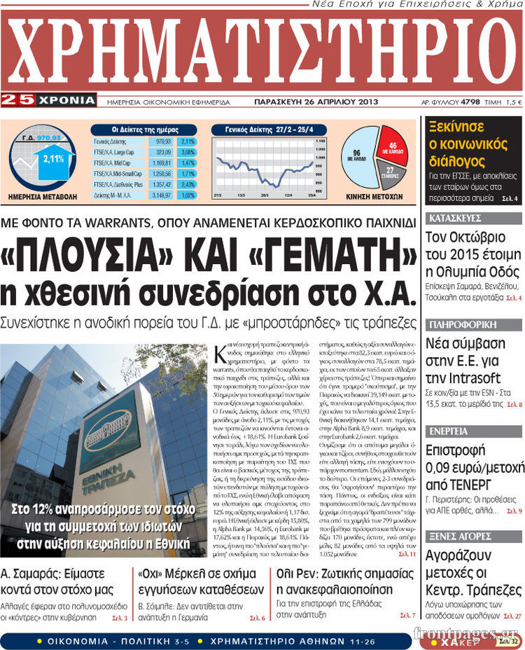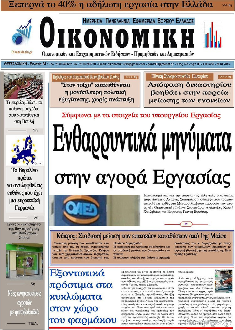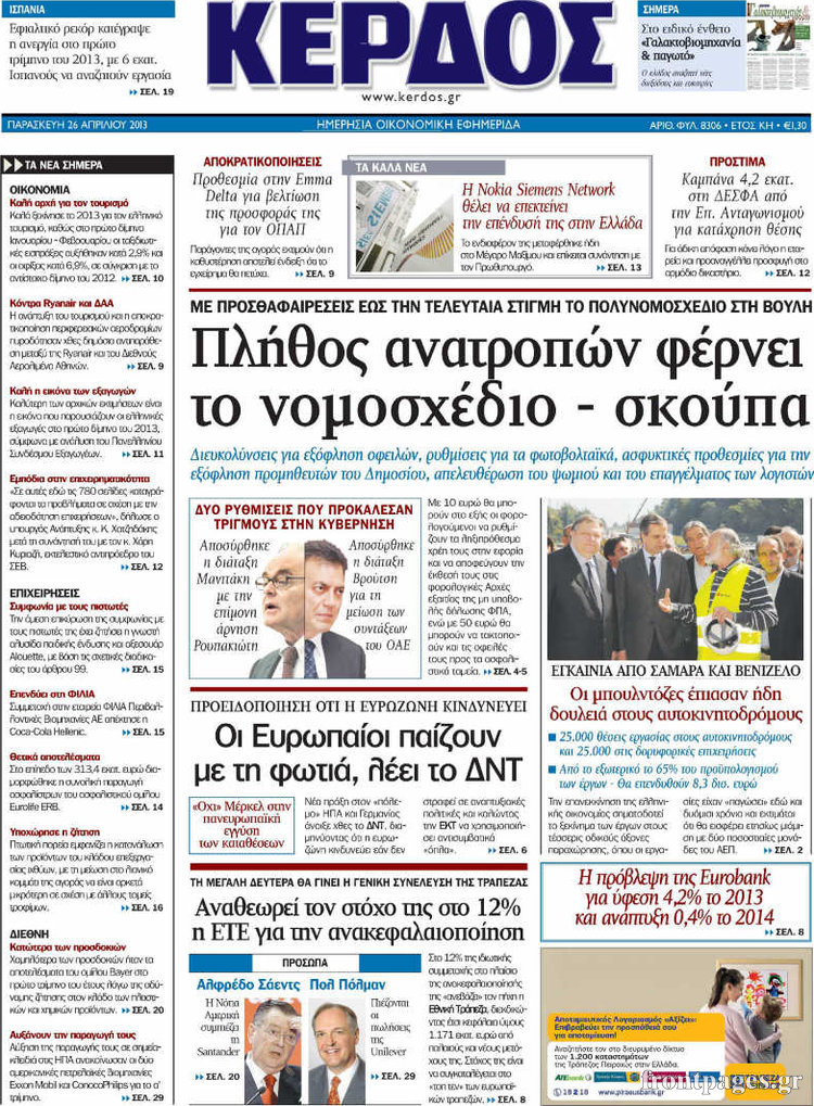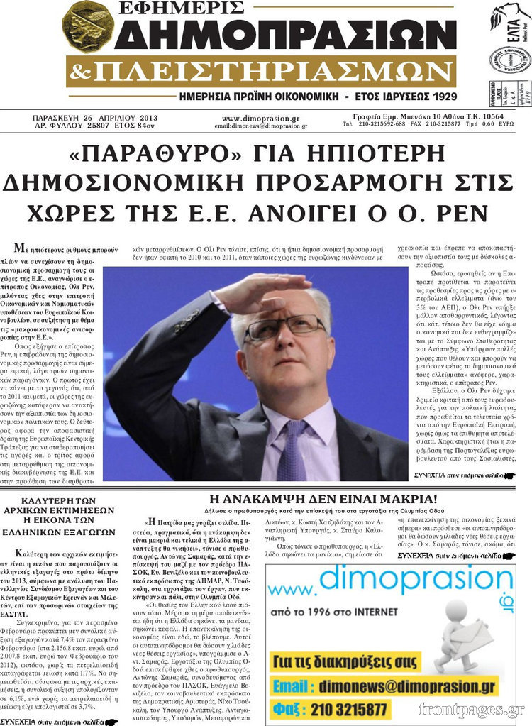 Οι οικονομικές εφημερίδες Enikos Newsroom 08:25, Παρασκευή 26 Απριλίου 2013 Media Οι οικονομικές εφημερίδες Τα σημερινά πρωτοσέλιδα των οικονομικών εφημερίδων. ΕΦΗΜΕΡΙΔΕΣ ΟΙΚΟΝΟΜΙΚΕΣ ΕΦΗΜΕΡΙΔΕΣ ΠΡΩΤΟΣΕΛΙΔΑ Μοιράσου το: σχολίασε κι εσύ (0 σχόλια) Ακολουθήστε το enikos.gr στο Google News και μάθετε πρώτοι όλες τις ειδήσεις Δείτε όλες τις τελευταίες ειδήσεις από την Ελλάδα και τον Κόσμο στο enikos.gr Ειδήσεις Ροή Ειδήσεων 4 ώρες πριν Μακελειό στο Σίδνεϊ: Πατέρας και γιος οι δράστες της τρομοκρατικής επίθεσης – Γιατί η Αυστραλία βάζει στο στόχαστρο το Ιράν 5 ώρες πριν Μακελειό στην Αυστραλία: «Πέρασαν οι σφαίρες πάνω από το αυτοκίνητο» – Συγκλονίζει η μαρτυρία Έλληνα που ζει στο Σίδνεϊ 3 ώρες πριν Όλα τα αιτήματα αγροτών, κτηνοτρόφων και μελισσοκόμων προς την κυβέρνηση – Παραμένουν στα μπλόκα και προαναγγέλλουν κλιμάκωση 8 ώρες πριν Τραγική εξέλιξη στο Αίγιο: Πέθανε ο 43χρονος που γρονθοκόπησε γιατρό στο νοσοκομείο 6 ώρες πριν Λακωνία: Βίντεο ντοκουμέντο από την επιχείρηση διάσωσης της 13χρονης που έπεσε σε πηγάδι – Ποια ήταν τα πρώτα λόγια της 5 ώρες πριν Ύπνος: 5 λόγοι για τους οποίους ξυπνάτε κουρασμένοι το πρωί κατά τη διάρκεια του χειμώνα 8 ώρες πριν Οι 7 βραδινές συνήθειες που μαρτυρούν ότι κάποιος υποφέρει από βαθιά μοναξιά, σύμφωνα με την ψυχολογία 16 ώρες πριν Τα 8 πράγματα που τα ευτυχισμένα ζευγάρια δεν κάνουν ποτέ μπροστά στα παιδιά τους 7 ώρες πριν Κουζίνα: Η καθημερινή συνήθεια των ανθρώπων που την διατηρούν πάντα καθαρή 19 λεπτά πριν Νότια Κορέα: Έφοδος της αστυνομίας στα γραφεία της Ενωτικής Εκκλησίας στη Σεούλ 35 λεπτά πριν Serie A: Ήττα σοκ για την Φιορεντίνα στο ντέρμπι των ουραγών, κορυφή για την Ίντερ, στο «κόλπο» ξανά η Γιούβε – Τα αποτελέσματα και η βαθμολογία 49 λεπτά πριν Λίβανος: Οι IDF ανέφεραν ότι σκότωσαν τρία μέλη της Χεζμπολάχ 1 ώρα πριν Ρωσία: Στο στόχαστρο της Μόσχας η Deutsche Welle – «Δεν θα μας φιμώσουν», δηλώνει η Διεύθυνση 1 ώρα πριν Συγκίνησε η Ντορέττα Παπαδημητρίου: «Κλείνουν 11 χρόνια από όταν έφυγε από τη ζωή, ήταν πολύ ξαφνικό όπως έγινε και αυτό μας συσπείρωσε» ENIKOS NETWORK 8 κορυφαίες συμβουλές για άνδρες που θέλουν φλογερή σεξουαλική ζωή, σύμφωνα με ειδικό Baby botox: Ποια τα οφέλη και οι κίνδυνοι του να ξεκινήσει κάποιος τις ενέσεις πριν εμφανιστούν ρυτίδες Τέλος οι διώξεις για χρέη σε Εφορία και ΕΦΚΑ – Τι προβλέπει νέα διάταξη μετά την πτώχευση Υπουργείο Αγροτικής Ανάπτυξης: Ενισχύσεις de minimis ύψους 2,1 εκατ. ευρώ – Οι δικαιούχοι Σύγχρονος Νοστράδαμος: Προειδοποιεί για «μεγάλο γεγονός» τους επόμενους μήνες που θα συγκλονίσει τη Βρετανία και τον κόσμο Τεστ παρατηρητικότητας: Μπορείτε να βρείτε τις 3 διαφορές στις εικόνες με έναν πιγκουίνο σε 14 δευτερόλεπτα περισσότερα 21:34 , Κυριακή 14 Δεκεμβρίου 2025 Ο Δικαστής: Η Λέττα είναι αποφασισμένη να αποκαλύψει την αλήθεια για το τροχαίο, απόψε στις 21:45 στον ΑΝΤ1 Ραγδαίες οι εξελίξεις στο νέο επεισόδιο της σειράς “Ο Δικαστής” απόψε στις 21:45 σ... 17:38 , Κυριακή 14 Δεκεμβρίου 2025 Τηλεθέαση (13/12): Τα ποσοστά για το βράδυ του Σαββάτου Η «μάχη» της prime time για την τηλεθέαση, συνεχίστηκε δυναμικά το βράδυ του Σαββάτου (13/12).... 16:32 , Κυριακή 14 Δεκεμβρίου 2025 Τηλεθέαση (13/12): Πώς κινήθηκαν οι εκπομπές στην πρωινή ζώνη το Σάββατο Με αμείωτη ένταση συνεχίστηκε η μάχη για την τηλεθέαση στην πρωινή ζώνη των τηλεοπτικών καναλι... 15:07 , Κυριακή 14 Δεκεμβρίου 2025 IQ160: Η Μαρίνα στέλνει το φούτερ του Τηλέμαχου για το τεστ πατρότητας Η Πηνελόπη αποφ