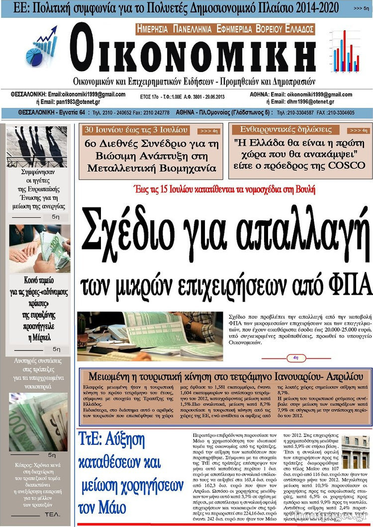 Οι oικονομικές εφημερίδες Enikos Newsroom 08:50, Σάββατο 29 Ιουνίου 2013 Media Οι oικονομικές εφημερίδες Διαβάστε τα πρωτοσέλιδα των οικονομικών εφημερίδων ΕΦΗΜΕΡΙΔΕΣ ΟΙΚΟΝΟΜΙΚΕΣ ΕΦΗΜΕΡΙΔΕΣ ΠΡΩΤΟΣΕΛΙΔΑ Μοιράσου το: σχολίασε κι εσύ (0 σχόλια) Ακολουθήστε το enikos.gr στο Google News και μάθετε πρώτοι όλες τις ειδήσεις Δείτε όλες τις τελευταίες ειδήσεις από την Ελλάδα και τον Κόσμο στο enikos.gr Ειδήσεις Ροή Ειδήσεων 2 ώρες πριν Σίδνεϊ: Βίντεο με ηλικιωμένο ζευγάρι που όρμησε για να σταματήσει τον έναν δράστη – Συγκλονιστικές μαρτυρίες για τους «ήρωες μέχρι τέλους» 19 λεπτά πριν Κατρίνης: «Ο μικρός μου γιος οδηγούσε χωρίς δίπλωμα, πράξη αδικαιολόγητη και παράνομη – Ο νόμος ισχύει για όλους» 3 ώρες πριν Κυψέλη: Υπό κατάληψη το σχολείο που η 16χρονη μαχαίρωσε συμμαθήτριά της – Την είχαν διώξει από προηγούμενο 15 λεπτά πριν Τσιάρας: Καλούμε τους αγρότες να έρθουν να συζητήσουμε για την επίλυση του θέματος 2 ώρες πριν «Το θαύμα των Χριστουγέννων»: Σκύλος που εξαφανίστηκε το 2021 βρέθηκε σε καταφύγιο ζώων σε απόσταση 3.200 χιλιομέτρων – ΒΙΝΤΕΟ 1 ώρα πριν Τέλος η μοναξιά για 3 ζώδια μετά τις 16 Δεκεμβρίου – «Ξαναβρίσκετε τον εαυτό σας» 5 ώρες πριν Οπτική ψευδαίσθηση: Μόνο 1 στους 10 ανθρώπους θα βρει το κόκκινο αυγό σε 7 δευτερόλεπτα 3 ώρες πριν Ανακαλύφθηκε περίτεχνη μαρμάρινη μπανιέρα που επαναχρησιμοποιήθηκε ως κρήνη 2 ώρες πριν Η πεθερά της την κατηγορεί πως δεν την ταΐζει σωστά – «Δεν παραπονιέται όμως στον γιο της» 4 λεπτά πριν Καινούργιου: «Με την εγκυμοσύνη προς το παρόν ξεχνάω, δεν βλέπω, δεν ακούω…» 8 λεπτά πριν ΕΕ: Η Κομισιόν παρουσιάζει σήμερα σχέδιο για την αντιμετώπιση της στεγαστικής κρίσης – Προτείνει πλαφόν στα Airbnb 14 λεπτά πριν Ντόναλντ Τραμπ Τζούνιορ: Αρραβωνιάστηκε για τρίτη φορά – «Εκλεκτή» της καρδιάς του η κοσμική Μπετίνα Άντερσον 15 λεπτά πριν Τσιάρας: Καλούμε τους αγρότες να έρθουν να συζητήσουμε για την επίλυση του θέματος 19 λεπτά πριν ΟΠΕΚΕΠΕ – Κρήτη: Ενώπιον του Ευρωπαίου ανακριτή οι 8 από τους 16 συλληφθέντες – Αναζητούνται κι άλλοι εμπλεκόμενοι ENIKOS NETWORK Οι ρίζες της άνοιας ίσως βρίσκονται στην παιδική ηλικία – Τι έδειξαν πρόσφατες μελέτες Όμιλος ΠΡΟΣΥΦΑΠΕ: Επιστρέφει στην κοινωνία τμήμα της υπεραξίας που παράγει Τα μυστικά για τις μεταβιβάσεις ακινήτων – Αναλυτικός οδηγός Προϋπολογισμός 2026: Η ομιλία Μητσοτάκη στη Βουλή- Τι θα πει για το αγροτικό, το στεγαστικό και το πακέτο μέτρων του 2026 Σύγχρονος Νοστράδαμος: Προειδοποιεί για «μεγάλο γεγονός» τους επόμενους μήνες που θα συγκλονίσει τη Βρετανία και τον κόσμο Τεστ παρατηρητικότητας: Μπορείτε να βρείτε τις 3 διαφορές στις εικόνες με έναν πιγκουίνο σε 14 δευτερόλεπτα περισσότερα 09:58 , Τρίτη 16 Δεκεμβρίου 2025 LIVE – Ακούστε την εκπομπή του Νίκου Χατζηνικολάου 16/12/2025 Ακούστε την εκπομπή του Νίκου Χατζηνικολάου, στον Realfm 97,8. Ακούστε LIVE εδώ 09:26 , Τρίτη 16 Δεκεμβρίου 2025 Τηλεθέαση (15/12): Τα νούμερα για την prime time – Ποιες σειρές ξεχώρισαν Ξεκάθαρη πρωτιά στην τηλεθέαση κατέκτησε η σειρά «Μια νύχτα μόνο», η οποία βρέθηκε στην κορυφή... 08:00 , Τρίτη 16 Δεκεμβρίου 2025 Την Κυριακή με τη Realnews: Δωροεπιταγή 10€ Δωροεπιταγή αξίας 10€ για αγορές άνω των 60€ από τα πολυκαταστήματα FactoryOutlet H προσφορά ι... 05:48 , Τρίτη 16 Δεκεμβρίου 2025 Οι οικονομικές εφημερίδες 16/12/2025 Διαβάστε τα πρωτοσέλιδα από τις οικονομικές εφημερίδες, σήμερα 16/12/2025. ΤΕΛΕΥΤΑΙΕΣ ΕΙΔΗΣΕΙΣ 4 λεπτά πριν Καινούργιου: «Με την εγκυμοσύνη προς το παρόν ξεχνάω,... 8 λεπτά πριν ΕΕ: Η