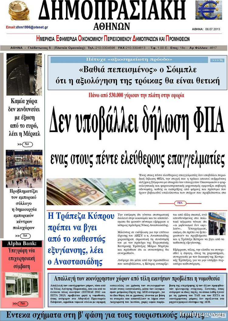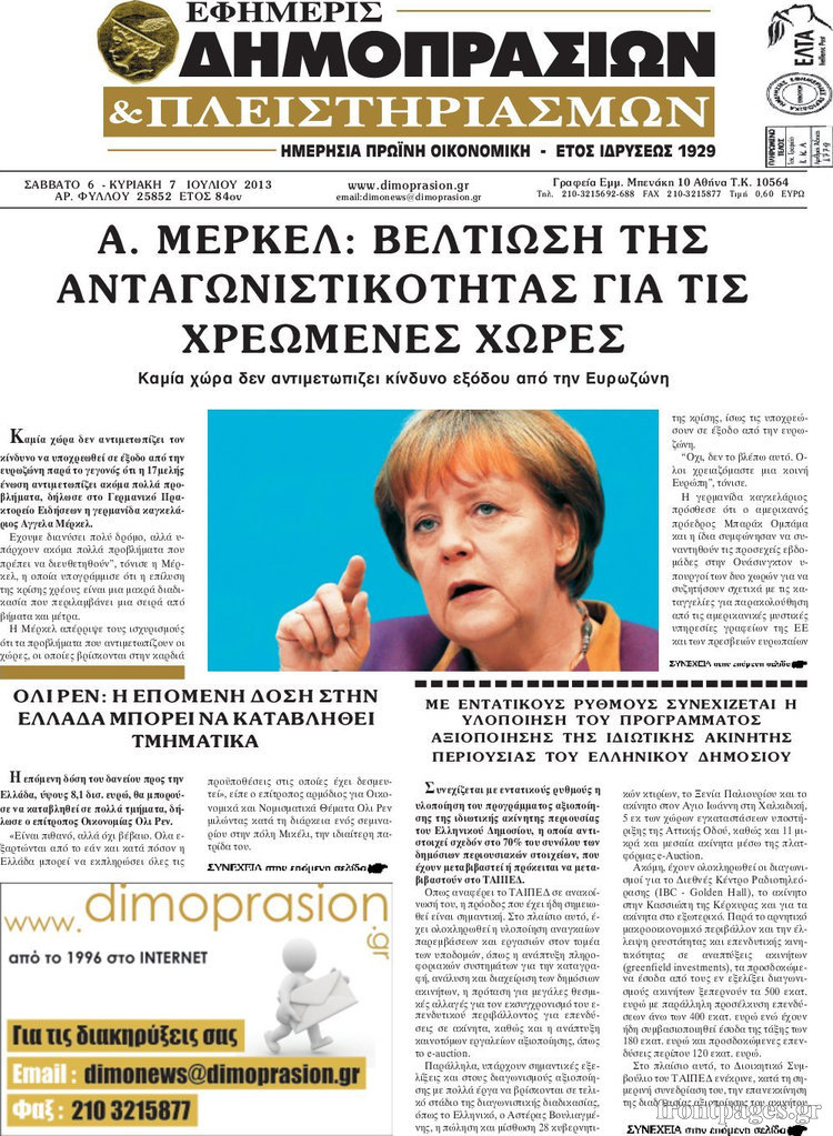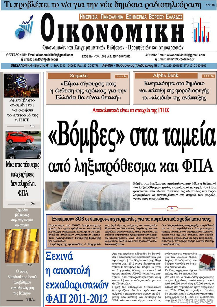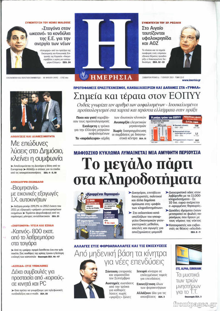 Οι oικονομικές εφημερίδες Enikos Newsroom 08:28, Σάββατο 06 Ιουλίου 2013 Media Οι oικονομικές εφημερίδες Διαβάστε τα πρωτοσέλιδα των οικονομικών εφημερίδων: ΕΦΗΜΕΡΙΔΕΣ ΟΙΚΟΝΟΜΙΚΕΣ ΕΦΗΜΕΡΙΔΕΣ ΠΡΩΤΟΣΕΛΙΔΑ Μοιράσου το: σχολίασε κι εσύ (0 σχόλια) Ακολουθήστε το enikos.gr στο Google News και μάθετε πρώτοι όλες τις ειδήσεις Δείτε όλες τις τελευταίες ειδήσεις από την Ελλάδα και τον Κόσμο στο enikos.gr Ειδήσεις Ροή Ειδήσεων 3 ώρες πριν Εκτός ευρωομάδας ΣΥΡΙΖΑ ο Νίκος Παππάς μετά την επίθεση στον δημοσιογράφο Νίκο Γιαννόπουλο – Η μήνυση και οι νέες δηλώσεις 4 ώρες πριν «Αγριεύουν» οι αγρότες: «Δεν συντρέχει λόγος συνάντησης με τον πρωθυπουργό» – Ώρα αποφάσεων στη σύσκεψη της Πέμπτης 4 ώρες πριν Κυψέλη: Χωρίς την οικογένειά της δίπλα της απολογήθηκε η 16χρονη – «Της είχε επιτεθεί κάποιος για να την βιάσει, φοβήθηκε και κυκλοφορούσε με μαχαίρι» 3 ώρες πριν Politico: Το πρόβλημα της Ευρώπης δεν είναι το Βέλγιο αλλά ο Ντόναλντ Τραμπ 5 ώρες πριν Αλεξανδρούπολη: Πολυοργανική ανεπάρκεια λόγω υποσιτισμού η αιτία θανάτου του 3χρονου αγοριού 3 ώρες πριν Μυστήριο με τεράστιες κυκλικές πέτρες 200 κιλών – Ανακαλύφθηκαν τυχαία κατά τη διάρκεια οδικών έργων και κανείς δεν ξέρει από πού προέρχονται 4 ώρες πριν Ύπνος: Ειδικός εξηγεί τον πραγματικό λόγο που ξυπνάτε στις 4 τα ξημερώματα – Ο ρόλος των ορμονών και του κιρκάδιου ρυθμού 5 ώρες πριν Αριθμολογία: Οι άνθρωποι που έχουν γεννηθεί αυτές τις 4 ημερομηνίες, είναι τρυφεροί και αγαπούν ανιδιοτελώς 17 ώρες πριν 20 χρόνια τα Χριστούγεννα ξεκινούν στα Public με μεγάλη ποικιλία σε δώρα! 13 λεπτά πριν Ρωσία: Ουκρανικές δυνάμεις έπληξαν πλοίο στο λιμάνι του Ροστόφ – Αναφορές για θύματα 28 λεπτά πριν Βρυξέλλες: Νυχτερινό… μπλόκο αγροτών μπροστά από το κτίριο της Ευρωπαϊκής Επιτροπής – Πάνω από 100 τρακτέρ απέκλεισαν την λεωφόρο 44 λεπτά πριν Euroleague: Απρόσμενη ήττα για την Μονακό του Βασίλη Σπανούλη – Η βαθμολογία μετά το τέλος της 16ης αγωνιστικής 59 λεπτά πριν Μουντιάλ 2026: Η νέα ταξιδιωτική απαγόρευση του Ντόναλντ Τραμπ πλήττει (και) τους οπαδούς Σενεγάλης – Ακτής Ελεφαντοστού 1 ώρα πριν Κυριάκος Μητσοτάκης: Στις Βρυξέλλες για την Σύνοδο Κορυφής ΕΕ και Δυτικών Βαλκανίων – Δείτε φωτογραφίες ENIKOS NETWORK Αϋπνία: Το κόλπο που θα σας βοηθήσει να κοιμηθείτε απόψε – Είναι απλό και έχει αποτέλεσμα 2,6 εκατομμύρια πολίτες έχουν ήδη εμβολιαστεί κατά της γρίπης ΕΛΣΤΑΤ: Τι δείχνουν τα νέα στοιχεία για τις ηλεκτρονικές παραγγελίες των επιχειρήσεων ΚΕΠΕ: Οι 3 διακριτές συμβολές των ΜμΕ και της μεταποίησης στην ελληνική οικονομία Χαρτογραφώντας το «σημείο χωρίς επιστροφή»: Για πρώτη φορά αποκαλύπτεται με λεπτομέρεια το ακανθώδες όριο της ατμόσφαιρας τ... Η Google καταργεί τη λειτουργία «dark web report» – Πώς θα μπορούν οι χρήστες να διαγράφουν τα δεδομένα τους περισσότερα 22:24 , Τετάρτη 17 Δεκεμβρίου 2025 Το Σπίτι Δίπλα Στο Ποτάμι: Σε κίνδυνο η υγεία του Απόστολου – Τι θα δούμε απόψε “Το Σπίτι Δίπλα στο Ποτάμι” ξετυλίγει το νήμα της ζωής των πέντε αδελφών με καταισ... 21:14 , Τετάρτη 17 Δεκεμβρίου 2025 Παιχνίδια Εκδίκησης: Θα καταφέρει ο Χρήστος να κλονίσει την εμπιστοσύνη της Μάγιας απέναντι στον Άγη; Τα «Παιχνίδια Εκδίκησης» έρχονται απόψε στις 22:30, στον Αντ1, με το τελευταίο επεισόδιο της χ... 20:57 , Τετάρτη 17 Δεκεμβρίου 2025 Άγιος Έρωτας: Η Χλόη καταθέτει εναντίον του πατέρα της και ο Χάρης αποκαλύπτει στον Κλεάνθη ότι δεν είναι ο βιολογικός του πατέρας. Γεμάτο αποκαλύψεις είναι το νέο επεισόδι