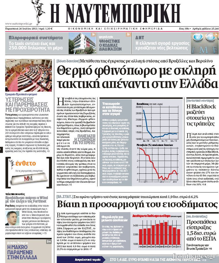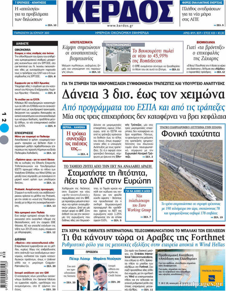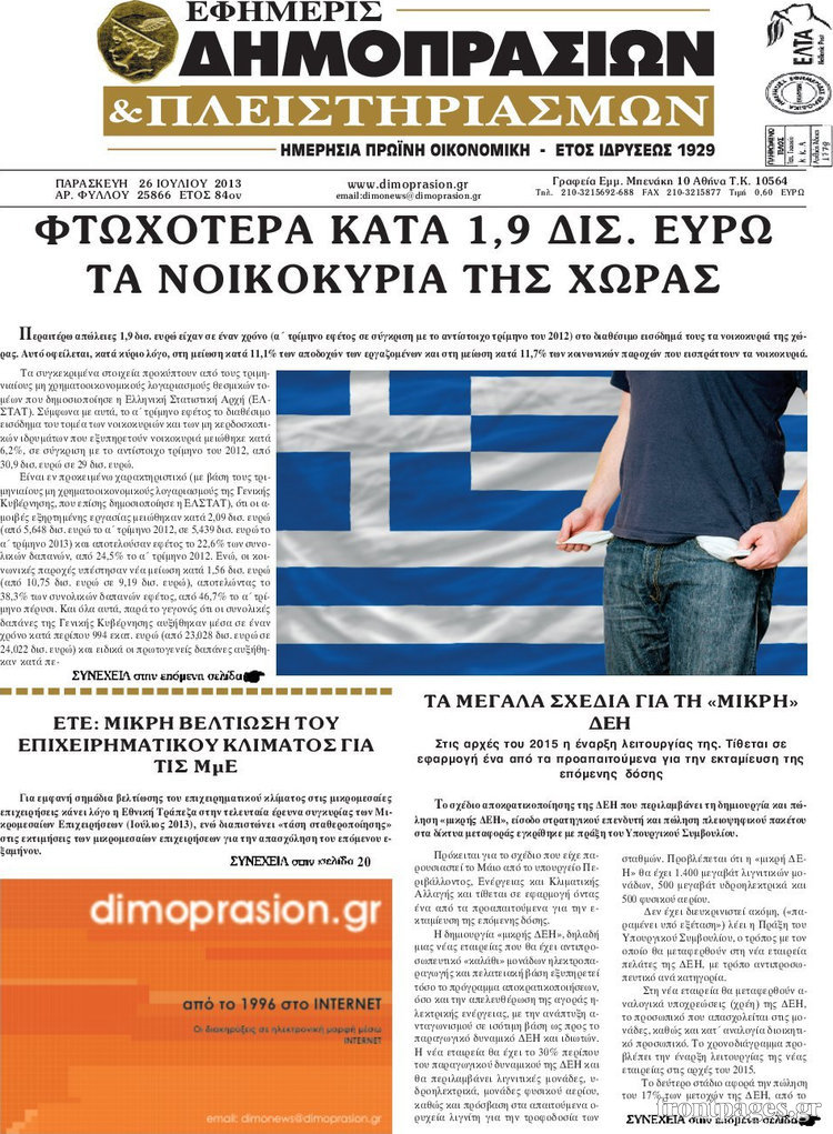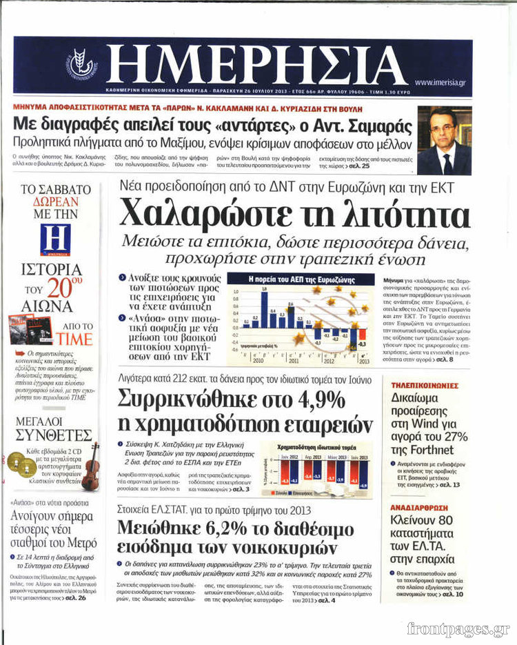 Οι oικονομικές εφημερίδες Enikos Newsroom 08:51, Παρασκευή 26 Ιουλίου 2013 Media Οι oικονομικές εφημερίδες Διαβάστε τα πρωτοσέλιδα των οικονομικών εφημερίδων. ΕΦΗΜΕΡΙΔΑ ΠΡΩΤΟΣΕΛΙΔΑ Μοιράσου το: σχολίασε κι εσύ (0 σχόλια) Ακολουθήστε το enikos.gr στο Google News και μάθετε πρώτοι όλες τις ειδήσεις Δείτε όλες τις τελευταίες ειδήσεις από την Ελλάδα και τον Κόσμο στο enikos.gr Ειδήσεις Ροή Ειδήσεων 3 ώρες πριν ΣΥΡΙΖΑ: Διαγράφεται ο ευρωβουλευτής Νίκος Παππάς μετά την μήνυση δημοσιογράφου για ξυλοδαρμό 8 λεπτά πριν Δημοσκόπηση Opinion Poll: Στις 12,9 μονάδες η διαφορά ΝΔ-ΠΑΣΟΚ – Τι λένε οι πολίτες για αγρότες, ΟΠΕΚΕΠΕ, Τσίπρα και Σαμαρά 2 ώρες πριν ΟΠΕΚΕΠΕ: Ελεύθερες με όρους η σύζυγος και η αδελφή του φερόμενου αρχηγού – Τι υποστήριξαν 4 ώρες πριν Πώς στήθηκε η επιχείρηση «Ίπαλλος» που οδήγησε στη σύλληψη του «Έλληνα Εσκομπάρ» – «Ο πόλεμος ενάντια στους εμπόρους ναρκωτικών θα συνεχιστεί» 4 ώρες πριν Κυψέλη: Στη φυλακή η 16χρονη που μαχαίρωσε συμμαθήτριά της 1 ώρα πριν Οι άνθρωποι που θυμούνται τα όνειρά τους, συνήθως μοιράζονται αυτά τα 6 σπάνια χαρακτηριστικά 4 ώρες πριν Τα 3 ζώδια που θα δουν τη ζωή τους να αλλάζει ριζικά το 2026 – «Όλα γίνονται καλύτερα σταδιακά» 5 ώρες πριν Ο σπάνιος σεισμός που έλυσε τα χέρια των επιστημόνων – Αποκάλυψε ακριβώς όσα αναζητούσαν 11 ώρες πριν 20 χρόνια τα Χριστούγεννα ξεκινούν στα Public με μεγάλη ποικιλία σε δώρα! 5 λεπτά πριν Στη ΜΕΘ του νοσοκομείου Ζακύνθου ο Μητροπολίτης Δωδώνης 8 λεπτά πριν Δημοσκόπηση Opinion Poll: Στις 12,9 μονάδες η διαφορά ΝΔ-ΠΑΣΟΚ – Τι λένε οι πολίτες για αγρότες, ΟΠΕΚΕΠΕ, Τσίπρα και Σαμαρά 15 λεπτά πριν ΠΑΣΟΚ: Καταδικάζουμε τον ξυλοδαρμό και την τραμπούκικη συμπεριφορά του ευρωβουλευτή Νίκου Παππά σε βάρος του δημοσιογράφου Νίκου Γιαννόπουλου 20 λεπτά πριν Εξεταστική για ΟΠΕΚΕΠΕ – Σκέρτσος: Διαχρονικά τα θέματα του οργανισμού – Δεν έγινε καμία αναφορά μου σε ποινικές διαδικασίες 26 λεπτά πριν Συγκλονιστικό βίντεο: Τρόμος για τουρίστες που σώθηκαν την τελευταία στιγμή από λεωφορείο που κατρακυλούσε σε φαράγγι ENIKOS NETWORK Αϋπνία: Το κόλπο που θα σας βοηθήσει να κοιμηθείτε απόψε – Είναι απλό και έχει αποτέλεσμα 2,6 εκατομμύρια πολίτες έχουν ήδη εμβολιαστεί κατά της γρίπης Ελληνικά ομόλογα: Τι λέει η S&P Global Προκήρυξη ΑΣΕΠ για 4.276 μόνιμες προσλήψεις στο Δημόσιο: Βγήκαν τα προσωρινά αποτελέσματα – Ποιοι μπορούν να υποβάλουν ένσ... Χαρτογραφώντας το «σημείο χωρίς επιστροφή»: Για πρώτη φορά αποκαλύπτεται με λεπτομέρεια το ακανθώδες όριο της ατμόσφαιρας τ... Η Google καταργεί τη λειτουργία «dark web report» – Πώς θα μπορούν οι χρήστες να διαγράφουν τα δεδομένα τους περισσότερα 12:35 , Τετάρτη 17 Δεκεμβρίου 2025 Μίρκα Παπακωνσταντίνου: «Δεν ήμουν αισιόδοξη για τα νούμερα – Είμαι ρεαλίστρια» Στα γυρίσματα του εορταστικού επεισοδίου της αγαπημένης σειράς “Το Σόι Σου”, βρέθηκε η κάμερα ... 12:12 , Τετάρτη 17 Δεκεμβρίου 2025 Ακούστε την εκπομπή του Νίκου Χατζηνικολάου 17/12/2025 Ακούστε την εκπομπή του Νίκου Χατζηνικολάου στον ραδιοφωνικό σταθμό RealFm 97,8, την Τετάρτη 1... 11:35 , Τετάρτη 17 Δεκεμβρίου 2025 Home Alone: Το σπίτι της ταινίας θα ανακαινιστεί – Επιστροφή στην αισθητική της δεκαετίας του ’90 Οι νέοι ιδιοκτήτες του πραγματικού σπιτιού που παρουσιάζεται στην κλασική ταινία του 1990 «Hom... 11:25 , Τετάρτη 17 Δεκεμβρίου 2025 Grand Hotel: Απόψε το τελευταίο επεισόδιο της χρονιάς – Όλα τα μυστικά μένουν εδώ Το τελευταίο επεισόδιο της χρονιάς της σειράς «Grand Hotel» θα προβληθεί απόψε στις 21:00. Ο Ά