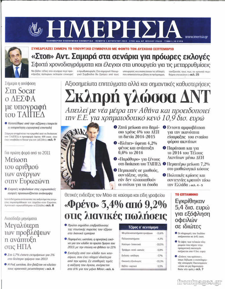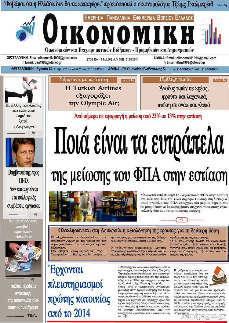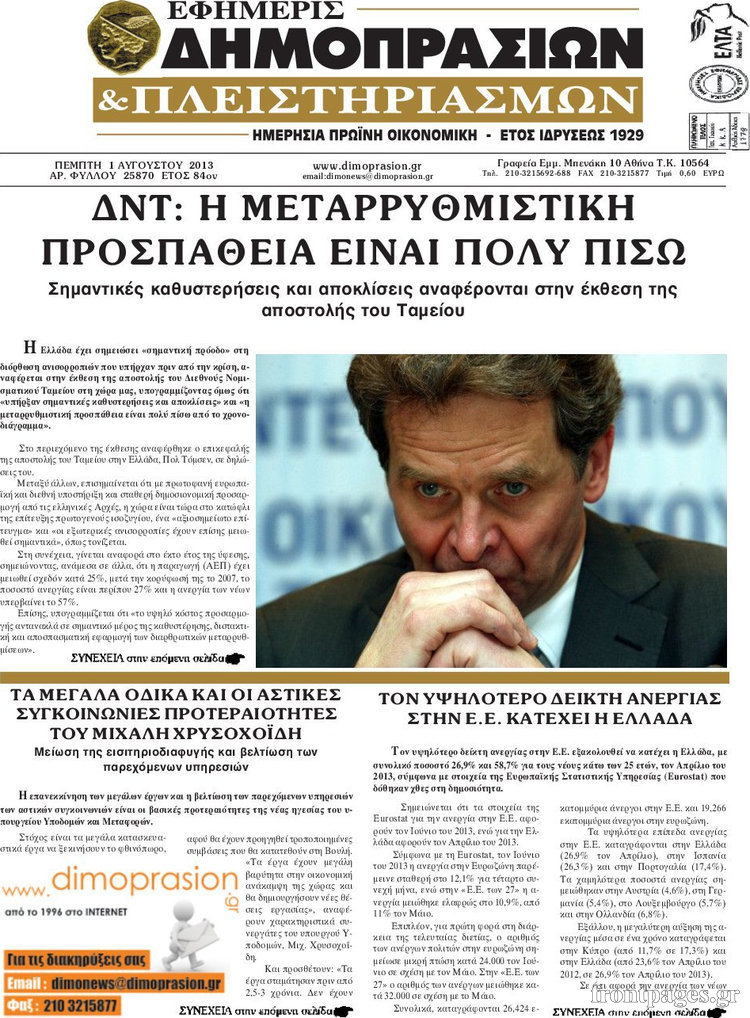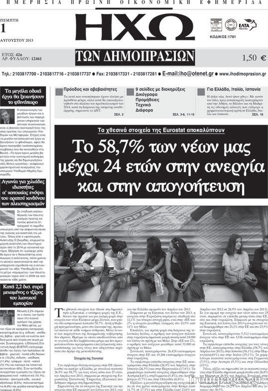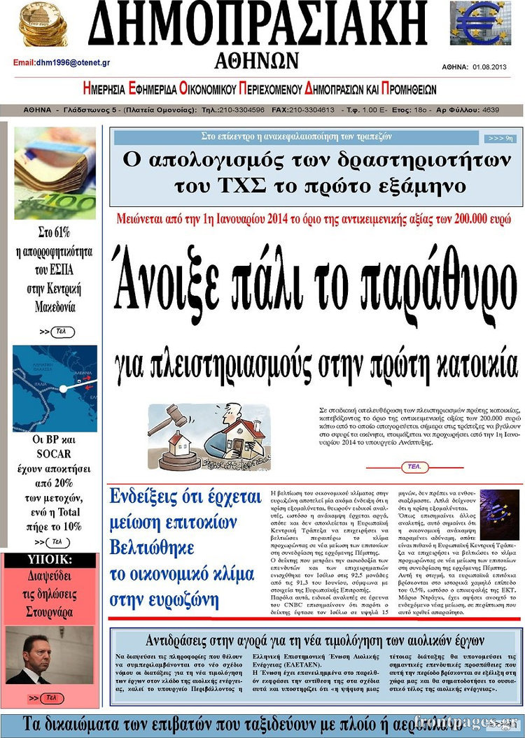 Οι οικονομικές εφημερίδες Enikos Newsroom 09:11, Πέμπτη 01 Αυγούστου 2013 Media Οι οικονομικές εφημερίδες ΕΦΗΜΕΡΙΔΕΣ ΟΙΚΟΝΟΜΙΚΕΣ ΕΦΗΜΕΡΙΔΕΣ Μοιράσου το: σχολίασε κι εσύ (0 σχόλια) Ακολουθήστε το enikos.gr στο Google News και μάθετε πρώτοι όλες τις ειδήσεις Δείτε όλες τις τελευταίες ειδήσεις από την Ελλάδα και τον Κόσμο στο enikos.gr Ειδήσεις Ροή Ειδήσεων 49 λεπτά πριν Πούτιν: «Ανοησίες» και «υστερίες» οι ισχυρισμοί της Ευρώπης για πιθανή σύγκρουση με τη Ρωσία – «Κάνουν πλύση εγκεφάλου» 5 ώρες πριν Έρευνα MRB: Η πρόθεση ψήφου και τα σημαντικότερα προβλήματα – Οι «λέξεις» που εκφράζουν τους πολίτες 2 ώρες πριν Αμοργός: «Θα προσπαθήσω να το κάνω κάθε μέρα» – Ποιος είναι ο αγρότης που έστησε μόνος του το πρώτο μπλόκο στο νησί 1 ώρα πριν Κυψέλη: Στον ανακριτή η 16χρονη που μαχαίρωσε την 14χρονη – «Είχα το μαχαίρι για προστασία – Έχω θέμα με τα νεύρα μου» 39 λεπτά πριν Συνάντηση Μητσοτάκη με την Κ.Ο. της ΝΔ: Οι αφίξεις των βουλευτών, τα γλυκά και τα «πηγαδάκια» 5 ώρες πριν Τα 4 ζώδια που ξαναβρίσκουν τον εαυτό τους – «Μπαίνετε επιτέλους στην ουσία των πραγμάτων» 6 ώρες πριν 20 χρόνια τα Χριστούγεννα ξεκινούν στα Public με μεγάλη ποικιλία σε δώρα! 4 ώρες πριν «Δεν είχα κλάψει από τότε που διαγνώστηκα με καρκίνο, ώσπου ένα τηλεφώνημα με έκανε να λυγίσω» – Η συγκλονιστική εξομολόγηση ενός άνδρα 3 ώρες πριν Τα 7 σπάνια χαρακτηριστικά που κάνουν κάποιους ανθρώπους ακαταμάχητους 4 λεπτά πριν Ο σπάνιος σεισμός που έλυσε τα χέρια των επιστημόνων – Αποκάλυψε ακριβώς όσα αναζητούσαν 9 λεπτά πριν Τζιτζικώστας από το Στρασβούργο: «Σανίδα σωτηρίας για την ευρωπαϊκή αυτοκινητοβιομηχανία η νέα δέσμη μέτρων που υιοθετήσαμε – Κινητήρες εσωτερικής καύσης και υβριδικά οχήματα και μετά το 2035» 12 λεπτά πριν Τροχαίο στην Αττική Οδό: Κλειστή η δεξιά λωρίδα μετά την έξοδο Μαραθώνος στο ρεύμα προς Αεροδρόμιο 14 λεπτά πριν Βόλος: Καθηγητής κλείδωσε μαθητές στην τάξη για να κάνει μάθημα – Οι καταγγελίες 19 λεπτά πριν Debate Καιρίδη – Γιαννούλη στον Realfm 97,8 για τη συζήτηση στη Βουλή, την ακρίβεια και τον πρωτογενή τομέα ENIKOS NETWORK 5 πράγματα που αποφεύγει γαστρεντερολόγος για να μειώσει τον κίνδυνο καρκίνου του εντέρου Ανησυχητική αύξηση της υπέρτασης στα παιδιά – Πώς θα τα προστατέψουμε; «IRIS Παντού»: Στην κορυφή της Ευρώπης η Ελλάδα με 120 εκατ. ευρώ συναλλαγές το 2025 – Η σύγκριση με τις άλλες χώρες της Ευ... Αδειοδωρόσημο Χριστουγέννων 2025: Πότε γίνεται η καταβολή του και σε ποιους Σύγχρονος Νοστράδαμος: Προειδοποιεί για «μεγάλο γεγονός» τους επόμενους μήνες που θα συγκλονίσει τη Βρετανία και τον κόσμο Τεστ παρατηρητικότητας: Μπορείτε να βρείτε τις 3 διαφορές στις εικόνες με έναν πιγκουίνο σε 14 δευτερόλεπτα περισσότερα 12:35 , Τετάρτη 17 Δεκεμβρίου 2025 Μίρκα Παπακωνσταντίνου: «Δεν ήμουν αισιόδοξη για τα νούμερα – Είμαι ρεαλίστρια» Στα γυρίσματα του εορταστικού επεισοδίου της αγαπημένης σειράς “Το Σόι Σου”, βρέθηκε η κάμερα ... 12:12 , Τετάρτη 17 Δεκεμβρίου 2025 Ακούστε την εκπομπή του Νίκου Χατζηνικολάου 17/12/2025 Ακούστε την εκπομπή του Νίκου Χατζηνικολάου στον ραδιοφωνικό σταθμό RealFm 97,8, την Τετάρτη 1... 11:35 , Τετάρτη 17 Δεκεμβρίου 2025 Home Alone: Το σπίτι της ταινίας θα ανακαινιστεί – Επιστροφή στην αισθητική της δεκαετίας του ’90 Οι νέοι ιδιοκτήτες του πραγματικού σπιτιού που παρουσιάζεται στην κλασική ταινία του 1990 «Hom... 11:25 , Τετάρτη 17 Δεκεμβρίου 2025 Grand Hotel: Απόψε το τελευταίο επεισόδιο της χρονιάς – Όλα τα μυστικά μένουν εδώ Το τελ