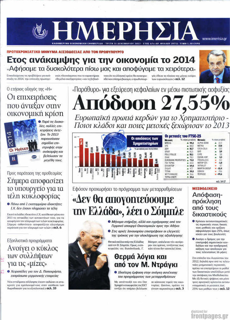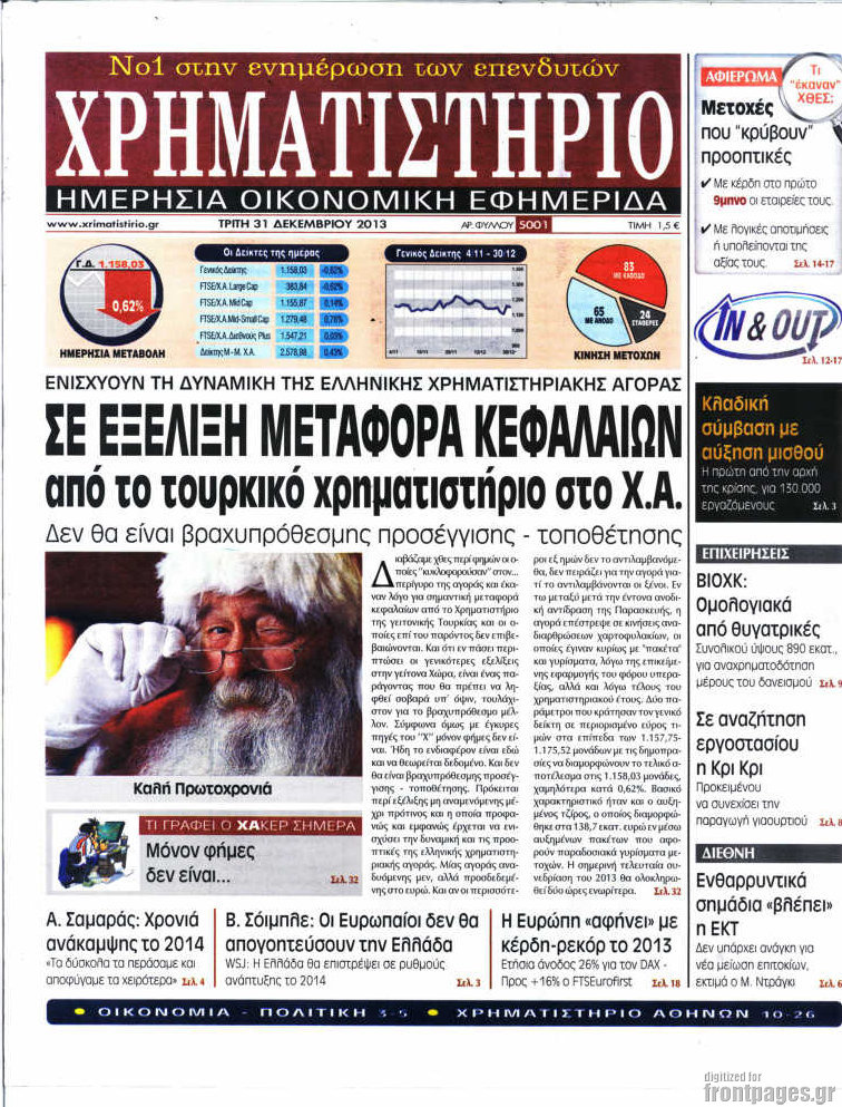 Οι οικονομικές εφημερίδες Enikos Newsroom 09:13, Τρίτη 31 Δεκεμβρίου 2013 Media Οι οικονομικές εφημερίδες ΕΦΗΜΕΡΙΔΕΣ ΟΙΚΟΝΟΜΙΚΕΣ ΕΦΗΜΕΡΙΔΕΣ ΠΡΩΤΟΣΕΛΙΔΑ Μοιράσου το: σχολίασε κι εσύ (0 σχόλια) Ακολουθήστε το enikos.gr στο Google News και μάθετε πρώτοι όλες τις ειδήσεις Δείτε όλες τις τελευταίες ειδήσεις από την Ελλάδα και τον Κόσμο στο enikos.gr Ειδήσεις Ροή Ειδήσεων 3 ώρες πριν Ακίλα Σάλεχ: «Άκυρο» το τουρκολιβυκό μνημόνιο λέει ο πρόεδρος της λιβυκής Βουλής – Ανοίγει ο διάλογος με Ελλάδα, Αίγυπτο και Τουρκία 8 ώρες πριν Αγρότες: Την Τρίτη η απόφαση για διάλογο ή κλιμάκωση των κινητοποιήσεών τους – Πώς χαρακτηρίζουν τις ανακοινώσεις Τσιάρα και οι επόμενες κινήσεις 7 ώρες πριν Τραμπ για Ουκρανία: «Είμαστε πιο κοντά σε συμφωνία από ποτέ» – «Πολυεθνική δύναμη» προτείνουν οι Ευρωπαίοι 8 ώρες πριν Κυψέλη: Η 16χρονη που μαχαίρωσε την 14χρονη είχε συλληφθεί 3 φορές στο παρελθόν – Έβριζε καθηγητές, έβαζε φωτιές σε κάδους και εκβίαζε συμμαθητές της 7 ώρες πριν Τρομοκρατική επίθεση στο Σίδνεϊ: Θλίψη για τα 15 θύματα – Οργή στην εβραϊκή κοινότητα που προειδοποιούσε επί δύο χρόνια 7 ώρες πριν Επιστήμονες ίσως έλυσαν το μυστήριο γύρω από τα Χόμπιτ – Νέα έρευνα αποκαλύπτει πώς εξαφανίστηκαν 8 ώρες πριν Ύπνος: Η αρχαία μορφή άσκησης που αποδεικνύεται αποτελεσματική στην αντιμετώπιση της αϋπνίας, σύμφωνα με μελέτη 9 ώρες πριν Αριθμολογία: Ο τυχερός σας αριθμός, ανάλογα με τον μήνα γέννησής σας 10 ώρες πριν Πώς να μην μαραίνονται γρήγορα τα κομμένα λουλούδια: Το λάθος στην τοποθέτηση του βάζου που πρέπει να αποφεύγετε 5 λεπτά πριν Οπτική ψευδαίσθηση: Μόνο 1 στους 10 ανθρώπους θα βρει το κόκκινο αυγό σε 7 δευτερόλεπτα 11 λεπτά πριν Δώρο Χριστουγέννων 2025: Ποιοι εργαζόμενοι το δικαιούνται – Η online εφαρμογή της ΓΣΕΕ για να το υπολογίσετε 19 λεπτά πριν Υψηλή χοληστερίνη: Γιατρός αποκαλύπτει δύο τρόπους για να την μειώσετε χωρίς φαρμακευτική αγωγή 27 λεπτά πριν Σαν σήμερα 16 Δεκεμβρίου: Τα σημαντικότερα γεγονότα της ημέρας 31 λεπτά πριν Οι οικονομικές εφημερίδες 16/12/2025 ENIKOS NETWORK Πότε το χρόνιο ροχαλητό να αποτελέσει ένδειξη κινδύνου για την καρδιά; Τι λένε οι ειδικοί Μάριος Θεμιστοκλέους: Το ΕΣΥ ενισχύεται, εκσυγχρονίζεται, αλλάζει ΕΒΕΠ για αγροτικές κινητοποιήσεις: Κάθε επιπλέον εβδομάδα προσθέτει περίπου 200 εκατ. ευρώ ζημιά Τι προβλέπει το νομοσχέδιο του υπουργείου Εθνικής Άμυνας – Oι αλλαγές στους μισθούς Σύγχρονος Νοστράδαμος: Προειδοποιεί για «μεγάλο γεγονός» τους επόμενους μήνες που θα συγκλονίσει τη Βρετανία και τον κόσμο Τεστ παρατηρητικότητας: Μπορείτε να βρείτε τις 3 διαφορές στις εικόνες με έναν πιγκουίνο σε 14 δευτερόλεπτα περισσότερα 05:48 , Τρίτη 16 Δεκεμβρίου 2025 Οι οικονομικές εφημερίδες 16/12/2025 Διαβάστε τα πρωτοσέλιδα από τις οικονομικές εφημερίδες, σήμερα 16/12/2025. 05:43 , Τρίτη 16 Δεκεμβρίου 2025 Οι αθλητικές εφημερίδες 16/12/2025 Διαβάστε τα πρωτοσέλιδα από τις αθλητικές εφημερίδες, σήμερα 16/12/2025. 05:38 , Τρίτη 16 Δεκεμβρίου 2025 Οι πολιτικές εφημερίδες 16/12/2025 Διαβάστε τα πρωτοσέλιδα από τις πολιτικές εφημερίδες, σήμερα 16/12/2025. 21:35 , Δευτέρα 15 Δεκεμβρίου 2025 Το Σπίτι Δίπλα Στο Ποτάμι: Η Ιουλία και ο Φωκάς μετακομίζουν στη Ρόδο – Δύο νέοι χαρακτήρες μπαίνουν στη σειρά Δύο νέοι, κομβικοί χαρακτήρες κάνουν την εμφάνισή τους αυτή την εβδομάδα στην αγαπημένη σειρά ... ΤΕΛΕΥΤΑΙΕΣ ΕΙΔΗΣΕΙΣ 5 λεπτά πριν Οπτική ψευδαίσθηση: Μόνο 1 στους 10 ανθρώπους θα βρει το... 11 λεπτά πριν Δώρο Χριστουγέννων 2025: Ποιοι εργαζόμεν