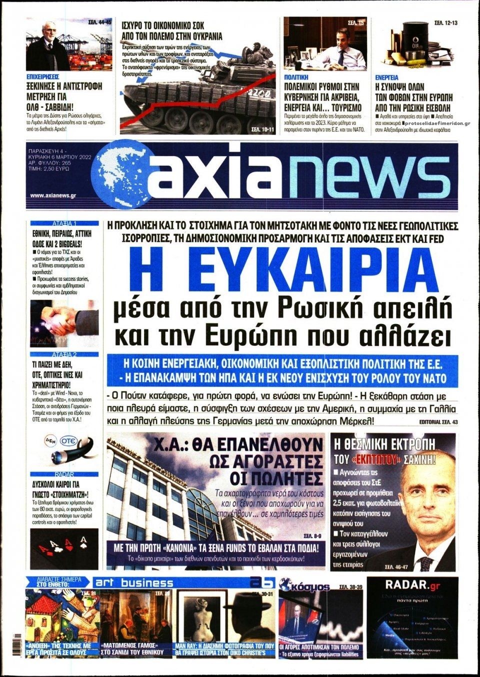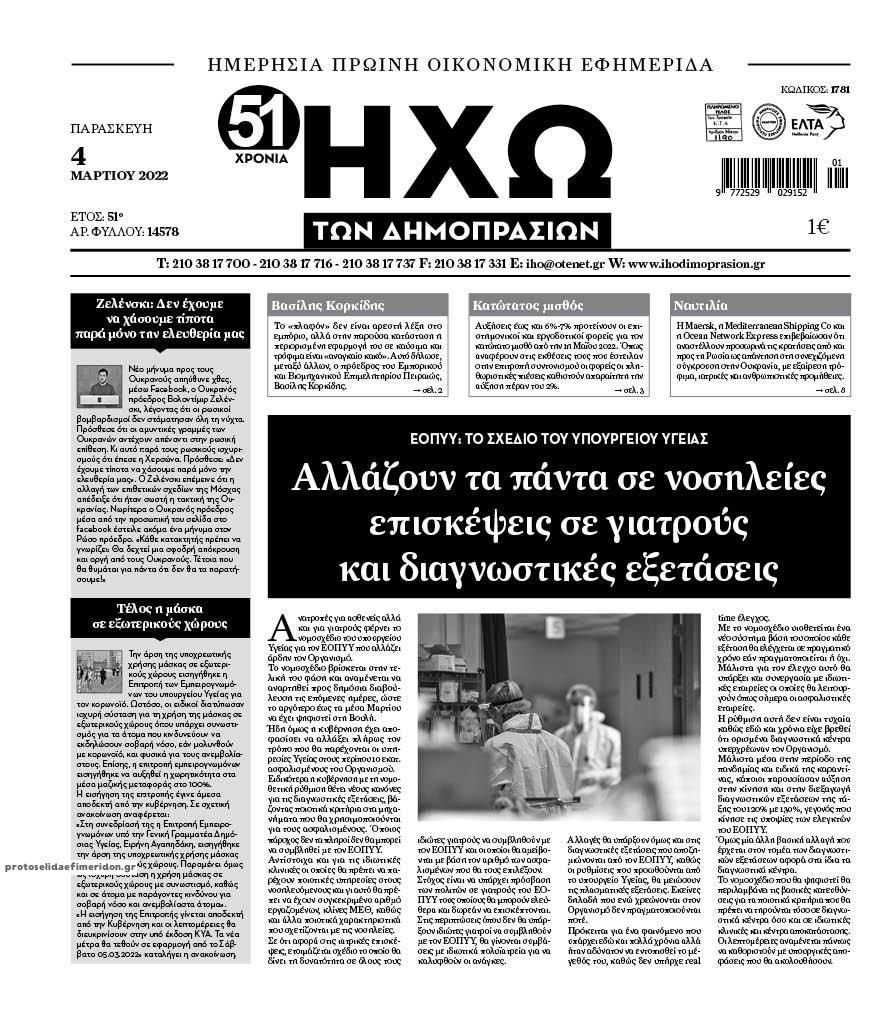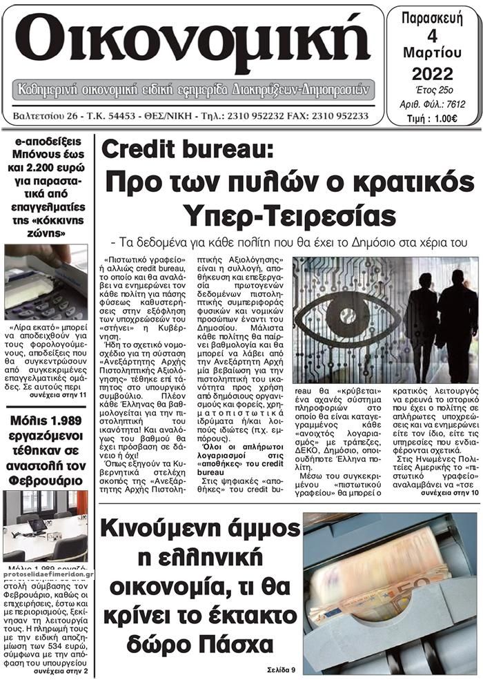 Οι οικονομικές εφημερίδες 4/3/2022 Διονύσης Νίκκας 06:44, Παρασκευή 04 Μαρτίου 2022 Media Διαβάστε τα πρωτοσέλιδα από τις οικονομικές εφημερίδες… ΟΙΚΟΝΟΜΙΚΕΣ ΕΦΗΜΕΡΙΔΕΣ Μοιράσου το: Ζελένσκι: “Η Ρωσία ήθελε να επαναληφθεί η καταστροφή στο Τσερνόμπιλ” Ουκρανία: Συνομιλία Μπάιντεν-Ζελένσκι για την πυρκαγιά στη Ζαπορίζια Ο Αλέξης Τσίπρας στο “Ενώπιος Ενωπίω” – ΒΙΝΤΕΟ σχολίασε κι εσύ (0 σχόλια) Ακολουθήστε το enikos.gr στο Google News και μάθετε πρώτοι όλες τις ειδήσεις Δείτε όλες τις τελευταίες ειδήσεις από την Ελλάδα και τον Κόσμο στο enikos.gr Ειδήσεις Ροή Ειδήσεων 2 ώρες πριν Νίκος Παππάς: Το παρασκήνιο της αποπομπής του – Οι μπουνιές, τα μηνύματα μετά την επίθεση και η διαγραφή από τον ΣΥΡΙΖΑ 45 λεπτά πριν Οι αγρότες δεν φεύγουν από τα μπλόκα: Πολύωροι αποκλεισμοί στα τελωνεία Ευζώνων, Νίκης, Προμαχώνα και Εξοχής 1 ώρα πριν Ντόναλντ Τραμπ: Το διάγγελμα, η πτώση στις δημοσκοπήσεις και το… χάος που κληρονόμησε από τον Μπάιντεν 2 ώρες πριν Άστατος ο καιρός τα Χριστούγεννα: Βαρομετρικό χαμηλό από τον κόλπο της Σύρτης «ξεκλειδώνει» κακοκαιρίες – Πώς θα εξελιχθεί έως την Πρωτοχρονιά 53 λεπτά πριν Μάριο Πινέιδα: Ο αμυντικός του Ισημερινού σκοτώθηκε σε ένοπλη επίθεση στη Γκουαγιακίλ 36 λεπτά πριν Τα 4 ζώδια που λαμβάνουν ένα ισχυρό σημάδι από το σύμπαν – «Αποκαλύπτεται κάτι που μπορεί να αλλάξει τη ζωή μας» 5 ώρες πριν Καούρα: Το μπαχαρικό που είναι «εξίσου αποτελεσματικό» με την ομεπραζόλη, σύμφωνα με ειδικούς 2 ώρες πριν Η σύζυγός του παραπονιέται για τα χρήματα που της δίνει για ψώνια κάθε μήνα – «Λέει ότι νιώθει φτωχή και της είπα να βρει δουλειά» 1 ημέρα πριν 20 χρόνια τα Χριστούγεννα ξεκινούν στα Public με μεγάλη ποικιλία σε δώρα! 4 λεπτά πριν Αττική Οδός: Τροχαίο στο ρεύμα προς Ελευσίνα – Φωτογραφίες αναγνώστη 10 λεπτά πριν Μητέρα συνελήφθη επειδή ξυλοκόπησε τον γιο της με σκούπα – Δεν είχε κάνει σωστά τις δουλειές του σπιτιού 15 λεπτά πριν Μαρία Κορινθίου για τις φήμες γάμου: «Πού γράφτηκε; Ποιος το ’πε;» 20 λεπτά πριν Κρήτη: Εμπλέκεται και σε άλλες υποθέσεις ο 54χρονος «ερευνητής» που κατηγορείται ότι εξαπάτησε τους γονείς του 33χρονου αγνοούμενου γιατρού 25 λεπτά πριν Bryan Johnson: Ο biohacker ισχυρίζεται ότι θα είναι αθάνατος σε 15 χρόνια… καθώς επιτέλους «ανακαλύπτει» το μυστικό της αιώνιας ζωής ENIKOS NETWORK Επίμονη φαγούρα στα πόδια: Με ποιες παθήσεις μπορεί να σχετίζεται – Πότε να απευθυνθείτε σε ειδικό 5 ασκήσεις που εξαφανίζουν το «σωσίβιο» πιο γρήγορα από τους κοιλιακούς μετά τα 50 Οφειλές προς το Δημόσιο: «Φρένο» στα σενάρια για νέα ρύθμιση – Τι απαντά το υπουργείο Εθνικής Οικονομίας και Οικονομικών Φοροδιαφυγή: Ποιοι φορολογούμενοι κινδυνεύουν να πληρώσουν «τσουχτερά» πρόστιμα Χαρτογραφώντας το «σημείο χωρίς επιστροφή»: Για πρώτη φορά αποκαλύπτεται με λεπτομέρεια το ακανθώδες όριο της ατμόσφαιρας τ... Η Google καταργεί τη λειτουργία «dark web report» – Πώς θα μπορούν οι χρήστες να διαγράφουν τα δεδομένα τους περισσότερα 08:00 , Πέμπτη 18 Δεκεμβρίου 2025 Την Κυριακή με τη Realnews: Δωροεπιταγή 10€ Δωροεπιταγή αξίας 10€ για αγορές άνω των 60€ από τα πολυκαταστήματα FactoryOutlet H προσφορά ι... 07:50 , Πέμπτη 18 Δεκεμβρίου 2025 «Το σόι σου»: Backstage στα γυρίσματα για το εορταστικό επεισόδιο «Το σόι σου» φορά τα γιορτινά του για τα Χριστούγεννα και η Όλγα Λαφαζάνη, με την κάμερα του «... 07:36 , Πέμπτη 18 Δεκεμβρίου 2025 Οι αθλητικές μεταδόσεις 18/12/2025 – Πού θα δείτε τον αγώνα της ΑΕΚ με την Κραϊόβα για το Conference League 