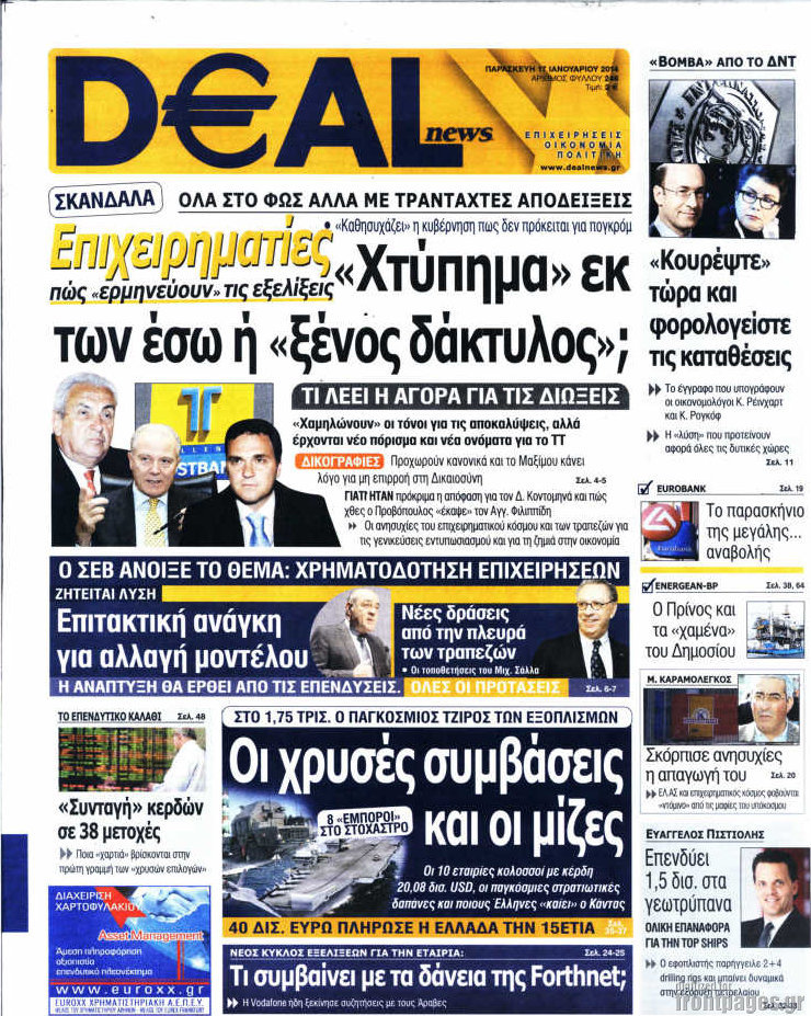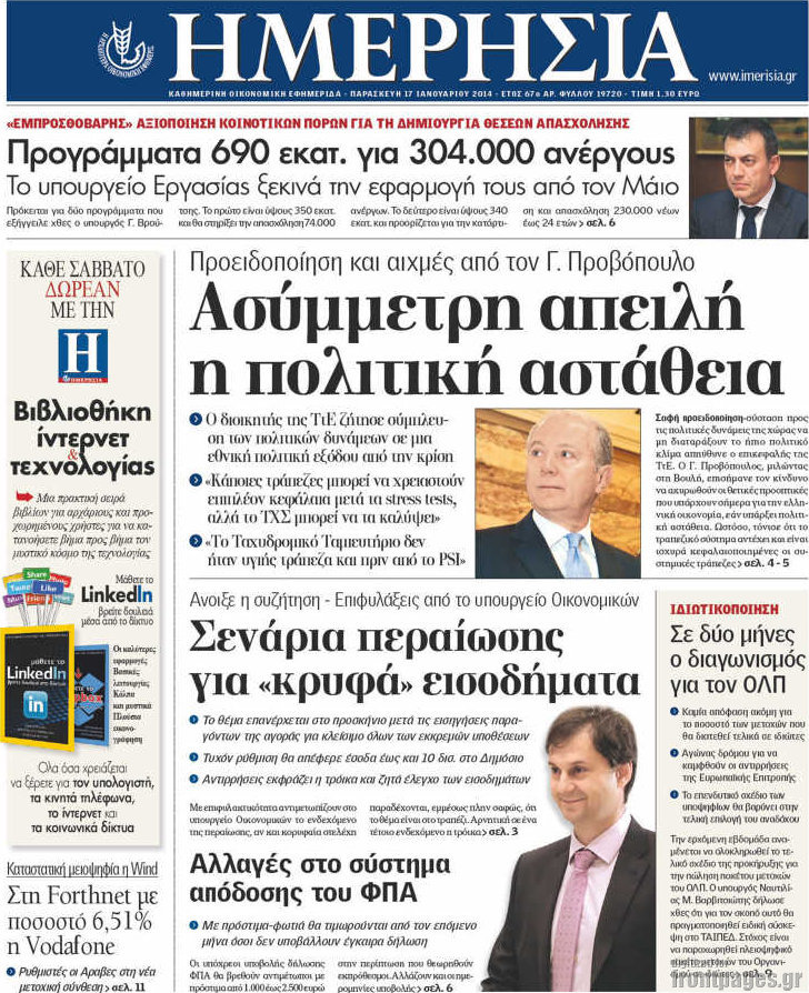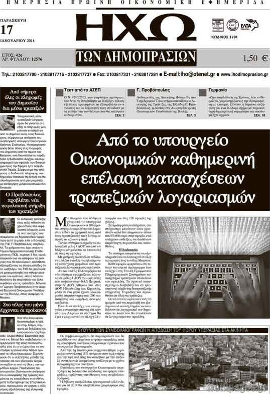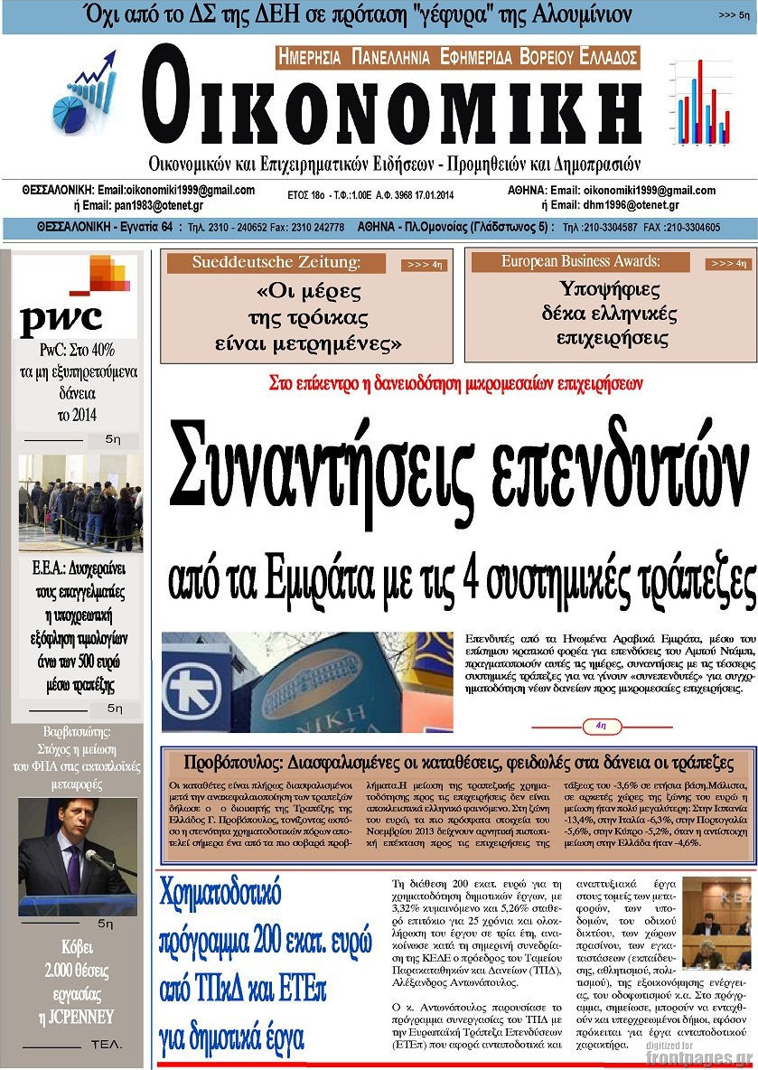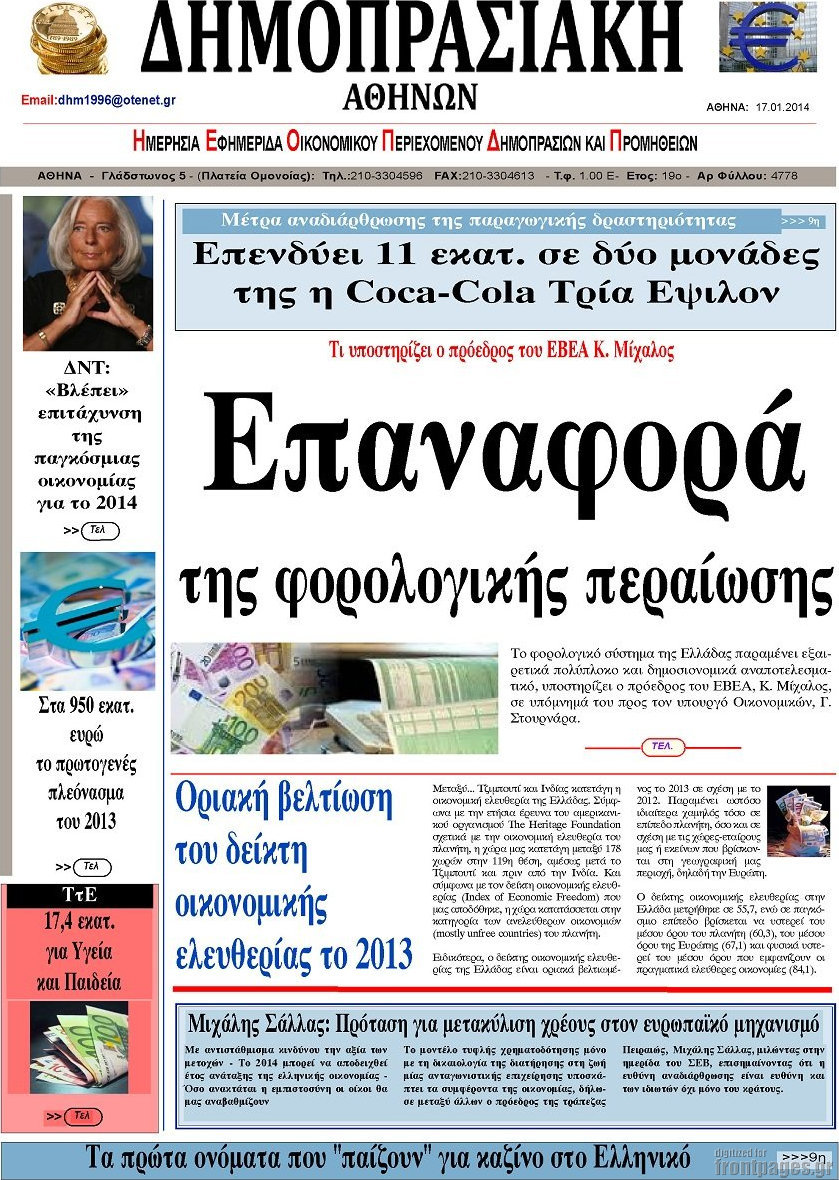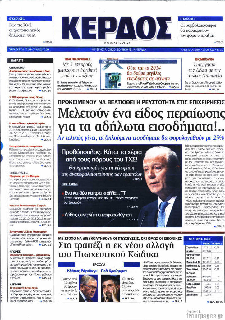 Οι oικονομικές εφημερίδες Enikos Newsroom 08:58, Παρασκευή 17 Ιανουαρίου 2014 Media Οι oικονομικές εφημερίδες Διαβάστε τα πρωτοσέλιδα των οικονομικών εφημερίδων: ΕΦΗΜΕΡΙΔΕΣ ΟΙΚΟΝΟΜΙΚΕΣ ΕΦΗΜΕΡΙΔΕΣ ΠΡΩΤΟΣΕΛΙΔΑ Μοιράσου το: σχολίασε κι εσύ (0 σχόλια) Ακολουθήστε το enikos.gr στο Google News και μάθετε πρώτοι όλες τις ειδήσεις Δείτε όλες τις τελευταίες ειδήσεις από την Ελλάδα και τον Κόσμο στο enikos.gr Ειδήσεις Ροή Ειδήσεων 3 ώρες πριν Εκτός ευρωομάδας ΣΥΡΙΖΑ ο Νίκος Παππάς μετά την επίθεση στον δημοσιογράφο Νίκο Γιαννόπουλο – Η μήνυση και οι νέες δηλώσεις 4 ώρες πριν «Αγριεύουν» οι αγρότες: «Δεν συντρέχει λόγος συνάντησης με τον πρωθυπουργό» – Ώρα αποφάσεων στη σύσκεψη της Πέμπτης 4 ώρες πριν Κυψέλη: Χωρίς την οικογένειά της δίπλα της απολογήθηκε η 16χρονη – «Της είχε επιτεθεί κάποιος για να την βιάσει, φοβήθηκε και κυκλοφορούσε με μαχαίρι» 3 ώρες πριν Politico: Το πρόβλημα της Ευρώπης δεν είναι το Βέλγιο αλλά ο Ντόναλντ Τραμπ 5 ώρες πριν Αλεξανδρούπολη: Πολυοργανική ανεπάρκεια λόγω υποσιτισμού η αιτία θανάτου του 3χρονου αγοριού 4 ώρες πριν Μυστήριο με τεράστιες κυκλικές πέτρες 200 κιλών – Ανακαλύφθηκαν τυχαία κατά τη διάρκεια οδικών έργων και κανείς δεν ξέρει από πού προέρχονται 5 ώρες πριν Ύπνος: Ειδικός εξηγεί τον πραγματικό λόγο που ξυπνάτε στις 4 τα ξημερώματα – Ο ρόλος των ορμονών και του κιρκάδιου ρυθμού 6 ώρες πριν Αριθμολογία: Οι άνθρωποι που έχουν γεννηθεί αυτές τις 4 ημερομηνίες, είναι τρυφεροί και αγαπούν ανιδιοτελώς 17 ώρες πριν 20 χρόνια τα Χριστούγεννα ξεκινούν στα Public με μεγάλη ποικιλία σε δώρα! 12 λεπτά πριν Αλ Τσαντίρι Νιουζ: Η κόρη της Πάολα στο κοινό – Η ατάκα Λαζόπουλου που την έκανε να «κοκκινήσει» 27 λεπτά πριν Ρωσία: Ουκρανικές δυνάμεις έπληξαν πλοίο στο λιμάνι του Ροστόφ – Αναφορές για θύματα 42 λεπτά πριν Βρυξέλλες: Νυχτερινό… μπλόκο αγροτών μπροστά από το κτίριο της Ευρωπαϊκής Επιτροπής – Πάνω από 100 τρακτέρ απέκλεισαν την λεωφόρο 58 λεπτά πριν Euroleague: Απρόσμενη ήττα για την Μονακό του Βασίλη Σπανούλη – Η βαθμολογία μετά το τέλος της 16ης αγωνιστικής 1 ώρα πριν Μουντιάλ 2026: Η νέα ταξιδιωτική απαγόρευση του Ντόναλντ Τραμπ πλήττει (και) τους οπαδούς Σενεγάλης – Ακτής Ελεφαντοστού ENIKOS NETWORK Αϋπνία: Το κόλπο που θα σας βοηθήσει να κοιμηθείτε απόψε – Είναι απλό και έχει αποτέλεσμα 2,6 εκατομμύρια πολίτες έχουν ήδη εμβολιαστεί κατά της γρίπης ΕΛΣΤΑΤ: Τι δείχνουν τα νέα στοιχεία για τις ηλεκτρονικές παραγγελίες των επιχειρήσεων ΚΕΠΕ: Οι 3 διακριτές συμβολές των ΜμΕ και της μεταποίησης στην ελληνική οικονομία Χαρτογραφώντας το «σημείο χωρίς επιστροφή»: Για πρώτη φορά αποκαλύπτεται με λεπτομέρεια το ακανθώδες όριο της ατμόσφαιρας τ... Η Google καταργεί τη λειτουργία «dark web report» – Πώς θα μπορούν οι χρήστες να διαγράφουν τα δεδομένα τους περισσότερα 02:30 , Πέμπτη 18 Δεκεμβρίου 2025 Αλ Τσαντίρι Νιουζ: Η κόρη της Πάολα στο κοινό – Η ατάκα Λαζόπουλου που την έκανε να «κοκκινήσει» Γιορτινή διάθεση και ευχάριστες στιγμές γέμισε η αποψινή, τελευταία για το 2025, εκπομπή του «... 22:24 , Τετάρτη 17 Δεκεμβρίου 2025 Το Σπίτι Δίπλα Στο Ποτάμι: Σε κίνδυνο η υγεία του Απόστολου – Τι θα δούμε απόψε “Το Σπίτι Δίπλα στο Ποτάμι” ξετυλίγει το νήμα της ζωής των πέντε αδελφών με καταισ... 21:14 , Τετάρτη 17 Δεκεμβρίου 2025 Παιχνίδια Εκδίκησης: Θα καταφέρει ο Χρήστος να κλονίσει την εμπιστοσύνη της Μάγιας απέναντι στον Άγη; Τα «Παιχνίδια Εκδίκησης» έρχονται απόψε στις 22:30, στον Αντ1, με το τελευταίο επει