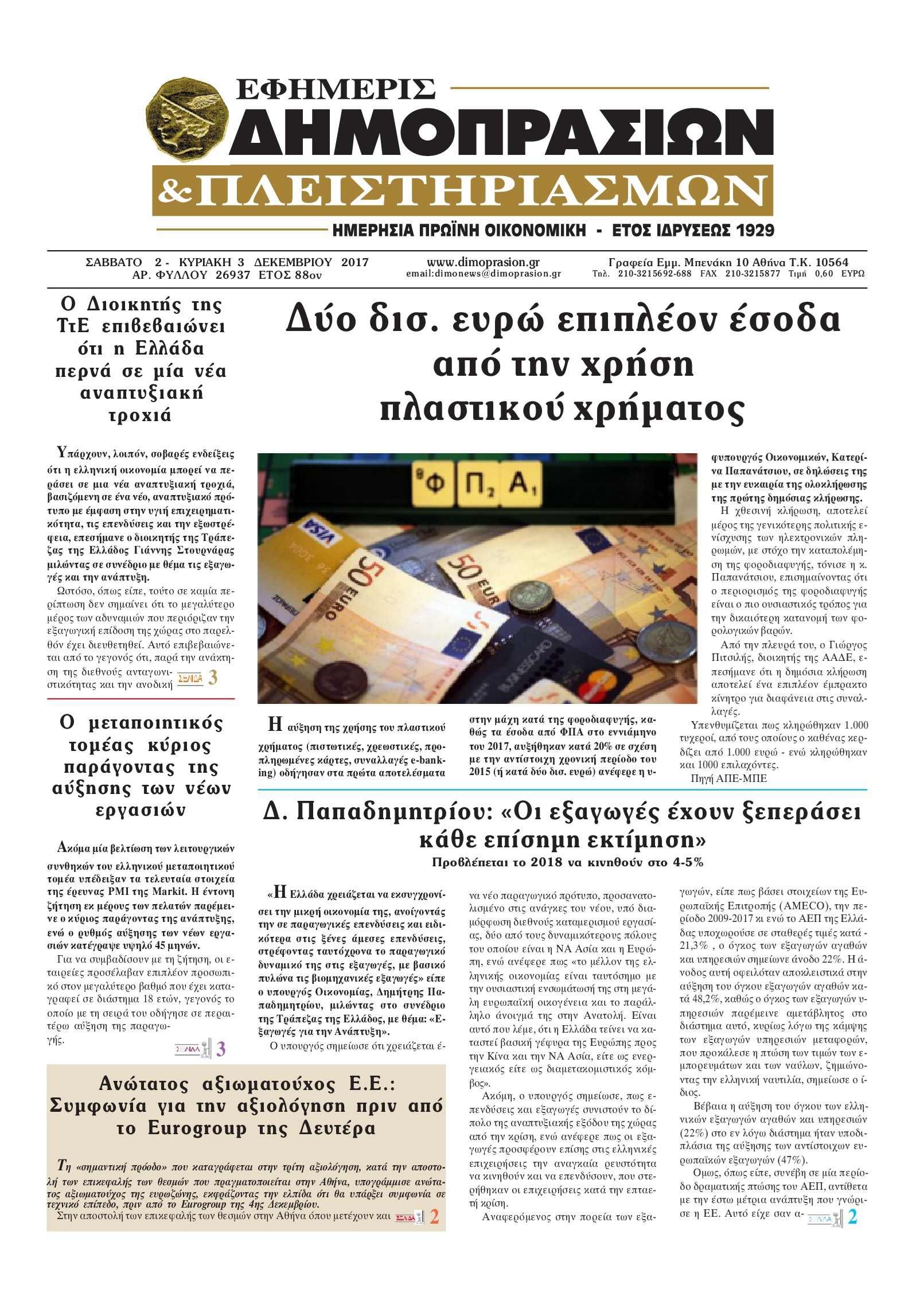 Οι οικονομικές εφημερίδες 4/12/2017 Enikos Newsroom 07:19, Δευτέρα 04 Δεκεμβρίου 2017 Media Διαβάστε τα σημερινά πρωτοσέλιδα των οικονομικών εφημερίδων: ΟΙΚΟΝΟΜΙΚΕΣ ΕΦΗΜΕΡΙΔΕΣ ΠΡΩΤΟΣΕΛΙΔΑ Μοιράσου το: σχολίασε κι εσύ (0 σχόλια) Ακολουθήστε το enikos.gr στο Google News και μάθετε πρώτοι όλες τις ειδήσεις Δείτε όλες τις τελευταίες ειδήσεις από την Ελλάδα και τον Κόσμο στο enikos.gr Ειδήσεις Ροή Ειδήσεων 2 ώρες πριν Αγρότες: «Όχι στον διάλογο, μας εμπαίζει η κυβέρνηση» – Αποφάσισαν κλιμάκωση των κινητοποιήσεων, τι θα γίνει τα Χριστούγεννα 3 ώρες πριν Την πρώτη Belharra παρέλαβε η χώρα μας, υψώθηκε η ελληνική σημαία στη φρεγάτα «Κίμων» – Δένδιας: «Το ισχυρότερο Πολεμικό Ναυτικό που είχε ποτέ ο ελληνισμός» 32 λεπτά πριν Γιώργος Μαζωνάκης: «Έχει υποστεί ένα σωρό εκβιαστικές πρακτικές – Του είπαν ότι θα του βάλουν τον συγκεκριμένο άνθρωπο να τον καταγγείλει» 2 ώρες πριν Μιχάλης Χουρδάκης: «Είμαι διαθέσιμος να συμβάλω στην προσωρινή κάλυψη του ιατρείου της Ψερίμου» – Η επιστολή στον Άδωνι Γεωργιάδη 2 ώρες πριν Εξώδικο Γεωργιάδη στην Κωνσταντοπούλου – «Με κατηγόρησε ότι έχω καταδικαστεί για παιδεραστία» 3 ώρες πριν Τα 5 ζώδια που θα ευνοηθούν στα οικονομικά τους το 2026 – «Τραβούν το χρήμα σαν μαγνήτες» 8 ώρες πριν Αν κάνετε συνεχώς αυτά τα 8 πράγματα με τα κατοικίδιά σας, σας λείπει η ανθρώπινη επαφή 4 ώρες πριν Αυτό που κρύβεται κάτω από τη Γροιλανδία θα μπορούσε να ανατρέψει όσα γνωρίζουμε για την άνοδο της στάθμης των θαλασσών 1 ημέρα πριν 20 χρόνια τα Χριστούγεννα ξεκινούν στα Public με μεγάλη ποικιλία σε δώρα! 1 λεπτό πριν Γάμος: 11 ψυχρές αλλά ευγενικές φράσεις, που λέει ένας άνδρας όταν σκέφτεται τον χωρισμό 6 λεπτά πριν Κορονοϊός: 99 νέες εισαγωγές και 6 θάνατοι την τελευταία εβδομάδα – Τα στοιχεία του ΕΟΔΥ για την γρίπη 10 λεπτά πριν Σωκράτης Φάμελλος: Τα γλυκά στους δημοσιογράφους, το «πάμε όλοι μαζί να ρίξουμε τον Μητσοτάκη» και η ατάκα για τον Τσίπρα 15 λεπτά πριν Εξαφάνιση 14χρονης από χώρο φιλοξενίας στην Αθήνα – ΦΩΤΟ 21 λεπτά πριν Η πρώτη αντίδραση της κυβέρνησης μετά την απόφαση των αγροτών – «Όχι στην κλιμάκωση και ταλαιπωρία της κοινωνίας» ENIKOS NETWORK Ξεκίνησε η «επέλαση» της γρίπης στην Ελλάδα-Ποιοι κινδυνεύουν ΕΟΔΥ: Δωρεάν τεστ για HIV, Ηπατίτιδες, Σύφιλη, Χλαμύδια, Γονόρροια Προσλήψεις σε Δήμο: Ποιοι μπορούν να κάνουν αίτηση έως αύριο – Οι ειδικότητες Αμετάβλητα για τέταρτη συνεχόμενη φορά τα επιτόκια της ΕΚΤ – Ποιες είναι οι προβλέψεις για τον πληθωρισμό και την οικονομία... Χαρτογραφώντας το «σημείο χωρίς επιστροφή»: Για πρώτη φορά αποκαλύπτεται με λεπτομέρεια το ακανθώδες όριο της ατμόσφαιρας τ... Η Google καταργεί τη λειτουργία «dark web report» – Πώς θα μπορούν οι χρήστες να διαγράφουν τα δεδομένα τους περισσότερα 17:45 , Πέμπτη 18 Δεκεμβρίου 2025 ROUK ZOUK: Εορταστικό επεισόδιο με καλεσμένους τους πρωταγωνιστές του «Γιατί ρε πατέρα» Το Σάββατο 20 Δεκεμβρίου στις 21:00, η Ζέτα Μακρυπούλια υποδέχεται εκλεκτούς ηθοποιούς που όλο... 17:20 , Πέμπτη 18 Δεκεμβρίου 2025 Άγιος έρωτας: Η Χριστίνα εξομολογείται στον πατέρα Νικόλαο, απόψε στις 21:00 στον Alpha Η Νότα αποφασίζει να εκδικηθεί τον Πέτρο και τον Στέφανο, για χάρη του Λούη, όμως τα πράγματα ... 16:50 , Πέμπτη 18 Δεκεμβρίου 2025 Να μ’ αγαπάς: Ζωή και Φωτεινή συμφιλιώνονται ως μάνα με κόρη, απόψε στις 20:00 Η ταυτότητα του Άγγελου αποκαλύπτεται στο νέο επεισόδιο της σειράς “Να μ’ αγαπάς... 15:52 , Πέμπτη 18 Δεκεμβρίου 2025 Το Σπίτι Δίπλα Στο Ποτάμι: Το καθηλωτικό τελευταί