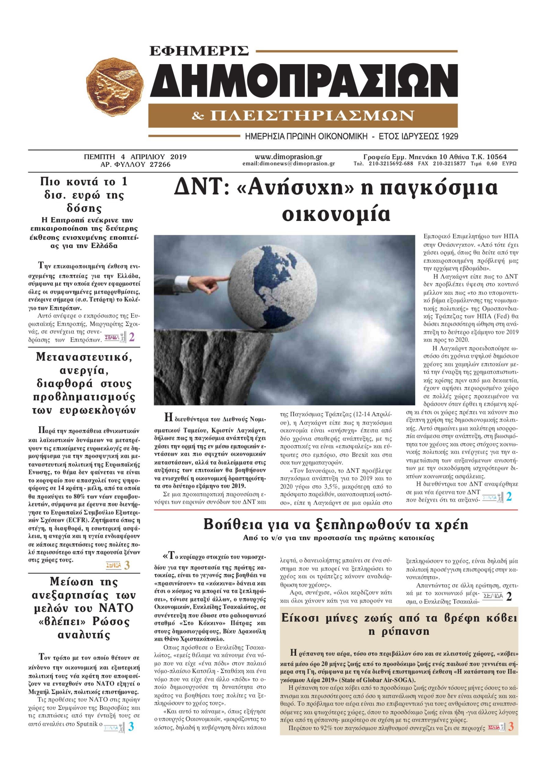 Οι οικονομικές εφημερίδες 4/4/19 Enikos Newsroom 06:55, Πέμπτη 04 Απριλίου 2019 Media Διαβάστε τα πρωτοσέλιδα των οικονομικών εφημερίδων: ΟΙΚΟΝΟΜΙΚΕΣ ΕΦΗΜΕΡΙΔΕΣ ΠΡΩΤΟΣΕΛΙΔΑ Μοιράσου το: σχολίασε κι εσύ (0 σχόλια) Ακολουθήστε το enikos.gr στο Google News και μάθετε πρώτοι όλες τις ειδήσεις Δείτε όλες τις τελευταίες ειδήσεις από την Ελλάδα και τον Κόσμο στο enikos.gr Ειδήσεις Ροή Ειδήσεων 3 ώρες πριν Από το Ορμένιο ως τα Μάλγαρα κι από τη Σιάτιστα μέχρι τη Νίκαια: Μπλόκα σε όλη την Ελλάδα – Το Σάββατο ανοίγουν τα διόδια οι αγρότες 39 λεπτά πριν Εμπλοκή και αερομαχίες με οπλισμένα τουρκικά F-16 στο Αιγαίο 2 ώρες πριν Αττική: Θρίλερ με νεκρό βρέφος 5 μηνών – Κοιμόταν στο ίδιο κρεβάτι με τους γονείς του 29 λεπτά πριν Πούτιν: «Ναι, είμαι ερωτευμένος» – Βίντεο από τη σπάνια προσωπική παραδοχή του 2 ώρες πριν Μεσόγειος: Η διαδρομή του ρωσικού τάνκερ «Qendil» και η στοχευμένη επίθεση της Ουκρανίας με drone – Ο Πούτιν προειδοποίησε για αντίποινα 4 ώρες πριν Τα 5 ζώδια που ευνοούνται στην ερωτική ζωή τους την επόμενη εβδομάδα – «Η ενέργεια του Αιγόκερου φέρνει αγάπη και σταθερότητα» 5 ώρες πριν Αυτό το έξυπνο μαθηματικό κόλπο θα μπορούσε να αλλάξει τον τρόπο με τον οποίο οι επιστήμονες μελετούν τους σεισμούς 1 ώρα πριν Μήπως έχετε χάσει τον εαυτό σας στη σχέση σας; 7 «αθόρυβες» υποχωρήσεις που μάλλον κάνατε, χωρίς να το συνειδητοποιήσετε 3 ώρες πριν Κουίζ για την παλιά Αθήνα: Αναγνωρίζετε την περιοχή; Έχετε περάσει 100% από εκεί 1 λεπτό πριν Νίκος Γιαννόπουλος: «Μου επιτέθηκε ο Παππάς – Ήμουν νηφάλιος, δεν τον προκάλεσα» – ΒΙΝΤΕΟ 9 λεπτά πριν Γιώργος Τράγκας: Ανατροπή από το Πριγκιπάτο του Μονακό για την υπόθεση της κληρονομιάς – Η ανακοίνωση της δικηγόρου της Μαρίας Καρρά 17 λεπτά πριν Ξεχάστε το καθάρισμα το Σαββατοκύριακο: Ο «κανόνας των 20 λεπτών» που θα σας λύσει τα χέρια 18 λεπτά πριν Αγρότες: Έκλεισαν την υψηλή γέφυρα της Χαλκίδας – ΒΙΝΤΕΟ 22 λεπτά πριν Ρούμπιο: Έχει υπάρξει πρόοδος στις συνομιλίες για την Ουκρανία – Τα τελευταία ζητήματα είναι τα πιο δύσκολα ENIKOS NETWORK Έχετε πραγματικά μεγάλη καρδιά; 10 χαρακτηριστικά όσων έχουν καλοσύνη «Η σούπερ» γρίπη εξαπλώνεται στην Ευρώπη-Στοιχεία από το ECDC για την αποτελεσματικότητα του εμβολίου Επίδομα παιδιού: Πότε ανοίγει ξανά η πλατφόρμα για τις αιτήσεις Προκήρυξη ΑΣΕΠ για 397 μόνιμες προσλήψεις στο Δημόσιο: Βγήκαν τα προσωρινά αποτελέσματα – Πότε αρχίζει η υποβολή ενστάσεων Χαρτογραφώντας το «σημείο χωρίς επιστροφή»: Για πρώτη φορά αποκαλύπτεται με λεπτομέρεια το ακανθώδες όριο της ατμόσφαιρας τ... Η Google καταργεί τη λειτουργία «dark web report» – Πώς θα μπορούν οι χρήστες να διαγράφουν τα δεδομένα τους περισσότερα 19:31 , Παρασκευή 19 Δεκεμβρίου 2025 GNTM: Απόψε ο μεγάλος τελικός για τους 4 φιναλίστ Έπειτα από μήνες γεμάτους μόδα, δημιουργία και έντονες αναμετρήσεις, το GNTM 2025 κορυφώνεται,... 18:11 , Παρασκευή 19 Δεκεμβρίου 2025 Το σόι σου: Ο Άρης έρχεται στην Ελλάδα για τις γιορτές των Χριστουγέννων – Τι θα δούμε στο αποψινό εορταστικό επεισόδιο Ένα απολαυστικό, εορταστικό επεισόδιο της σειράς “Το σόι σου”, γεμάτο ευτράπελα αλ... 15:15 , Παρασκευή 19 Δεκεμβρίου 2025 Την Κυριακή με τη Realnews: Ό,τι και αν αγοράσεις, σκανάρεις και κερδίζεις! Την Κυριακή με τη Realnews: Ό,τι και αν αγοράσεις, σκανάρεις και κερδίζεις! Με το PADU app, το... 08:00 , Παρασκευή 19 Δεκεμβρίου 2025 Την Κυριακή με τη Realnews: Δωροεπιταγή 10€ Δωροεπιταγή αξίας 10€ για αγορές άνω των 60€ από τα πολυκαταστήματα FactoryOutlet H προσφορ