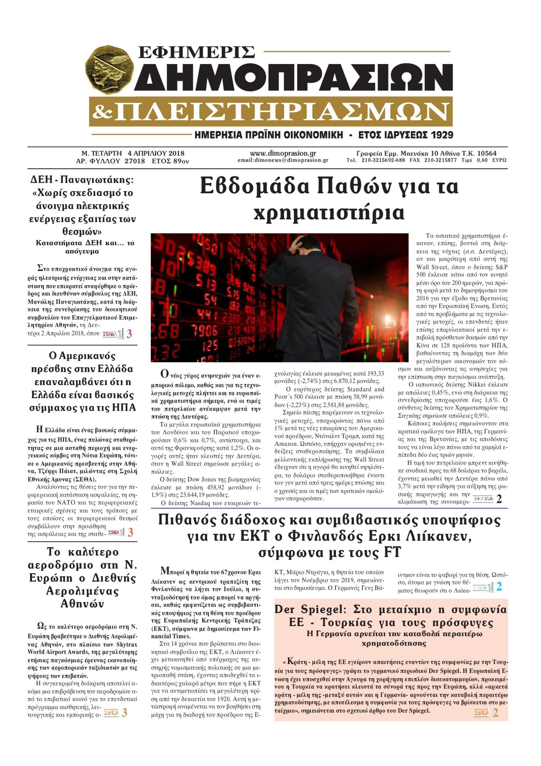 Οι οικονομικές εφημερίδες 4/4/2018 Enikos Newsroom 07:25, Τετάρτη 04 Απριλίου 2018 Media Διαβάστε τα σημερινά πρωτοσέλιδα των οικονομικών εφημερίδων: ΟΙΚΟΝΟΜΙΚΕΣ ΕΦΗΜΕΡΙΔΕΣ ΠΡΩΤΟΣΕΛΙΔΑ Μοιράσου το: σχολίασε κι εσύ (0 σχόλια) Ακολουθήστε το enikos.gr στο Google News και μάθετε πρώτοι όλες τις ειδήσεις Δείτε όλες τις τελευταίες ειδήσεις από την Ελλάδα και τον Κόσμο στο enikos.gr Ειδήσεις Ροή Ειδήσεων 39 λεπτά πριν Ευρωπαϊκή Ένωση: Συμφωνία για δάνειο 90 δισ. ευρώ στην Ουκρανία τη διετία 2026-2027 5 ώρες πριν ΟΠΕΚΕΠΕ: Προφυλακιστέος ο φερόμενος αρχηγός και ο λογιστής της εγκληματικής οργάνωσης 6 ώρες πριν Αυξάνουν την πίεση προς την κυβέρνηση οι αγρότες: Κλείνουν παρακαμπτήριους και ανοίγουν διόδια – Τι θα γίνει τις γιορτές 6 ώρες πριν Φοινικούντα: Το Σάββατο απολογείται ο 30χρονος γιος γνωστού επιχειρηματία της Πλάκας που παραδόθηκε – Όσα είπε στους αστυνομικούς και ο ρόλος του στο έγκλημα 5 ώρες πριν ΑΕΚ – Κραϊόβα 3-2: Επική ανατροπή και πρόκριση στους «16» του Conference League η Ένωση 6 ώρες πριν Αρχαιολόγοι ανακάλυψαν ρωμαϊκά τεχνουργήματα από μια πόλη που δεν υπήρξε ποτέ – Τα τρία εντυπωσιακά κτίρια και ο αμφορέας με τις… σαρδέλες 7 ώρες πριν Ύπνος: Η απλή βραδινή ρουτίνα για να προστατεύσετε τα μαλλιά σας από το κρύο κατά τη διάρκεια του χειμώνα 8 ώρες πριν Manifesting: Πώς να συναντήσετε τον σύντροφο της ζωής σας, ανάλογα με τον μήνα γέννησής σας 2 ημέρες πριν 20 χρόνια τα Χριστούγεννα ξεκινούν στα Public με μεγάλη ποικιλία σε δώρα! 3 λεπτά πριν Αυστραλία: Κήρυξε την Κυριακή (21/12) ημέρα εθνικού πένθους για τη φονική επίθεση στην παραλία Μπόνταϊ 13 λεπτά πριν Ρόδος: Δάσκαλος καράτε καταδικάστηκε για ασέλγεια σε ανήλικες αθλήτριες – Μαρτυρίες για αγγίγματα σε ευαίσθητα σημεία 27 λεπτά πριν Γουατεμάλα: Εξαρθρώθηκε κύκλωμα διακίνησης μεταναστών προς τις ΗΠΑ – Συνελήφθησαν 14 άτομα 32 λεπτά πριν Βουλγαρία: Χιλιάδες πολίτες στους δρόμους κατά της απερχόμενης κυβέρνησης και της διαφθοράς 39 λεπτά πριν Ευρωπαϊκή Ένωση: Συμφωνία για δάνειο 90 δισ. ευρώ στην Ουκρανία τη διετία 2026-2027 ENIKOS NETWORK Σε περίοδο αυξημένης δραστηριότητας η γρίπη στην Ελλάδα-Μέτρα προστασίας από τον ΕΟΔΥ Σκέφτεστε συνέχεια συζητήσεις που έχετε κάνει; Τι σημαίνει αυτό, σύμφωνα με ειδικό Στεγαστικό: Τι λέει η ΠΟΜΙΔΑ για τα νέα μέτρα που ανακοίνωσε ο Κυριάκος Μητσοτάκης Λαγκάρντ: Αισιόδοξη για την ανάπτυξη της Ευρωζώνης, αβέβαιη για τον πληθωρισμό Χαρτογραφώντας το «σημείο χωρίς επιστροφή»: Για πρώτη φορά αποκαλύπτεται με λεπτομέρεια το ακανθώδες όριο της ατμόσφαιρας τ... Η Google καταργεί τη λειτουργία «dark web report» – Πώς θα μπορούν οι χρήστες να διαγράφουν τα δεδομένα τους περισσότερα 02:50 , Παρασκευή 19 Δεκεμβρίου 2025 GNTM: «Κλείδωσαν» οι τέσσερις φιναλίστ – Μεγάλη ανατροπή στις τελευταίες αποχωρήσεις Για προτελευταία φορά εμφανίστηκαν στο πλατό του GNTM οι φιναλίστ του φετινού κύκλου, το βράδυ... 17:45 , Πέμπτη 18 Δεκεμβρίου 2025 ROUK ZOUK: Εορταστικό επεισόδιο με καλεσμένους τους πρωταγωνιστές του «Γιατί ρε πατέρα» Το Σάββατο 20 Δεκεμβρίου στις 21:00, η Ζέτα Μακρυπούλια υποδέχεται εκλεκτούς ηθοποιούς που όλο... 17:20 , Πέμπτη 18 Δεκεμβρίου 2025 Άγιος έρωτας: Η Χριστίνα εξομολογείται στον πατέρα Νικόλαο, απόψε στις 21:00 στον Alpha Η Νότα αποφασίζει να εκδικηθεί τον Πέτρο και τον Στέφανο, για χάρη του Λούη, όμως τα πράγματα ... 16:50 , Πέμπτη 18 Δεκεμβρίου 2025 Να μ’ αγαπάς: Ζωή και Φωτεινή συμφιλιώνονται ως μάνα με κόρη, απόψε στις 20:00 Η ταυτότητα του Άγγελου αποκαλύπτεται 
