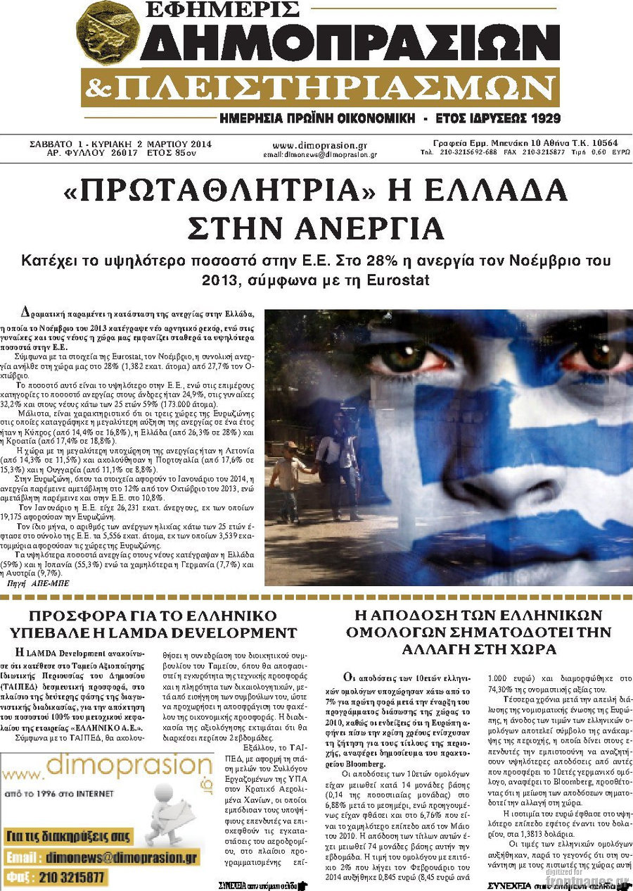 Οι οικονομικές εφημερίδες Enikos Newsroom 08:29, Σάββατο 01 Μαρτίου 2014 Media Οι οικονομικές εφημερίδες ΕΦΗΜΕΡΙΔΕΣ ΟΙΚΟΝΟΜΙΚΕΣ ΕΦΗΜΕΡΙΔΕΣ Μοιράσου το: σχολίασε κι εσύ (0 σχόλια) Ακολουθήστε το enikos.gr στο Google News και μάθετε πρώτοι όλες τις ειδήσεις Δείτε όλες τις τελευταίες ειδήσεις από την Ελλάδα και τον Κόσμο στο enikos.gr Ειδήσεις Ροή Ειδήσεων 28 λεπτά πριν Πώς στήθηκε η επιχείρηση «Ίπαλλος» που οδήγησε στη σύλληψη του «Έλληνα Εσκομπάρ» – «Ο πόλεμος ενάντια στους εμπόρους ναρκωτικών θα συνεχιστεί» 13 λεπτά πριν Δίκη Χρυσής Αυγής: Την ενοχή και των 42 κατηγορουμένων ζητά η εισαγγελέας 33 λεπτά πριν Κυψέλη: Στη φυλακή η 16χρονη που μαχαίρωσε συμμαθήτριά της 3 ώρες πριν Αμοργός: «Θα προσπαθήσω να το κάνω κάθε μέρα» – Ποιος είναι ο αγρότης που έστησε μόνος του το πρώτο μπλόκο στο νησί 1 ώρα πριν Τραγωδία στην Αλεξανδρούπολη: Παιδάκι 3 ετών μεταφέρθηκε νεκρό από τη μητέρα του στο νοσοκομείο 39 λεπτά πριν Τα 3 ζώδια που θα δουν τη ζωή τους να αλλάζει ριζικά το 2026 – «Όλα γίνονται καλύτερα σταδιακά» 6 ώρες πριν «Δεν είχα κλάψει από τότε που διαγνώστηκα με καρκίνο, ώσπου ένα τηλεφώνημα με έκανε να λυγίσω» – Η συγκλονιστική εξομολόγηση ενός άνδρα 2 ώρες πριν Ο σπάνιος σεισμός που έλυσε τα χέρια των επιστημόνων – Αποκάλυψε ακριβώς όσα αναζητούσαν 7 ώρες πριν 20 χρόνια τα Χριστούγεννα ξεκινούν στα Public με μεγάλη ποικιλία σε δώρα! 29 δευτερόλεπτα πριν Θεσσαλονίκη: Ακυρώνονται τρεις παραστάσεις του ΚΘΒΕ λόγω στάσης εργασίας των εργαζομένων 7 λεπτά πριν Τραγωδία στην Αχαΐα: 48χρονος κατέρρευσε στο κυνήγι μπροστά στα μάτια του πατέρα του 13 λεπτά πριν Δίκη Χρυσής Αυγής: Την ενοχή και των 42 κατηγορουμένων ζητά η εισαγγελέας 14 λεπτά πριν Μαρκέλλα Γιαννάτου: «Είμαι κοντά στα 14 χρόνια σε ψυχανάλυση – Είχα αρχίσει να έχω κρίσεις άγχους, νόμιζα ότι θα πεθάνω» 21 λεπτά πριν Υπουργείο Αγροτικής Ανάπτυξης: Πώς θα γίνει η πληρωμή αγροτεμαχίων έως 20 στρέμματα παρά τα ζητήματα ΚΑΕΚ ENIKOS NETWORK Σοβαροί κίνδυνοι από τη λάθος χορήγηση φαρμάκου για τις αιμορραγίες-Συστάσεις προς τους γιατρούς 5 πράγματα που αποφεύγει γαστρεντερολόγος για να μειώσει τον κίνδυνο καρκίνου του εντέρου Eurostat: Κάτω από την αρχική εκτίμηση της Υπηρεσίας ο πληθωρισμός στην Ελλάδα τον Νοέμβριο του 2025 – Tα στοιχεία για την ... Συντάξεις Ιανουαρίου 2026: Σε ποιους θα πιστωθούν την Πέμπτη τα χρήματα και τι αυξήσεις θα δοθούν – Δείτε αναλυτικά παραδεί... Χαρτογραφώντας το «σημείο χωρίς επιστροφή»: Για πρώτη φορά αποκαλύπτεται με λεπτομέρεια το ακανθώδες όριο της ατμόσφαιρας τ... Η Google καταργεί τη λειτουργία «dark web report» – Πώς θα μπορούν οι χρήστες να διαγράφουν τα δεδομένα τους περισσότερα 12:35 , Τετάρτη 17 Δεκεμβρίου 2025 Μίρκα Παπακωνσταντίνου: «Δεν ήμουν αισιόδοξη για τα νούμερα – Είμαι ρεαλίστρια» Στα γυρίσματα του εορταστικού επεισοδίου της αγαπημένης σειράς “Το Σόι Σου”, βρέθηκε η κάμερα ... 12:12 , Τετάρτη 17 Δεκεμβρίου 2025 Ακούστε την εκπομπή του Νίκου Χατζηνικολάου 17/12/2025 Ακούστε την εκπομπή του Νίκου Χατζηνικολάου στον ραδιοφωνικό σταθμό RealFm 97,8, την Τετάρτη 1... 11:35 , Τετάρτη 17 Δεκεμβρίου 2025 Home Alone: Το σπίτι της ταινίας θα ανακαινιστεί – Επιστροφή στην αισθητική της δεκαετίας του ’90 Οι νέοι ιδιοκτήτες του πραγματικού σπιτιού που παρουσιάζεται στην κλασική ταινία του 1990 «Hom... 11:25 , Τετάρτη 17 Δεκεμβρίου 2025 Grand Hotel: Απόψε το τελευταίο επεισόδιο της χρονιάς – Όλα τα μυστικά μένουν εδώ Το τελευταίο επεισόδιο της χρονιάς της σειράς «Grand Hotel