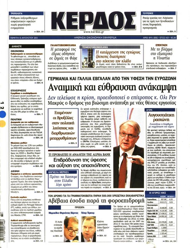 Oι οικονομικές εφημερίδες Enikos Newsroom 10:51, Πέμπτη 15 Αυγούστου 2013 Media Oι οικονομικές εφημερίδες ΕΦΗΜΕΡΙΔΕΣ ΟΙΚΟΝΟΜΙΚΕΣ ΕΦΗΜΕΡΙΔΕΣ Μοιράσου το: σχολίασε κι εσύ (0 σχόλια) Ακολουθήστε το enikos.gr στο Google News και μάθετε πρώτοι όλες τις ειδήσεις Δείτε όλες τις τελευταίες ειδήσεις από την Ελλάδα και τον Κόσμο στο enikos.gr Ειδήσεις Ροή Ειδήσεων 5 ώρες πριν Μητσοτάκης: Αναγκαία η μεταρρύθμιση του πρωτογενούς τομέα – Τα 6 νέα μέτρα για το στεγαστικό και οι αναφορές σε «Ιθάκη» και «πολιτικούς του καναπέ» 4 ώρες πριν Δάνεια σε ελβετικό φράγκο: Τα βασικά σημεία της ρύθμισης – ανάσας για 40.000 δανειολήπτες – Αναλυτικός οδηγός με ερωτήσεις και απαντήσεις 4 ώρες πριν Κυψέλη: Εξιτήριο πήρε η 14χρονη μαθήτρια που μαχαιρώθηκε από την 16χρονη σε σχολείο – «Θέλω να βοηθήσω το παιδί, έχει μπλέξει με κακές παρέες» 3 ώρες πριν Τραμπ: Γιατί κατέθεσε τώρα την αγωγή κατά του BBC – Πώς η κίνησή του εξυπηρετεί το νέο δόγμα του για «αντίσταση» στην Ευρώπη, υπέρ των συντηρητικών 4 ώρες πριν ΟΠΕΚΕΠΕ – Παράνομες επιδοτήσεις: Ελεύθεροι με περιοριστικούς όρους και οι 7 κατηγορούμενοι που απολογήθηκαν σήμερα 4 ώρες πριν Ανακαλύφθηκε βυθισμένη πέτρινη κατασκευή ανοιχτά της Κριμαίας – Αποτελεί μέρος αρχαίας ελληνικής αποικίας 5 ώρες πριν Ύπνος: Αυτό μπορεί να είναι το χειρότερο λάθος για το βιολογικό ρολόι σας, σύμφωνα με ειδικό 6 ώρες πριν Αριθμολογία: Οι άνθρωποι που έχουν γεννηθεί αυτές τις 3 ημερομηνίες, προσελκύουν μεγάλη τύχη πριν από το τέλος του 2025 8 ώρες πριν Οι 7 συμπεριφορές που μαρτυρούν ότι ένας άνδρας επενδύει μακροπρόθεσμα σε μια σχέση 12 λεπτά πριν ΗΠΑ: Στην αγορά δύο Boeing 747-8 προχωρά η Πολεμική Αεροπορία για την υποστήριξη του προεδρικού στόλου 26 λεπτά πριν Ιταλία: Λεωφορείο έπεσε πάνω σε βιτρίνα καταστήματος στο Τορίνο – Τρεις τραυματίες 42 λεπτά πριν Χαλάνδρι: Καθηγητής έπιασε με κόφτη τα δάχτυλα μαθητή σε κατάληψη – «Μου έχεις πιάσει το χέρι» 57 λεπτά πριν Ουκρανία: Εκρήξεις στο Κίεβο ύστερα από προειδοποίηση για επιδρομή drones 1 ώρα πριν Ορφέας Αυγουστίδης: Η επική ατάκα του γιου του για τα «Φαντάσματα» – «Του λέω “δεν ντρέπεσαι να το λες στον πατέρα σου αυτό;”» ENIKOS NETWORK Αίτημα ΙΣΑ για την εξαίρεση των προσωπικών γιατρών από τις κατ’ οίκον επισκέψεις Η σκανδιναβική μέθοδος στον ύπνο που μπορεί να σώσει έναν γάμο Πιερρακάκης: Ο προϋπολογισμός συμβάλλει ουσιαστικά στην ενίσχυση της αγοραστικής δύναμης της πλειονότητας των εργαζομένων e-ΕΦΚΑ: Παρατείνεται η προθεσμία για την υποβολή ΑΠΔ – Ποιους αφορά Σύγχρονος Νοστράδαμος: Προειδοποιεί για «μεγάλο γεγονός» τους επόμενους μήνες που θα συγκλονίσει τη Βρετανία και τον κόσμο Τεστ παρατηρητικότητας: Μπορείτε να βρείτε τις 3 διαφορές στις εικόνες με έναν πιγκουίνο σε 14 δευτερόλεπτα περισσότερα 20:06 , Τρίτη 16 Δεκεμβρίου 2025 Ο ΣΚΑΙ καταγγέλλει τον ΕΚΚΟΜΕΔ Επιστολή με την οποία καταγράφει την έντονη διαμαρτυρία του προς τον διευθύνοντα σύμβουλο του... 17:40 , Τρίτη 16 Δεκεμβρίου 2025 Eurovision: Στις 4 Ιανουαρίου αποκαλύπτονται τα 28 τραγούδια του ελληνικού τελικού Η αγωνία τελειώνει, η γιορτή της Eurovision αρχίζει στην ΕΡΤ από τις πρώτες ημέρες της νέας χρ... 17:09 , Τρίτη 16 Δεκεμβρίου 2025 Alter Ego Media: Βαθύτατη θλίψη και ειλικρινή συλλυπητήρια για την απώλεια της Ειρήνης Μαρινάκη Τη βαθύτατη θλίψη και τα ειλικρινή συλλυπητήριά της εκφράζει η Alter Ego Media για τον θάνατο ... 13:00 , Τρίτη 16 Δεκεμβρίου 2025 «Στο Παρά Πέντε – 20 Χρόνια Μετά»: Κυκλοφόρησε το τρέιλερ του 