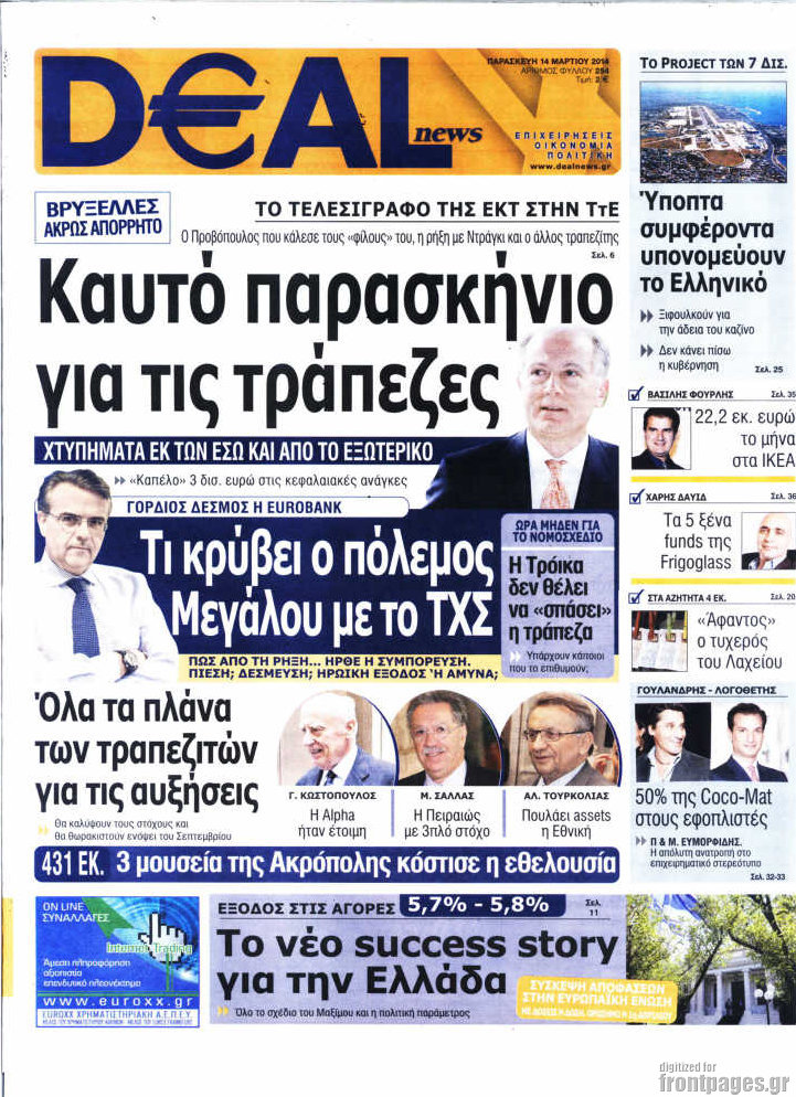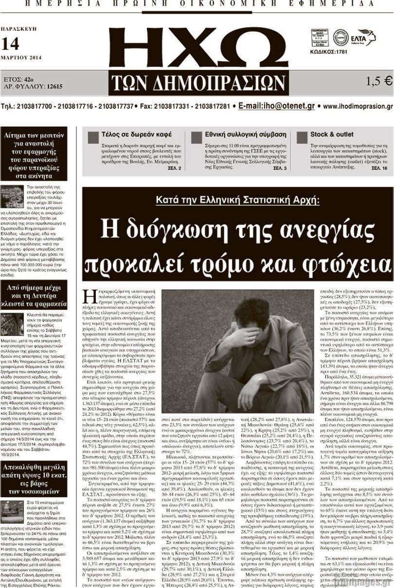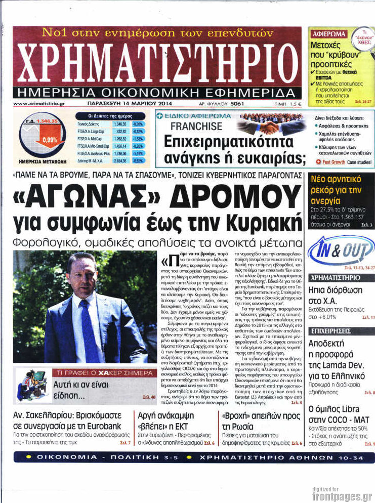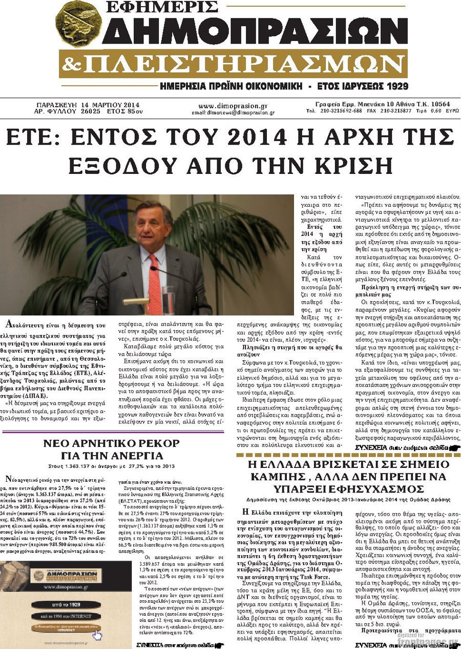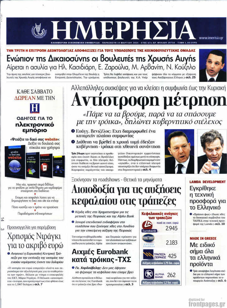 Οι oικονομικές εφημερίδες Enikos Newsroom 08:55, Παρασκευή 14 Μαρτίου 2014 Media Οι oικονομικές εφημερίδες Διαβάστε τα πρωτοσέλιδα των οικονομικών εφημερίδων: ΕΦΗΜΕΡΙΔΕΣ ΟΙΚΟΝΟΜΙΚΕΣ ΕΦΗΜΕΡΙΔΕΣ ΠΡΩΤΟΣΕΛΙΔΑ Μοιράσου το: σχολίασε κι εσύ (0 σχόλια) Ακολουθήστε το enikos.gr στο Google News και μάθετε πρώτοι όλες τις ειδήσεις Δείτε όλες τις τελευταίες ειδήσεις από την Ελλάδα και τον Κόσμο στο enikos.gr Ειδήσεις Ροή Ειδήσεων 5 ώρες πριν Εκτός ευρωομάδας ΣΥΡΙΖΑ ο Νίκος Παππάς μετά την επίθεση στον δημοσιογράφο Νίκο Γιαννόπουλο – Η μήνυση και οι νέες δηλώσεις 6 ώρες πριν «Αγριεύουν» οι αγρότες: «Δεν συντρέχει λόγος συνάντησης με τον πρωθυπουργό» – Ώρα αποφάσεων στη σύσκεψη της Πέμπτης 6 ώρες πριν Κυψέλη: Χωρίς την οικογένειά της δίπλα της απολογήθηκε η 16χρονη – «Της είχε επιτεθεί κάποιος για να την βιάσει, φοβήθηκε και κυκλοφορούσε με μαχαίρι» 5 ώρες πριν Politico: Το πρόβλημα της Ευρώπης δεν είναι το Βέλγιο αλλά ο Ντόναλντ Τραμπ 7 ώρες πριν Αλεξανδρούπολη: Πολυοργανική ανεπάρκεια λόγω υποσιτισμού η αιτία θανάτου του 3χρονου αγοριού 6 ώρες πριν Μυστήριο με τεράστιες κυκλικές πέτρες 200 κιλών – Ανακαλύφθηκαν τυχαία κατά τη διάρκεια οδικών έργων και κανείς δεν ξέρει από πού προέρχονται 7 ώρες πριν Ύπνος: Ειδικός εξηγεί τον πραγματικό λόγο που ξυπνάτε στις 4 τα ξημερώματα – Ο ρόλος των ορμονών και του κιρκάδιου ρυθμού 8 ώρες πριν Αριθμολογία: Οι άνθρωποι που έχουν γεννηθεί αυτές τις 4 ημερομηνίες, είναι τρυφεροί και αγαπούν ανιδιοτελώς 19 ώρες πριν 20 χρόνια τα Χριστούγεννα ξεκινούν στα Public με μεγάλη ποικιλία σε δώρα! 13 λεπτά πριν Κτηνοτρόφοι: Με δάκρυα στα μάτια ζουν τον εφιάλτη των άδειων στάβλων – «Καταστράφηκαν οι ζωές μας» 28 λεπτά πριν Νέο αμερικανικό πλήγμα σε σκάφος που φέρεται να μετέφερε ναρκωτικά στον Ειρηνικό – Τέσσερις νεκροί 43 λεπτά πριν Αλ Τσαντίρι Νιουζ: «Λύγισε» ο Δημήτρης Λάλος για τον Δημήτρη Ήμελλο – «Τον μνημονεύω, να ‘ναι καλά εκεί που είναι» 58 λεπτά πριν GNTM: Με δάκρυα τον αποχαιρέτησε η Ηλιάνα Παπαγεωργίου πριν από τον ημιτελικό – «Αισθάνομαι πολύ παράξενα» 1 ώρα πριν Αμερικανικά στρατεύματα στον Ισημερινό για «προσωρινή» επιχείρηση κατά των ναρκωτικών ENIKOS NETWORK Αϋπνία: Το κόλπο που θα σας βοηθήσει να κοιμηθείτε απόψε – Είναι απλό και έχει αποτέλεσμα 2,6 εκατομμύρια πολίτες έχουν ήδη εμβολιαστεί κατά της γρίπης ΕΛΣΤΑΤ: Τι δείχνουν τα νέα στοιχεία για τις ηλεκτρονικές παραγγελίες των επιχειρήσεων ΚΕΠΕ: Οι 3 διακριτές συμβολές των ΜμΕ και της μεταποίησης στην ελληνική οικονομία Χαρτογραφώντας το «σημείο χωρίς επιστροφή»: Για πρώτη φορά αποκαλύπτεται με λεπτομέρεια το ακανθώδες όριο της ατμόσφαιρας τ... Η Google καταργεί τη λειτουργία «dark web report» – Πώς θα μπορούν οι χρήστες να διαγράφουν τα δεδομένα τους περισσότερα 02:30 , Πέμπτη 18 Δεκεμβρίου 2025 Αλ Τσαντίρι Νιουζ: Η κόρη της Πάολα στο κοινό – Η ατάκα Λαζόπουλου που την έκανε να «κοκκινήσει» Γιορτινή διάθεση και ευχάριστες στιγμές γέμισε η αποψινή, τελευταία για το 2025, εκπομπή του «... 22:24 , Τετάρτη 17 Δεκεμβρίου 2025 Το Σπίτι Δίπλα Στο Ποτάμι: Σε κίνδυνο η υγεία του Απόστολου – Τι θα δούμε απόψε “Το Σπίτι Δίπλα στο Ποτάμι” ξετυλίγει το νήμα της ζωής των πέντε αδελφών με καταισ... 21:14 , Τετάρτη 17 Δεκεμβρίου 2025 Παιχνίδια Εκδίκησης: Θα καταφέρει ο Χρήστος να κλονίσει την εμπιστοσύνη της Μάγιας απέναντι στον Άγη; Τα «Παιχνίδια Εκδίκησης» έρχονται απόψε στις 22:30, στον Αντ1, με το τελευταίο επεισόδιο της χ... 20:57 , Τετάρτη 17 Δεκεμ