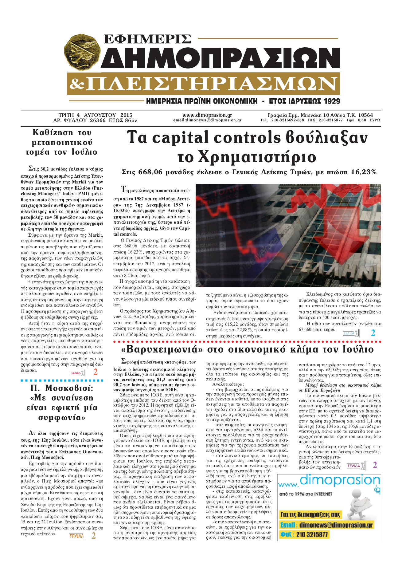 Οι οικονομικές εφημερίδες 4/8/2015 Enikos Newsroom 06:50, Τρίτη 04 Αυγούστου 2015 Media Διαβάστε τα σημερινά πρωτοσέλιδα των οικονομικών εφημερίδων: ΟΙΚΟΝΟΜΙΚΕΣ ΕΦΗΜΕΡΙΔΕΣ ΠΡΩΤΟΣΕΛΙΔΑ Μοιράσου το: σχολίασε κι εσύ (0 σχόλια) Ακολουθήστε το enikos.gr στο Google News και μάθετε πρώτοι όλες τις ειδήσεις Δείτε όλες τις τελευταίες ειδήσεις από την Ελλάδα και τον Κόσμο στο enikos.gr Ειδήσεις Ροή Ειδήσεων 3 ώρες πριν Αυξάνουν την πίεση προς την κυβέρνηση οι αγρότες: Κλείνουν παρακαμπτήριους και ανοίγουν διόδια – Τι θα γίνει τις γιορτές 2 ώρες πριν ΟΠΕΚΕΠΕ: Προφυλακιστέος ο φερόμενος αρχηγός και ο λογιστής της εγκληματικής οργάνωσης 3 ώρες πριν Φοινικούντα: Το Σάββατο απολογείται ο 30χρονος γιος γνωστού επιχειρηματία της Πλάκας που παραδόθηκε – Όσα είπε στους αστυνομικούς και ο ρόλος του στο έγκλημα 2 ώρες πριν Μπορεί ο Μαδούρο να αντέξει τον αποκλεισμό του Τραμπ; Τι θα χρειαστεί η Ουάσινγκτον για να τον ανατρέψει 4 ώρες πριν Πρίγκιπας Ουίλιαμ – Κέιτ: Η νέα οικογενειακή φωτογραφία για τις Χριστουγεννιάτικες κάρτες του 2025 3 ώρες πριν Ύπνος: Η απλή βραδινή ρουτίνα για να προστατεύσετε τα μαλλιά σας από το κρύο κατά τη διάρκεια του χειμώνα 4 ώρες πριν Manifesting: Πώς να συναντήσετε τον σύντροφο της ζωής σας, ανάλογα με τον μήνα γέννησής σας 2 ημέρες πριν 20 χρόνια τα Χριστούγεννα ξεκινούν στα Public με μεγάλη ποικιλία σε δώρα! 2 ώρες πριν Αρχαιολόγοι ανακάλυψαν ρωμαϊκά τεχνουργήματα από μια πόλη που δεν υπήρξε ποτέ – Τα τρία εντυπωσιακά κτίρια και ο αμφορέας με τις… σαρδέλες 2 λεπτά πριν Σύνοδος Κορυφής στις Βρυξέλλες: Ακόμη πιο κοντά σε διέξοδο για τη χρηματοδότηση της Ουκρανίας 10 λεπτά πριν ΟΗΕ: Iστορική επίσκεψη του Συμβουλίου Ασφαλείας στη Δαμασκό – Mήνυμα Ελλάδας για συμπερίληψη και λογοδοσία 17 λεπτά πριν Νέος πρέσβης της Μεγάλης Βρετανίας στις ΗΠΑ ο Κρίστιαν Τέρνερ 21 λεπτά πριν Conference League: Με Νόα, Ντρίτα, Άλκμααρ ή Τσέλιε στους «16» η ΑΕΚ 29 λεπτά πριν Conference League: Απευθείας στους «16» η ΑΕΚ Λάρνακας και η Ρακόβ των Σβάρνα και Κωνσταντόπουλου – Τα αποτελέσματα και η βαθμολογία, 3η η ΑΕΚ ENIKOS NETWORK Σε περίοδο αυξημένης δραστηριότητας η γρίπη στην Ελλάδα-Μέτρα προστασίας από τον ΕΟΔΥ Σκέφτεστε συνέχεια συζητήσεις που έχετε κάνει; Τι σημαίνει αυτό, σύμφωνα με ειδικό Στεγαστικό: Τι λέει η ΠΟΜΙΔΑ για τα νέα μέτρα που ανακοίνωσε ο Κυριάκος Μητσοτάκης Λαγκάρντ: Αισιόδοξη για την ανάπτυξη της Ευρωζώνης, αβέβαιη για τον πληθωρισμό Χαρτογραφώντας το «σημείο χωρίς επιστροφή»: Για πρώτη φορά αποκαλύπτεται με λεπτομέρεια το ακανθώδες όριο της ατμόσφαιρας τ... Η Google καταργεί τη λειτουργία «dark web report» – Πώς θα μπορούν οι χρήστες να διαγράφουν τα δεδομένα τους περισσότερα 17:45 , Πέμπτη 18 Δεκεμβρίου 2025 ROUK ZOUK: Εορταστικό επεισόδιο με καλεσμένους τους πρωταγωνιστές του «Γιατί ρε πατέρα» Το Σάββατο 20 Δεκεμβρίου στις 21:00, η Ζέτα Μακρυπούλια υποδέχεται εκλεκτούς ηθοποιούς που όλο... 17:20 , Πέμπτη 18 Δεκεμβρίου 2025 Άγιος έρωτας: Η Χριστίνα εξομολογείται στον πατέρα Νικόλαο, απόψε στις 21:00 στον Alpha Η Νότα αποφασίζει να εκδικηθεί τον Πέτρο και τον Στέφανο, για χάρη του Λούη, όμως τα πράγματα ... 16:50 , Πέμπτη 18 Δεκεμβρίου 2025 Να μ’ αγαπάς: Ζωή και Φωτεινή συμφιλιώνονται ως μάνα με κόρη, απόψε στις 20:00 Η ταυτότητα του Άγγελου αποκαλύπτεται στο νέο επεισόδιο της σειράς “Να μ’ αγαπάς... 15:52 , Πέμπτη 18 Δεκεμβρίου 2025 Το Σπίτι Δίπλα Στο Ποτάμι: Το καθηλωτικό τελευταίο επεισόδιο για το 2025 απόψε στις 22:30 Καθηλώνει το σημερινό επεισόδιο τη