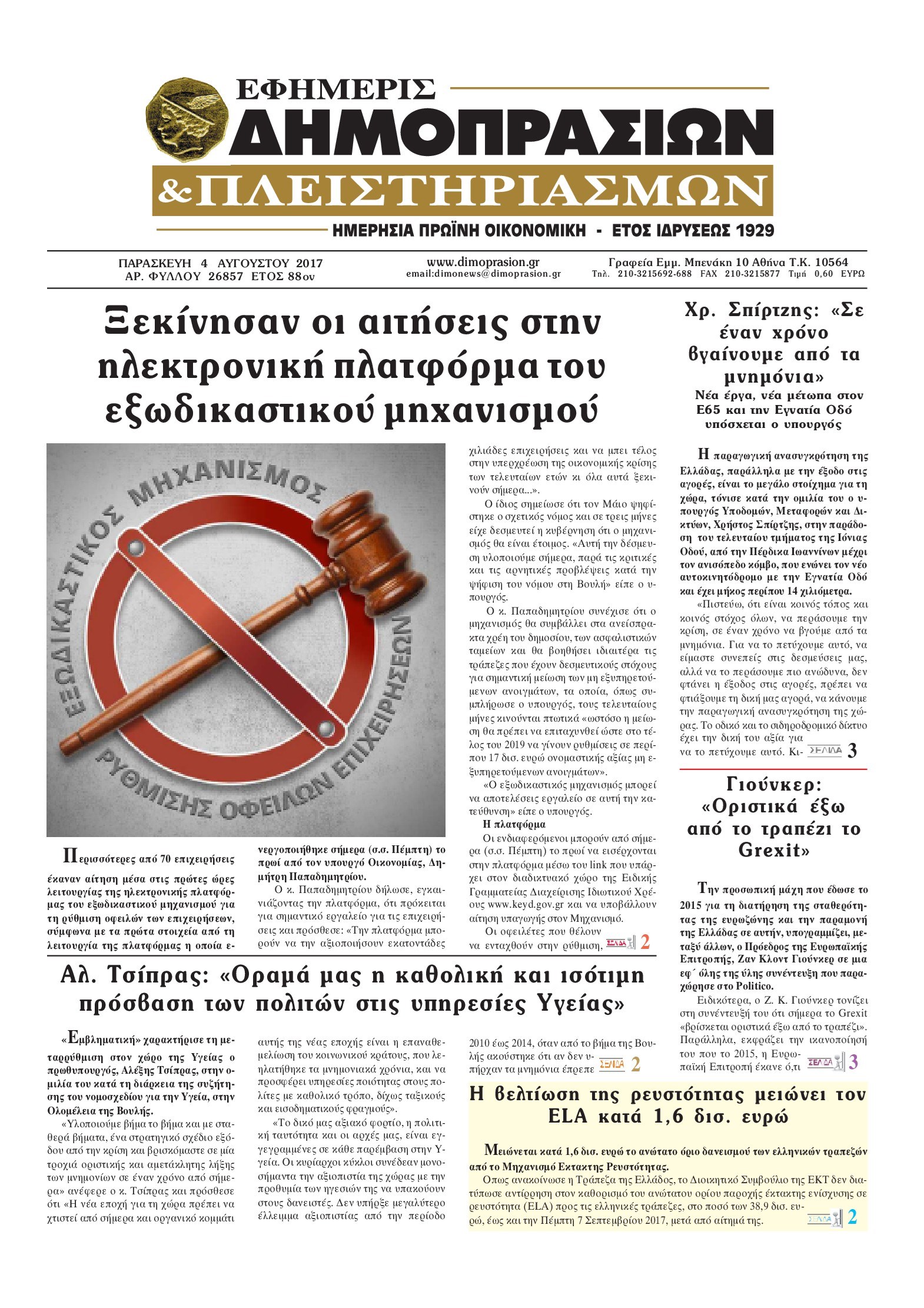 Οι οικονομικές εφημερίδες 4/8/2017 Κώστας Τεό 06:50, Παρασκευή 04 Αυγούστου 2017 Media Διαβάστε τα σημερινά πρωτοσέλιδα των οικονομικών εφημερίδων: ΟΙΚΟΝΟΜΙΚΕΣ ΕΦΗΜΕΡΙΔΕΣ ΠΡΩΤΟΣΕΛΙΔΑ Μοιράσου το: σχολίασε κι εσύ (0 σχόλια) Ακολουθήστε το enikos.gr στο Google News και μάθετε πρώτοι όλες τις ειδήσεις Δείτε όλες τις τελευταίες ειδήσεις από την Ελλάδα και τον Κόσμο στο enikos.gr Ειδήσεις Ροή Ειδήσεων 1 ώρα πριν Μεσόγειος: Η διαδρομή του ρωσικού τάνκερ «Qendil» και η στοχευμένη επίθεση της Ουκρανίας με drone – Ο Πούτιν προειδοποίησε για αντίποινα 1 ώρα πριν Αττική: Θρίλερ με νεκρό βρέφος 5 μηνών – Κοιμόταν στο ίδιο κρεβάτι με τους γονείς του 2 ώρες πριν Από το Ορμένιο ως τα Μάλγαρα κι από τη Σιάτιστα μέχρι τη Νίκαια: Μπλόκα σε όλη την Ελλάδα – Το Σάββατο ανοίγουν τα διόδια οι αγρότες 2 ώρες πριν «Έλληνας Εσκομπάρ»: Φωτογραφίες με τους 4 τόνους κοκαΐνης που κατασχέθηκαν από το σκάφος «Ουρανία» 4 ώρες πριν Πούτιν: Σαρκαστικά μηνύματα, παράπονα και απρόοπτα στη συνέντευξη Τύπου – Η πρόταση γάμου on air και οι ερωτήσεις για τα αγγούρια και τους… εξωγήινους 3 ώρες πριν Τα 5 ζώδια που ευνοούνται στην ερωτική ζωή τους την επόμενη εβδομάδα – «Η ενέργεια του Αιγόκερου φέρνει αγάπη και σταθερότητα» 7 ώρες πριν Ειδικός μοιράζεται 6 κόλπα για να διατηρείστε σε φόρμα με πάνω από 40 ώρες εργασίας την εβδομάδα: «Προπονηθείτε πριν από τη δουλειά, όχι μετά» 4 ώρες πριν Αυτό το έξυπνο μαθηματικό κόλπο θα μπορούσε να αλλάξει τον τρόπο με τον οποίο οι επιστήμονες μελετούν τους σεισμούς 2 ώρες πριν Κουίζ για την παλιά Αθήνα: Αναγνωρίζετε την περιοχή; Έχετε περάσει 100% από εκεί 3 λεπτά πριν ΗΠΑ: Νέος γύρος συνομιλιών στο Μαϊάμι – Σήμερα συνάντηση Γουίτκοφ με Ουκρανούς και Ευρωπαίους διαπραγματευτές, το Σαββατοκύριακο με Ρώσους αξιωματούχους 8 λεπτά πριν Νέα σειρά γραμματοσήμων «ΕΛΠΙΔΑ-Μαριάννα Β. Βαρδινογιάννη» 12 λεπτά πριν Ιταλία: Με εισιτήριο από την 1η Φεβρουαρίου 2026 η πρόσβαση στη Φοντάνα ντι Τρέβι – Πόσο θα κοστίζει 20 λεπτά πριν Μήπως έχετε χάσει τον εαυτό σας στη σχέση σας; 7 «αθόρυβες» υποχωρήσεις που μάλλον κάνατε, χωρίς να το συνειδητοποιήσετε 26 λεπτά πριν Λάρισα: Ασθενοφόρο έπεσε πάνω σε κλούβα της ΕΛ.ΑΣ στον Πλατύκαμπο – Τραυματίστηκε ο συνοδηγός – ΒΙΝΤΕΟ ENIKOS NETWORK «Η σούπερ» γρίπη εξαπλώνεται στην Ευρώπη-Στοιχεία από το ECDC για την αποτελεσματικότητα του εμβολίου ΕΛΣΤΑΤ: Αύξηση κατά 1,7% των επαγγελματιών υγείας το 2024 Προκήρυξη ΑΣΕΠ για 397 μόνιμες προσλήψεις στο Δημόσιο: Βγήκαν τα προσωρινά αποτελέσματα – Πότε αρχίζει η υποβολή ενστάσεων Η απάντηση της κυβέρνησης στα αιτήματα των αγροτών: 16 έχουν ικανοποιηθεί, 4 βρίσκονται υπό επεξεργασία και 7 δεν είναι εφι... Χαρτογραφώντας το «σημείο χωρίς επιστροφή»: Για πρώτη φορά αποκαλύπτεται με λεπτομέρεια το ακανθώδες όριο της ατμόσφαιρας τ... Η Google καταργεί τη λειτουργία «dark web report» – Πώς θα μπορούν οι χρήστες να διαγράφουν τα δεδομένα τους περισσότερα 18:11 , Παρασκευή 19 Δεκεμβρίου 2025 Το σόι σου: Ο Άρης έρχεται στην Ελλάδα για τις γιορτές των Χριστουγέννων – Τι θα δούμε στο αποψινό εορταστικό επεισόδιο Ένα απολαυστικό, εορταστικό επεισόδιο της σειράς “Το σόι σου”, γεμάτο ευτράπελα αλ... 15:15 , Παρασκευή 19 Δεκεμβρίου 2025 Την Κυριακή με τη Realnews: Ό,τι και αν αγοράσεις, σκανάρεις και κερδίζεις! Την Κυριακή με τη Realnews: Ό,τι και αν αγοράσεις, σκανάρεις και κερδίζεις! Με το PADU app, το... 08:00 , Παρασκευή 19 Δεκεμβρίου 2025 Την Κυριακή με τη Realnews: Δωροεπιταγή 10€ Δωροεπιταγ