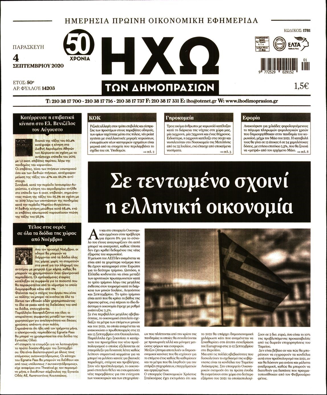 Οι οικονομικές εφημερίδες 4/9/2020 Διονύσης Νίκκας 06:44, Παρασκευή 04 Σεπτεμβρίου 2020 Media Διαβάστε τα πρωτοσέλιδα των οικονομικών εφημερίδων… ΟΙΚΟΝΟΜΙΚΕΣ ΕΦΗΜΕΡΙΔΕΣ Μοιράσου το: σχολίασε κι εσύ (0 σχόλια) Ακολουθήστε το enikos.gr στο Google News και μάθετε πρώτοι όλες τις ειδήσεις Δείτε όλες τις τελευταίες ειδήσεις από την Ελλάδα και τον Κόσμο στο enikos.gr Ειδήσεις Ροή Ειδήσεων 5 ώρες πριν Μεσόγειος: Η διαδρομή του ρωσικού τάνκερ «Qendil» και η στοχευμένη επίθεση της Ουκρανίας με drone – Ο Πούτιν προειδοποίησε για αντίποινα 1 ώρα πριν Αγρότες: Έκλεισαν για μία ώρα την παρακαμπτήρια της Ιόνιας Οδού στη θέση Χαλίκι 3 ώρες πριν Εμπλοκή και αερομαχίες με οπλισμένα τουρκικά F-16 στο Αιγαίο 3 ώρες πριν Πούτιν: «Ναι, είμαι ερωτευμένος» – Βίντεο από τη σπάνια προσωπική παραδοχή του 1 ώρα πριν Ανδρέας Λυκουρέντζος: Υπέβαλε την παραίτησή του ο πρόεδρος του ΕΛΓΑ, αλλά δεν έγινε δεκτή – Όλο το παρασκήνιο 1 ώρα πριν Αριθμολογία: Οι άνθρωποι που έχουν γεννηθεί αυτές τις 4 ημερομηνίες, συχνά παρεξηγούνται – «Η καλοσύνη τους κρύβει τεράστια δύναμη» 3 ώρες πριν Μήπως έχετε χάσει τον εαυτό σας στη σχέση σας; 7 «αθόρυβες» υποχωρήσεις που μάλλον κάνατε, χωρίς να το συνειδητοποιήσετε 2 ώρες πριν Ξεχάστε το καθάρισμα το Σαββατοκύριακο: Ο «κανόνας των 20 λεπτών» που θα σας λύσει τα χέρια 5 ώρες πριν Κουίζ για την παλιά Αθήνα: Αναγνωρίζετε την περιοχή; Έχετε περάσει 100% από εκεί 6 λεπτά πριν Βασίλης Καρράς: «Είναι πάντα δίπλα μου, δεν έφυγε…», λέει ο αδελφός του 11 λεπτά πριν Ουκρανία: Η άνευ προηγουμένου επίθεση σε ρωσικό τάνκερ στη Μεσόγειο και το μήνυμα προς στον Πούτιν – Το «μακρύ χέρι» του Κιέβου 17 λεπτά πριν Τραμπ: Δεν αποκλείει την πιθανότητα ενός πολέμου στη Βενεζουέλα – «Ο Μαδούρο ξέρει καλύτερα από τον καθένα τι ακριβώς θέλω» 18 λεπτά πριν Κηφισιά: Με πολλές απουσίες κόντρα στον Ολυμπιακό – «Last dance» για τον Τεττέη 26 λεπτά πριν Ύπνος: Μια κρυφή κατάσταση του εγκεφάλου πριν από τον ύπνο μπορεί να είναι το “κλειδί” για υψηλή ευφυΐα και δημιουργικότητα ENIKOS NETWORK Το ΕΚΑΒ τιμήθηκε από την Ακαδημία Αθηνών για τα 40 χρόνια προσφοράς του Έχετε πραγματικά μεγάλη καρδιά; 10 χαρακτηριστικά όσων έχουν καλοσύνη ΑΑΔΕ: Νέες αναβαθμίσεις στο Ψηφιακό Πελατολόγιο και την εφαρμογή myDATAapp – Τι πρέπει να γνωρίζετε Όμιλος ΔΕΗ: Νέα ορόσημα και ενισχυμένη διαφάνεια στην ετήσια Έκθεση Βιώσιμης Ανάπτυξης Χαρτογραφώντας το «σημείο χωρίς επιστροφή»: Για πρώτη φορά αποκαλύπτεται με λεπτομέρεια το ακανθώδες όριο της ατμόσφαιρας τ... Η Google καταργεί τη λειτουργία «dark web report» – Πώς θα μπορούν οι χρήστες να διαγράφουν τα δεδομένα τους περισσότερα 20:37 , Παρασκευή 19 Δεκεμβρίου 2025 Don’t Forget The Lyrics: Η Έλλη Κοκκίνου υποδέχεται 4 παίκτες που θα κάνουν τα πάντα για να μη χάσουν ούτε… μισή λέξη από τους στίχους Το «Don’t Forget The Lyrics» επιστρέφει απόψε, Παρασκευή 19 Δεκεμβρίου, στις 21:00 με νέο επει... 19:31 , Παρασκευή 19 Δεκεμβρίου 2025 GNTM: Απόψε ο μεγάλος τελικός για τους 4 φιναλίστ Έπειτα από μήνες γεμάτους μόδα, δημιουργία και έντονες αναμετρήσεις, το GNTM 2025 κορυφώνεται,... 18:11 , Παρασκευή 19 Δεκεμβρίου 2025 Το σόι σου: Ο Άρης έρχεται στην Ελλάδα για τις γιορτές των Χριστουγέννων – Τι θα δούμε στο αποψινό εορταστικό επεισόδιο Ένα απολαυστικό, εορταστικό επεισόδιο της σειράς “Το σόι σου”, γεμάτο ευτράπελα αλ... 15:15 , Παρασκευή 19 Δεκεμβρίου 2025 Την Κυριακή με τη Realnews: Ό,τι και αν αγοράσεις, σκανάρεις και κερδίζεις! Την Κυριακή με τη Realnews: Ό,τι και αν αγορά