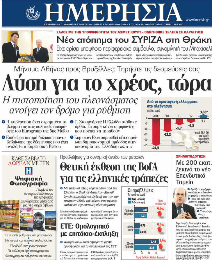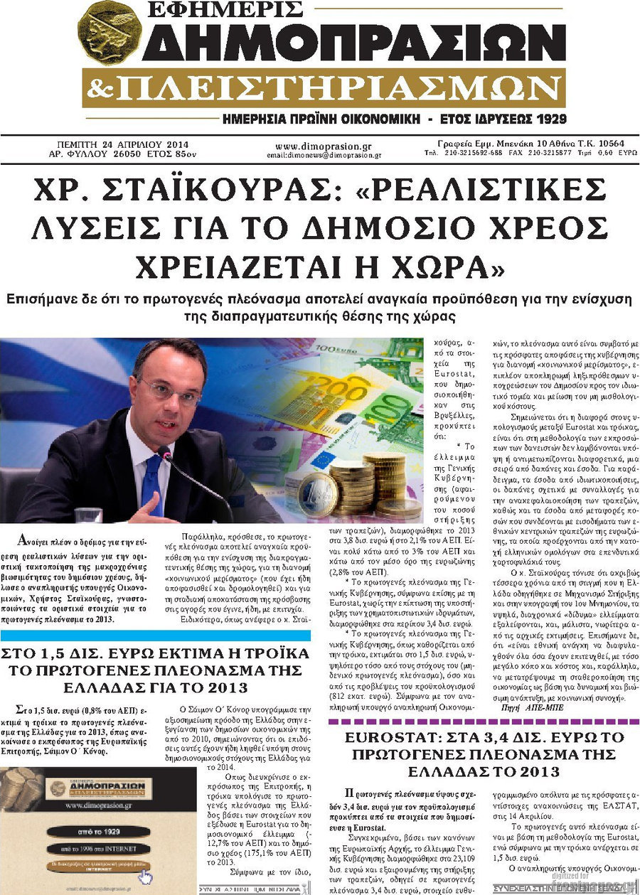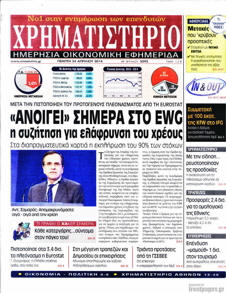 Οι οικονομικές εφημερίδες Enikos Newsroom 07:56, Πέμπτη 24 Απριλίου 2014 Media Οι οικονομικές εφημερίδες Διαβάστε τα πρωτοσέλιδα των οικονομικών εφημερίδων: ΟΙΚΟΝΟΜΙΚΕΣ ΕΦΗΜΕΡΙΔΕΣ ΠΡΩΤΟΣΕΛΙΔΑ Μοιράσου το: σχολίασε κι εσύ (0 σχόλια) Ακολουθήστε το enikos.gr στο Google News και μάθετε πρώτοι όλες τις ειδήσεις Δείτε όλες τις τελευταίες ειδήσεις από την Ελλάδα και τον Κόσμο στο enikos.gr Ειδήσεις Ροή Ειδήσεων 33 λεπτά πριν Live streaming – Ο Μάκης Βορίδης στο στούντιο του Realfm 97,8 σε μια εφ’ όλης της ύλης συνέντευξη στον Νίκο Χατζηνικολάου 59 λεπτά πριν Κατρίνης: «Ο μικρός μου γιος οδηγούσε χωρίς δίπλωμα, πράξη αδικαιολόγητη και παράνομη – Ο νόμος ισχύει για όλους» 48 λεπτά πριν ΕΕ: Η Κομισιόν παρουσιάζει σήμερα σχέδιο για την αντιμετώπιση της στεγαστικής κρίσης – Προτείνει πλαφόν στα Airbnb 1 ώρα πριν Κυβέρνηση: Αγώνας για γιορτές χωρίς μπλόκα – Τι συζητά και τι απορρίπτει το Μαξίμου 18 λεπτά πριν Βίντεο: Κατέρρευσε άγαλμα στη Βραζιλία λόγω ισχυρών ανέμων – Καρέ καρέ η δραματική πτώση του 2 ώρες πριν Τέλος η μοναξιά για 3 ζώδια μετά τις 16 Δεκεμβρίου – «Ξαναβρίσκετε τον εαυτό σας» 4 ώρες πριν Ανακαλύφθηκε περίτεχνη μαρμάρινη μπανιέρα που επαναχρησιμοποιήθηκε ως κρήνη 3 ώρες πριν Η πεθερά της την κατηγορεί πως δεν την ταΐζει σωστά – «Δεν παραπονιέται όμως στον γιο της» 43 λεπτά πριν Οι άνθρωποι που φαίνονται «τυχεροί» στη ζωή τους, συνήθως έχουν αυτές τις 8 αθόρυβες συνήθειες 3 λεπτά πριν WSJ: Η Ευρώπη προετοιμάζει τους πολίτες της για πόλεμο με τη Ρωσία – Η «γκρίζα ζώνη» της Μόσχας και το τέλος του εφησυχασμού 8 λεπτά πριν Χάος σε σχολείο της Γλυφάδας: Βάζουν φωτιά σε αίθουσες και πετάνε θρανία από σκάλες – ΒΙΝΤΕΟ 13 λεπτά πριν ΔΥΠΑ: Από αύριο η προπληρωμή επιδομάτων, παροχών και Δώρου Χριστουγέννων 18 λεπτά πριν Βίντεο: Κατέρρευσε άγαλμα στη Βραζιλία λόγω ισχυρών ανέμων – Καρέ καρέ η δραματική πτώση του 23 λεπτά πριν Αγρότες στα τελωνεία: Μπλόκο σε δύο φάσεις στους Ευζώνους – Πολύωροι αποκλεισμοί σε Νίκη, Προμαχώνα και Εξοχή ENIKOS NETWORK Οι ρίζες της άνοιας ίσως βρίσκονται στην παιδική ηλικία – Τι έδειξαν πρόσφατες μελέτες Όμιλος ΠΡΟΣΥΦΑΠΕ: Επιστρέφει στην κοινωνία τμήμα της υπεραξίας που παράγει Βουλή: Σήμερα η ψήφιση του προϋπολογισμού με τα νέα μέτρα για τη στέγη – Ποιοι είναι οι δημοσιονομικοί και αναπτυξιακοί στ... Επιδόματα της ΔΥΠΑ και Δώρο Χριστουγέννων: Από αύριο η προπληρωμή τους Σύγχρονος Νοστράδαμος: Προειδοποιεί για «μεγάλο γεγονός» τους επόμενους μήνες που θα συγκλονίσει τη Βρετανία και τον κόσμο Τεστ παρατηρητικότητας: Μπορείτε να βρείτε τις 3 διαφορές στις εικόνες με έναν πιγκουίνο σε 14 δευτερόλεπτα περισσότερα 09:58 , Τρίτη 16 Δεκεμβρίου 2025 LIVE – Ακούστε την εκπομπή του Νίκου Χατζηνικολάου 16/12/2025 Ακούστε την εκπομπή του Νίκου Χατζηνικολάου, στον Realfm 97,8. Ακούστε LIVE εδώ 09:26 , Τρίτη 16 Δεκεμβρίου 2025 Τηλεθέαση (15/12): Τα νούμερα για την prime time – Ποιες σειρές ξεχώρισαν Ξεκάθαρη πρωτιά στην τηλεθέαση κατέκτησε η σειρά «Μια νύχτα μόνο», η οποία βρέθηκε στην κορυφή... 08:00 , Τρίτη 16 Δεκεμβρίου 2025 Την Κυριακή με τη Realnews: Δωροεπιταγή 10€ Δωροεπιταγή αξίας 10€ για αγορές άνω των 60€ από τα πολυκαταστήματα FactoryOutlet H προσφορά ι... 05:48 , Τρίτη 16 Δεκεμβρίου 2025 Οι οικονομικές εφημερίδες 16/12/2025 Διαβάστε τα πρωτοσέλιδα από τις οικονομικές εφημερίδες, σήμερα 16/12/2025. ΤΕΛΕΥΤΑΙΕΣ ΕΙΔΗΣΕΙΣ 3 λεπτά πριν WSJ: Η Ευρώπη προετοιμάζει τους πολίτες της για πόλεμο... 8 λεπτά πριν Χάος σε σχολείο της Γλυφάδας: Βάζουν φωτιά