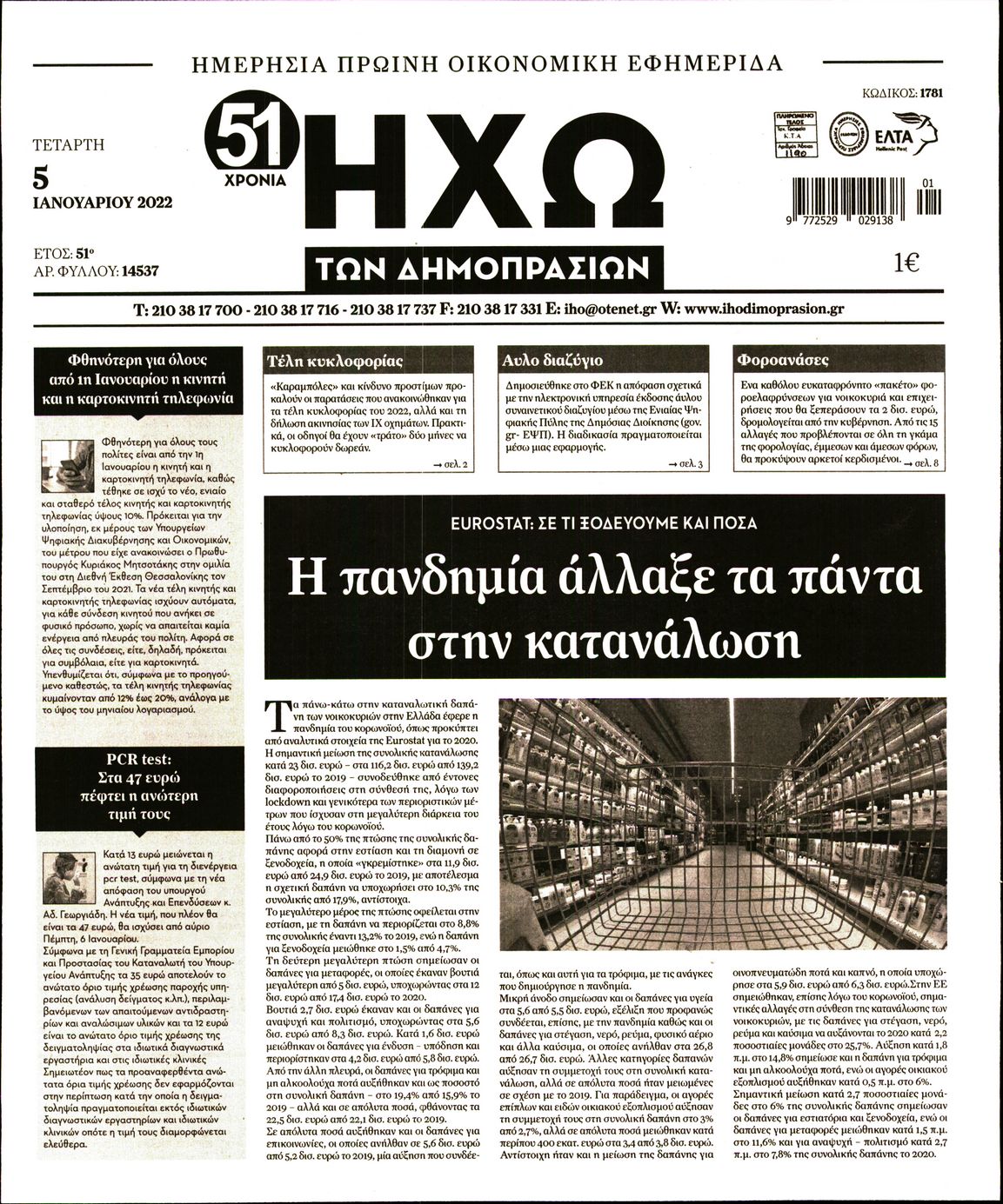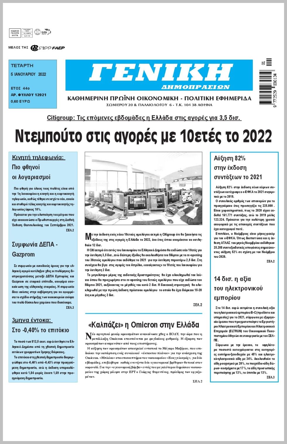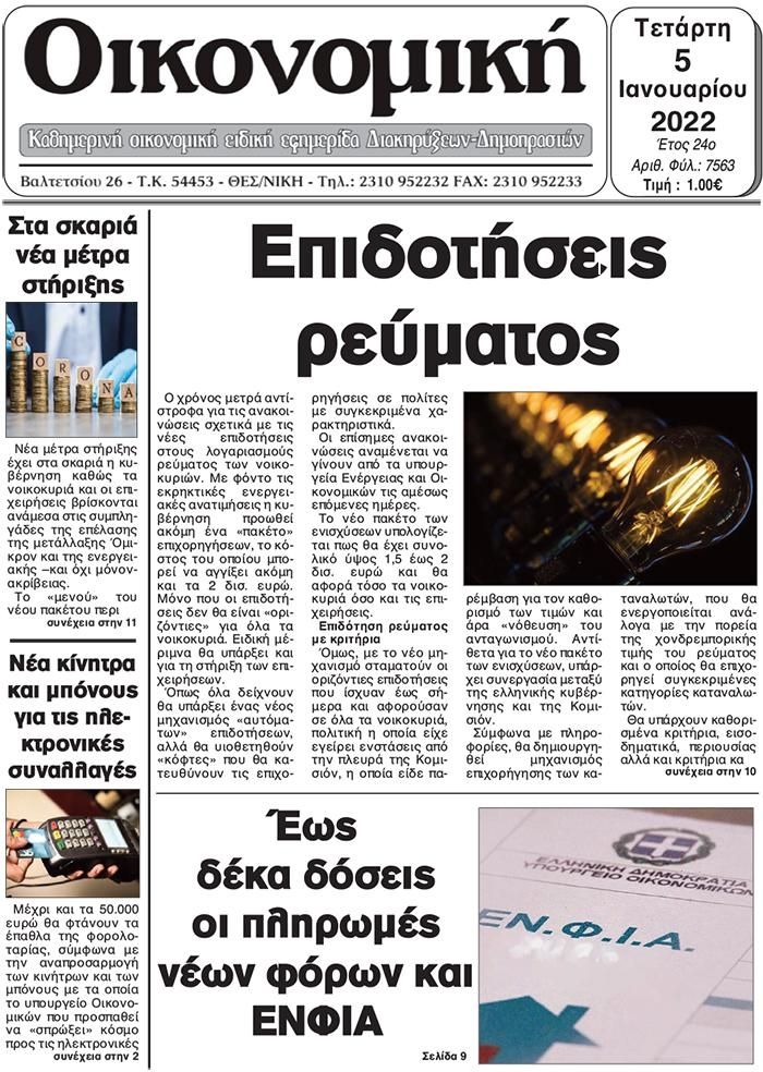 Οι οικονομικές εφημερίδες 5/1/2022 Διονύσης Νίκκας 06:44, Τετάρτη 05 Ιανουαρίου 2022 Media Διαβάστε τα πρωτοσέλιδα από τις οικονομικές εφημερίδες… ΟΙΚΟΝΟΜΙΚΕΣ ΕΦΗΜΕΡΙΔΕΣ Μοιράσου το: TikTok: Κραυγή αγωνίας νοσηλεύτριας στον Ευαγγελισμό – “Είμαστε δύο νοσηλευτές για 46 ασθενείς” Survivor: Αυτοί είναι οι τρεις υποψήφιοι προς αποχώρηση από τους “Διάσημους” Άγιο Όρος: Πέθανε σε ηλικία 72 ετών από κορονοϊό ο μοναχός Τιμόθεος σχολίασε κι εσύ (0 σχόλια) Ακολουθήστε το enikos.gr στο Google News και μάθετε πρώτοι όλες τις ειδήσεις Δείτε όλες τις τελευταίες ειδήσεις από την Ελλάδα και τον Κόσμο στο enikos.gr Ειδήσεις Ροή Ειδήσεων 7 ώρες πριν Μητσοτάκης: Αναγκαία η μεταρρύθμιση του πρωτογενούς τομέα – Τα 6 νέα μέτρα για το στεγαστικό και οι αναφορές σε «Ιθάκη» και «πολιτικούς του καναπέ» 6 ώρες πριν Δάνεια σε ελβετικό φράγκο: Τα βασικά σημεία της ρύθμισης – ανάσας για 40.000 δανειολήπτες – Αναλυτικός οδηγός με ερωτήσεις και απαντήσεις 6 ώρες πριν Κυψέλη: Εξιτήριο πήρε η 14χρονη μαθήτρια που μαχαιρώθηκε από την 16χρονη σε σχολείο – «Θέλω να βοηθήσω το παιδί, έχει μπλέξει με κακές παρέες» 5 ώρες πριν Τραμπ: Γιατί κατέθεσε τώρα την αγωγή κατά του BBC – Πώς η κίνησή του εξυπηρετεί το νέο δόγμα του για «αντίσταση» στην Ευρώπη, υπέρ των συντηρητικών 6 ώρες πριν ΟΠΕΚΕΠΕ – Παράνομες επιδοτήσεις: Ελεύθεροι με περιοριστικούς όρους και οι 7 κατηγορούμενοι που απολογήθηκαν σήμερα 5 ώρες πριν Ανακαλύφθηκε βυθισμένη πέτρινη κατασκευή ανοιχτά της Κριμαίας – Αποτελεί μέρος αρχαίας ελληνικής αποικίας 6 ώρες πριν Ύπνος: Αυτό μπορεί να είναι το χειρότερο λάθος για το βιολογικό ρολόι σας, σύμφωνα με ειδικό 7 ώρες πριν Αριθμολογία: Οι άνθρωποι που έχουν γεννηθεί αυτές τις 3 ημερομηνίες, προσελκύουν μεγάλη τύχη πριν από το τέλος του 2025 9 ώρες πριν Οι 7 συμπεριφορές που μαρτυρούν ότι ένας άνδρας επενδύει μακροπρόθεσμα σε μια σχέση 5 λεπτά πριν Ρωσία: Ουκρανική επίθεση με drones στο Κρασνοντάρ – Δύο τραυματίες, ζημιές σε σπίτια και διακοπή ρεύματος 13 λεπτά πριν Αντόνιο Ταγιάνι: Νομικά εμπόδια για τη χρήση των ρωσικών κεφαλαίων υπέρ της Ουκρανίας 21 λεπτά πριν Pornhub: «Χτυπήθηκε» από χάκερς -Υπέκλεψαν ευαίσθητα δεδομένα από premium χρήστες 36 λεπτά πριν Κυριάκος Πιερρακάκης: Γευμάτισε σε ταβέρνα με το οικονομικό επιτελείο και τους δημοσιογράφους μετά την ψήφιση του Προϋπολογισμού 51 λεπτά πριν Ντόναλντ Τραμπ: Ξένη τρομοκρατική οργάνωση η Βενεζουέλα – Πλήρης αποκλεισμός των δεξαμενόπλοιων από και προς το Καράκας ENIKOS NETWORK Αίτημα ΙΣΑ για την εξαίρεση των προσωπικών γιατρών από τις κατ’ οίκον επισκέψεις Η σκανδιναβική μέθοδος στον ύπνο που μπορεί να σώσει έναν γάμο Πιερρακάκης: Ο προϋπολογισμός συμβάλλει ουσιαστικά στην ενίσχυση της αγοραστικής δύναμης της πλειονότητας των εργαζομένων e-ΕΦΚΑ: Παρατείνεται η προθεσμία για την υποβολή ΑΠΔ – Ποιους αφορά Σύγχρονος Νοστράδαμος: Προειδοποιεί για «μεγάλο γεγονός» τους επόμενους μήνες που θα συγκλονίσει τη Βρετανία και τον κόσμο Τεστ παρατηρητικότητας: Μπορείτε να βρείτε τις 3 διαφορές στις εικόνες με έναν πιγκουίνο σε 14 δευτερόλεπτα περισσότερα 20:06 , Τρίτη 16 Δεκεμβρίου 2025 Ο ΣΚΑΙ καταγγέλλει τον ΕΚΚΟΜΕΔ Επιστολή με την οποία καταγράφει την έντονη διαμαρτυρία του προς τον διευθύνοντα σύμβουλο του... 17:40 , Τρίτη 16 Δεκεμβρίου 2025 Eurovision: Στις 4 Ιανουαρίου αποκαλύπτονται τα 28 τραγούδια του ελληνικού τελικού Η αγωνία τελειώνει, η γιορτή της Eurovision αρχίζει στην ΕΡΤ από τις πρώ