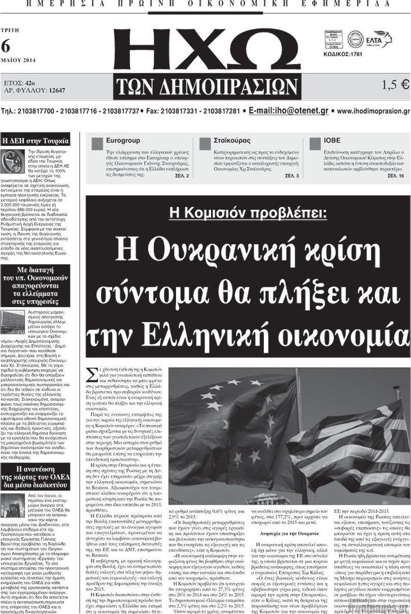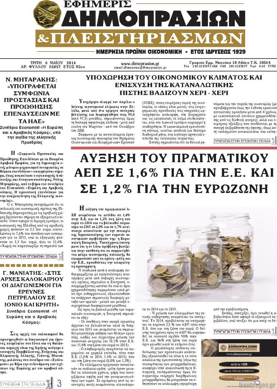 Οι oικονομικές εφημερίδες Enikos Newsroom 08:52, Τρίτη 06 Μαΐου 2014 Media Οι oικονομικές εφημερίδες Διαβάστε τα πρωτοσέλιδα των οικονομικών εφημερίδων: ΕΦΗΜΕΡΙΔΕΣ ΟΙΚΟΝΟΜΙΚΕΣ ΕΦΗΜΕΡΙΔΕΣ ΠΡΩΤΟΣΕΛΙΔΑ Μοιράσου το: σχολίασε κι εσύ (0 σχόλια) Ακολουθήστε το enikos.gr στο Google News και μάθετε πρώτοι όλες τις ειδήσεις Δείτε όλες τις τελευταίες ειδήσεις από την Ελλάδα και τον Κόσμο στο enikos.gr Ειδήσεις Ροή Ειδήσεων 5 ώρες πριν Μητσοτάκης: Αναγκαία η μεταρρύθμιση του πρωτογενούς τομέα – Τα 6 νέα μέτρα για το στεγαστικό και οι αναφορές σε «Ιθάκη» και «πολιτικούς του καναπέ» 5 ώρες πριν Δάνεια σε ελβετικό φράγκο: Τα βασικά σημεία της ρύθμισης – ανάσας για 40.000 δανειολήπτες – Αναλυτικός οδηγός με ερωτήσεις και απαντήσεις 4 ώρες πριν Κυψέλη: Εξιτήριο πήρε η 14χρονη μαθήτρια που μαχαιρώθηκε από την 16χρονη σε σχολείο – «Θέλω να βοηθήσω το παιδί, έχει μπλέξει με κακές παρέες» 4 ώρες πριν Τραμπ: Γιατί κατέθεσε τώρα την αγωγή κατά του BBC – Πώς η κίνησή του εξυπηρετεί το νέο δόγμα του για «αντίσταση» στην Ευρώπη, υπέρ των συντηρητικών 5 ώρες πριν ΟΠΕΚΕΠΕ – Παράνομες επιδοτήσεις: Ελεύθεροι με περιοριστικούς όρους και οι 7 κατηγορούμενοι που απολογήθηκαν σήμερα 4 ώρες πριν Ανακαλύφθηκε βυθισμένη πέτρινη κατασκευή ανοιχτά της Κριμαίας – Αποτελεί μέρος αρχαίας ελληνικής αποικίας 5 ώρες πριν Ύπνος: Αυτό μπορεί να είναι το χειρότερο λάθος για το βιολογικό ρολόι σας, σύμφωνα με ειδικό 6 ώρες πριν Αριθμολογία: Οι άνθρωποι που έχουν γεννηθεί αυτές τις 3 ημερομηνίες, προσελκύουν μεγάλη τύχη πριν από το τέλος του 2025 8 ώρες πριν Οι 7 συμπεριφορές που μαρτυρούν ότι ένας άνδρας επενδύει μακροπρόθεσμα σε μια σχέση 9 λεπτά πριν Νίκος Πλακιάς: Η Μαρία Καρυστιανού πλέον θα κρίνεται ως πολιτικός και όχι ως συγγενής 25 λεπτά πριν Ντόναλντ Τραμπ: Κάλυψε απόλυτα την προσωπάρχη του Λευκού Οίκου: «Ναι, έχω προσωπικότητα αλκοολικού» 39 λεπτά πριν ΗΠΑ: Στην αγορά δύο Boeing 747-8 προχωρά η Πολεμική Αεροπορία για την υποστήριξη του προεδρικού στόλου 54 λεπτά πριν Ιταλία: Λεωφορείο έπεσε πάνω σε βιτρίνα καταστήματος στο Τορίνο – Τρεις τραυματίες 1 ώρα πριν Χαλάνδρι: Καθηγητής έπιασε με κόφτη τα δάχτυλα μαθητή σε κατάληψη – «Μου έχεις πιάσει το χέρι» ENIKOS NETWORK Αίτημα ΙΣΑ για την εξαίρεση των προσωπικών γιατρών από τις κατ’ οίκον επισκέψεις Η σκανδιναβική μέθοδος στον ύπνο που μπορεί να σώσει έναν γάμο Πιερρακάκης: Ο προϋπολογισμός συμβάλλει ουσιαστικά στην ενίσχυση της αγοραστικής δύναμης της πλειονότητας των εργαζομένων e-ΕΦΚΑ: Παρατείνεται η προθεσμία για την υποβολή ΑΠΔ – Ποιους αφορά Σύγχρονος Νοστράδαμος: Προειδοποιεί για «μεγάλο γεγονός» τους επόμενους μήνες που θα συγκλονίσει τη Βρετανία και τον κόσμο Τεστ παρατηρητικότητας: Μπορείτε να βρείτε τις 3 διαφορές στις εικόνες με έναν πιγκουίνο σε 14 δευτερόλεπτα περισσότερα 20:06 , Τρίτη 16 Δεκεμβρίου 2025 Ο ΣΚΑΙ καταγγέλλει τον ΕΚΚΟΜΕΔ Επιστολή με την οποία καταγράφει την έντονη διαμαρτυρία του προς τον διευθύνοντα σύμβουλο του... 17:40 , Τρίτη 16 Δεκεμβρίου 2025 Eurovision: Στις 4 Ιανουαρίου αποκαλύπτονται τα 28 τραγούδια του ελληνικού τελικού Η αγωνία τελειώνει, η γιορτή της Eurovision αρχίζει στην ΕΡΤ από τις πρώτες ημέρες της νέας χρ... 17:09 , Τρίτη 16 Δεκεμβρίου 2025 Alter Ego Media: Βαθύτατη θλίψη και ειλικρινή συλλυπητήρια για την απώλεια της Ειρήνης Μαρινάκη Τη βαθύτατη θλίψη και τα ειλικρινή συλλυπητήριά της εκφράζει η Alter Ego Media για τον θάνατο ... 13:00 , Τρίτη 16 Δεκεμβρίου 2025 «Στο Παρά Πέν