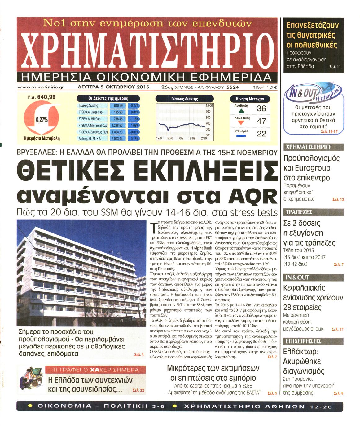 Οι οικονομικές εφημερίδες 5/10/2015 Enikos Newsroom 06:36, Δευτέρα 05 Οκτωβρίου 2015 Media Διαβάστε τα σημερινά πρωτοσέλιδα των οικονομικών εφημερίδων: ΟΙΚΟΝΟΜΙΚΕΣ ΕΦΗΜΕΡΙΔΕΣ ΠΡΩΤΟΣΕΛΙΔΑ Μοιράσου το: σχολίασε κι εσύ (0 σχόλια) Ακολουθήστε το enikos.gr στο Google News και μάθετε πρώτοι όλες τις ειδήσεις Δείτε όλες τις τελευταίες ειδήσεις από την Ελλάδα και τον Κόσμο στο enikos.gr Ειδήσεις Ροή Ειδήσεων 2 ώρες πριν Αγρότες: Πολύωροι αποκλεισμοί στα τελωνεία Προμαχώνα, Εξοχής, Ευζώνων και Νίκης – Κλείνουν τον κόμβο Φιλώτα οι παραγωγοί στη Δυτική Μακεδονία 2 ώρες πριν Νίκος Παππάς: Ζητώ συγγνώμη για αυτό το επεισόδιο – Δεν τον γρονθοκόπησα 1 ώρα πριν Πούτιν: Η Ουκρανία δεν είναι έτοιμη για ειρηνευτικές συνομιλίες – ο ρωσικός στρατός προελαύνει σε όλα τα μέτωπα 42 λεπτά πριν Κρήτη: Στο Ρέθυμνο μεταφέρονται οι εκατοντάδες μετανάστες που διασώθηκαν ανοιχτά της Γαύδου 2 ώρες πριν Τρομακτικό βίντεο: Η στιγμή της έκρηξης στο τζετ που μετέφερε τον οδηγό του NASCAR, Γκρεγκ Μπιφλ και την οικογένειά του 3 ώρες πριν Αλλαγή σελίδας για 3 ζώδια – «Μία δύσκολη περίοδος φτάνει στο τέλος της» 2 ημέρες πριν 20 χρόνια τα Χριστούγεννα ξεκινούν στα Public με μεγάλη ποικιλία σε δώρα! 2 ώρες πριν Γεμάτος νεροχύτης; 5 σοβαρές ευθύνες που «φοβίζουν» όσους αφήνουν άπλυτα πιάτα 47 λεπτά πριν Ειδικός μοιράζεται 6 κόλπα για να διατηρείστε σε φόρμα με πάνω από 40 ώρες εργασίας την εβδομάδα: «Προπονηθείτε πριν από τη δουλειά, όχι μετά» 6 λεπτά πριν Αγρότες: Παραμένουν στα μπλόκα και ενισχύουν τις δράσεις τους σε Ημαθία, Πέλλα, Πιερία και Καβάλα 12 λεπτά πριν Γιώργος Μαζωνάκης: «Φοβόταν, θεώρησα ότι έπρεπε να τον προστατεύσω» – Τι λέει η τραγουδίστρια, Νωαίνα για τον Στέφανο Παπαδόπουλο 17 λεπτά πριν Βελόπουλος: Ό,τι και να κάνουν στην κυβέρνηση, όλοι οι υπαίτιοι του εγκλήματος των Τεμπών θα μπουν στην φυλακή 23 λεπτά πριν ΕΥΔΑΠ: 17 ερωτήσεις και απαντήσεις για τις αλλαγές στα τιμολόγια του νερού 30 λεπτά πριν Οδοντιατρικός Σύλλογος Αττικής: Προσοχή στις παραπλανητικές διαφημίσεις οδοντικών εμφυτευμάτων ENIKOS NETWORK Κίνδυνος παραπλάνησης από διαφημίσεις οδοντικών εμφυτευμάτων Καρκίνος του πνεύμονα: Έως 8.000 ζωές μπορούν να σωθούν με την έγκαιρη διάγνωση Αγορά πολυτελών κατοικιών: Αυτές είναι οι προτεραιότητες των αγοραστών – Σε ποιες περιοχές στρέφονται και τι επιλέγουν ΕΥΔΑΠ: Στο τραπέζι αλλαγές στους λογαριασμούς του νερού – Τι θα ισχύσει για ευάλωτα νοικοκυριά και επιχειρήσεις Χαρτογραφώντας το «σημείο χωρίς επιστροφή»: Για πρώτη φορά αποκαλύπτεται με λεπτομέρεια το ακανθώδες όριο της ατμόσφαιρας τ... Η Google καταργεί τη λειτουργία «dark web report» – Πώς θα μπορούν οι χρήστες να διαγράφουν τα δεδομένα τους περισσότερα 08:00 , Παρασκευή 19 Δεκεμβρίου 2025 Την Κυριακή με τη Realnews: Δωροεπιταγή 10€ Δωροεπιταγή αξίας 10€ για αγορές άνω των 60€ από τα πολυκαταστήματα FactoryOutlet H προσφορά ι... 05:48 , Παρασκευή 19 Δεκεμβρίου 2025 Οι οικονομικές εφημερίδες 19/12/2025 Διαβάστε τα πρωτοσέλιδα από τις οικονομικές εφημερίδες, σήμερα 19/12/2025. 05:43 , Παρασκευή 19 Δεκεμβρίου 2025 Οι αθλητικές εφημερίδες 19/12/2025 Διαβάστε τα πρωτοσέλιδα από τις αθλητικές εφημερίδες, σήμερα 19/12/2025. 05:38 , Παρασκευή 19 Δεκεμβρίου 2025 Οι πολιτικές εφημερίδες 19/12/2025 Διαβάστε τα πρωτοσέλιδα από τις πολιτικές εφημερίδες, σήμερα 19/12/2025. ΤΕΛΕΥΤΑΙΕΣ ΕΙΔΗΣΕΙΣ 6 λεπτά πριν Αγρότες: Παραμένουν στα μπλόκα και ενισχύουν τις... 12 λεπτά πριν Γιώργος Μαζωνάκης: «Φοβόταν, θεώρησα ότι έπρεπε να τον... 17 λεπτά π