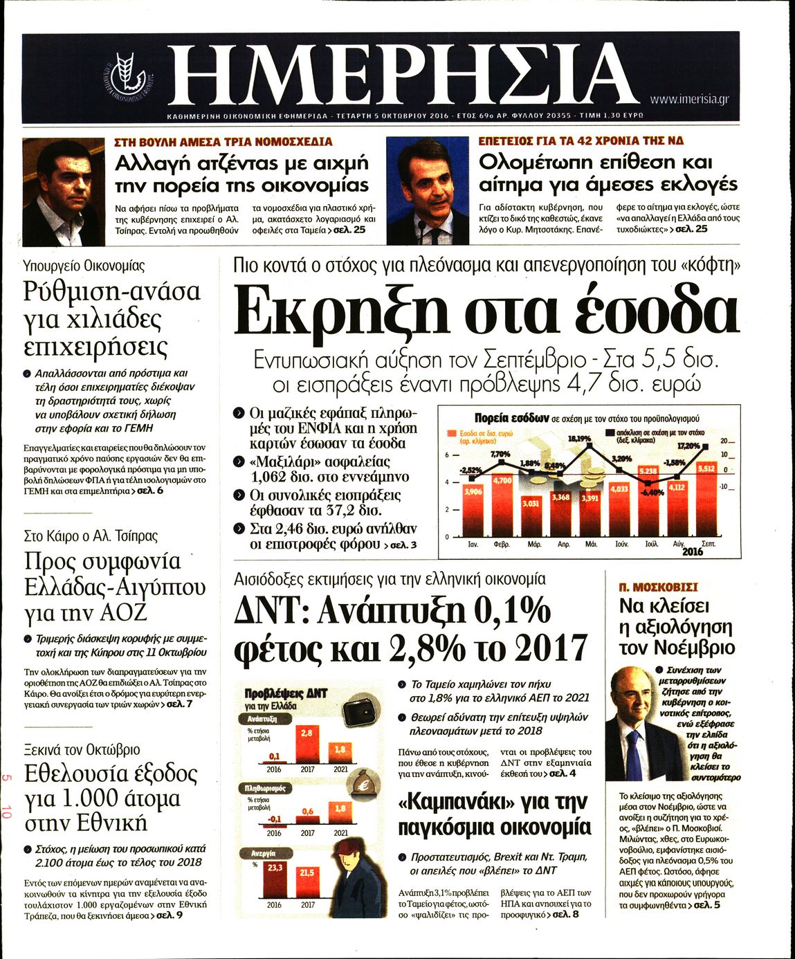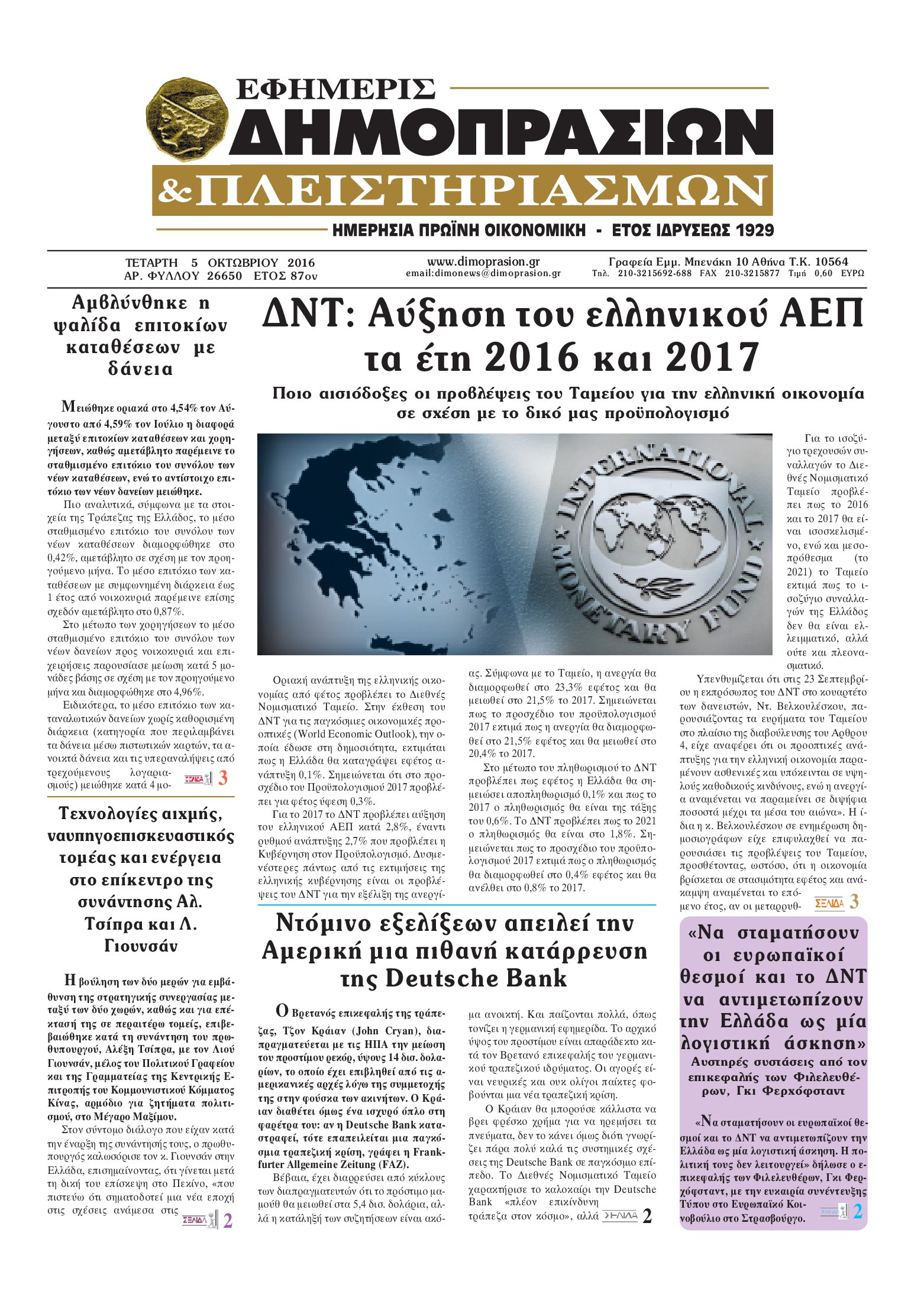 Οι οικονομικές εφημερίδες 5/10/2016 Enikos Newsroom 06:12, Τετάρτη 05 Οκτωβρίου 2016 Media Διαβάστε τα σημερινά πρωτοσέλιδα των οικονομικών εφημερίδων. ΟΙΚΟΝΟΜΙΚΕΣ ΕΦΗΜΕΡΙΔΕΣ ΠΡΩΤΟΣΕΛΙΔΑ Μοιράσου το: σχολίασε κι εσύ (0 σχόλια) Ακολουθήστε το enikos.gr στο Google News και μάθετε πρώτοι όλες τις ειδήσεις Δείτε όλες τις τελευταίες ειδήσεις από την Ελλάδα και τον Κόσμο στο enikos.gr Ειδήσεις Ροή Ειδήσεων 2 ώρες πριν Νίκος Παππάς: «Είχα λάθος αντίδραση στη δική του δράση-πρόκληση – Δεν θα αναλύσω σε τι κατάσταση ήταν ο δημοσιογράφος» 1 ώρα πριν Αλεξανδρούπολη: Πολυοργανική ανεπάρκεια λόγω υποσιτισμού η αιτία θανάτου του 3χρονου αγοριού 2 ώρες πριν Δημοσκόπηση Pulse: Η διαφορά ΝΔ-ΠΑΣΟΚ – Με ποια κριτήρια θα ψηφίσουν οι πολίτες στις επόμενες εκλογές 2 ώρες πριν Αγρότες: Άνοιξαν τον μεθοριακό σταθμό του Προμαχώνα – Κανονικά περνούν τα φορτηγά 3 ώρες πριν Συγκλονιστικό βίντεο: Τρόμος για τουρίστες που σώθηκαν την τελευταία στιγμή από λεωφορείο που κατρακυλούσε σε φαράγγι 2 ώρες πριν Αριθμολογία: Οι άνθρωποι που έχουν γεννηθεί αυτές τις 4 ημερομηνίες, είναι τρυφεροί και αγαπούν ανιδιοτελώς 4 ώρες πριν Οι άνθρωποι που θυμούνται τα όνειρά τους, συνήθως μοιράζονται αυτά τα 6 σπάνια χαρακτηριστικά 3 ώρες πριν Καθρέφτες μπάνιου: Το απλό κόλπο με την οδοντόκρεμα για να μην θολώνουν 13 ώρες πριν 20 χρόνια τα Χριστούγεννα ξεκινούν στα Public με μεγάλη ποικιλία σε δώρα! 3 λεπτά πριν Ρούτε: Η μεγαλύτερη επιτυχία εξωτερικής πολιτικής του Τραμπ είναι η δέσμευση των χωρών του ΝΑΤΟ για τις αμυντικές δαπάνες 9 λεπτά πριν Το Σπίτι Δίπλα Στο Ποτάμι: Σε κίνδυνο η υγεία του Απόστολου – Τι θα δούμε απόψε 19 λεπτά πριν Νίκος Γιαννόπουλος για Νίκο Παππά: «Είναι επικίνδυνος, θα του κάνω ασφαλιστικά» – ΒΙΝΤΕΟ 23 λεπτά πριν ΟΠΕΚΕΠΕ – Παράνομες επιδοτήσεις: Ελεύθεροι με περιοριστικούς όρους ακόμη τρεις κατηγορούμενοι – Ανάμεσα τους και η σύζυγος του λογιστή 29 λεπτά πριν Συγγενείς θυμάτων τρομοκρατίας: «Ο Κουφοντίνας να μην πάρει με κρατικά χρήματα, αυτό που κάποτε “αγόραζε” με αίμα» ENIKOS NETWORK Αϋπνία: Το κόλπο που θα σας βοηθήσει να κοιμηθείτε απόψε – Είναι απλό και έχει αποτέλεσμα 2,6 εκατομμύρια πολίτες έχουν ήδη εμβολιαστεί κατά της γρίπης Χειμερινές εκπτώσεις: Πότε αρχίζουν και τι πρέπει να προσέξουν οι καταναλωτές ΑΑΔΕ: Καταβλήθηκε η τέταρτη δόση επιστροφής ΕΦΚ αγροτικού πετρελαίου – Οδηγίες για τη διόρθωση παραστατικών Χαρτογραφώντας το «σημείο χωρίς επιστροφή»: Για πρώτη φορά αποκαλύπτεται με λεπτομέρεια το ακανθώδες όριο της ατμόσφαιρας τ... Η Google καταργεί τη λειτουργία «dark web report» – Πώς θα μπορούν οι χρήστες να διαγράφουν τα δεδομένα τους περισσότερα 22:24 , Τετάρτη 17 Δεκεμβρίου 2025 Το Σπίτι Δίπλα Στο Ποτάμι: Σε κίνδυνο η υγεία του Απόστολου – Τι θα δούμε απόψε “Το Σπίτι Δίπλα στο Ποτάμι” ξετυλίγει το νήμα της ζωής των πέντε αδελφών με καταισ... 21:14 , Τετάρτη 17 Δεκεμβρίου 2025 Παιχνίδια Εκδίκησης: Θα καταφέρει ο Χρήστος να κλονίσει την εμπιστοσύνη της Μάγιας απέναντι στον Άγη; Τα «Παιχνίδια Εκδίκησης» έρχονται απόψε στις 22:30, στον Αντ1, με το τελευταίο επεισόδιο της χ... 20:57 , Τετάρτη 17 Δεκεμβρίου 2025 Άγιος Έρωτας: Η Χλόη καταθέτει εναντίον του πατέρα της και ο Χάρης αποκαλύπτει στον Κλεάνθη ότι δεν είναι ο βιολογικός του πατέρας. Γεμάτο αποκαλύψεις είναι το νέο επεισόδιο της σειράς “Άγιος Έρωτας” απόψε στις 21:... 20:15 , Τετάρτη 17 Δεκεμβρίου 2025 Η ανακοίνωση της ΕΣΗΕΑ για την επίθεση του Ευρωβουλευτή Νίκου Παππά κ